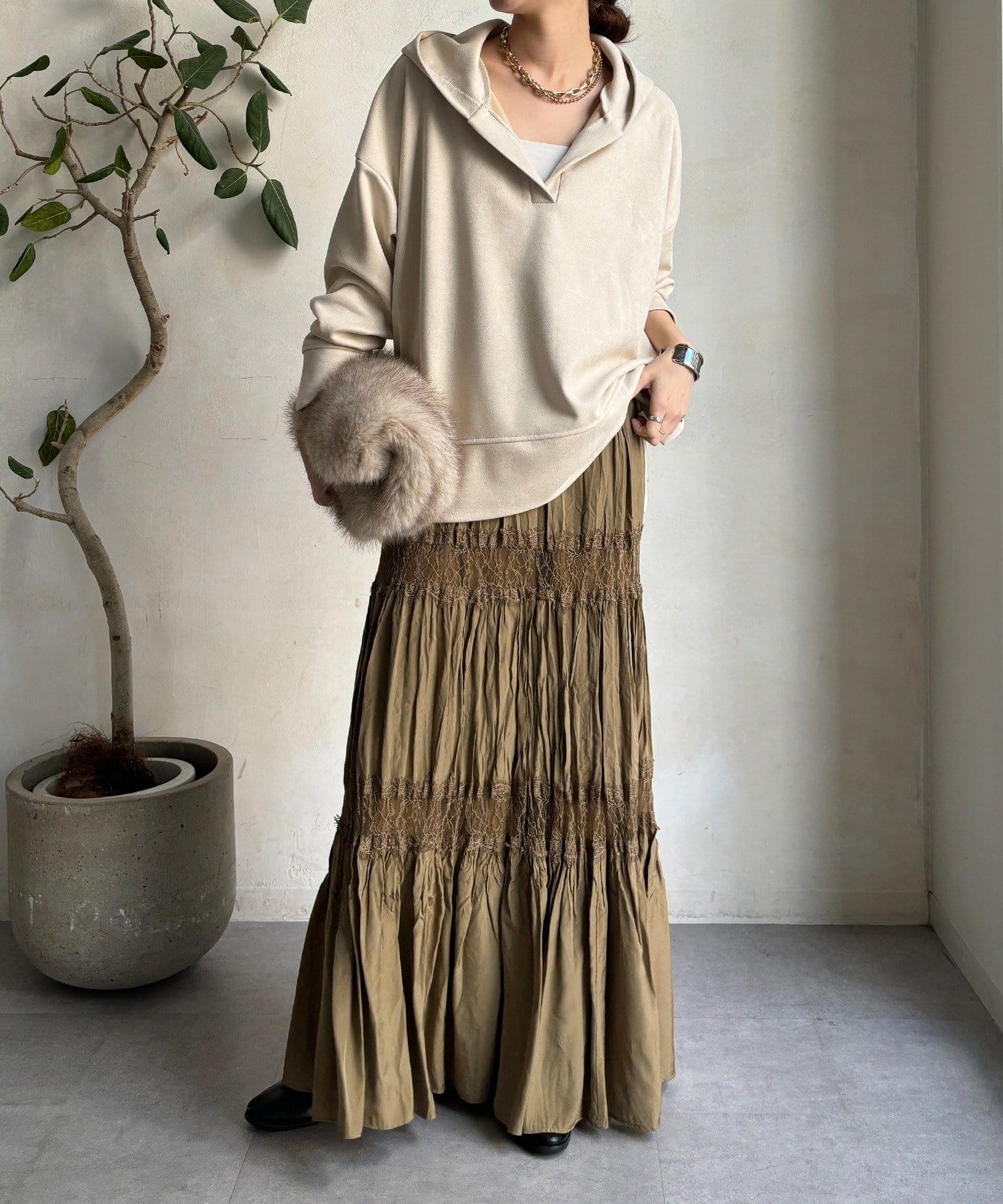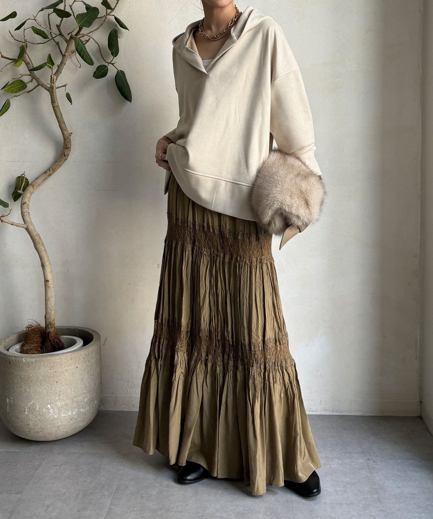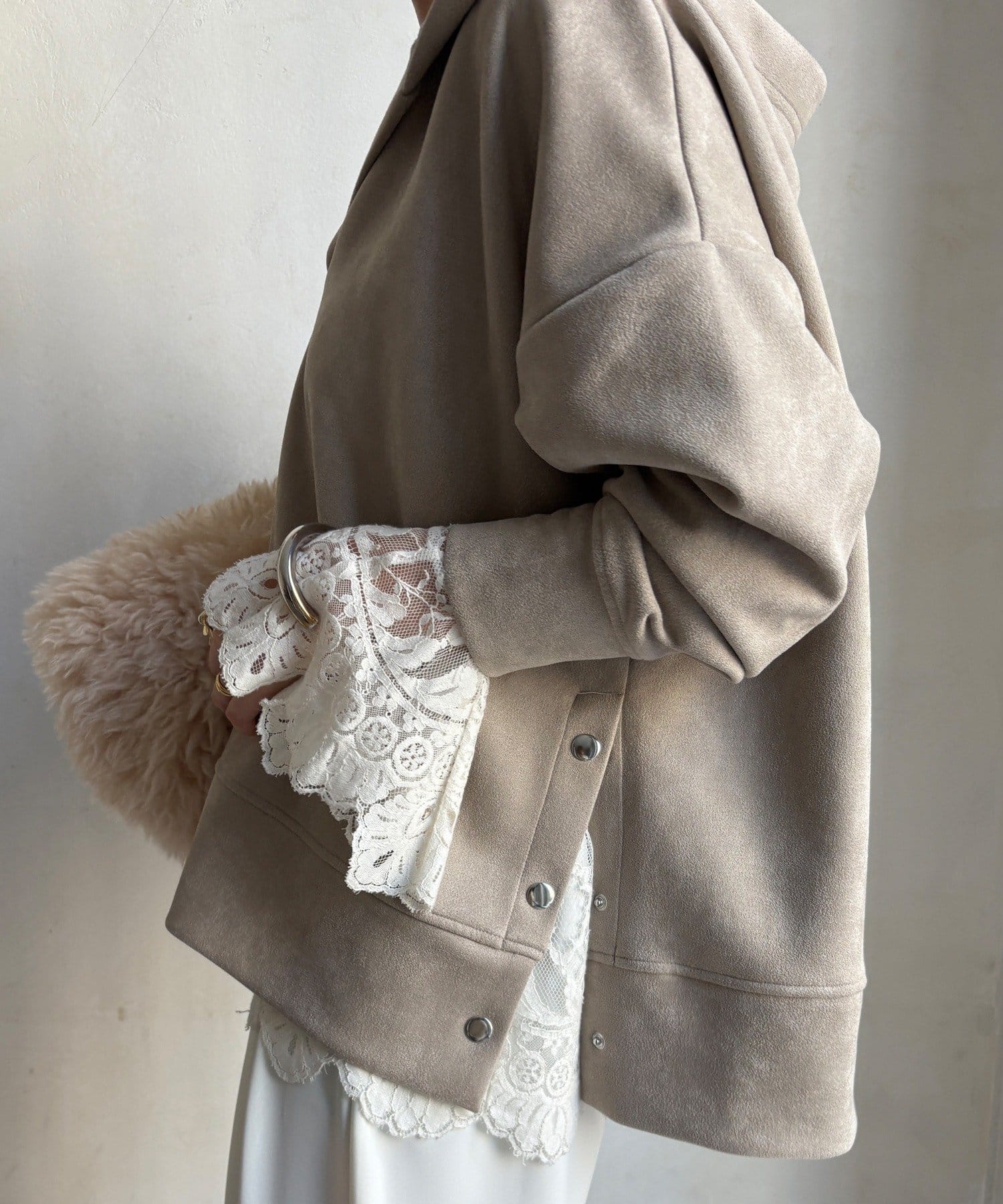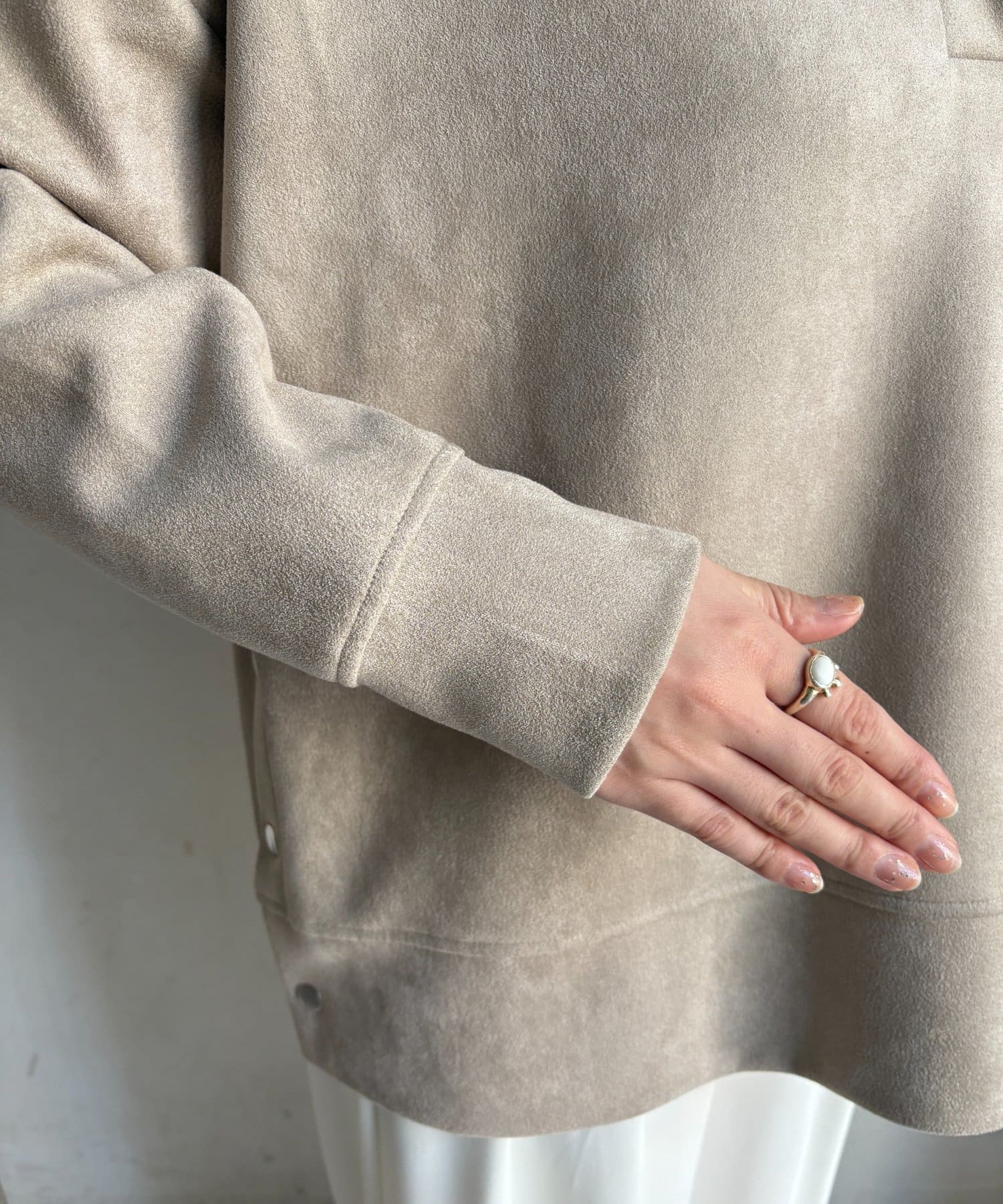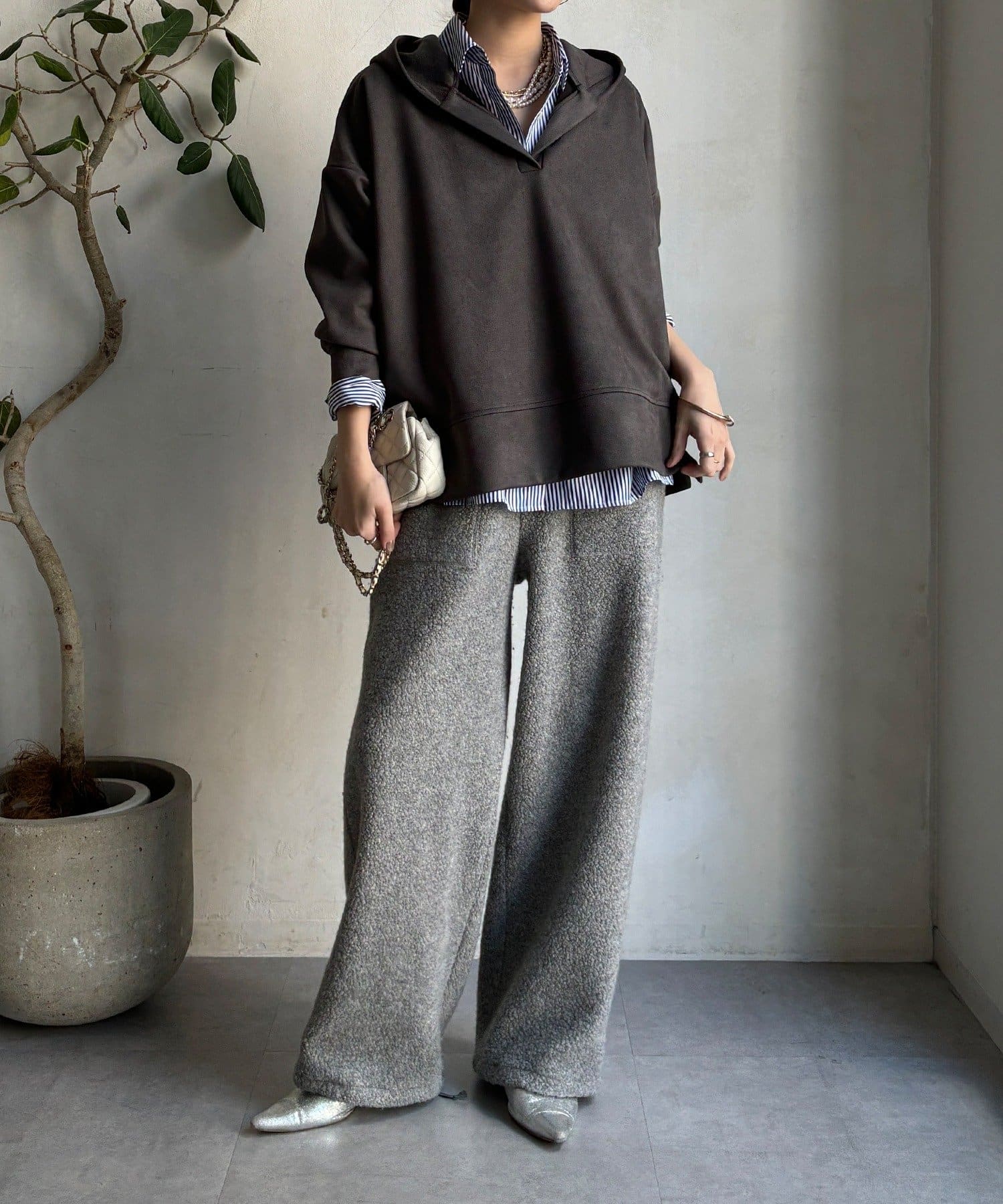 柔らかくスエードタッチな素材が大人っぽさを引き立てるオーバーサイズフーディー。