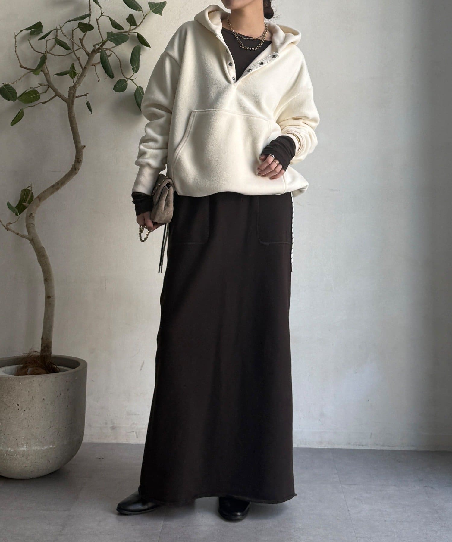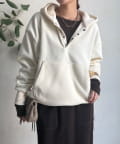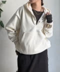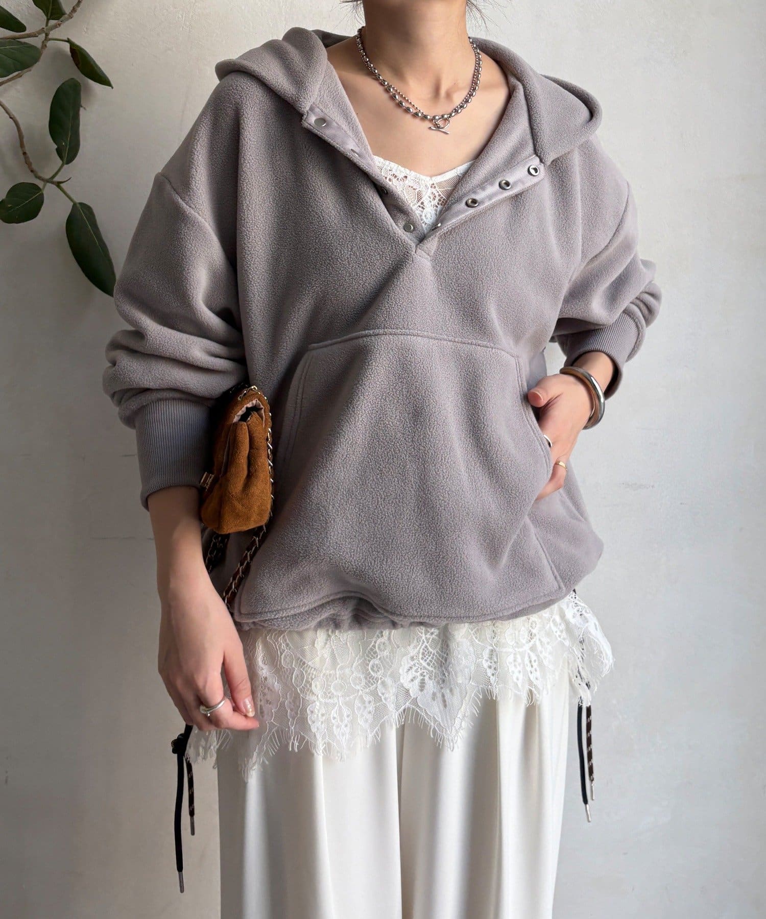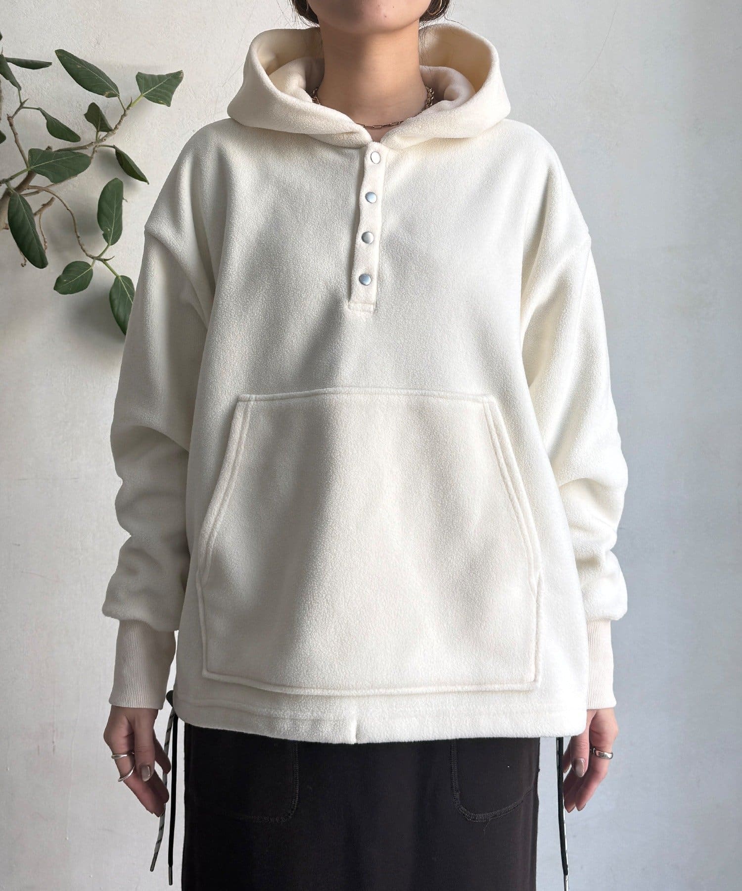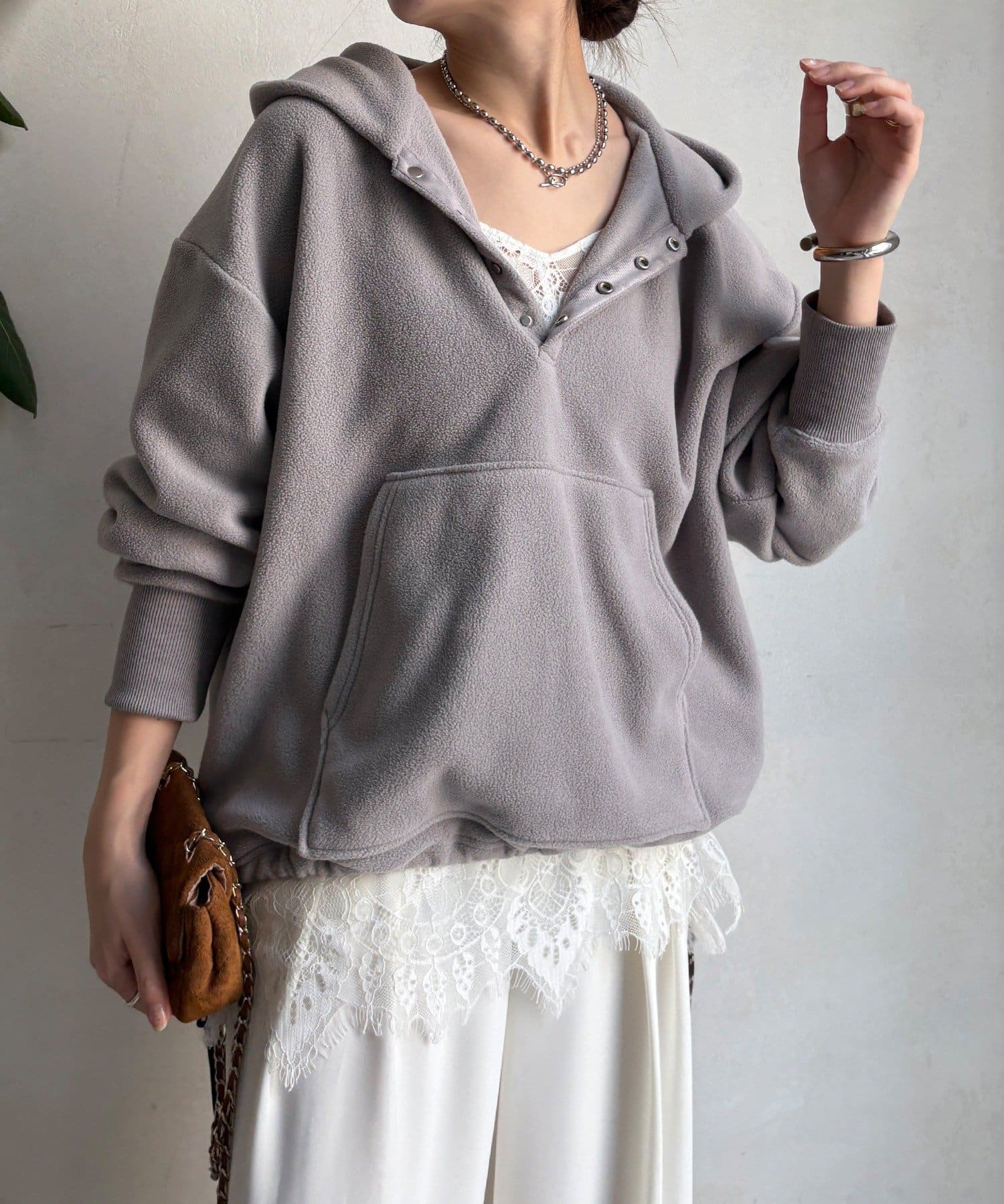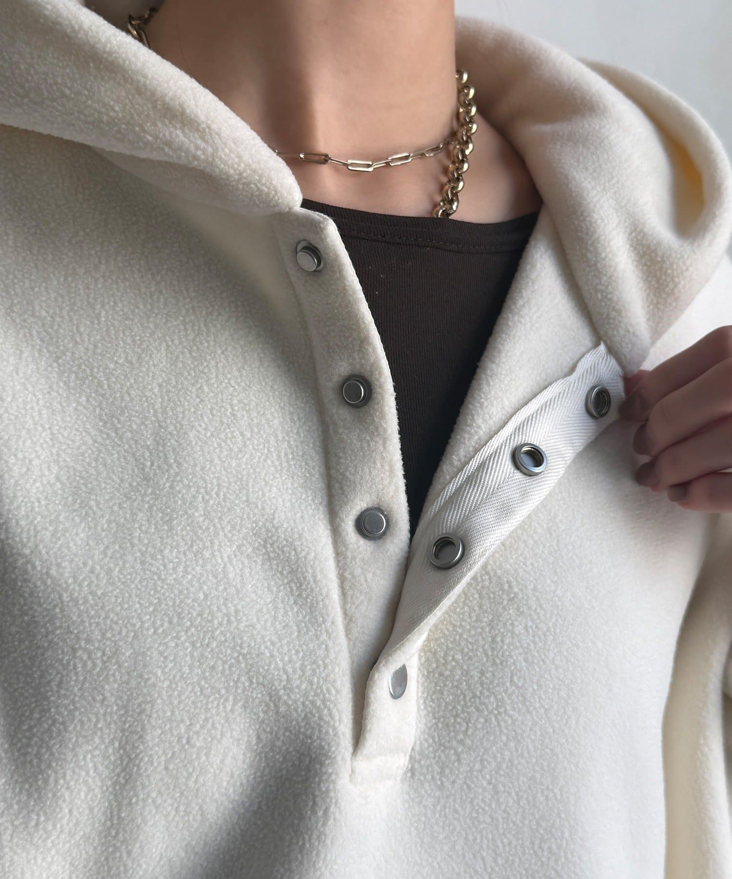 首元にはスナップボタンをあしらい、カジュアルなパーカーに上品な抜け感をプラスしました。