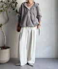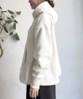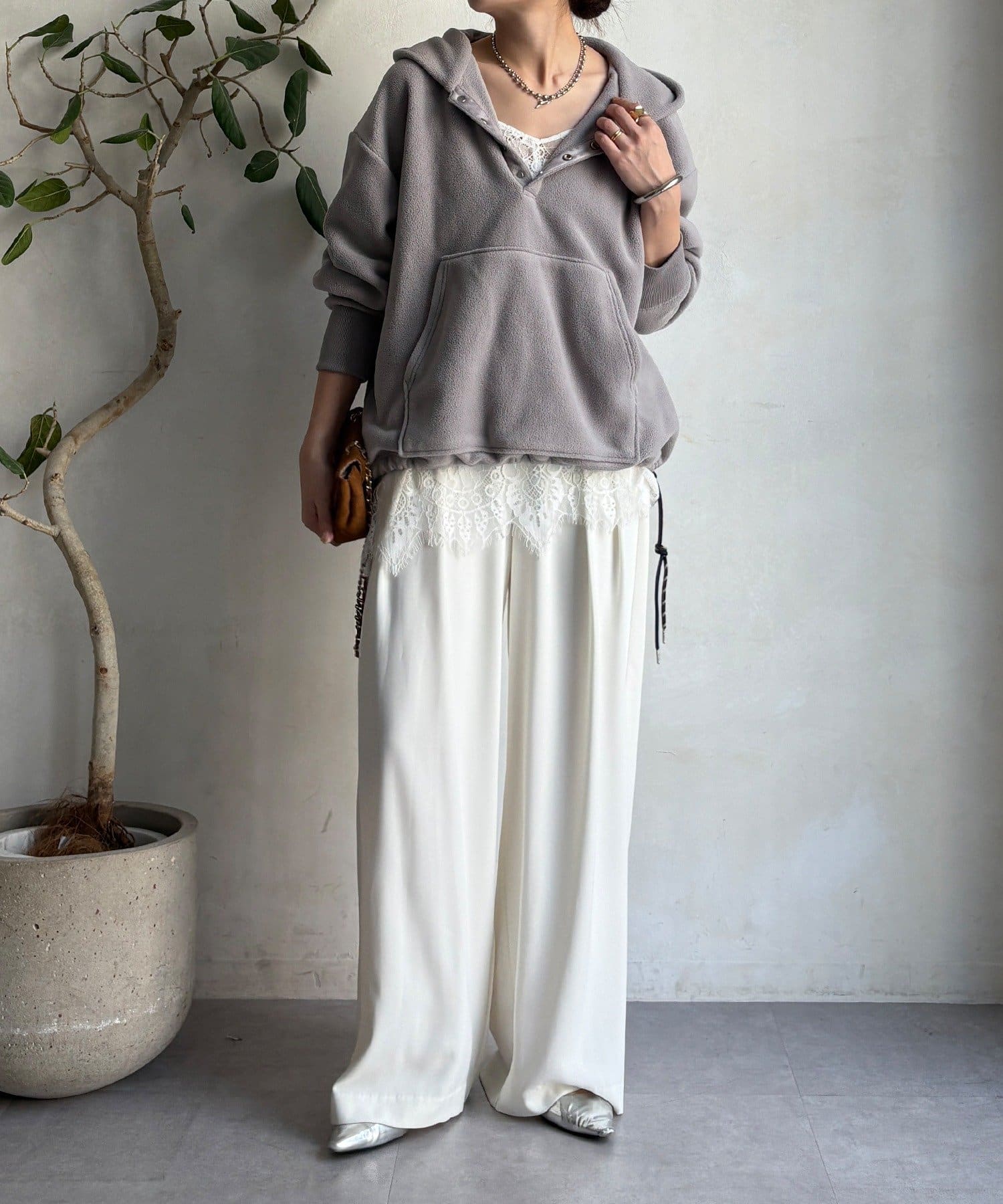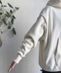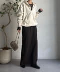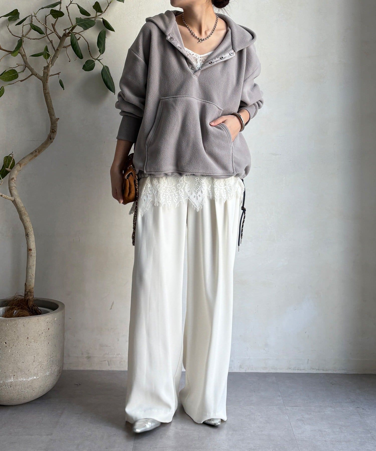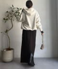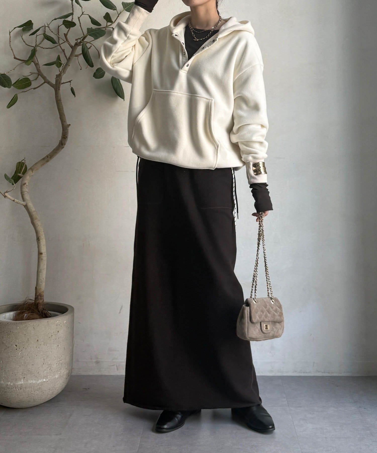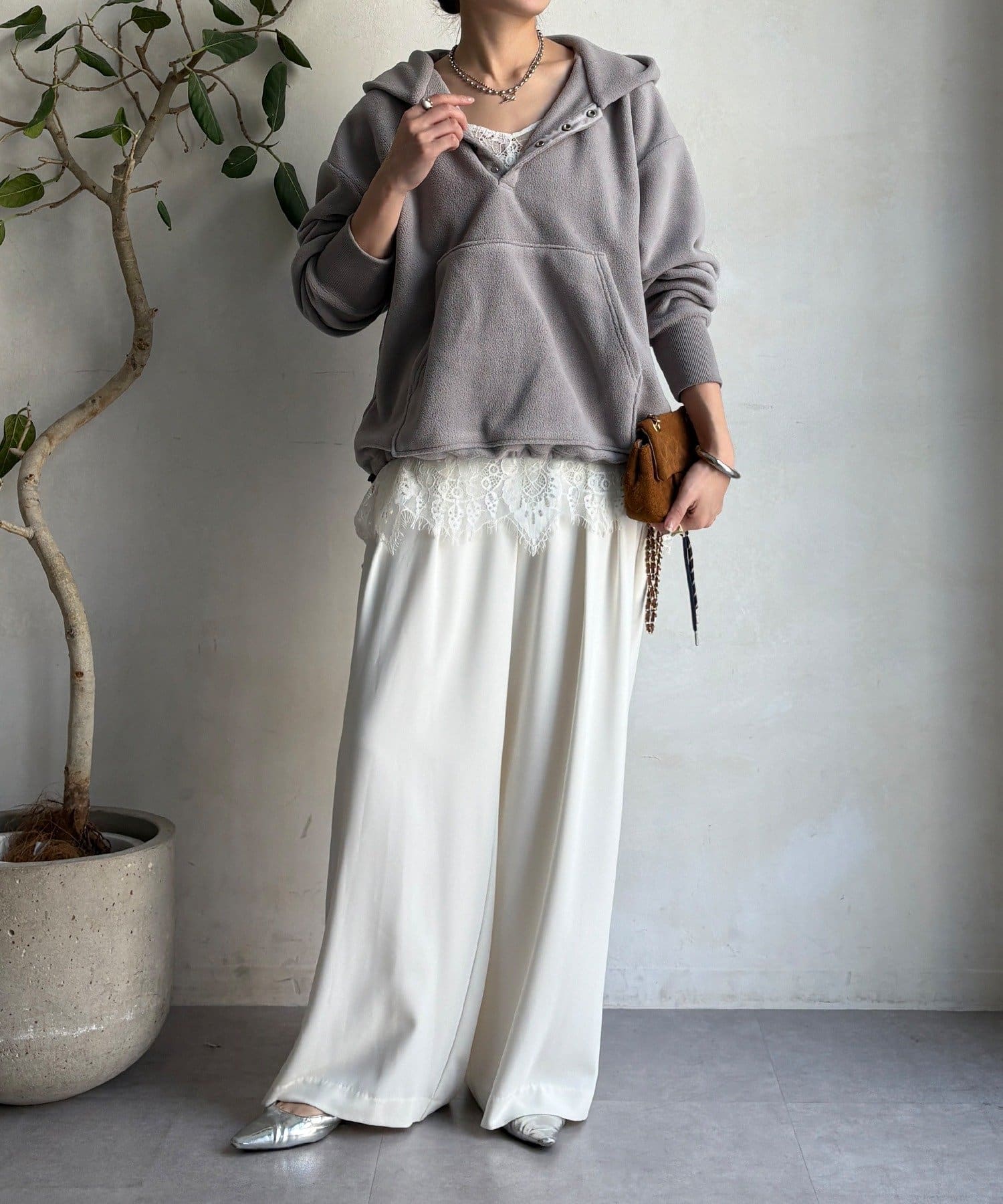 首元にはスナップボタンをあしらい、カジュアルなパーカーに上品な抜け感をプラスしました。