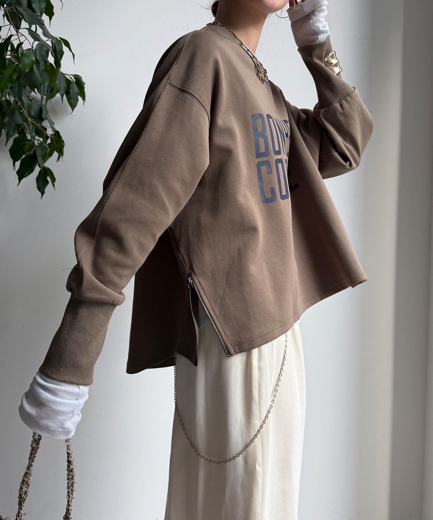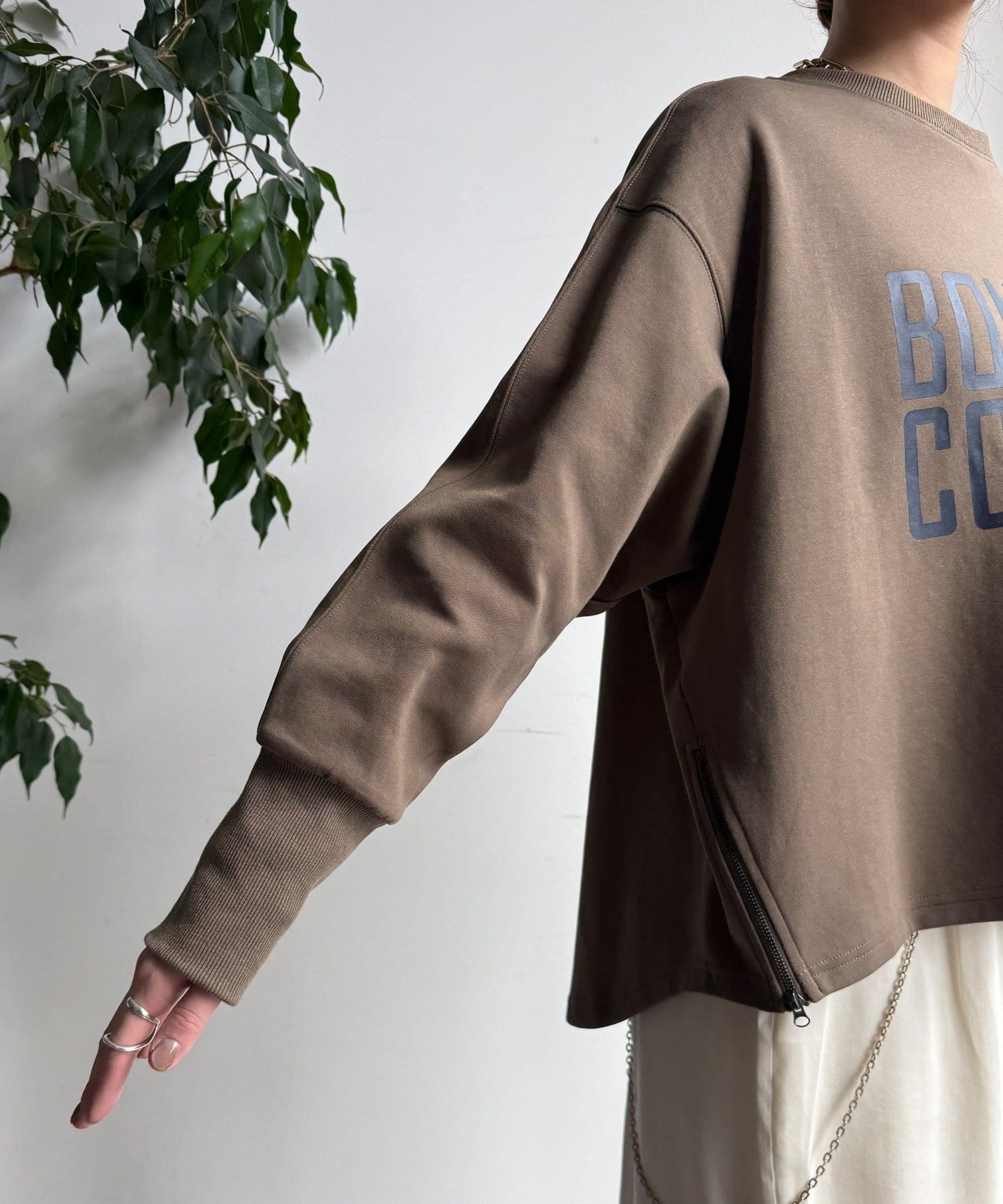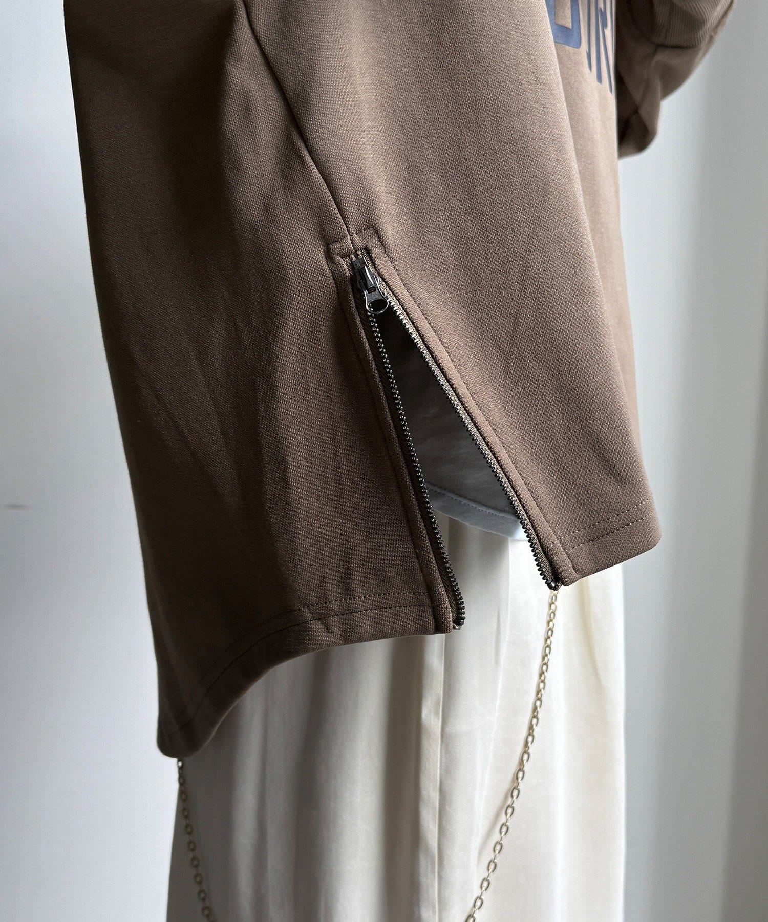 少し長めの袖リブと、サイドファスナーが抜け感を出し