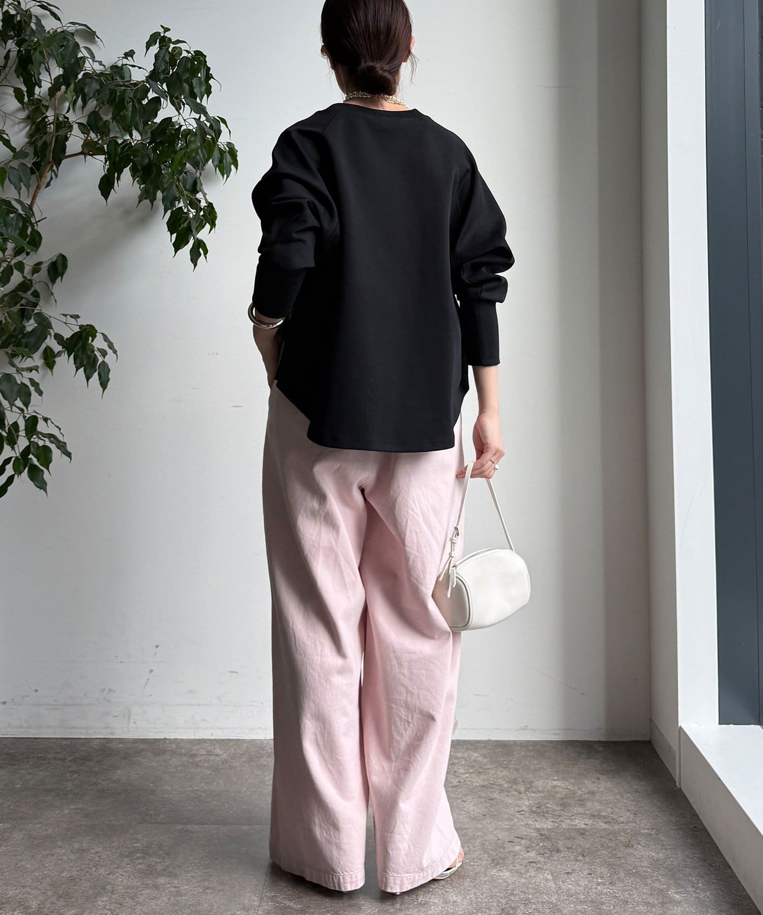 ゆったりとしたボトムと合わせるときは、前をインすると