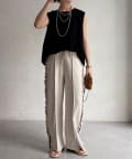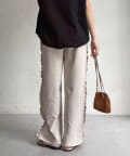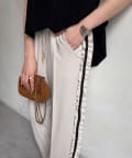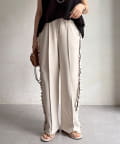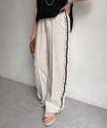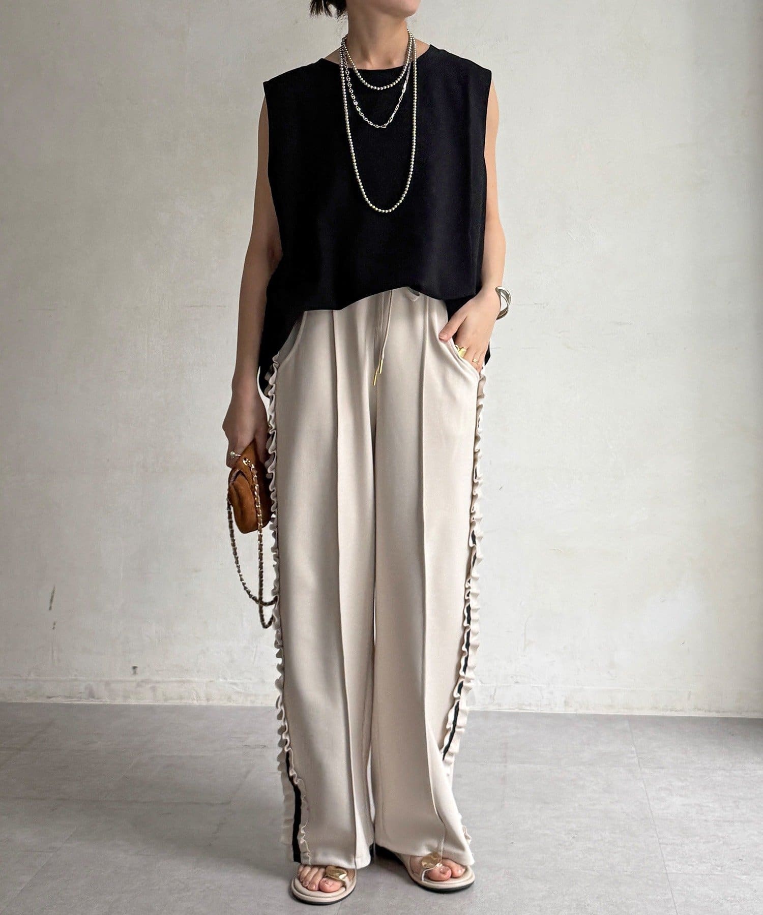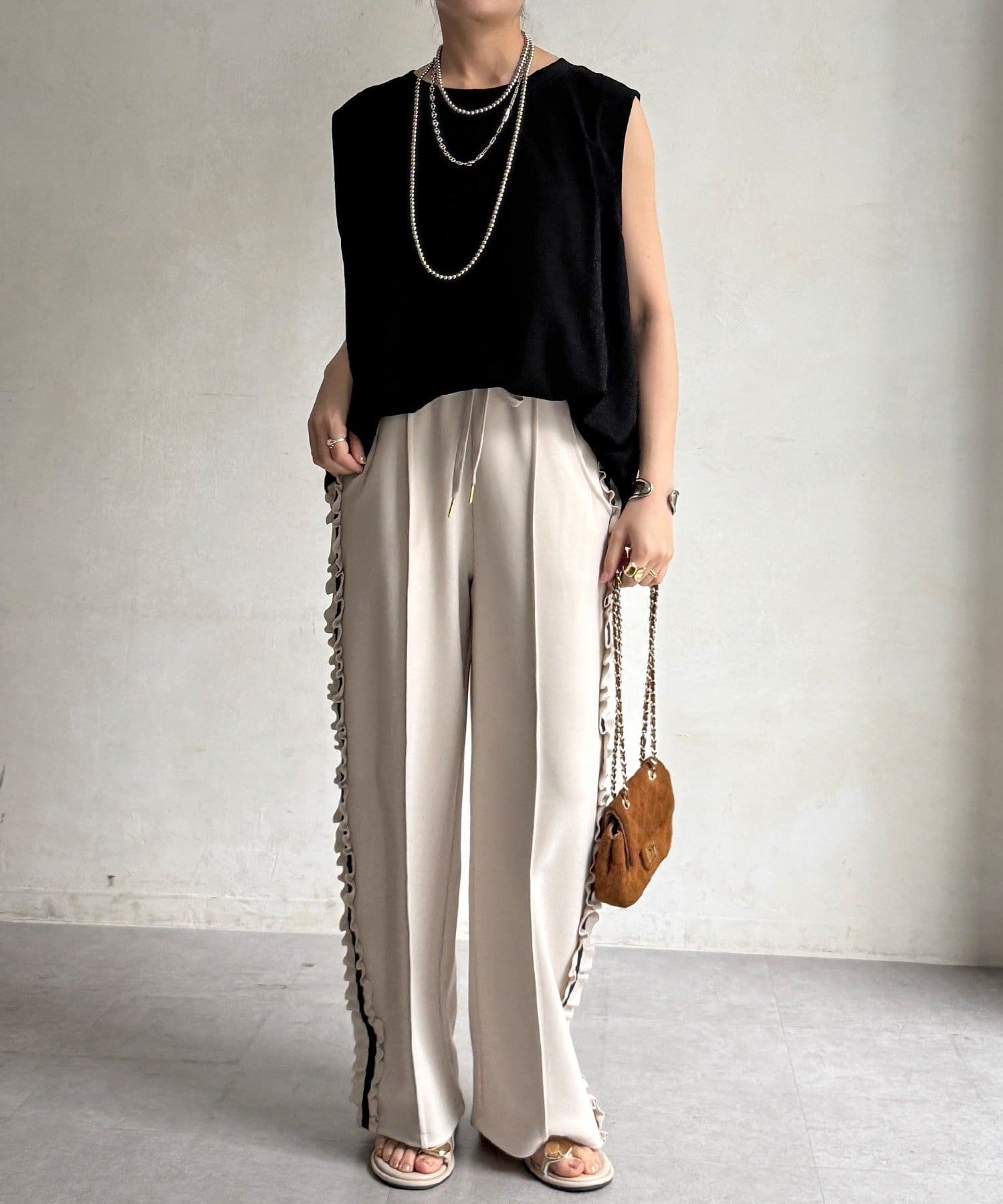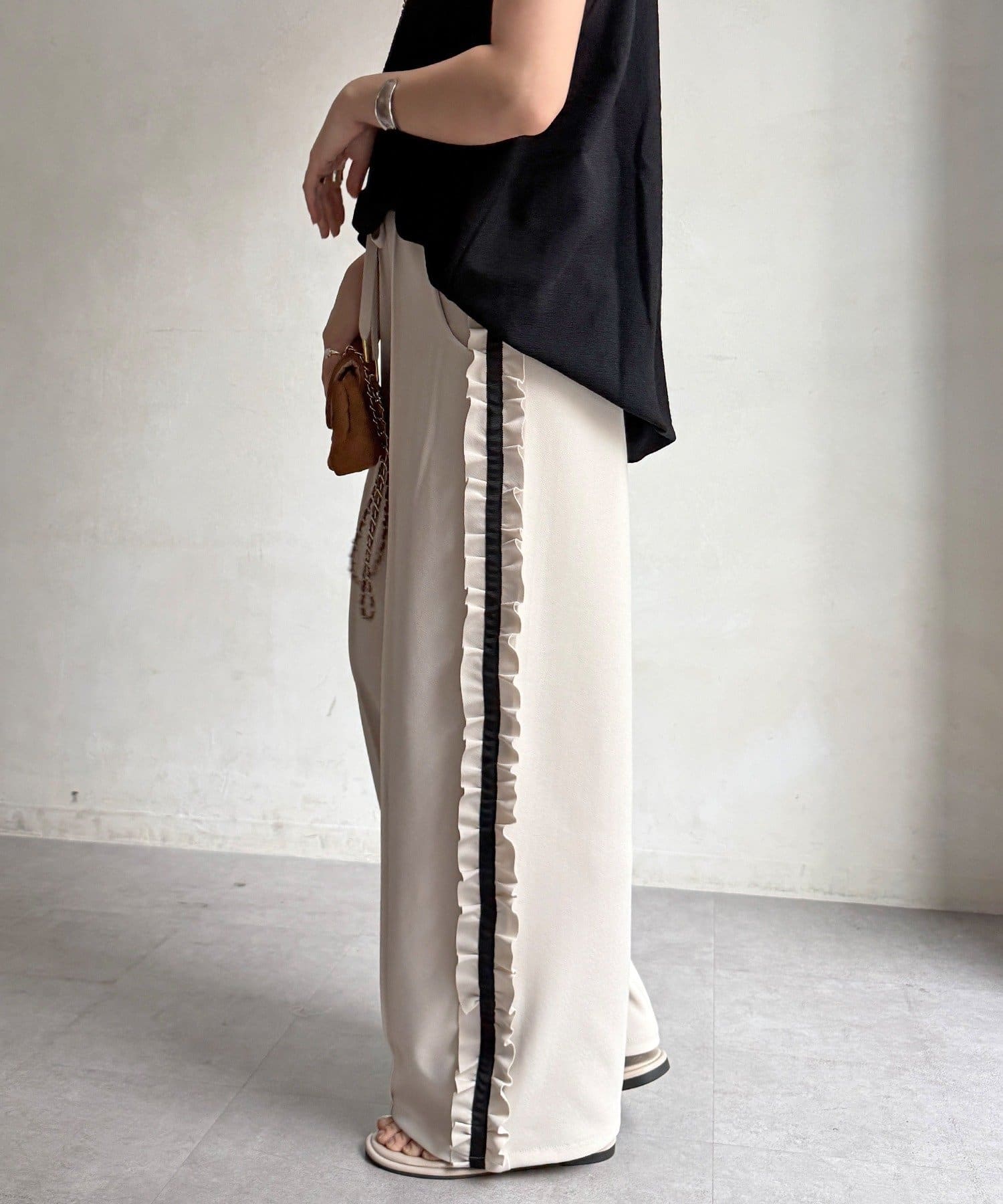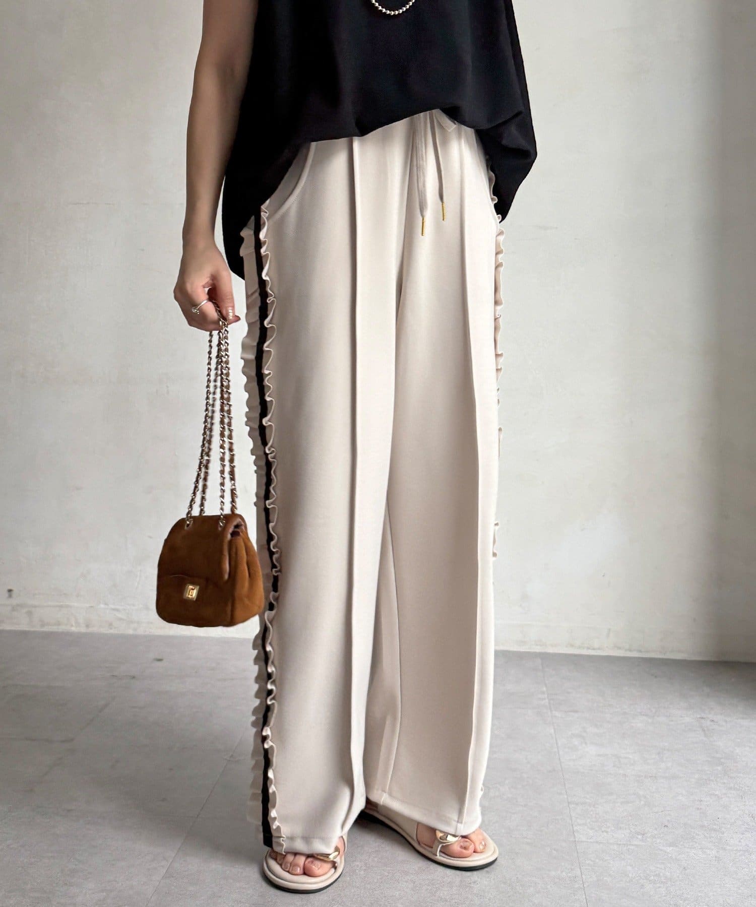 スポーティー感のあるサイドラインをフリルで表現したトレンド感のあるパンツ。