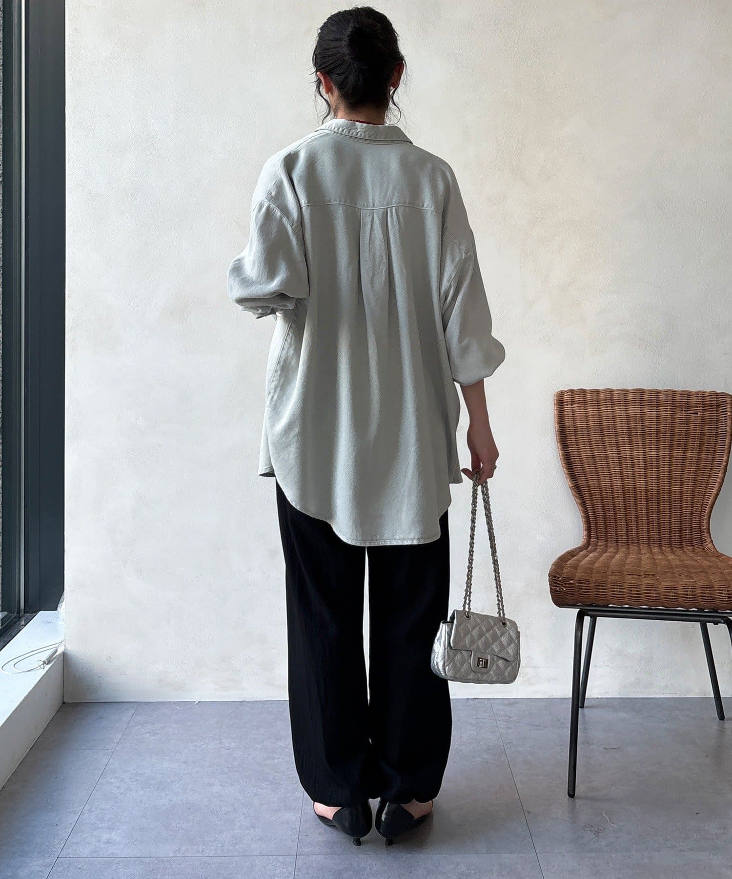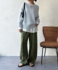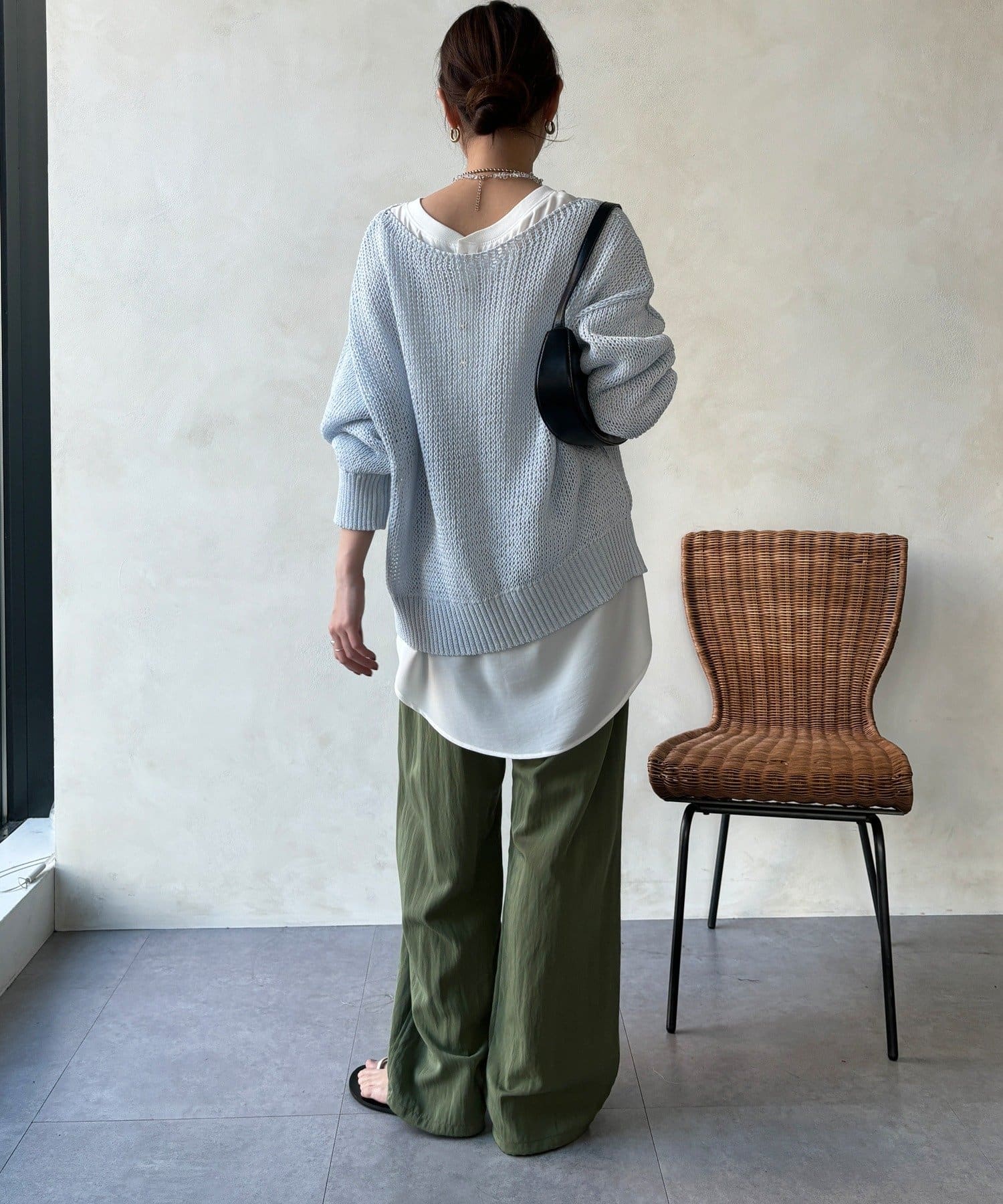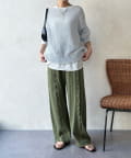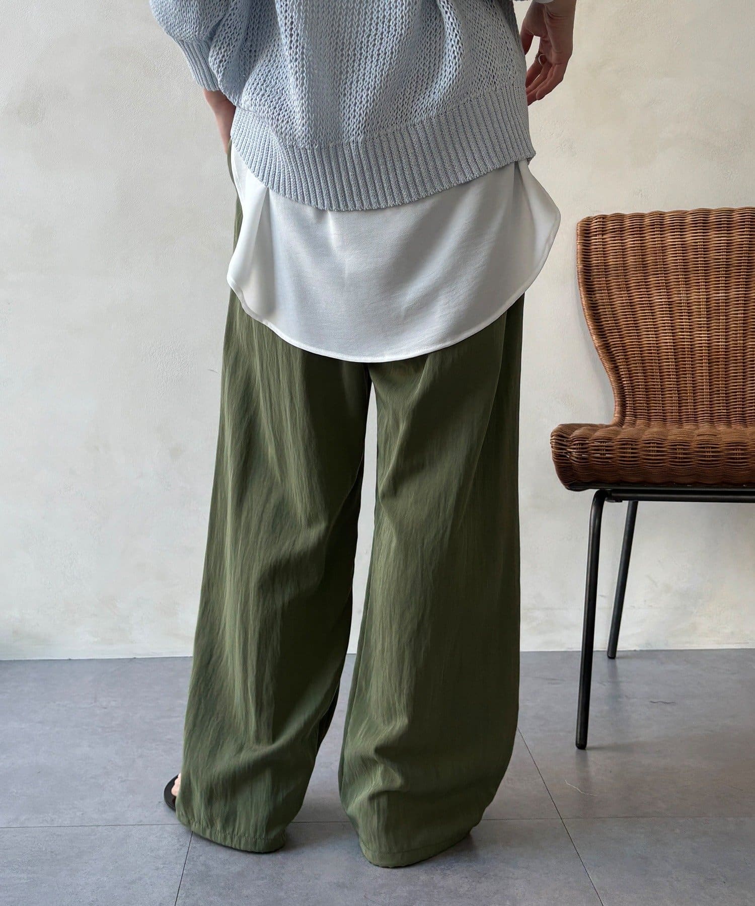 ワイドシルエットで体のラインを拾わず、
