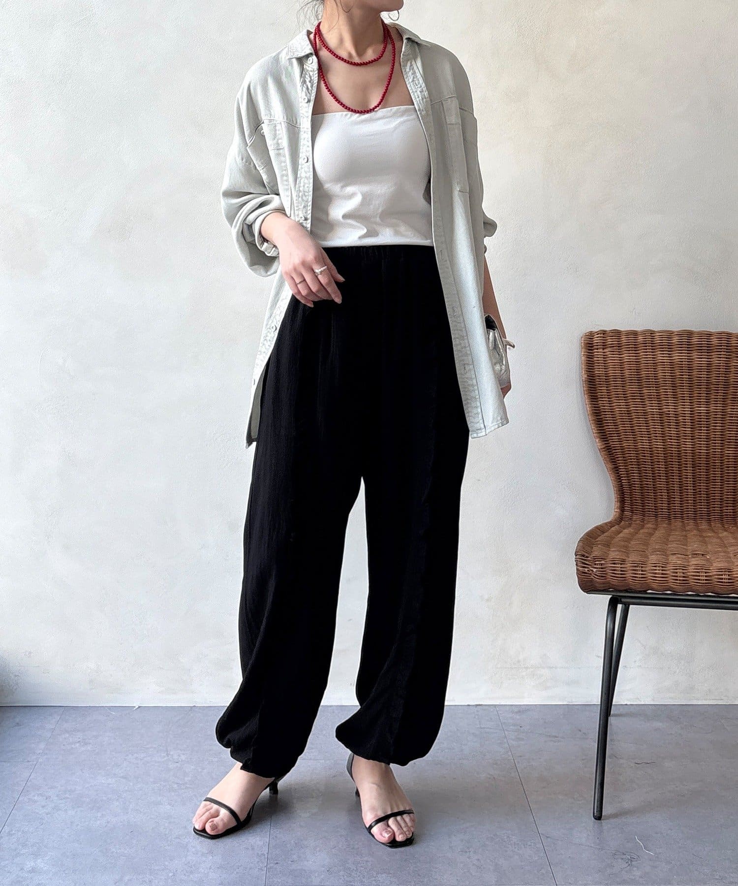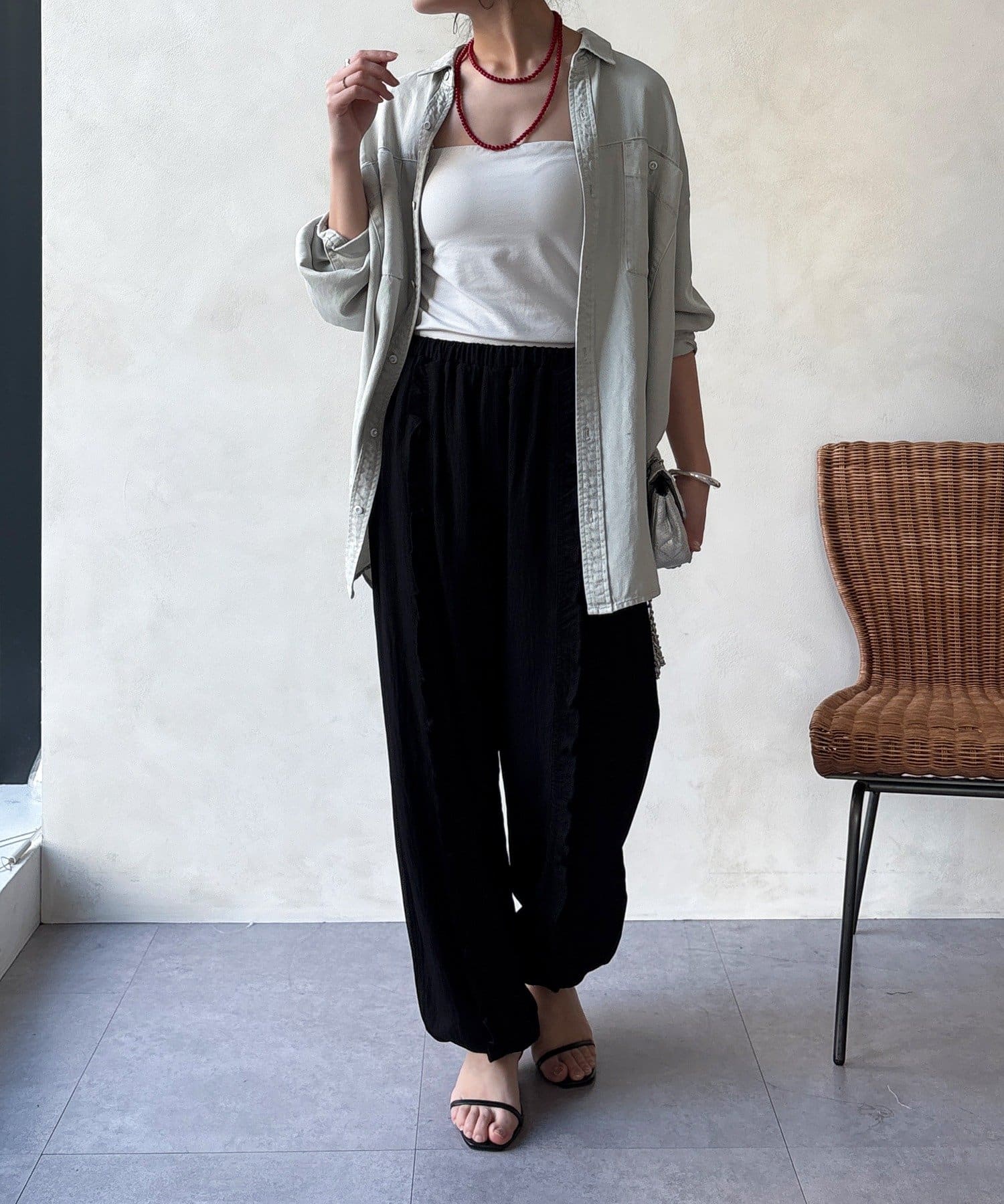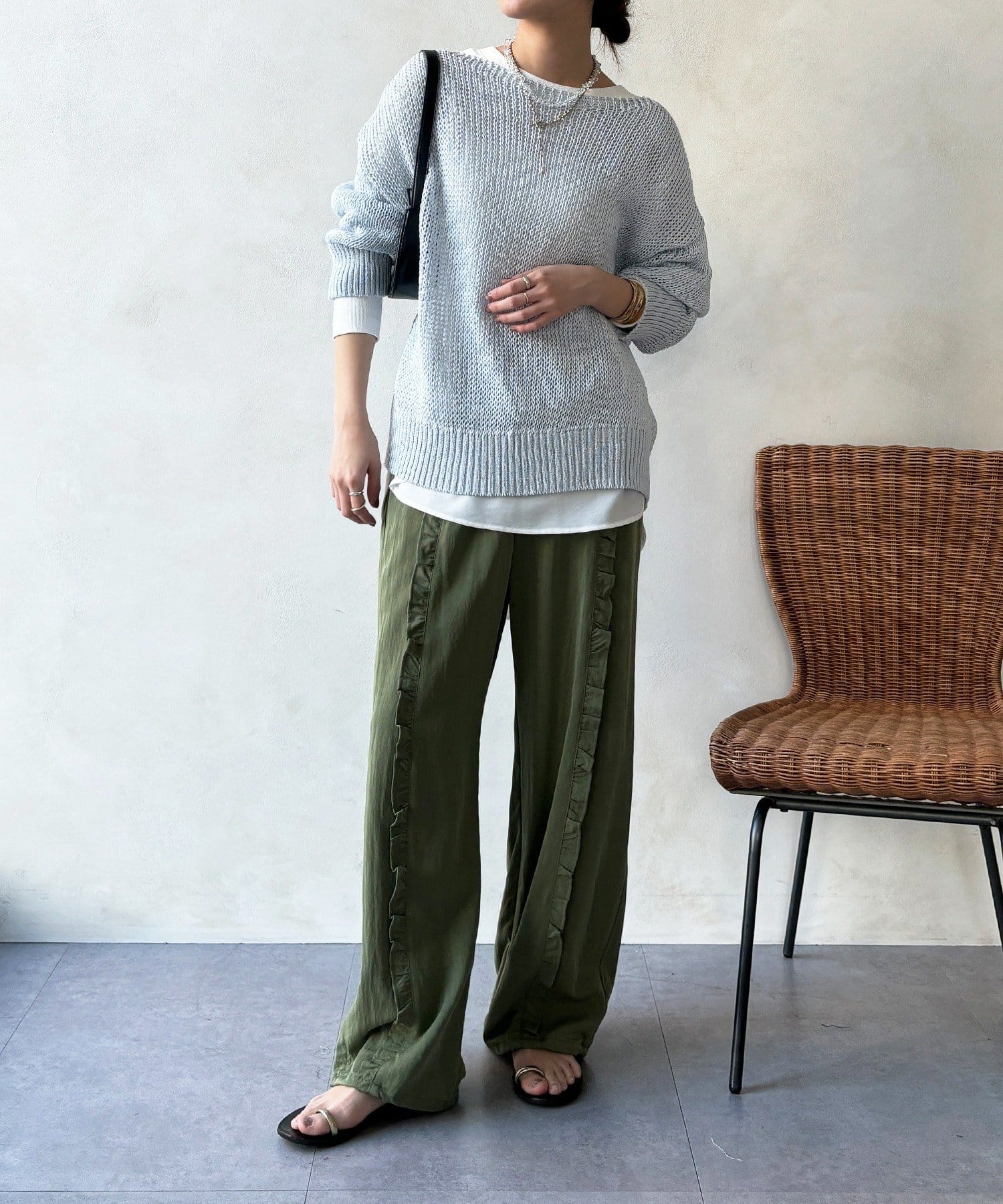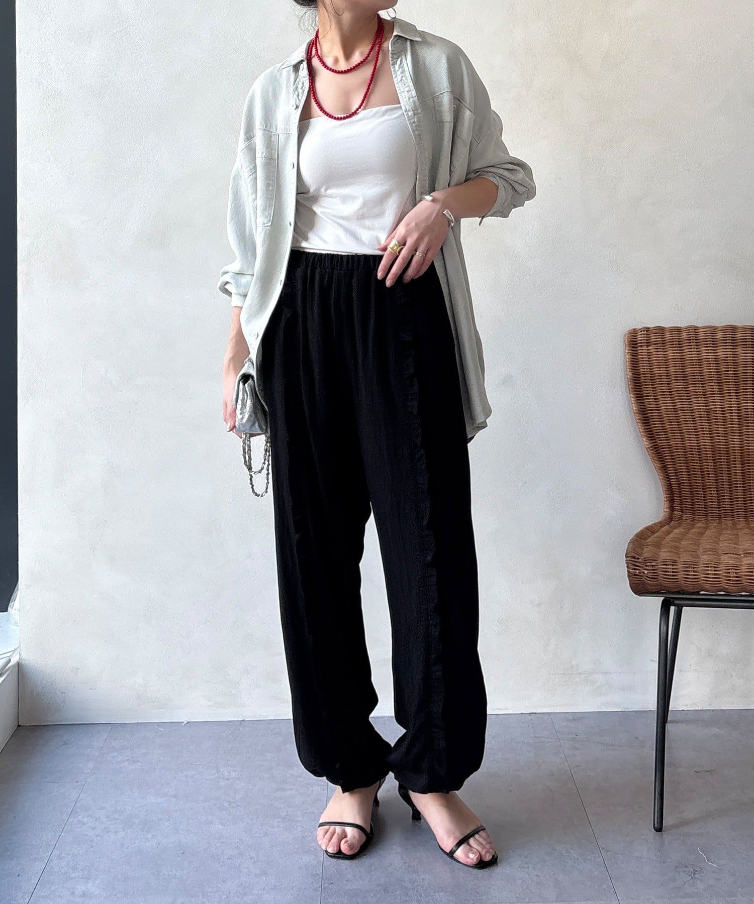 ワイドシルエットで体のラインを拾わず、