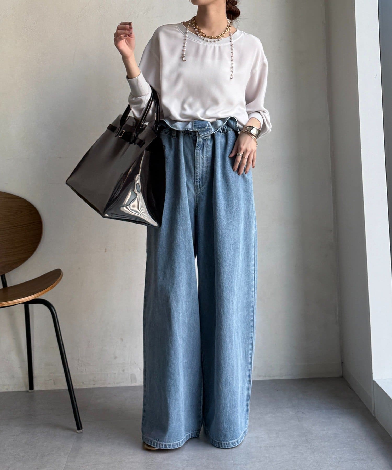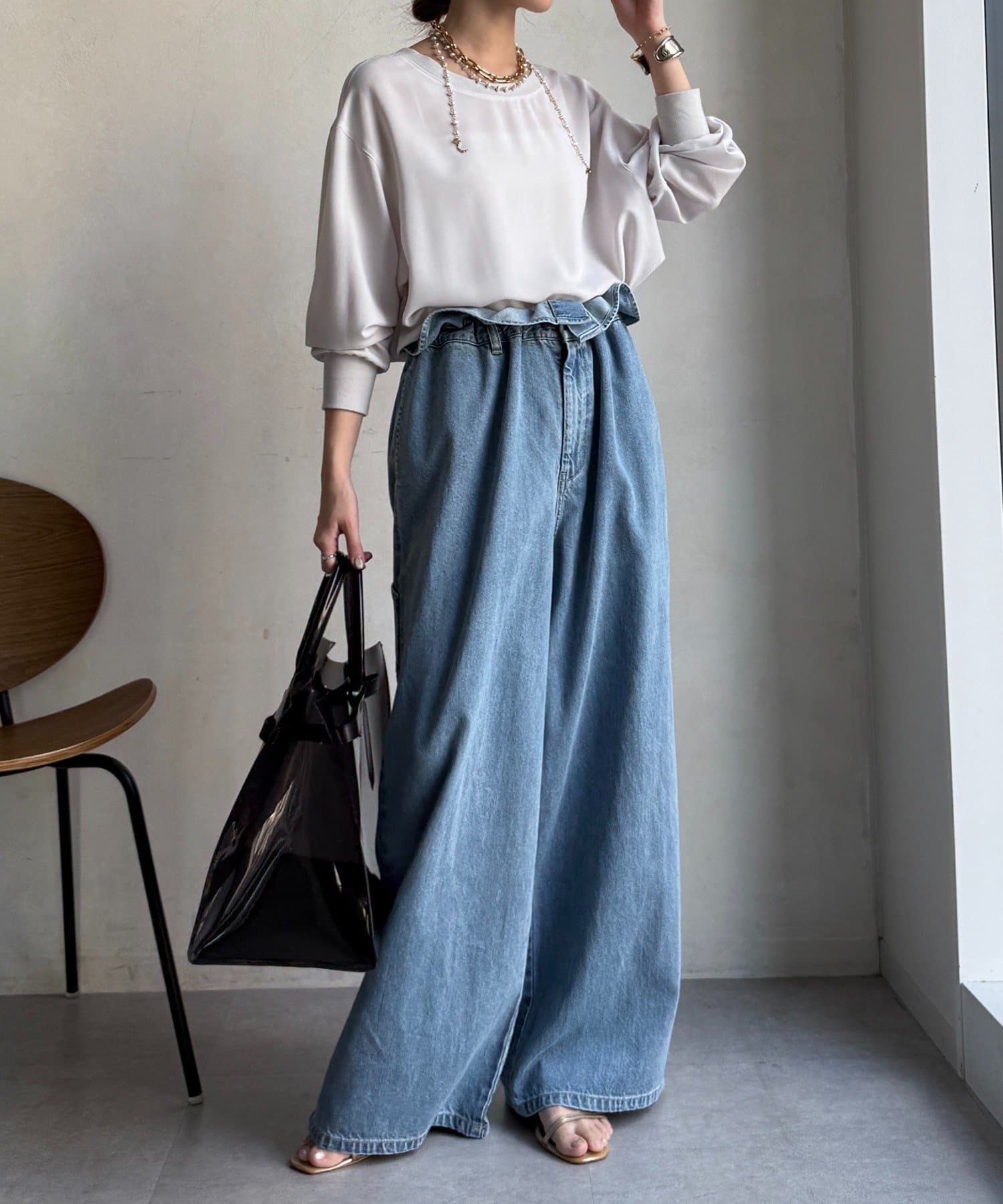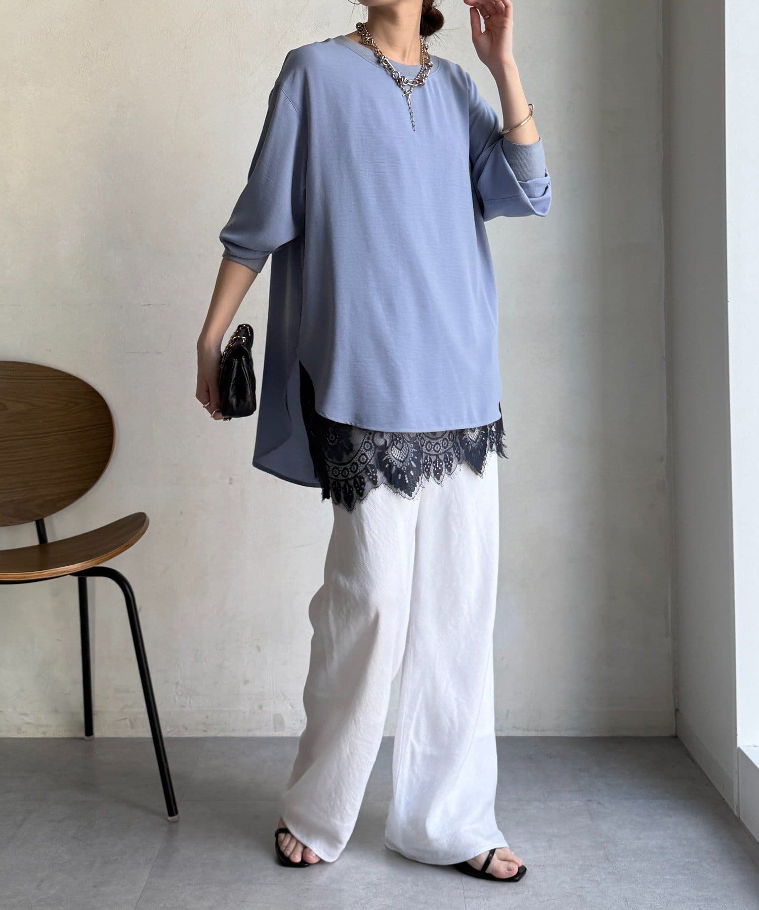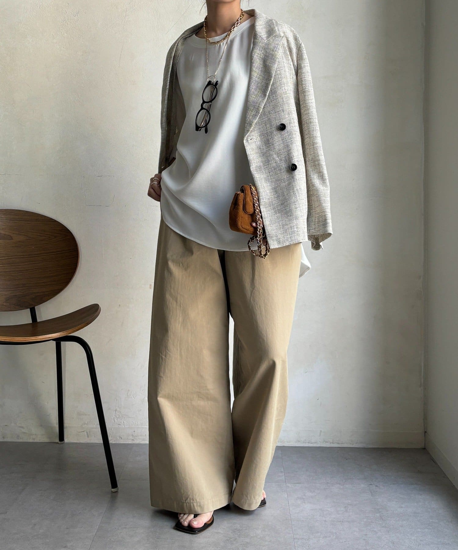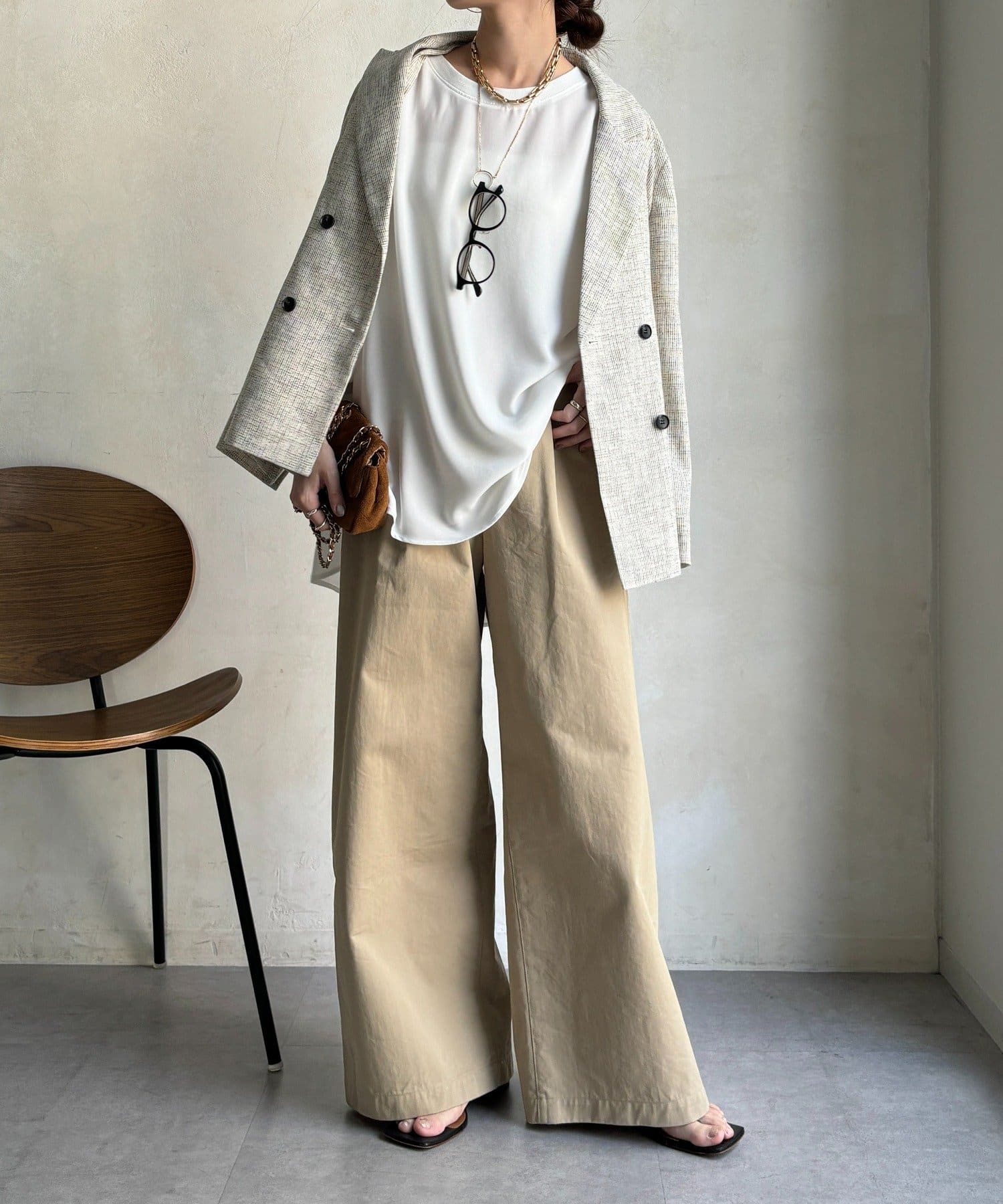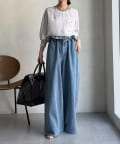 カジュアルさもありながら、ジョーゼット素材のきれいめな印象もプラスし、大人なスタイルに仕上がります。