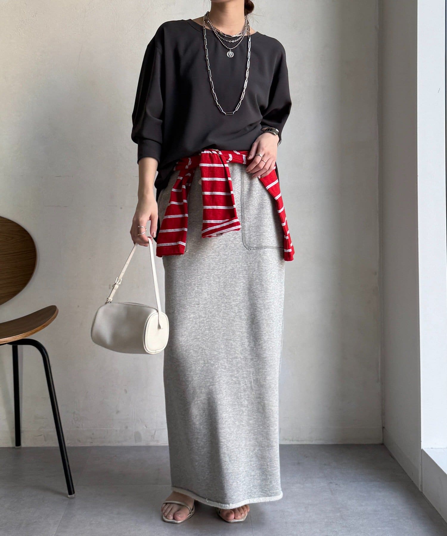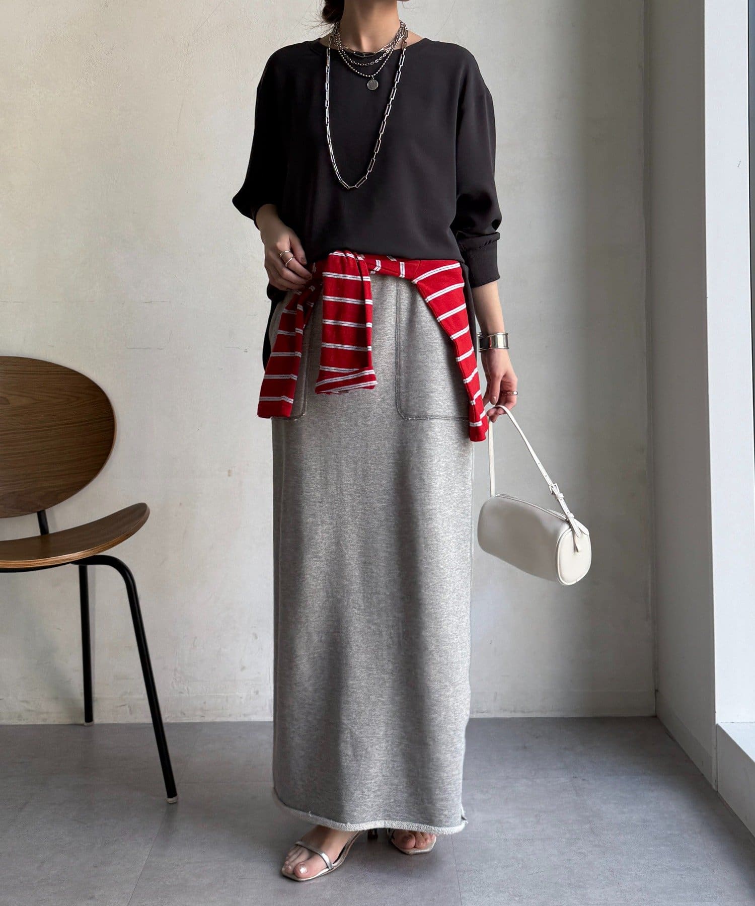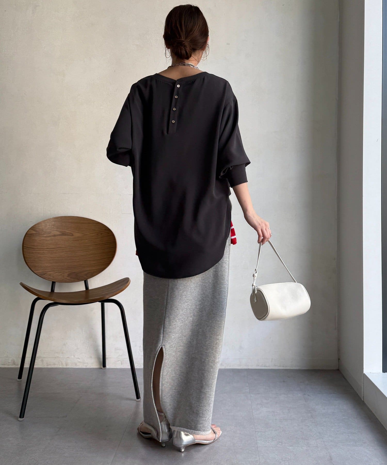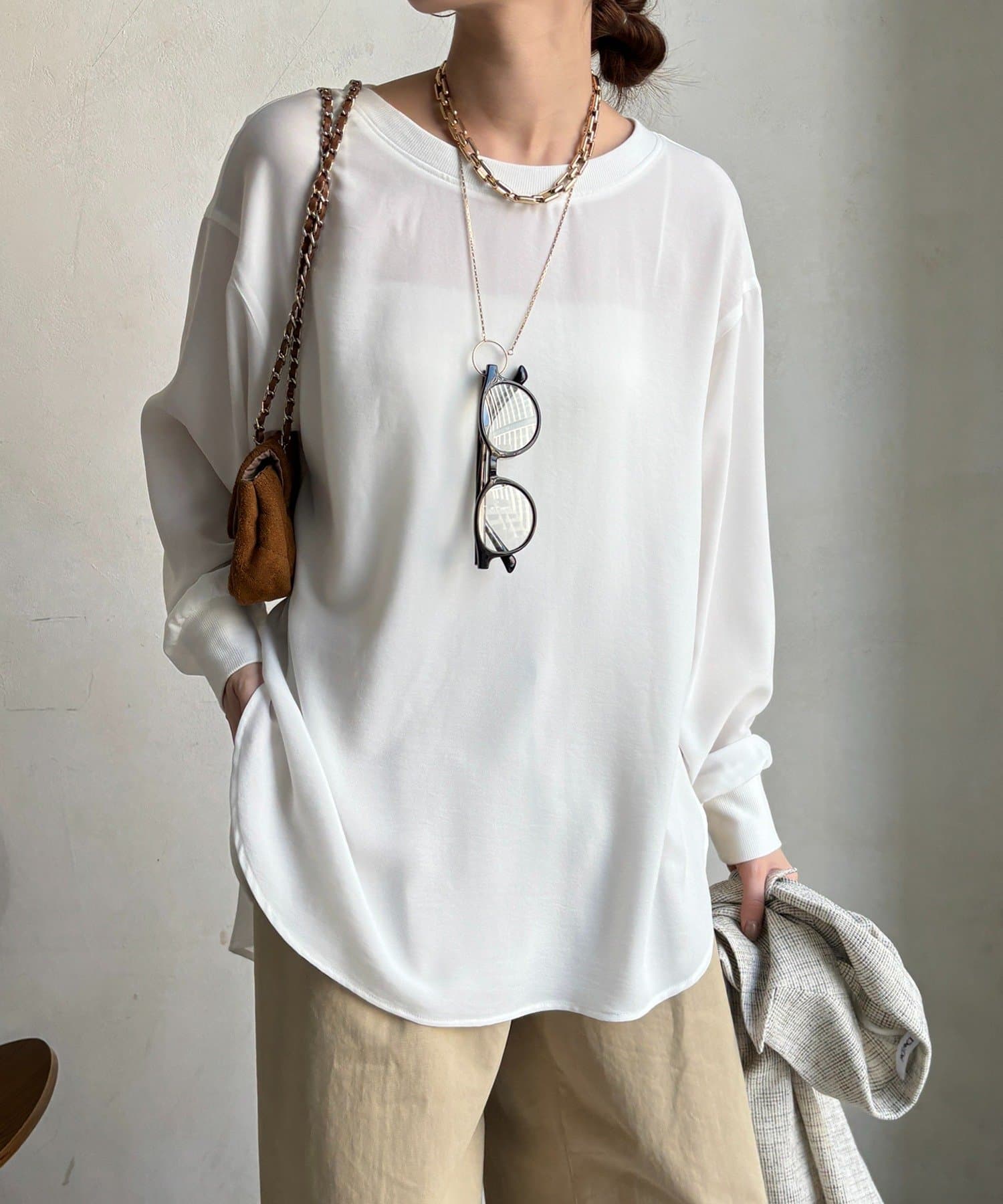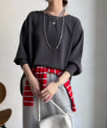 身体のラインを拾いすぎない、程よくゆったりとしたシルエット。ヒップにかかる丈感で、安心感のある着心地。