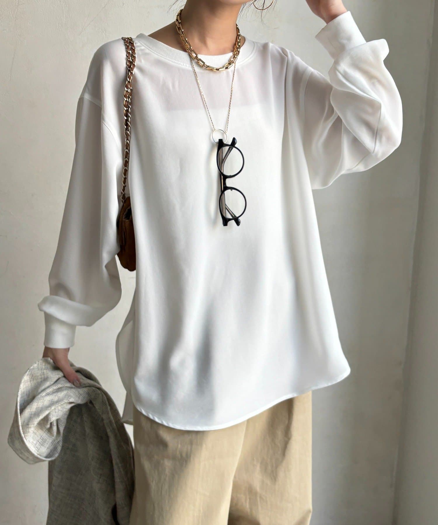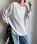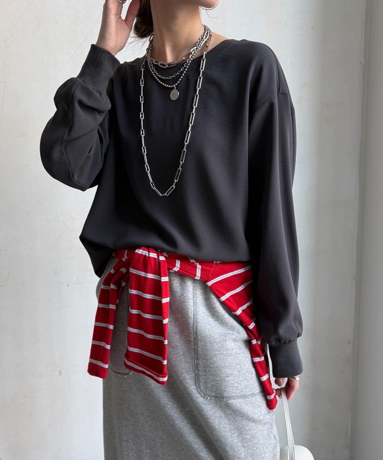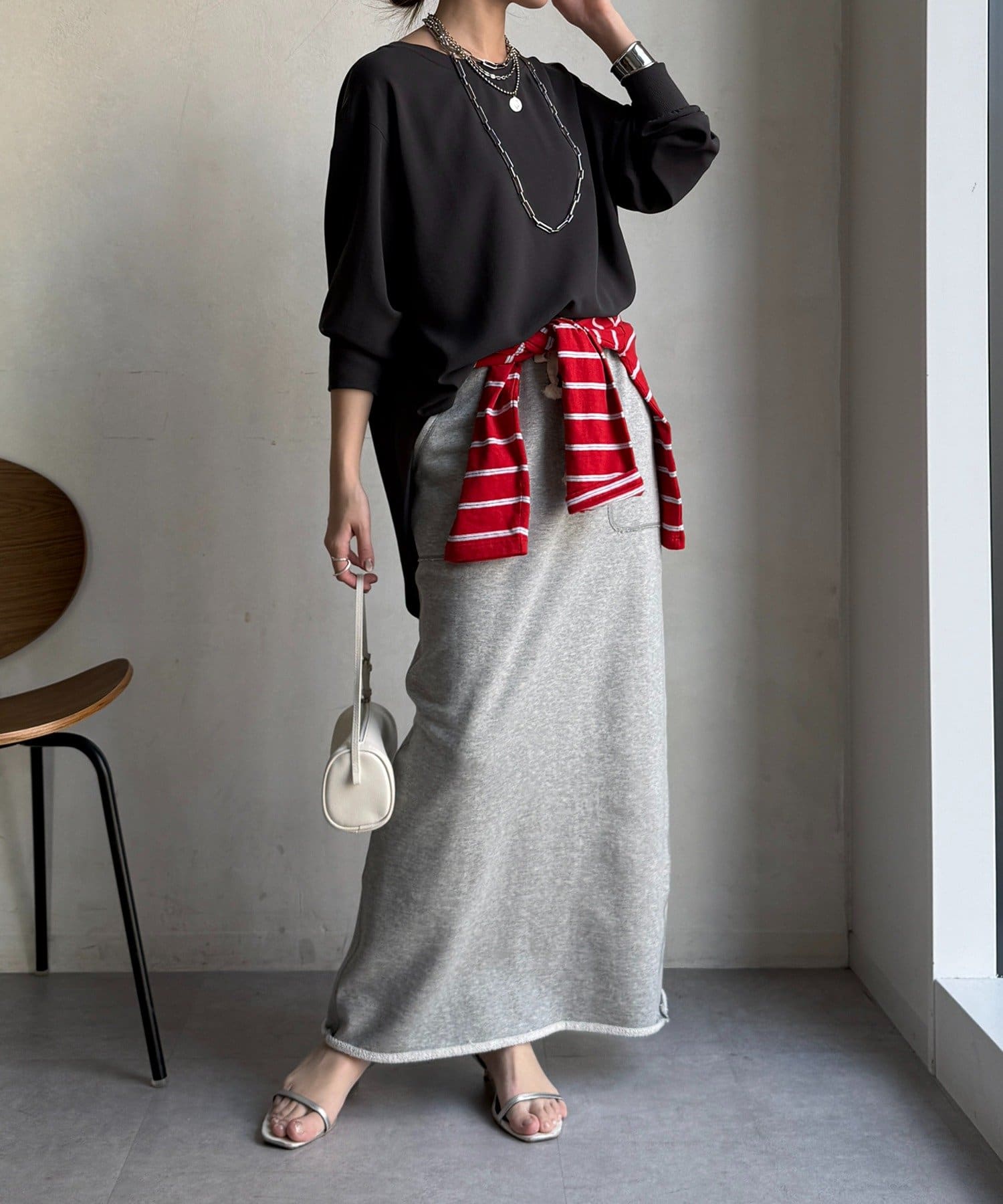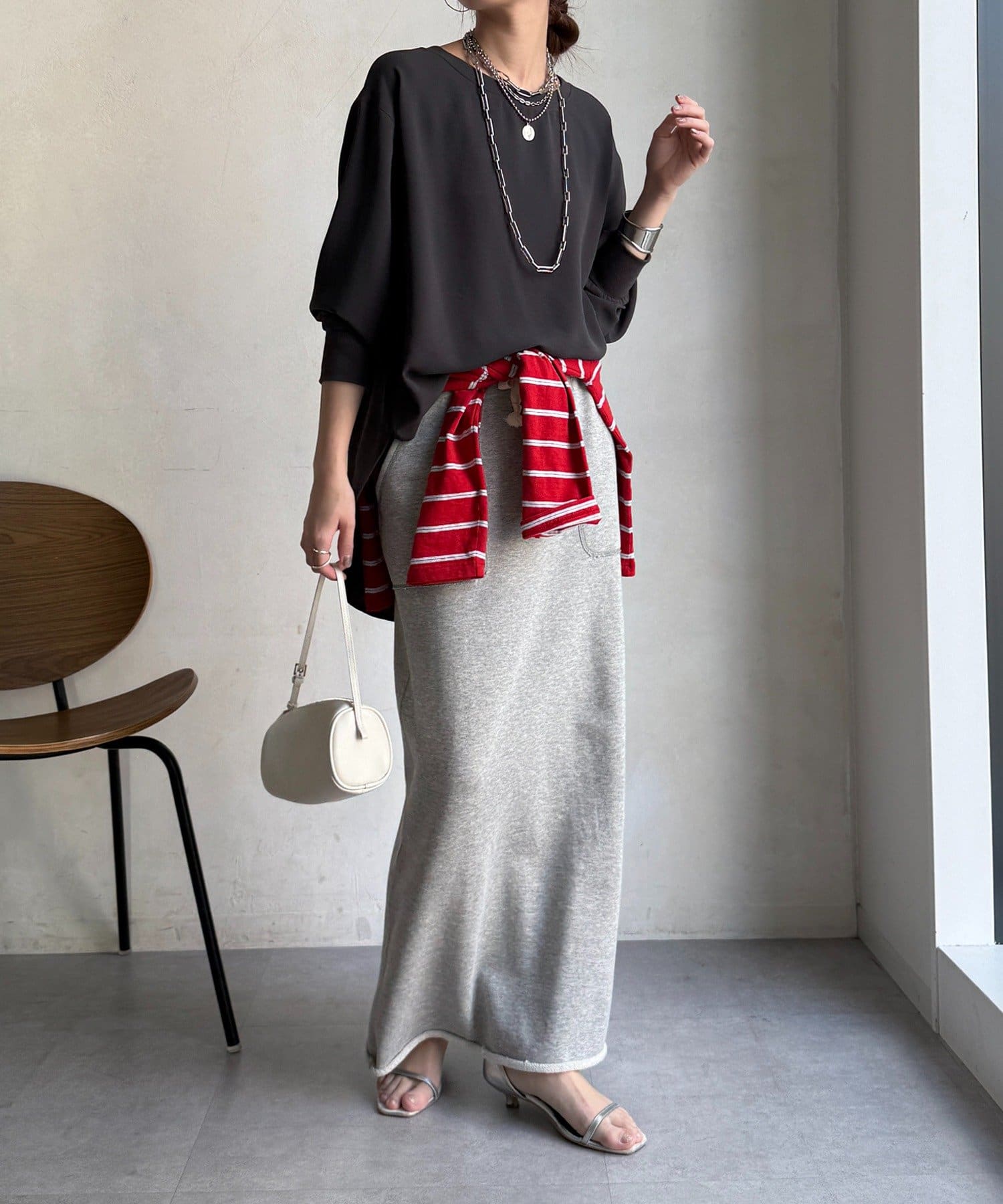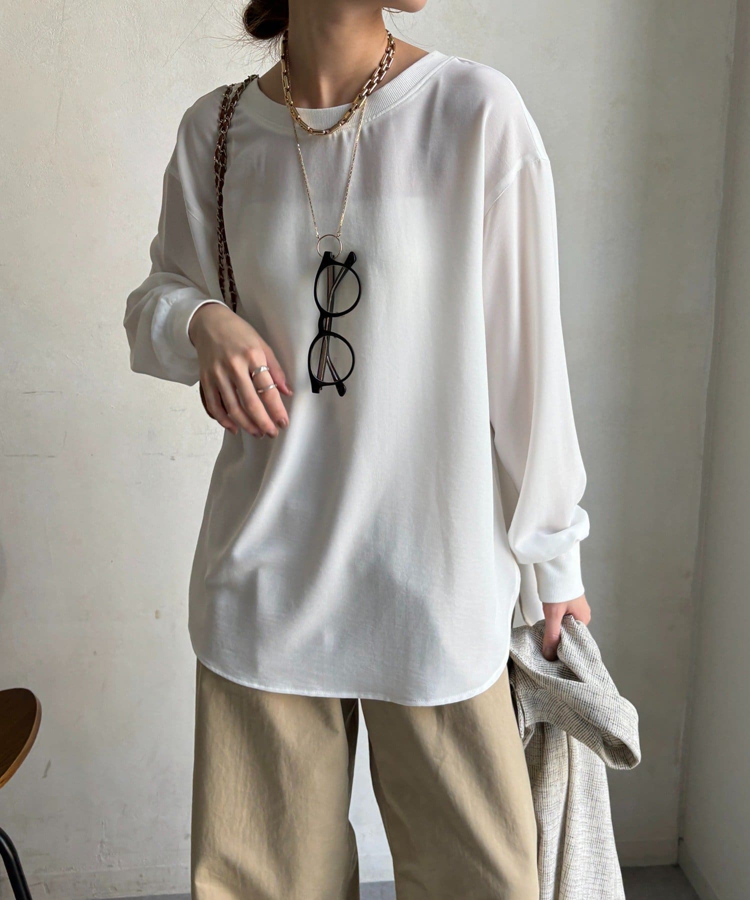 身体のラインを拾いすぎない、程よくゆったりとしたシルエット。ヒップにかかる丈感で、安心感のある着心地。