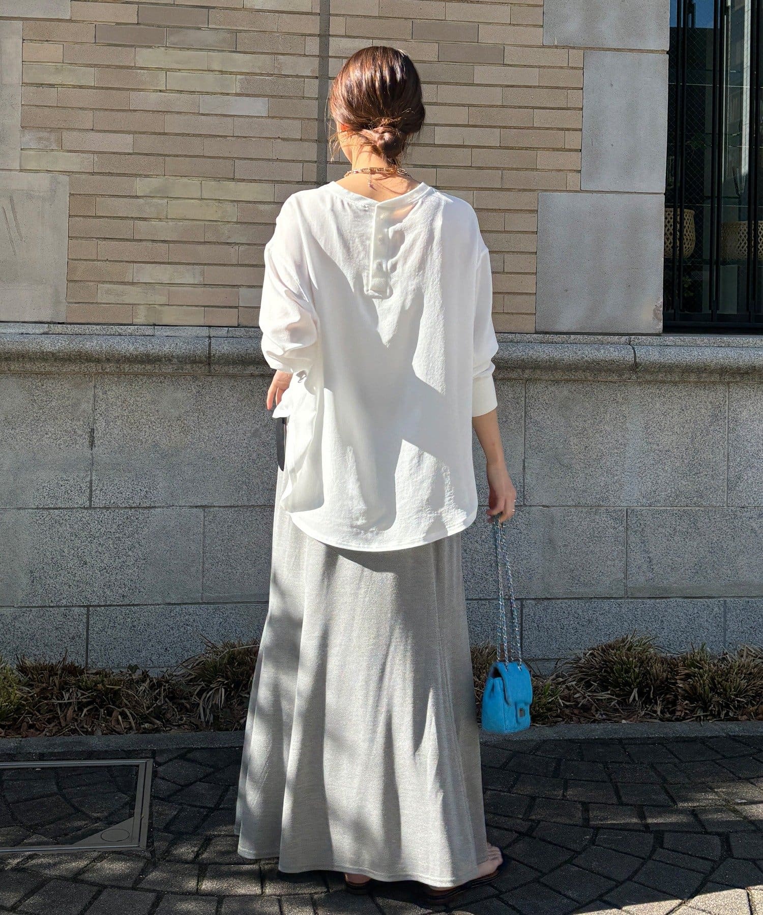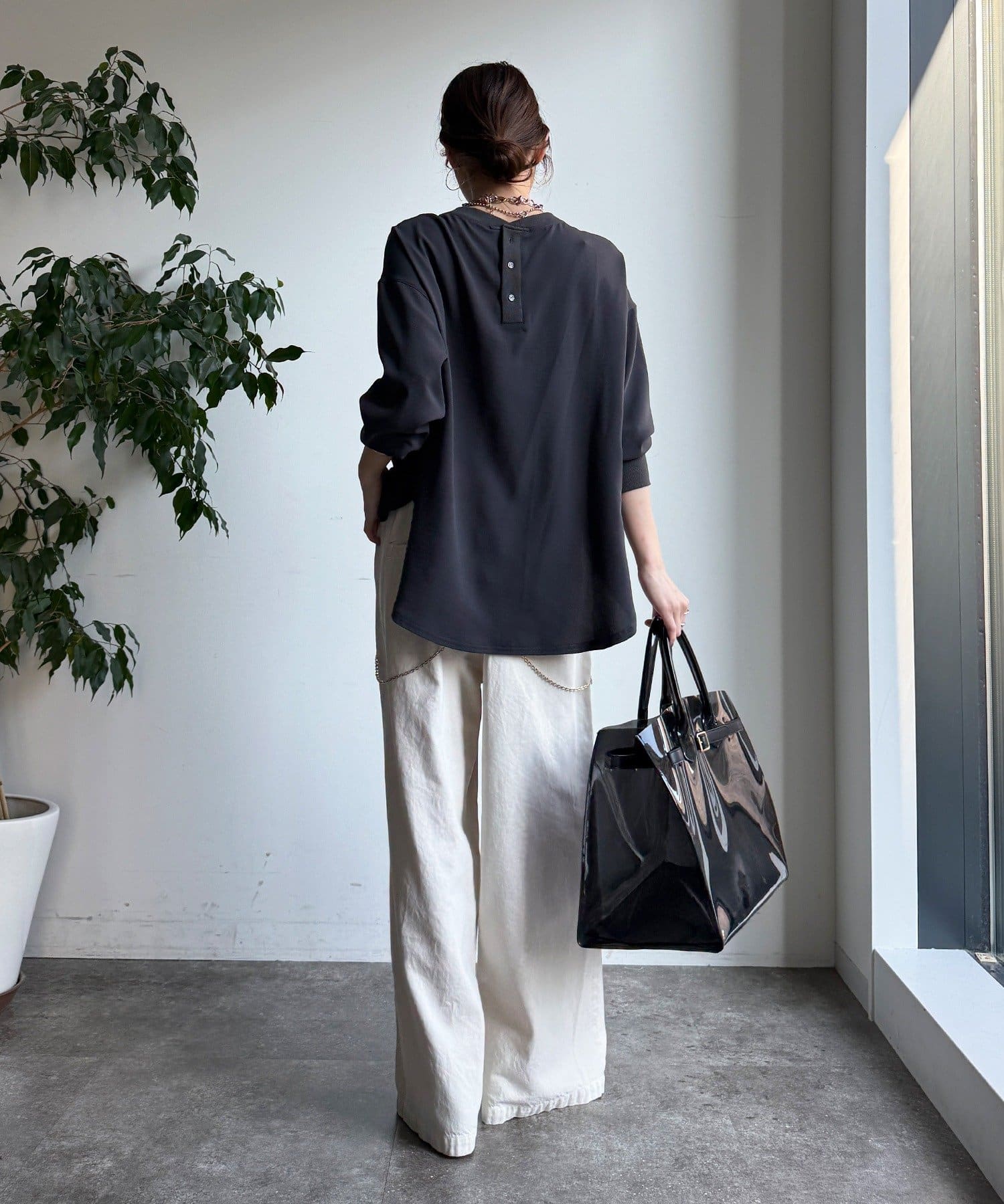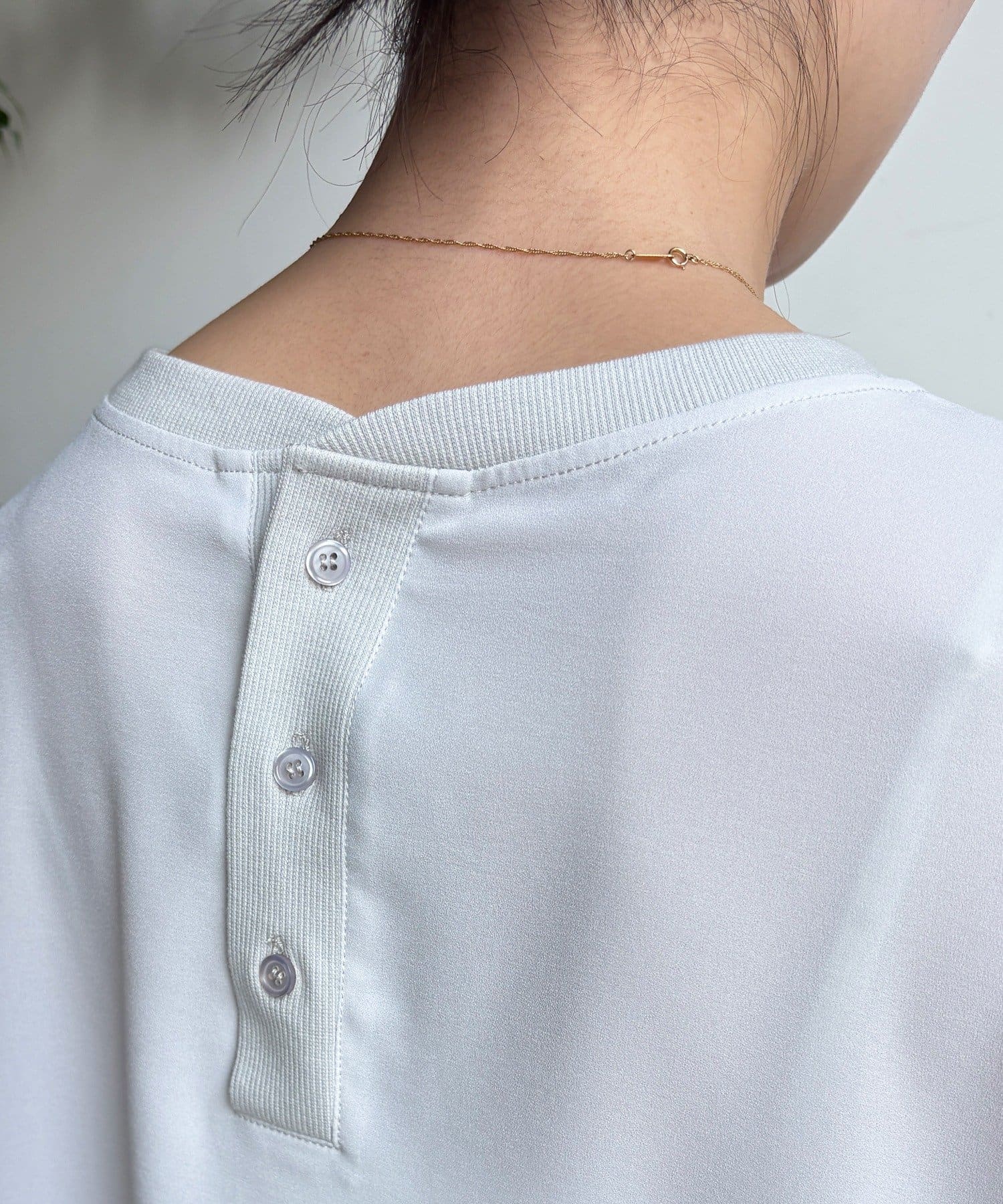 バックネック部分にはボタンのデザインをプラスし、さり気のないポイントになってくれますよ。