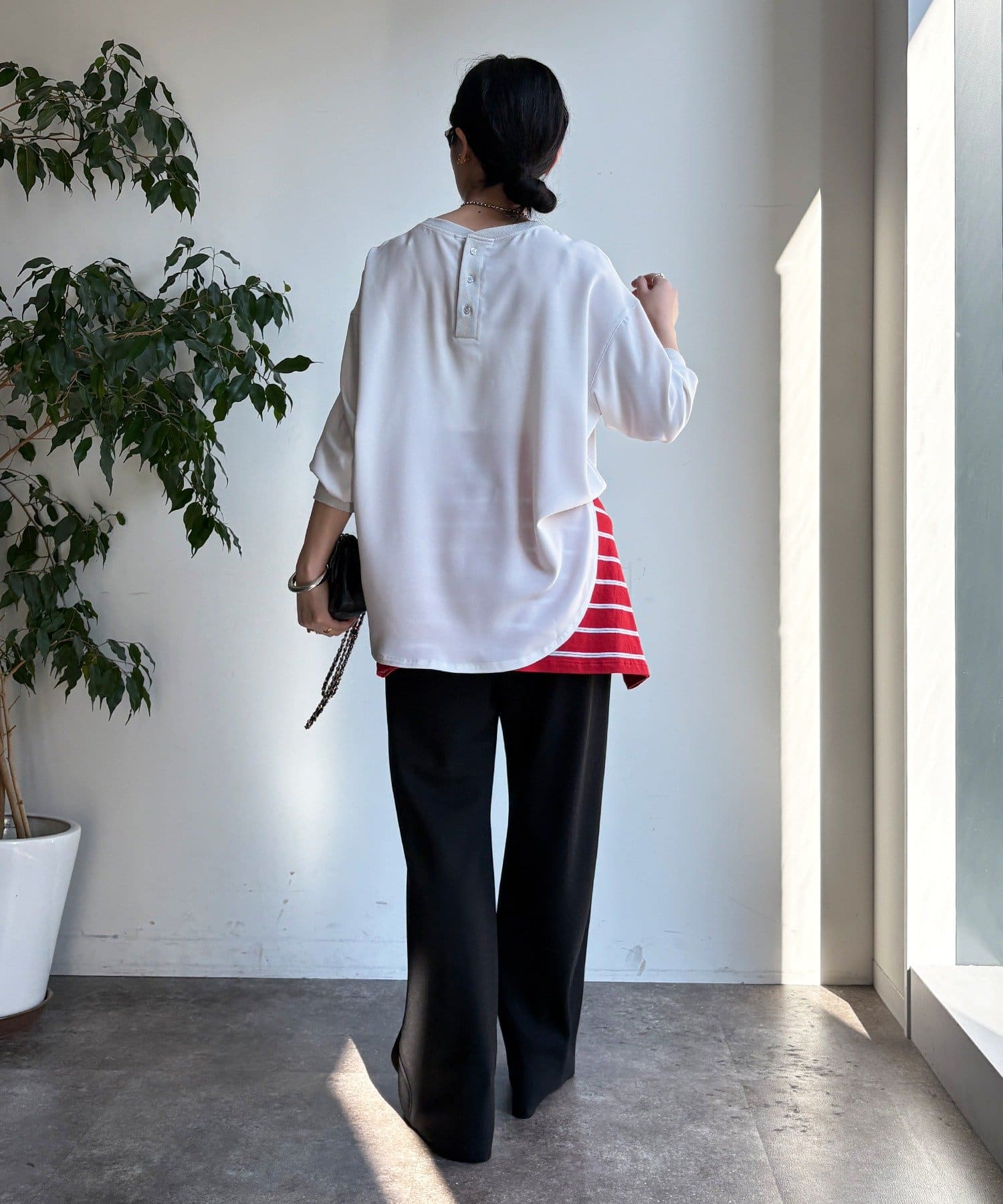 ゆるっと抜け感のでるルーズなサイジングで、後ろ下がりのシルエット。ヒップもカバーしてくれるため、安心感抜群です。