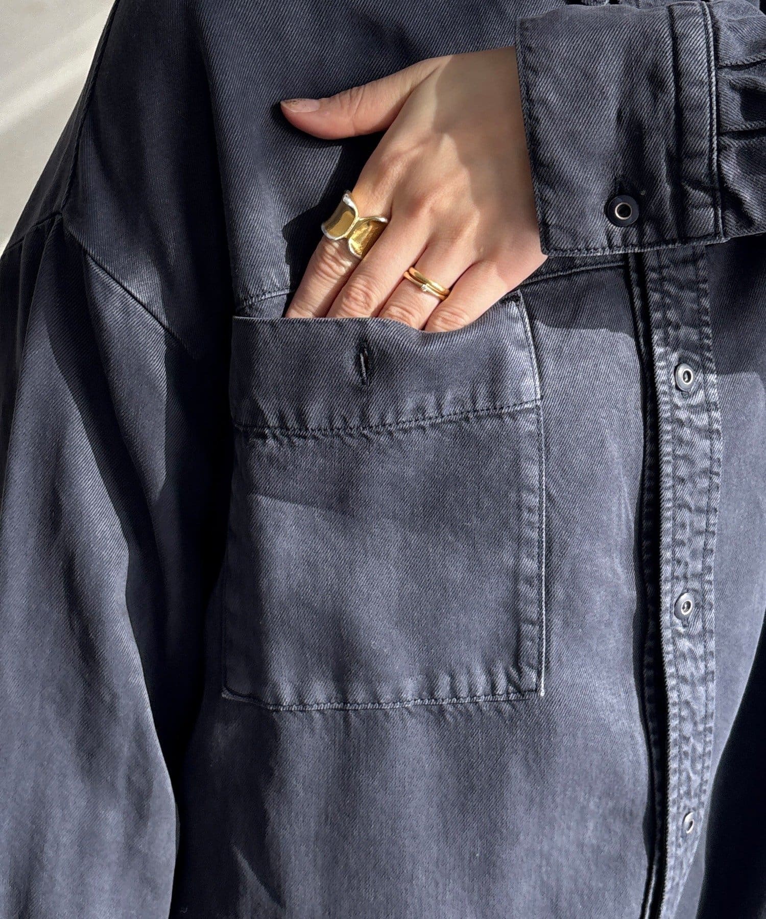 フロントの大きなポケットや背中のタックでワークテイストを取り入れつつ、しなやかな質感で品よく大人な印象に仕上げました。