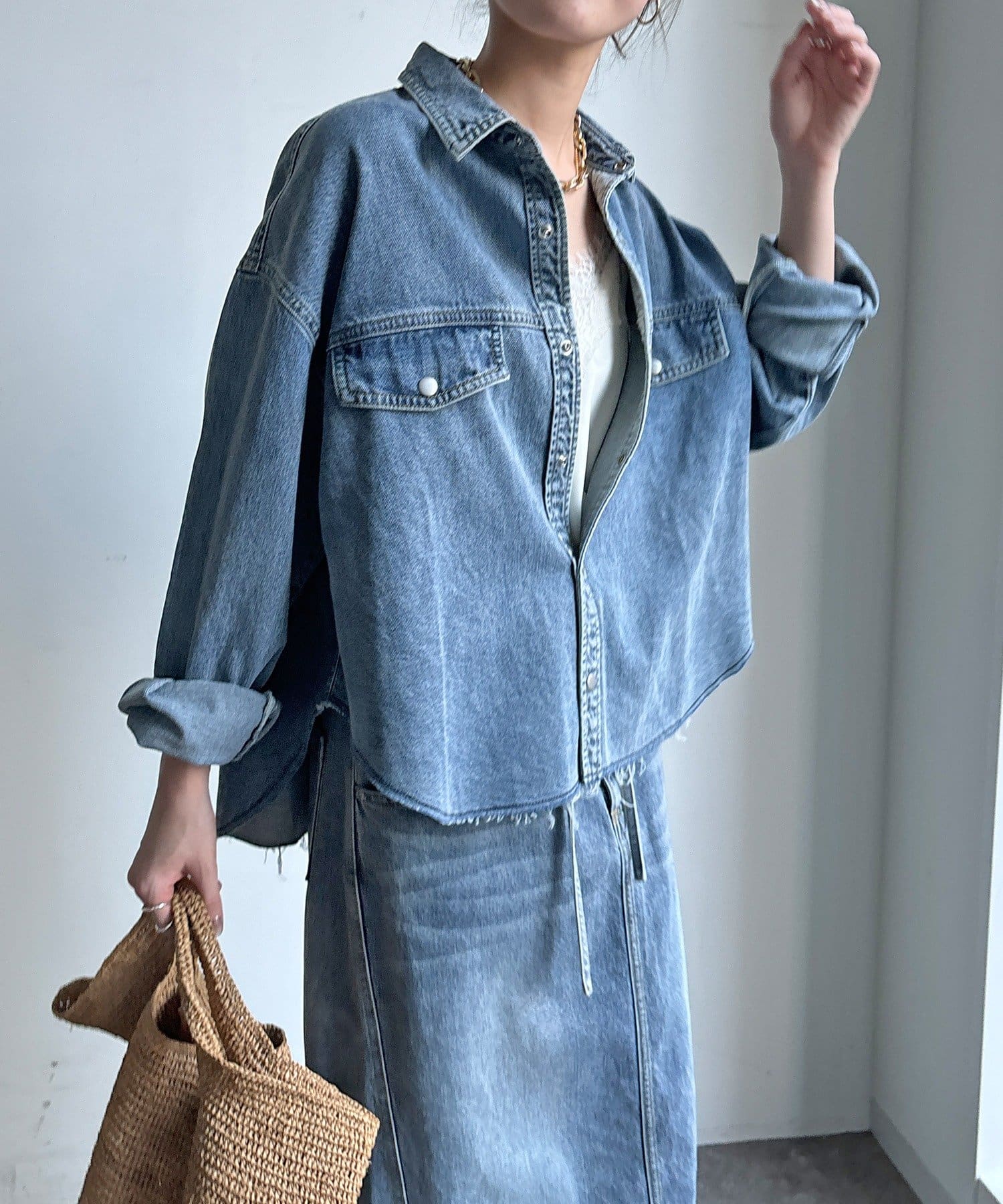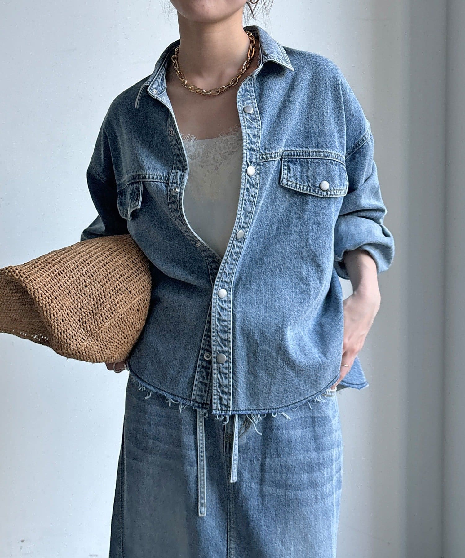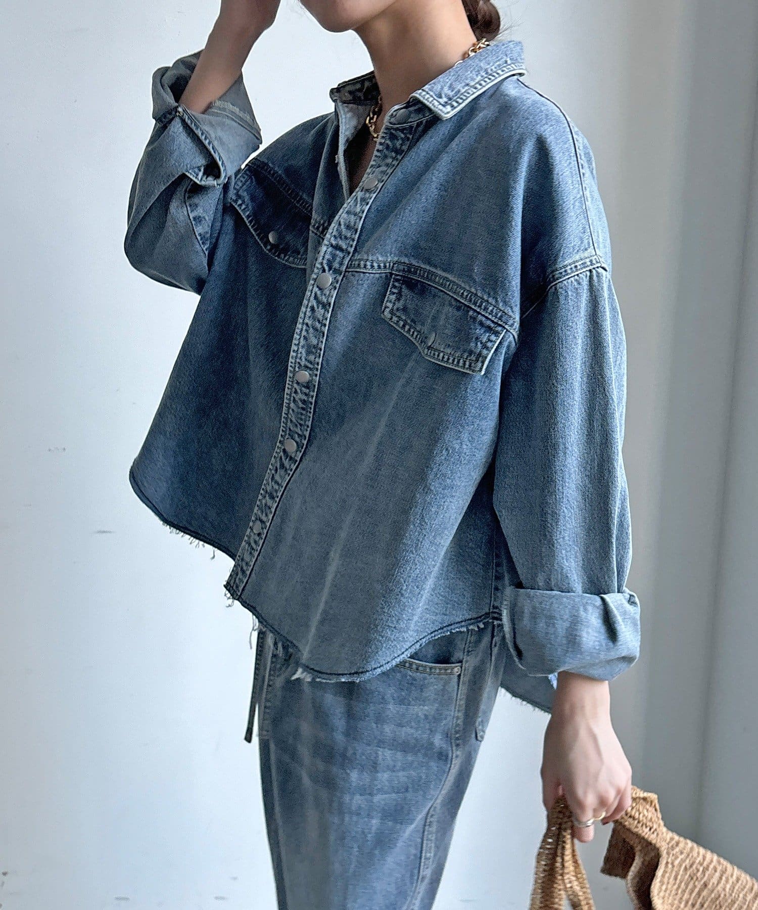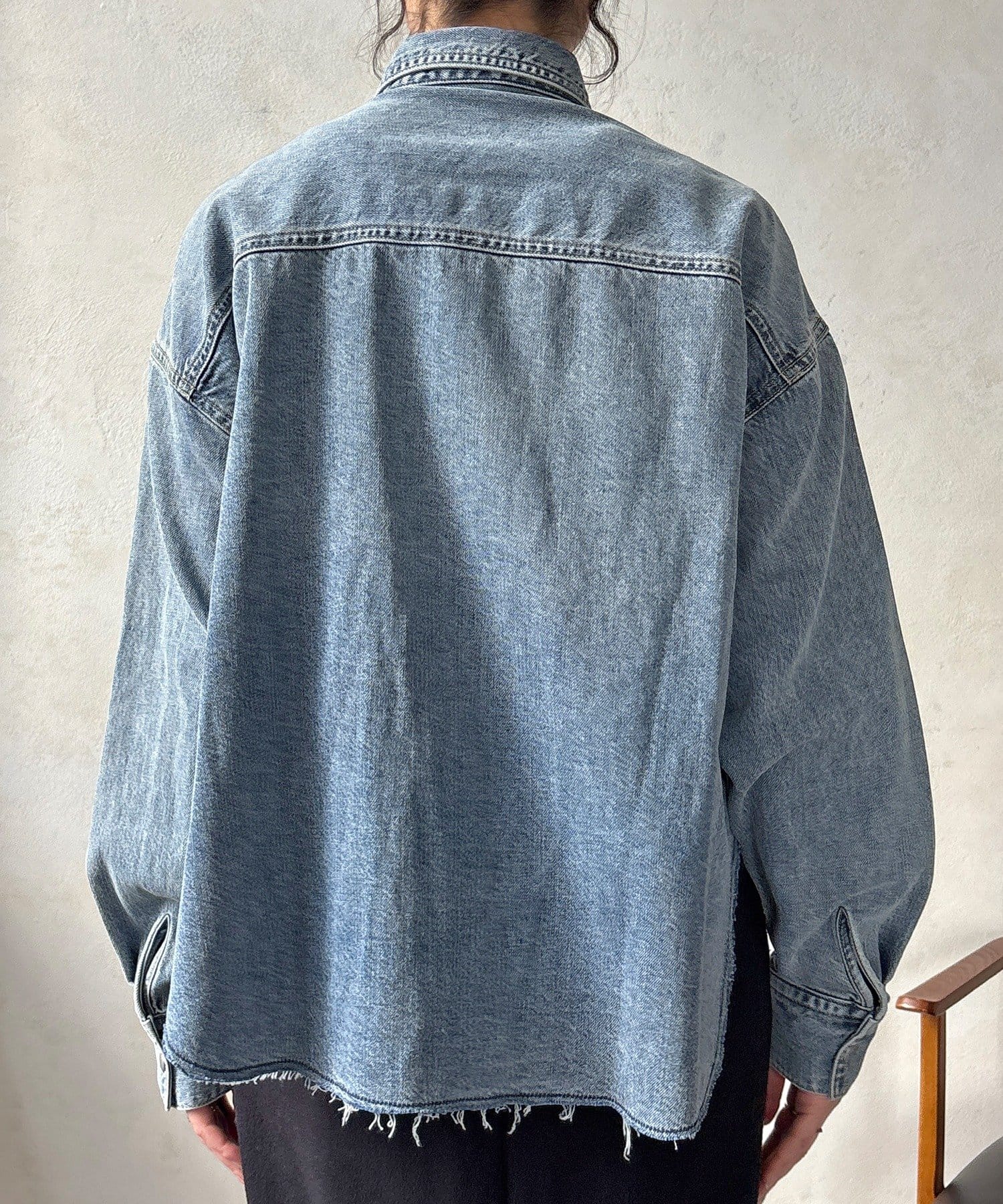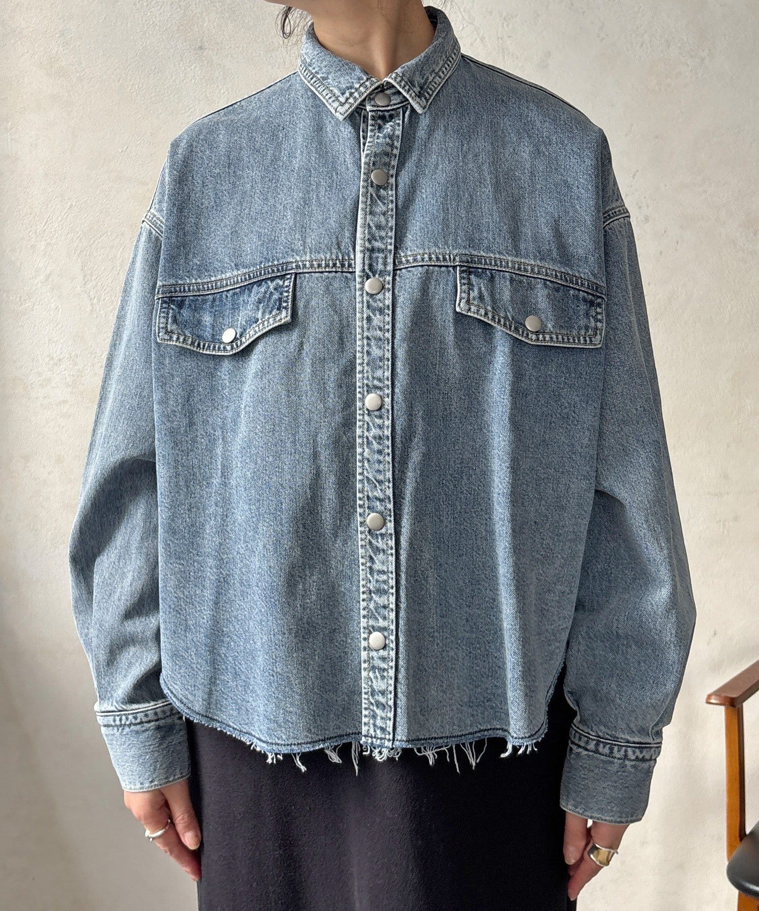スカートとセットアップで着用可能!裾のカットオフが可愛いデニムシャツ