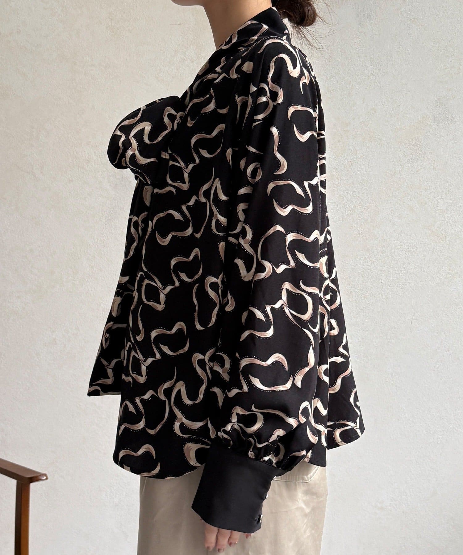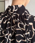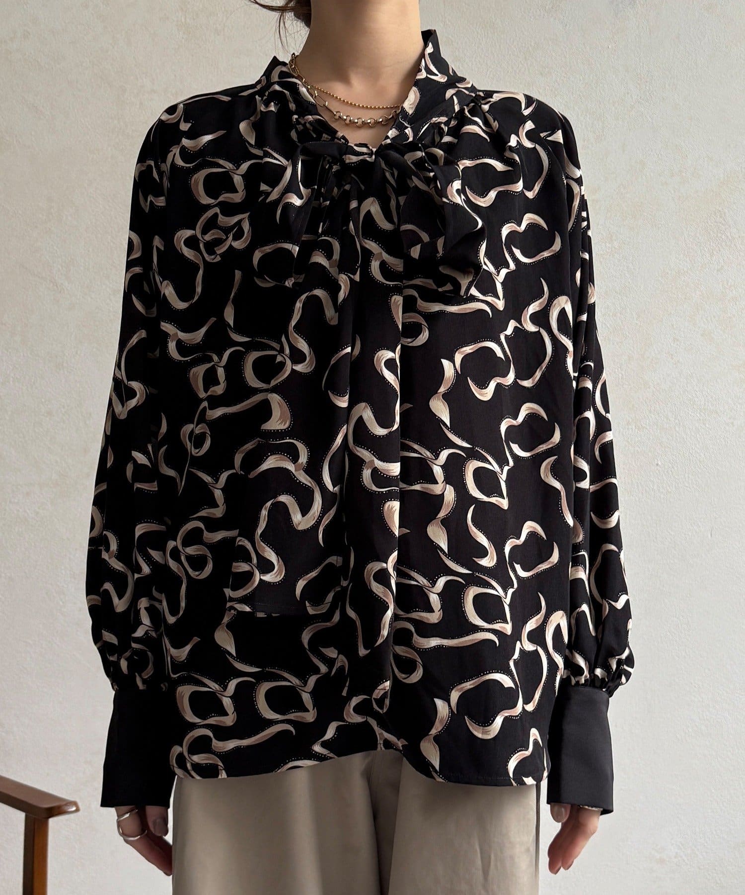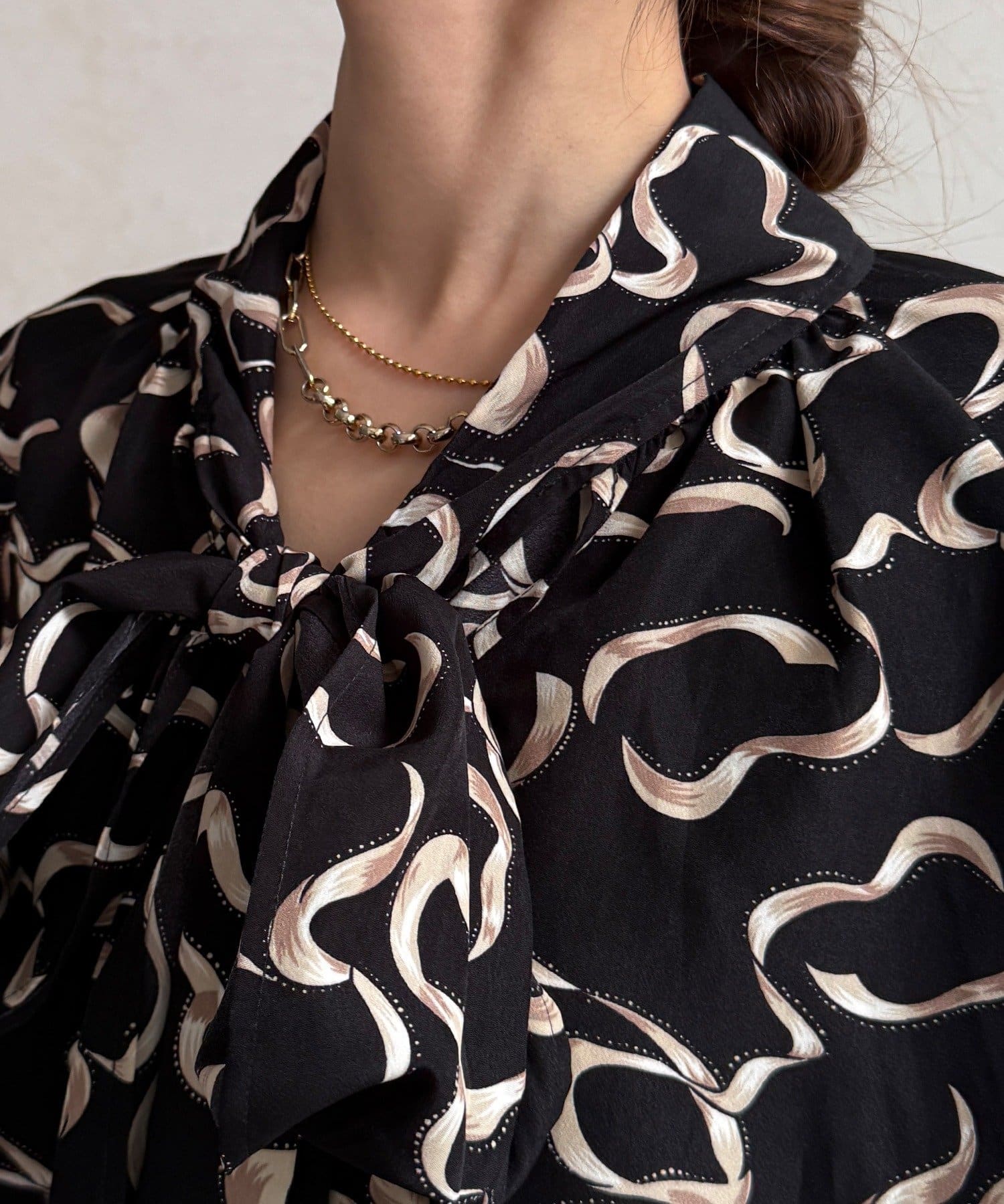 目を惹く柄デザインと、大きめのボウタイが顔まわりを華やかに演出します。