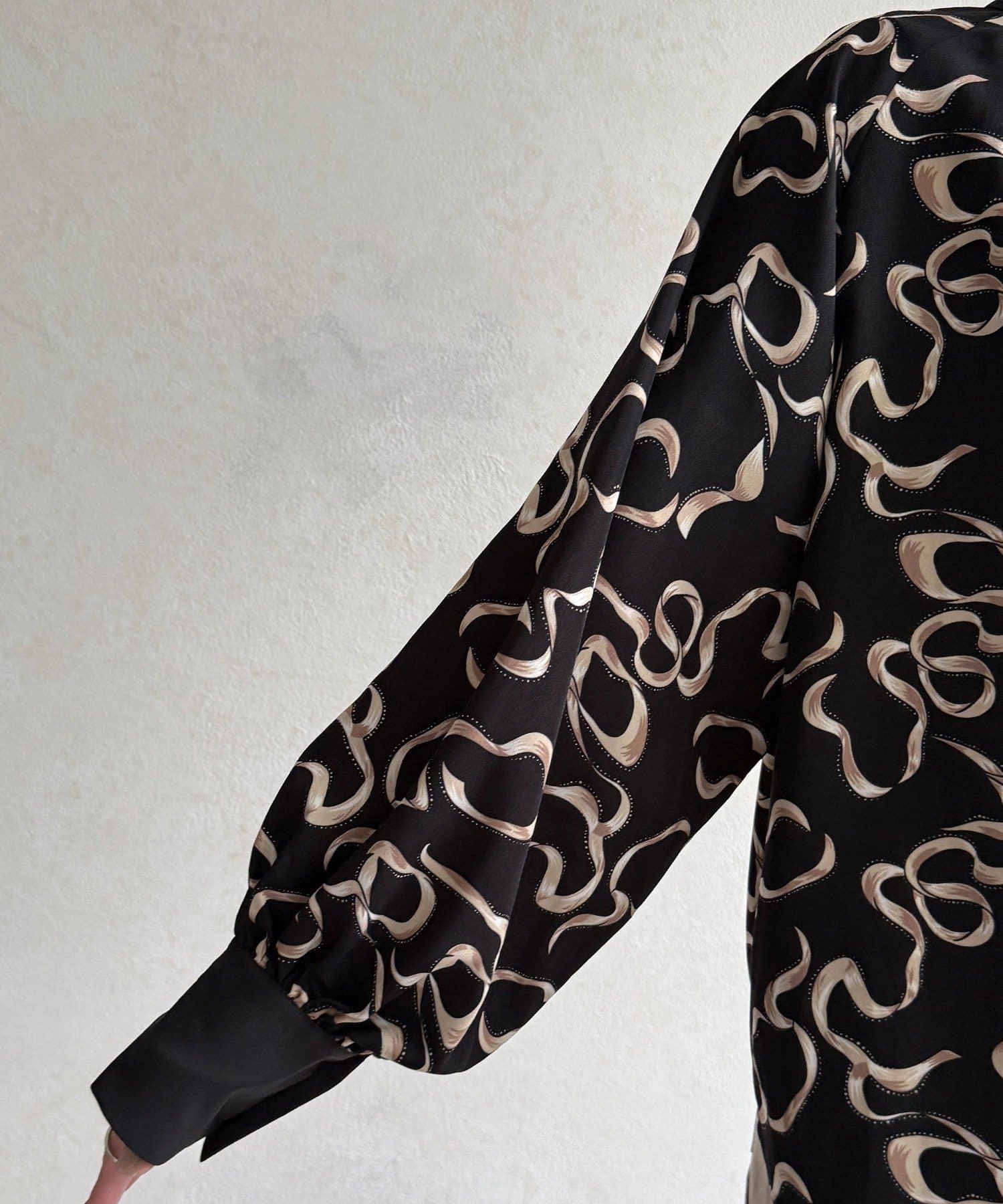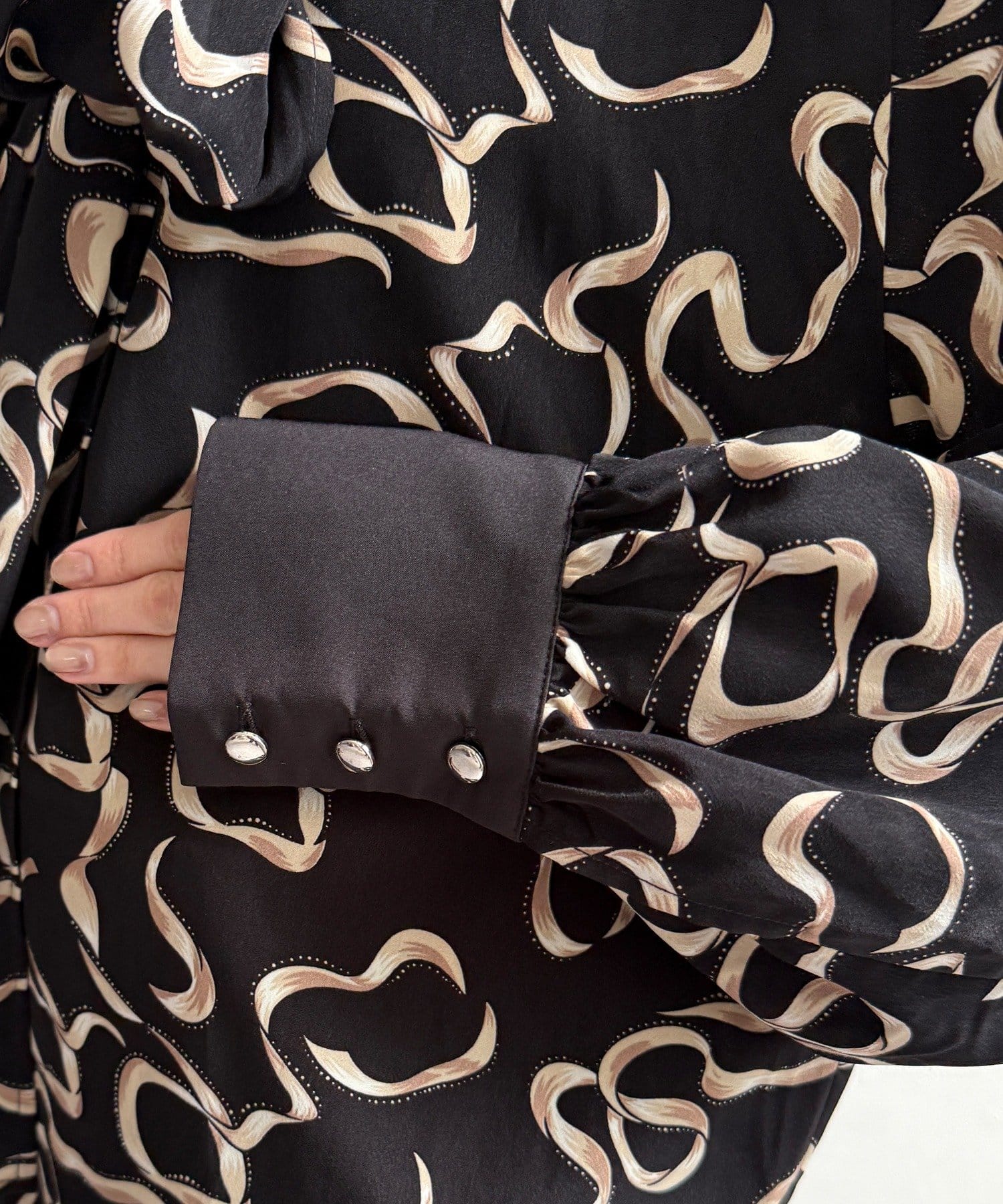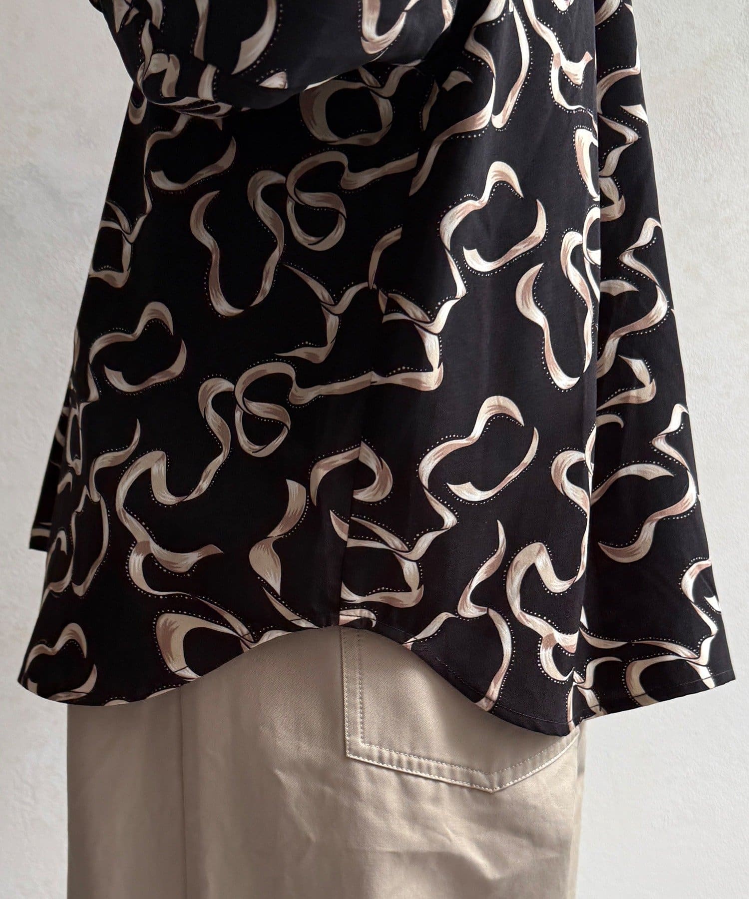 目を惹く柄デザインと、大きめのボウタイが顔まわりを華やかに演出します。