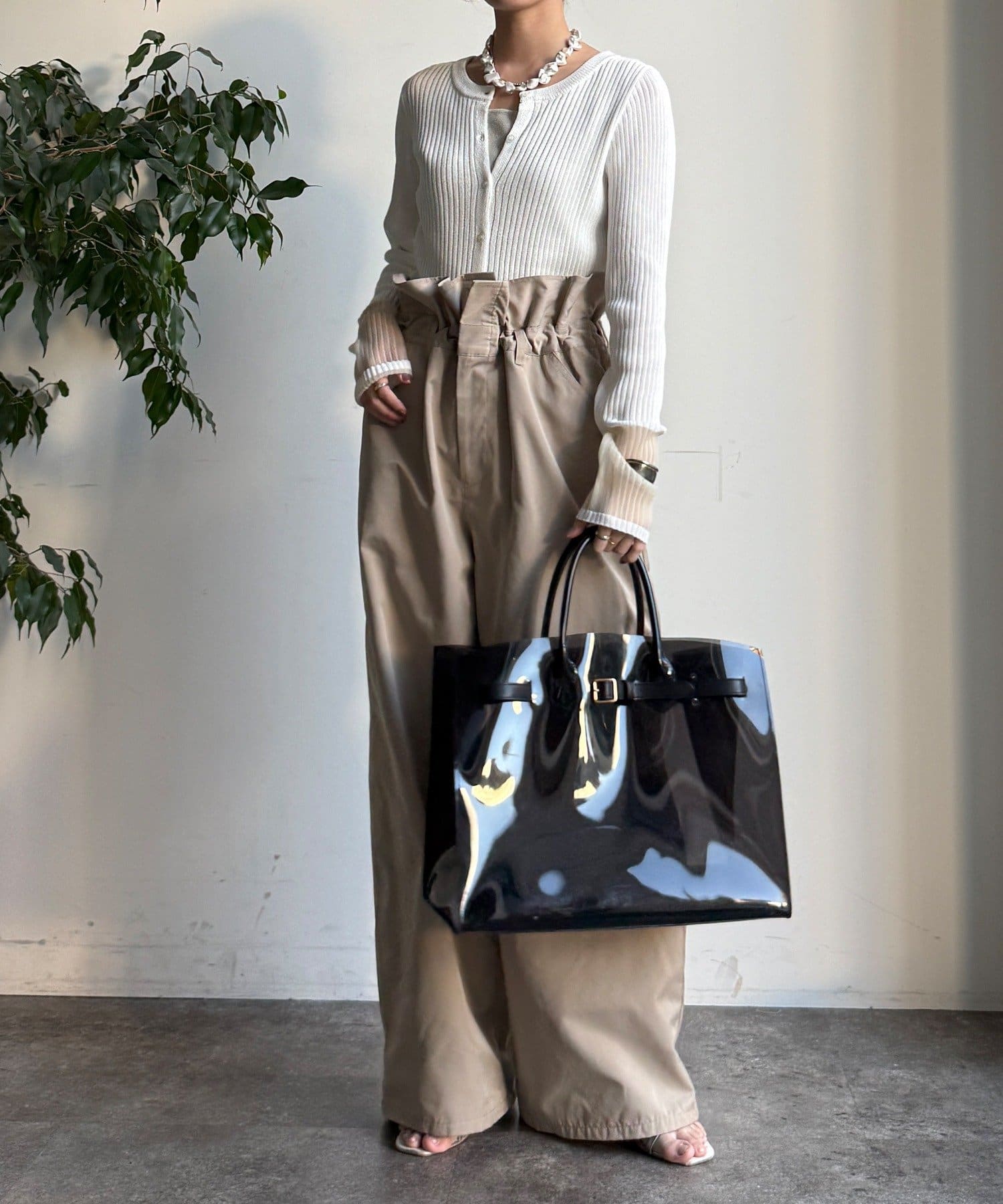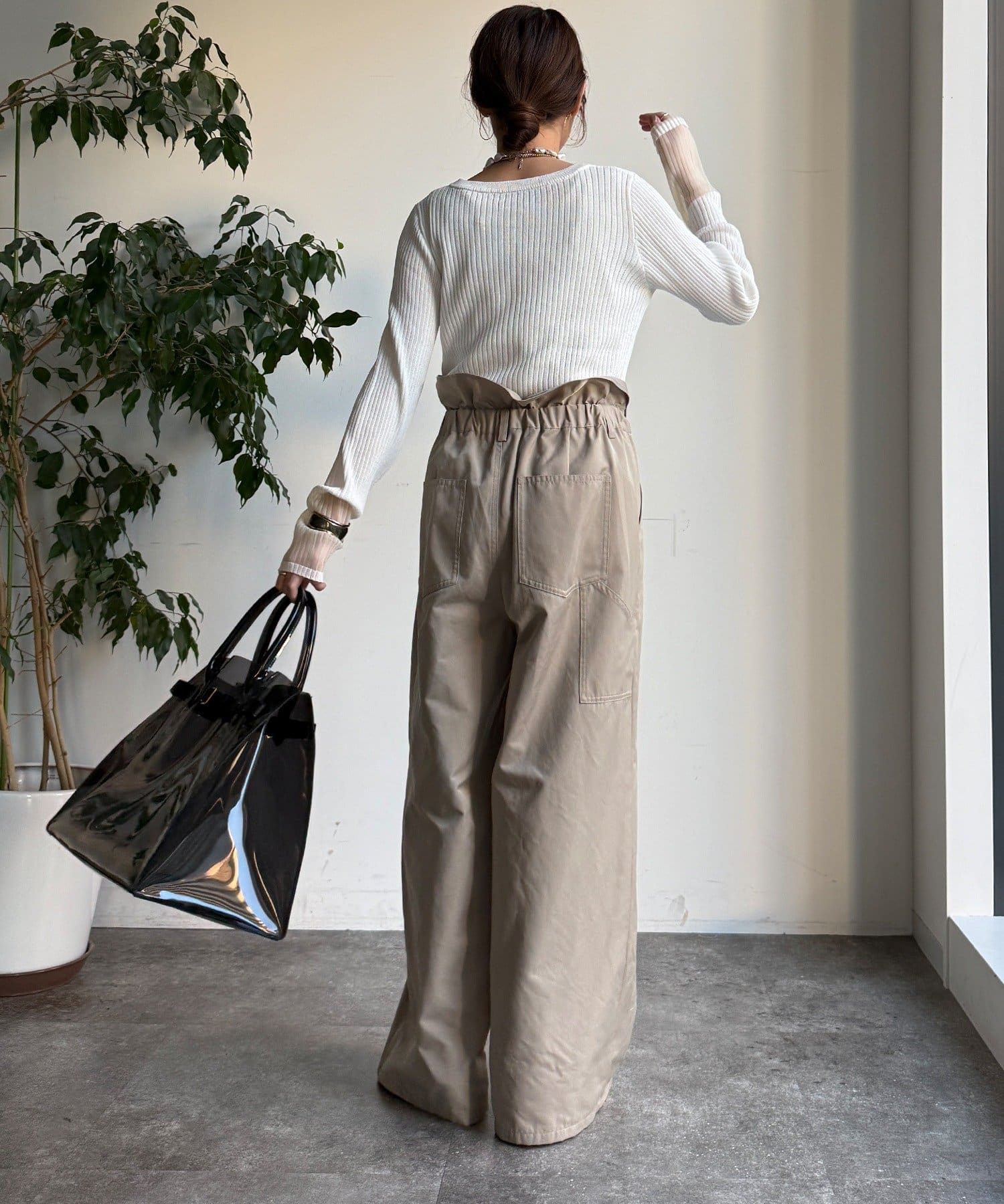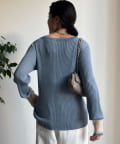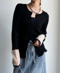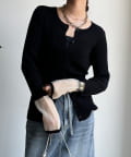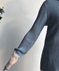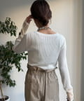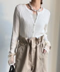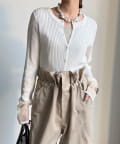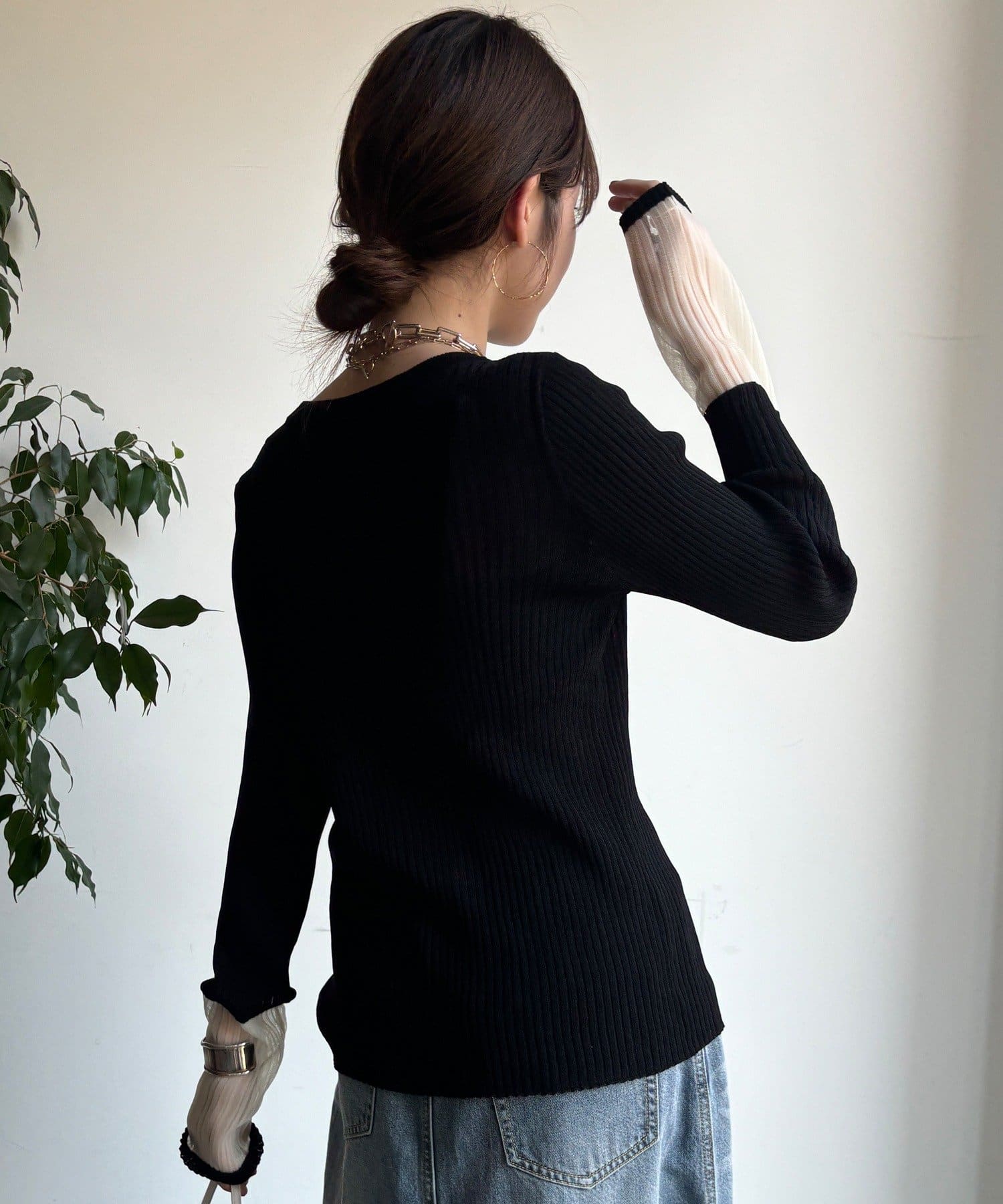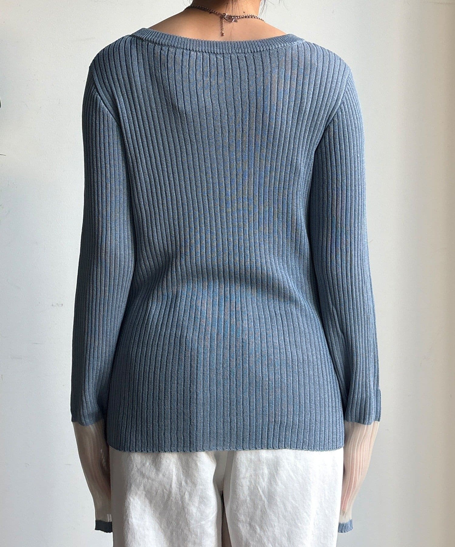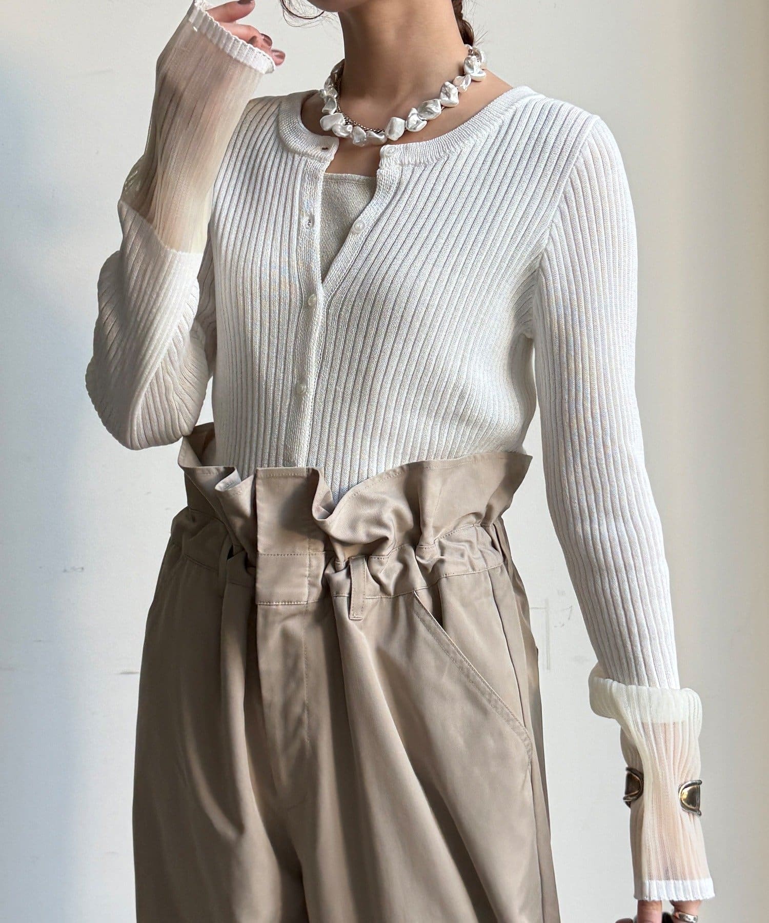 柔らかなリブニットと、袖口の繊細なシアー素材を組み合わせた、一枚でサマになるデザイン。