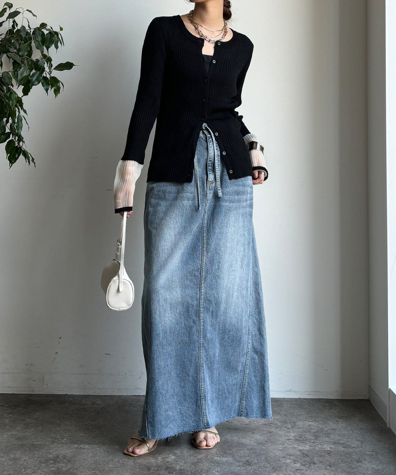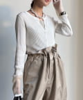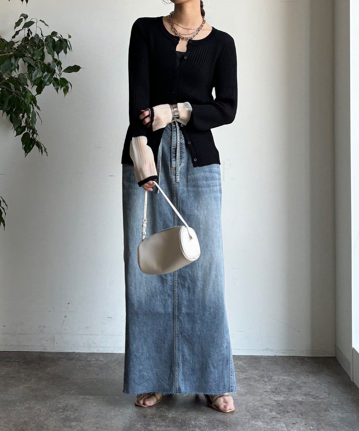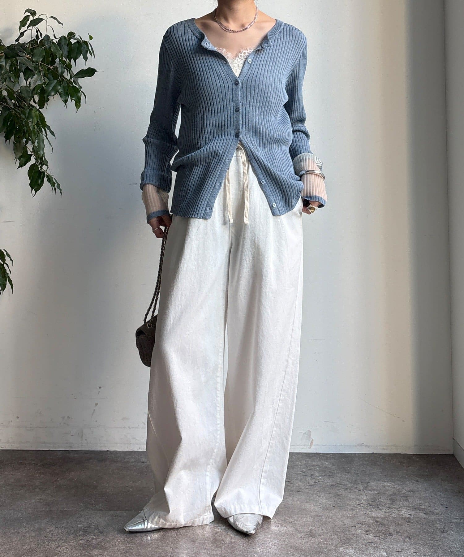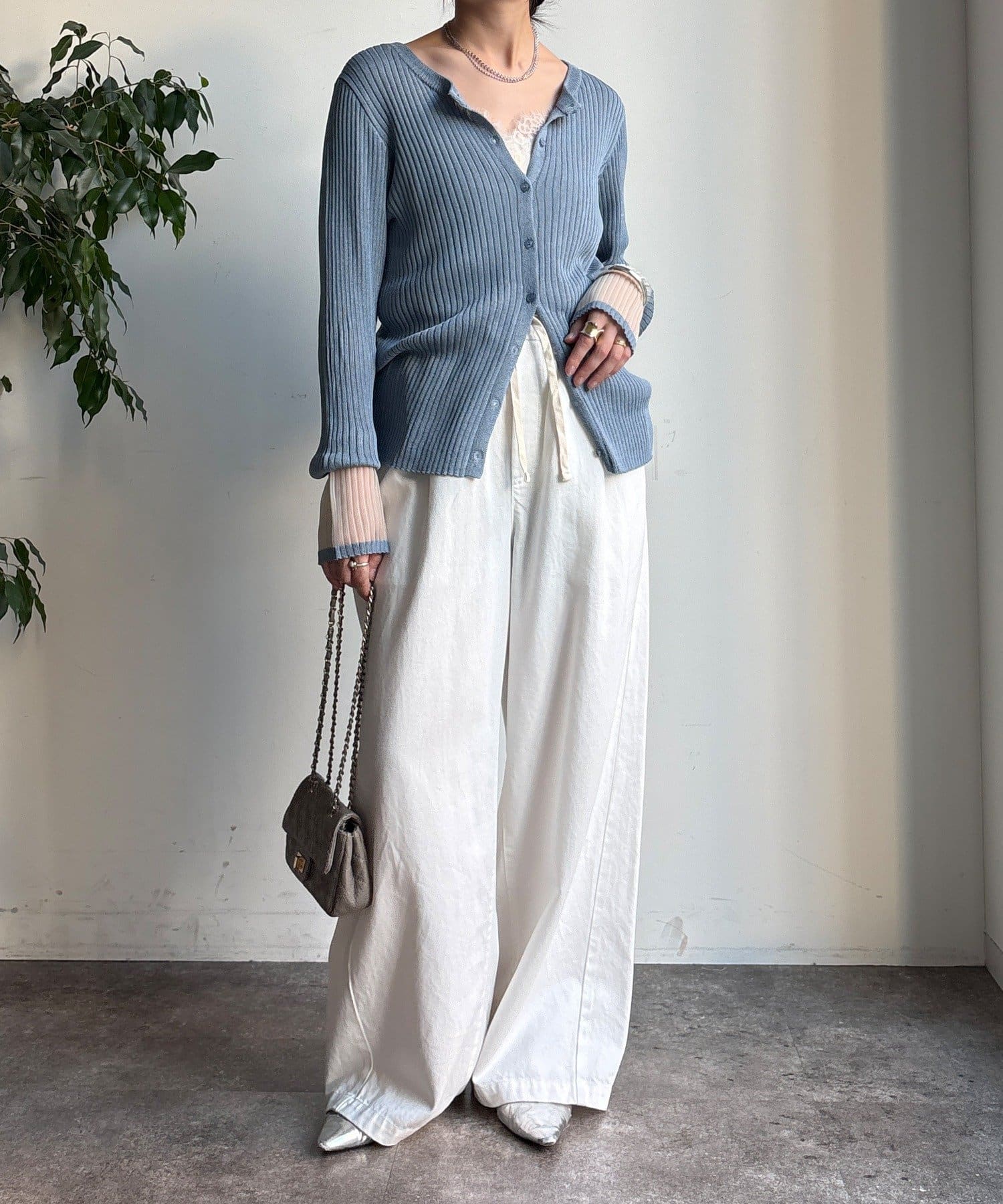 リブの縦ラインが全身をスッキリと細見えさせ、あえて下のボタンを数個開けて着こなすことで、