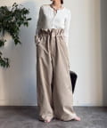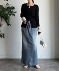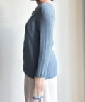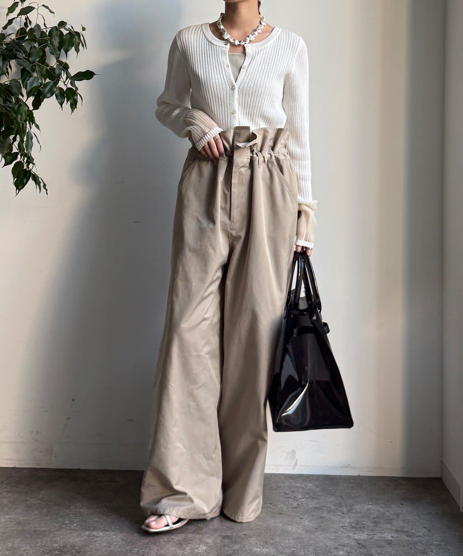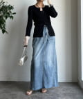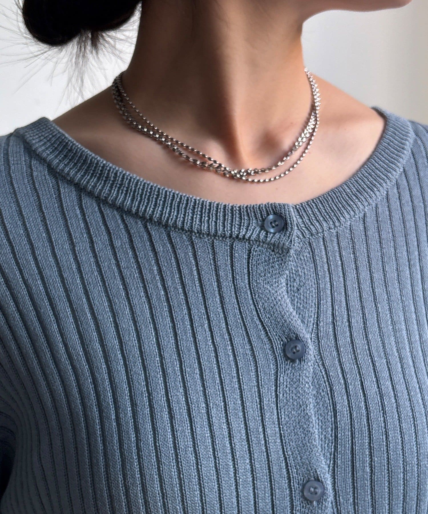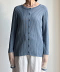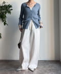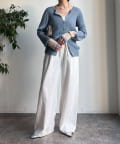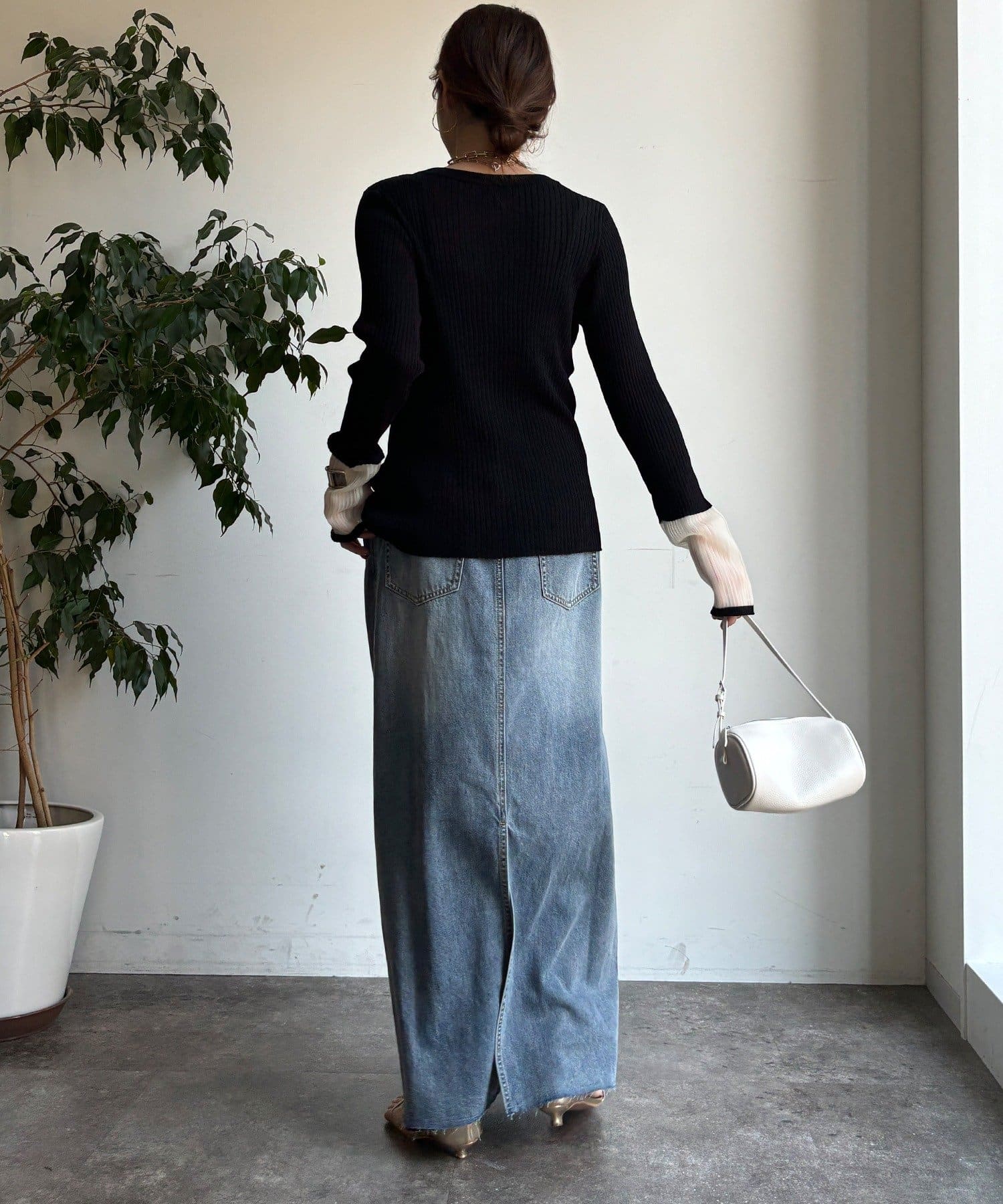 リブの縦ラインが全身をスッキリと細見えさせ、あえて下のボタンを数個開けて着こなすことで、