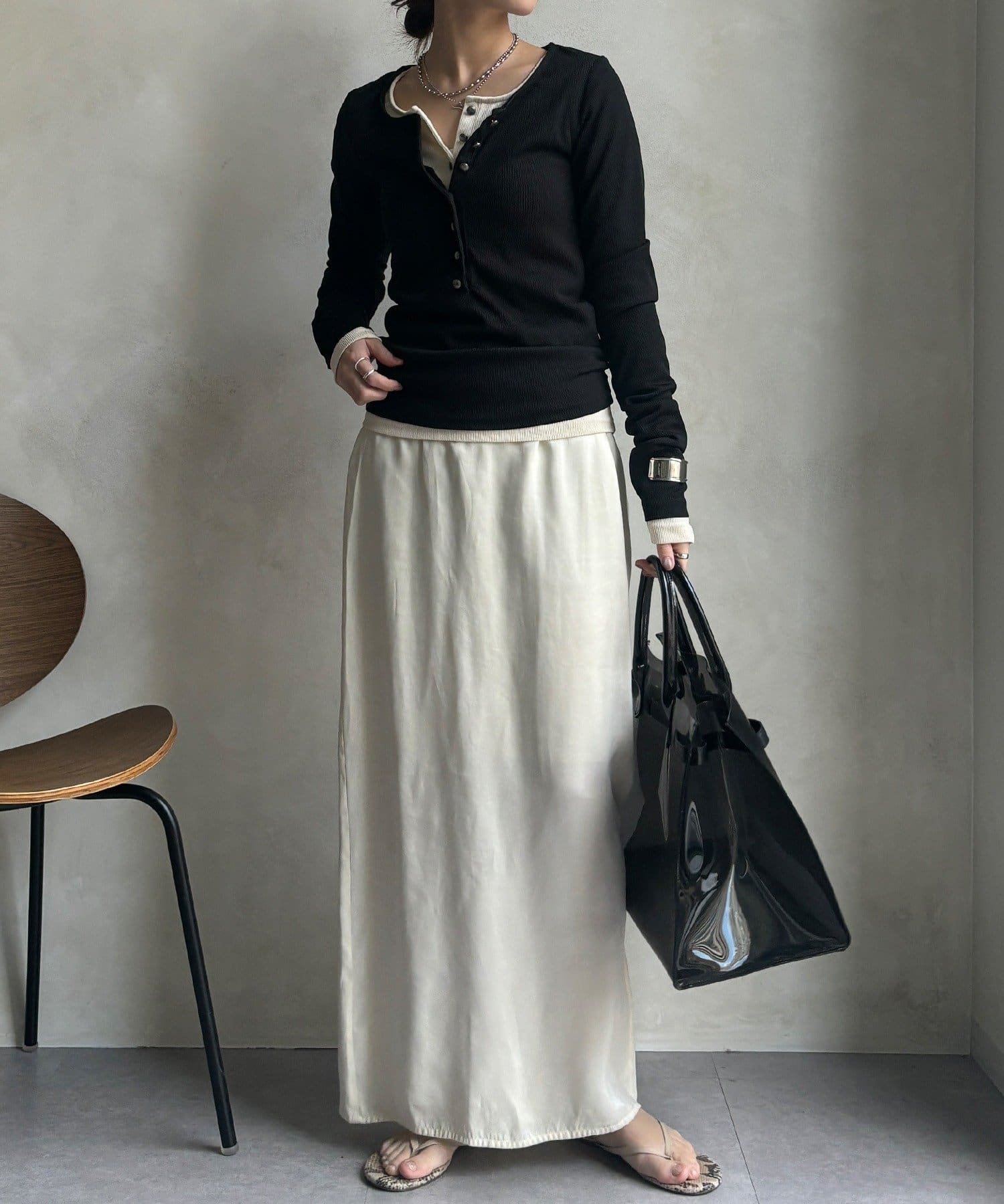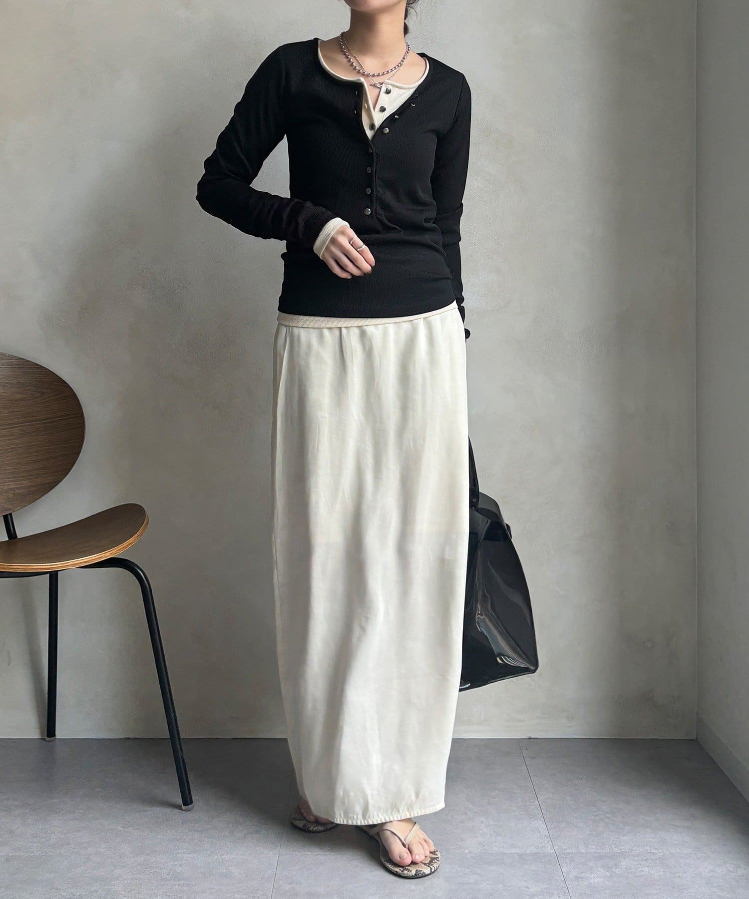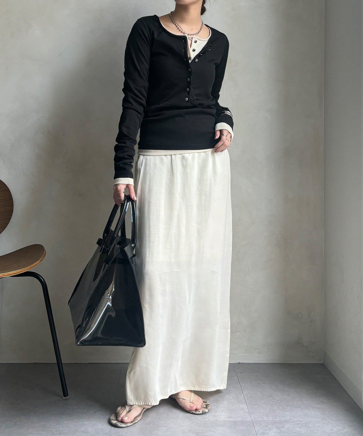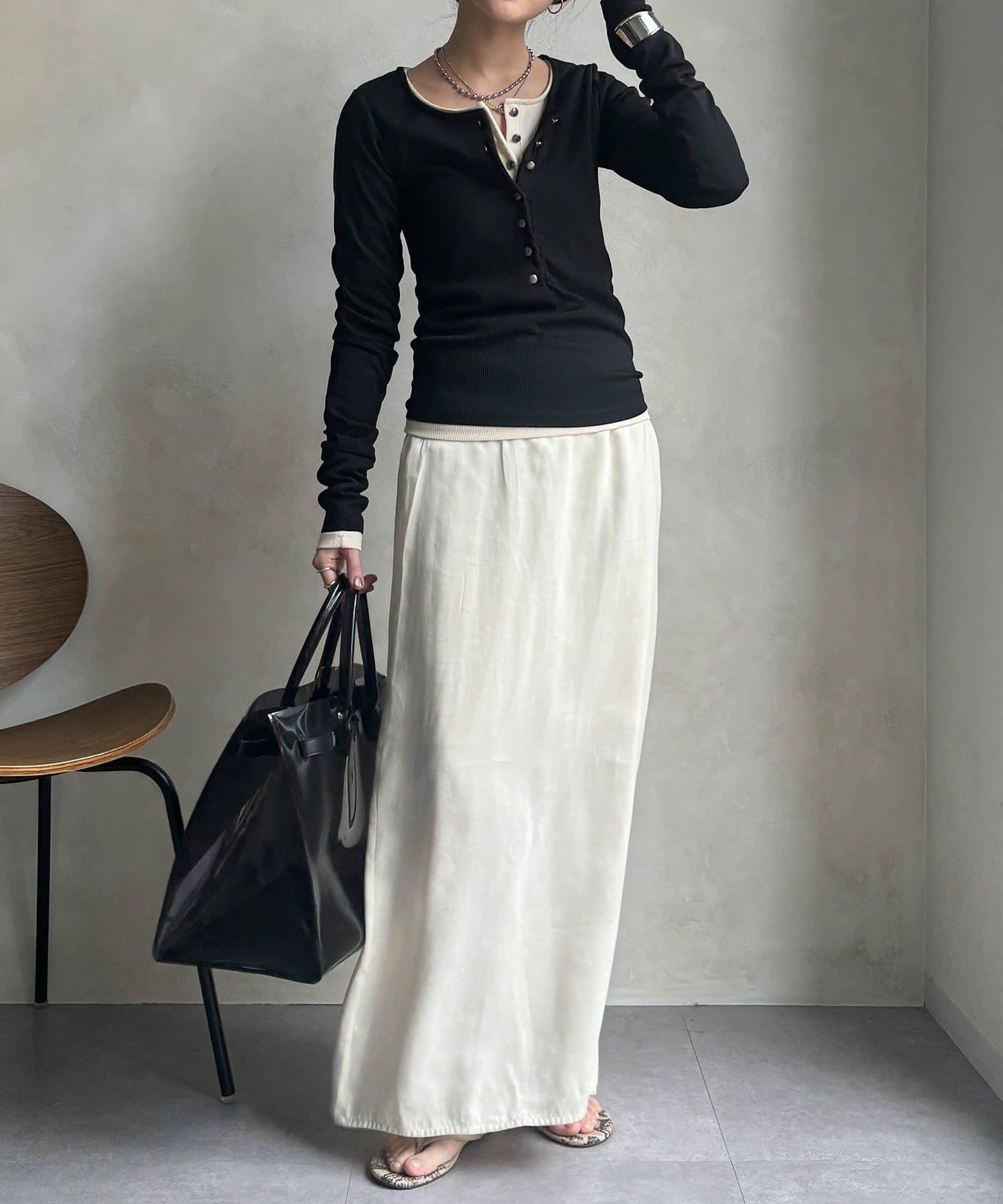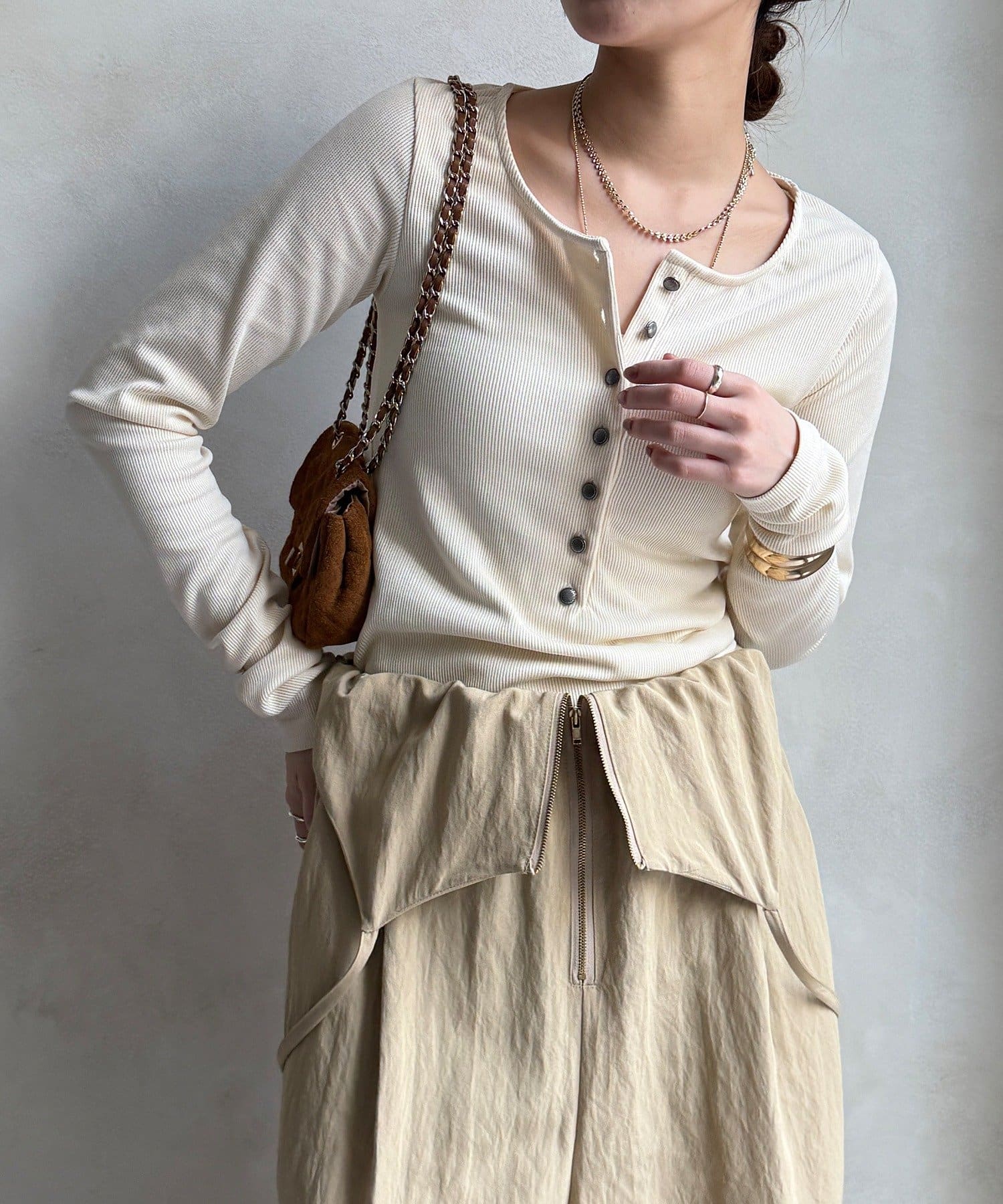 程よいピタッと感とヘンリーネックが大人な雰囲気に