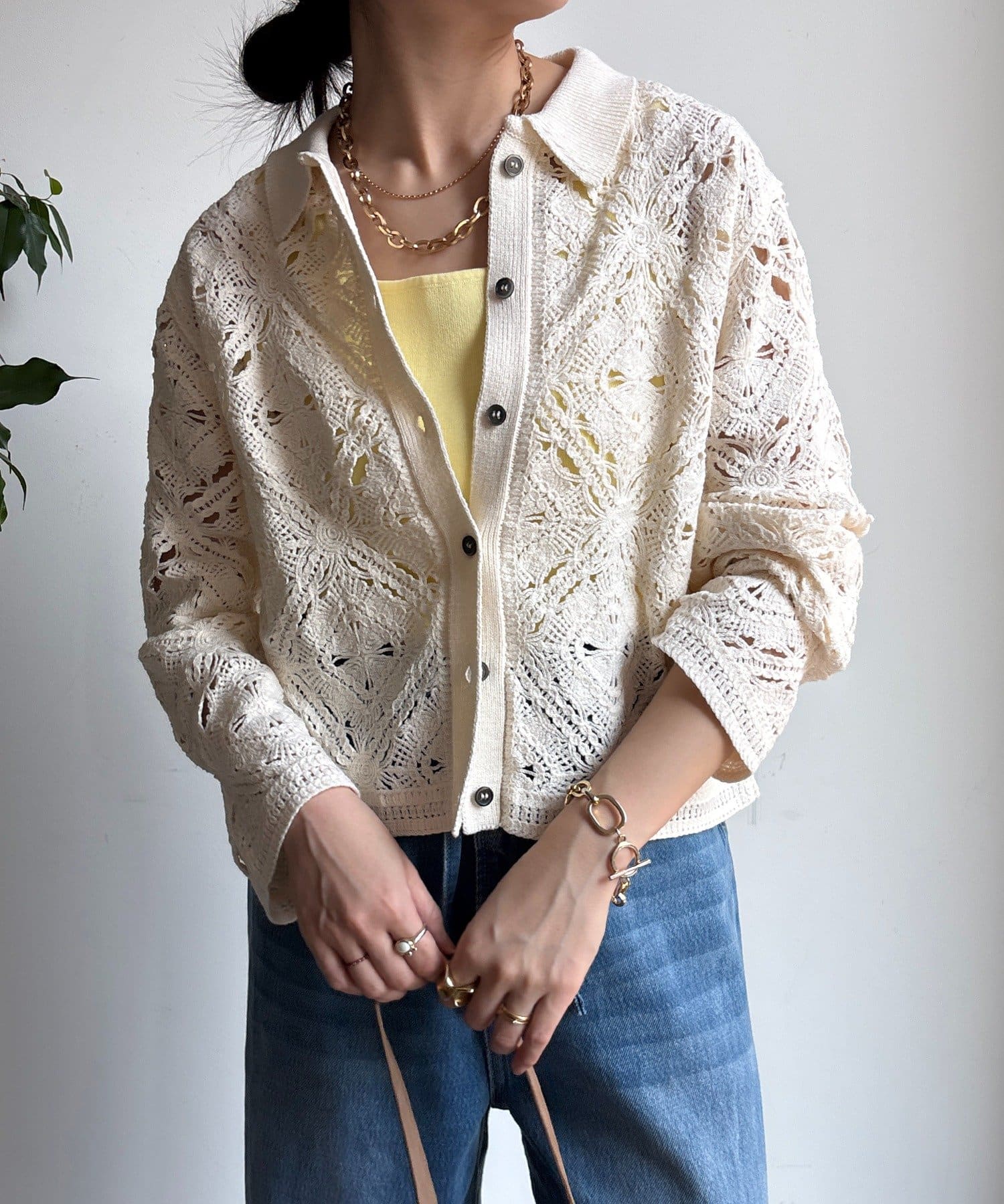 レース柄の透け感が、スタイリングに軽さと抜けを演出。