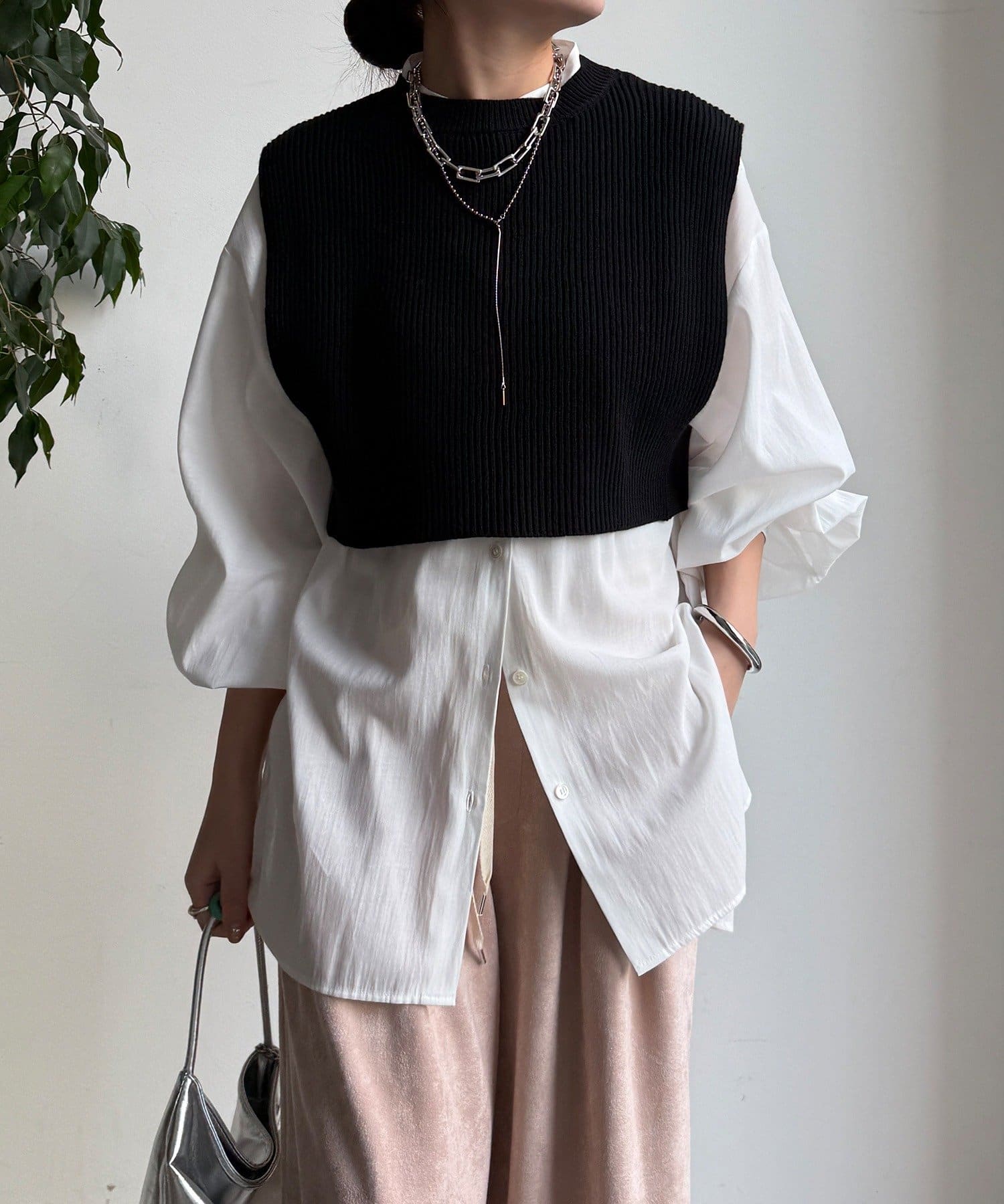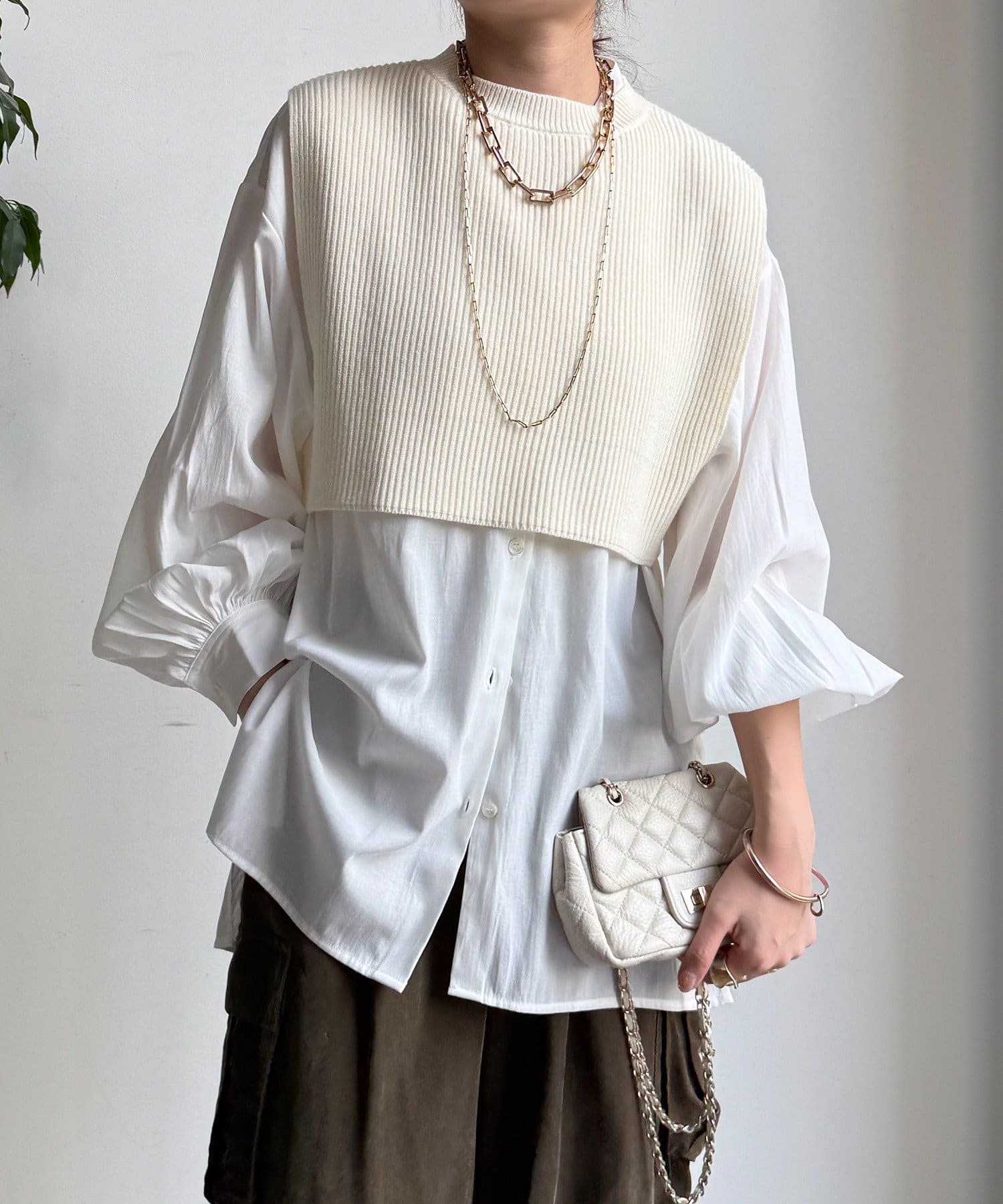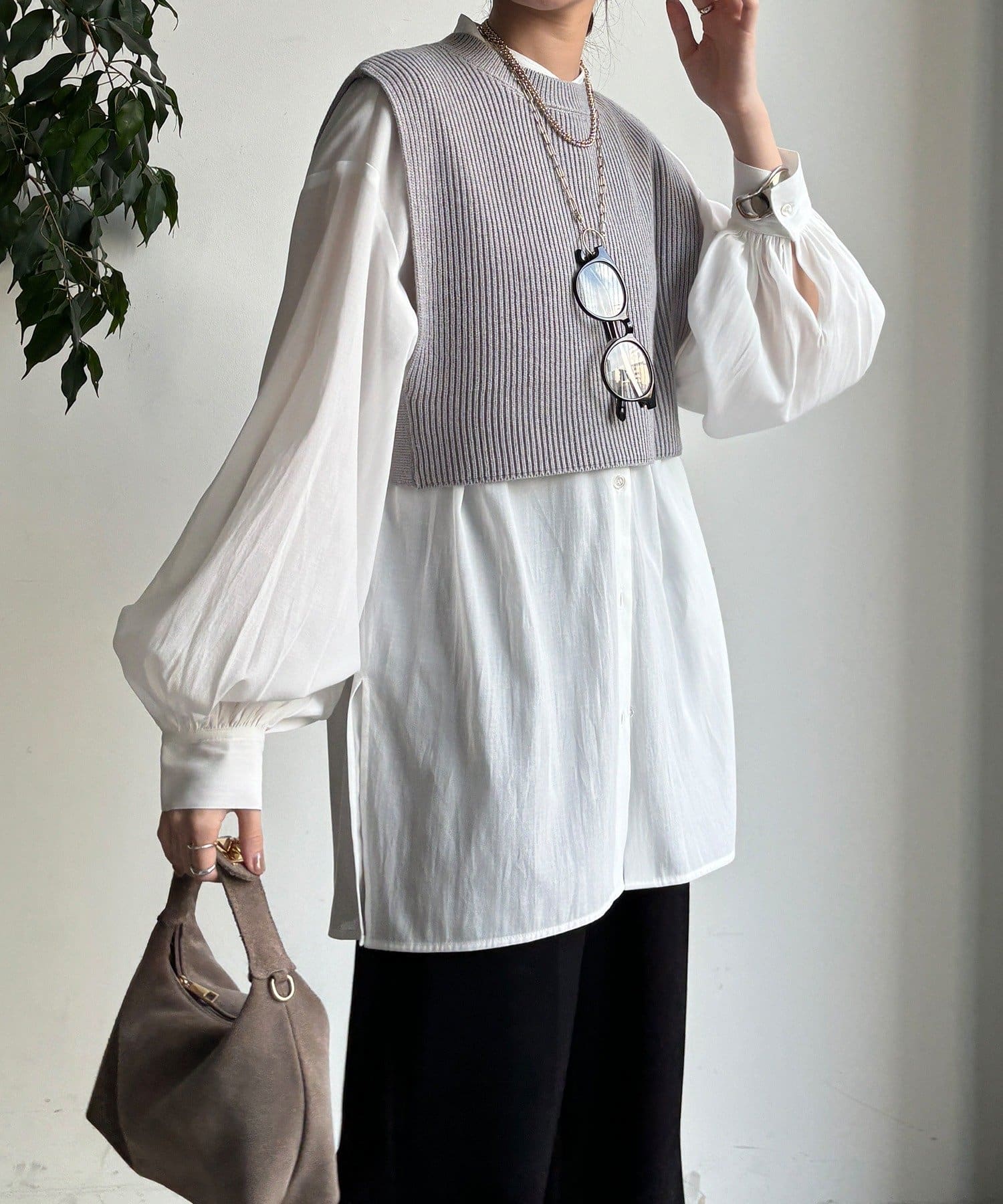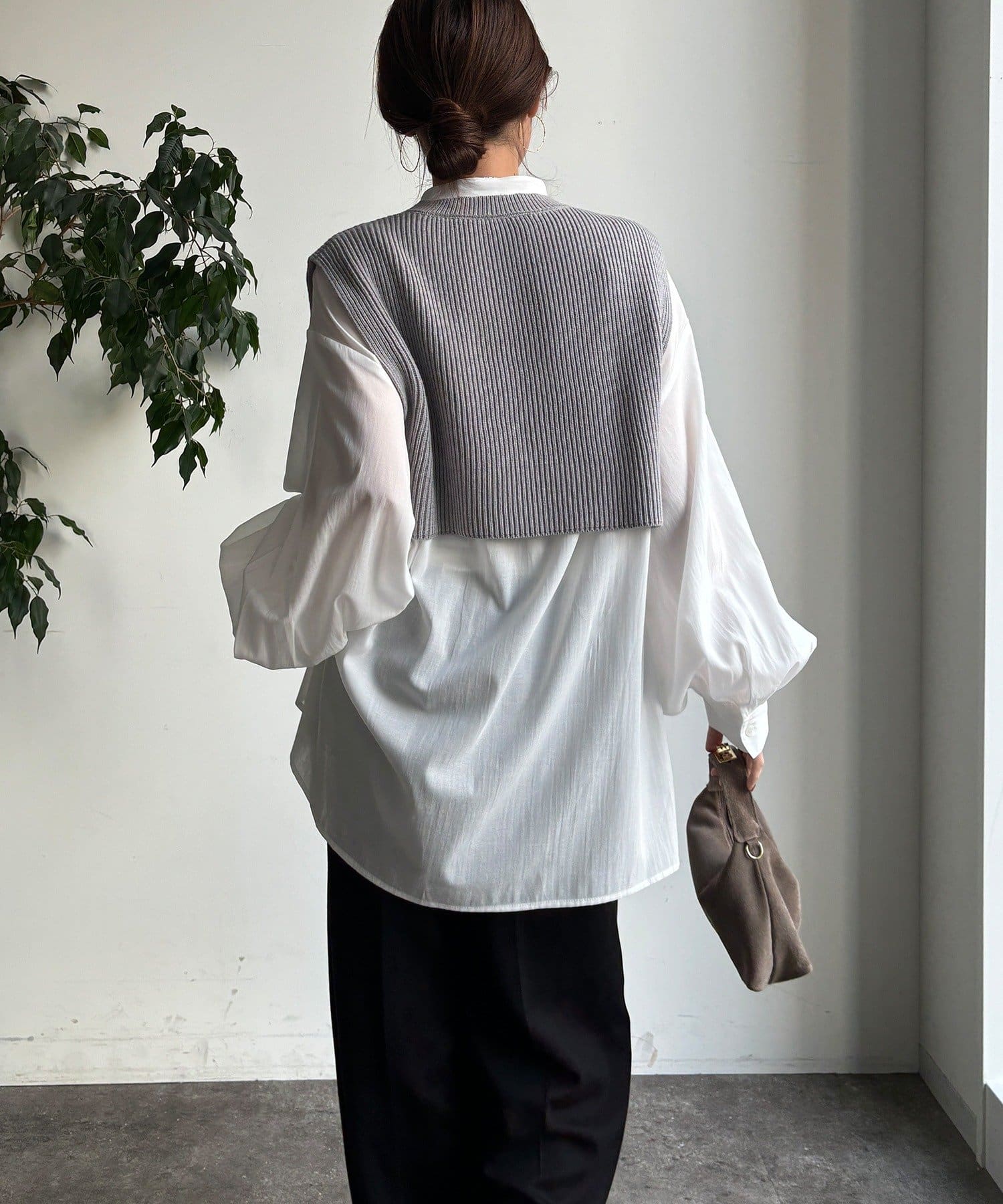 シャツの袖のボリューム感と程よい長さにニットベストを