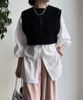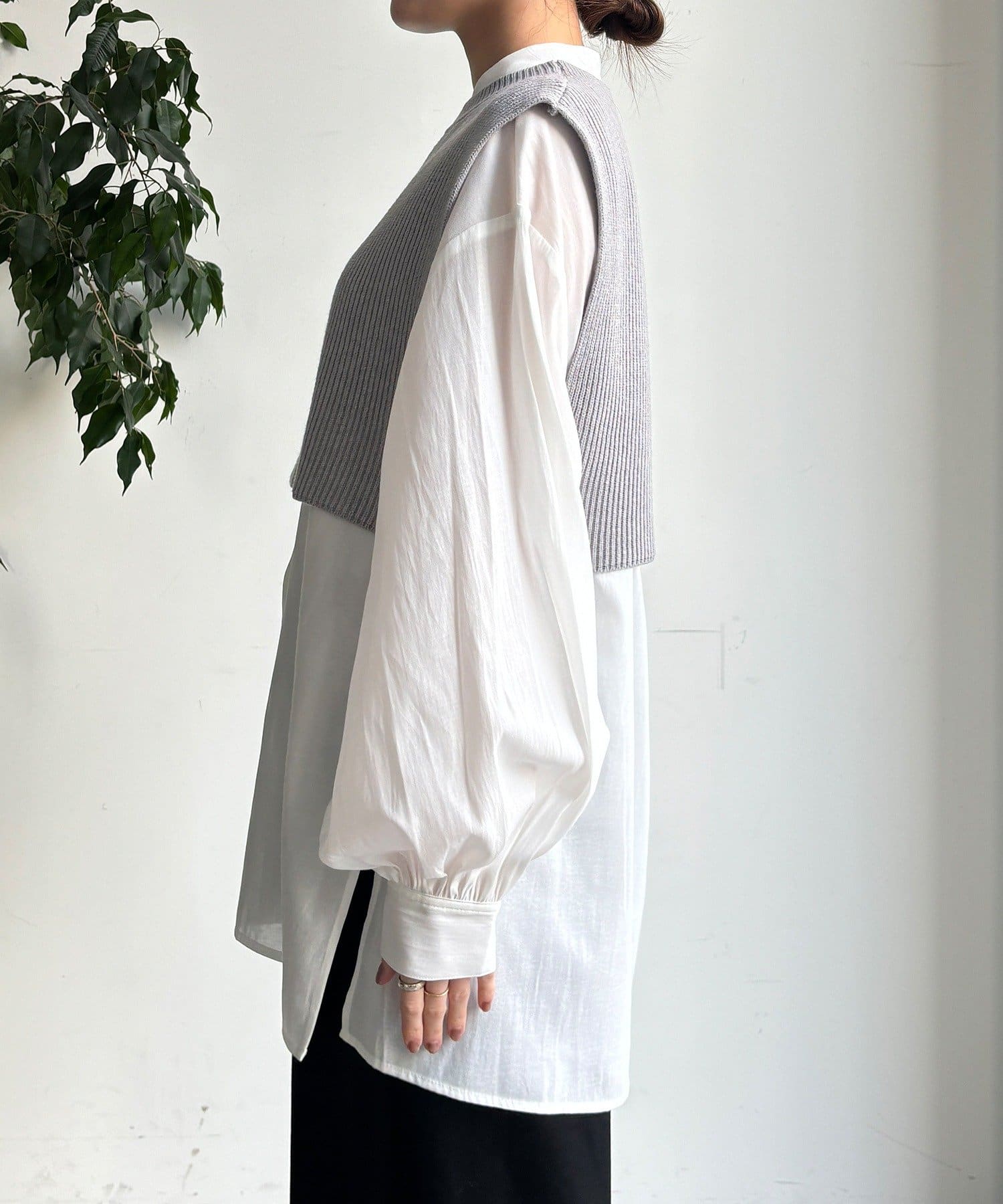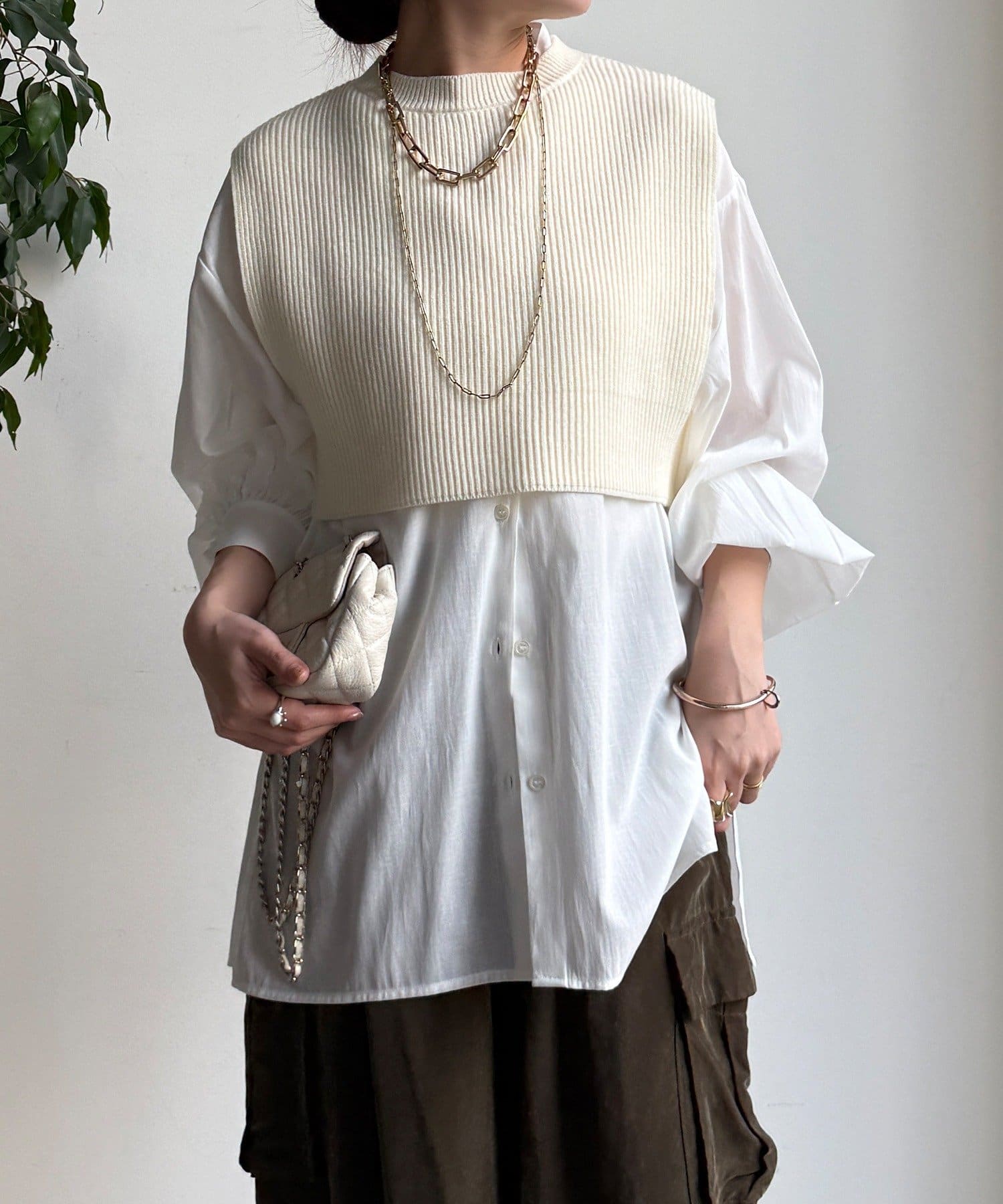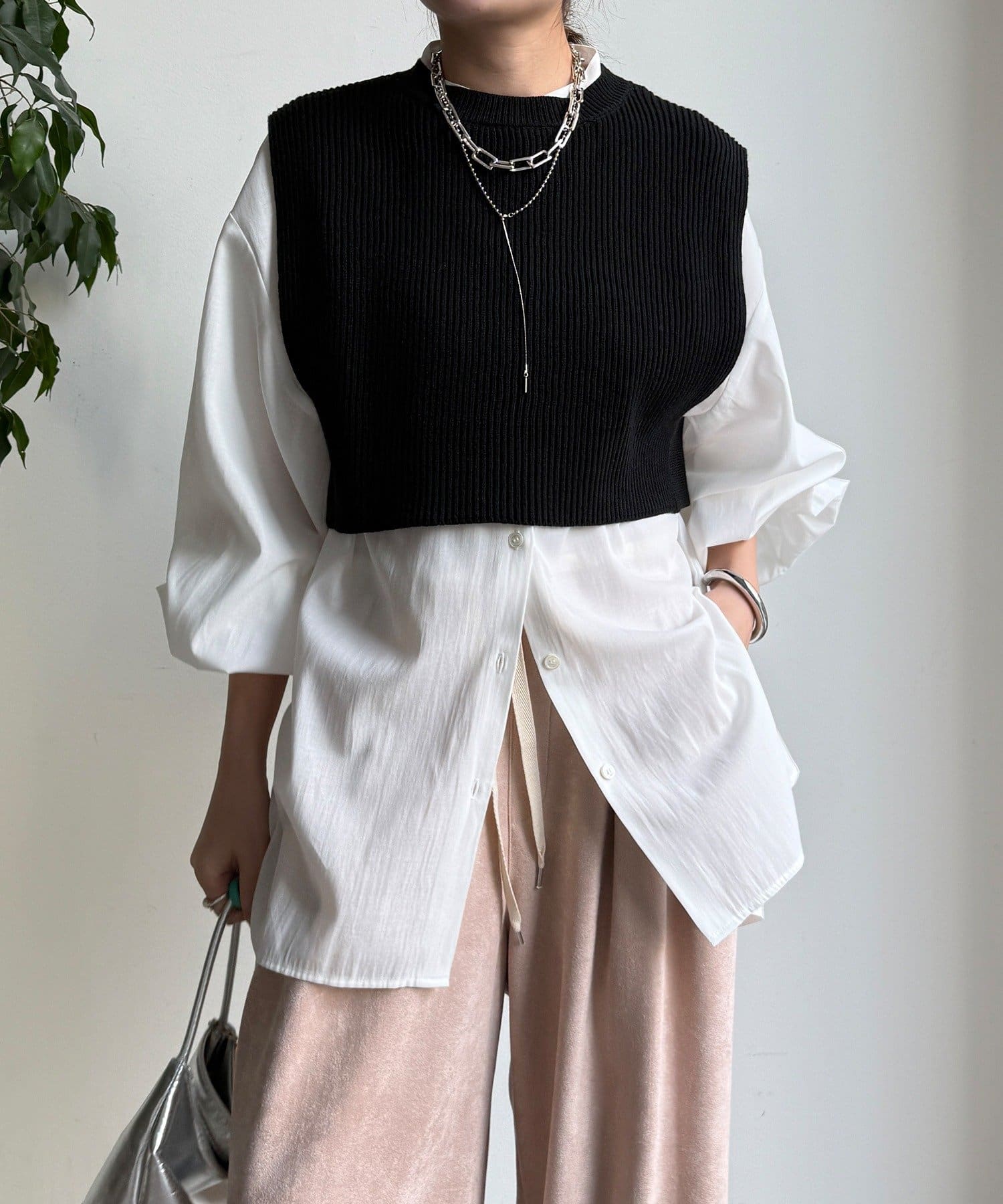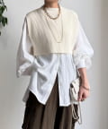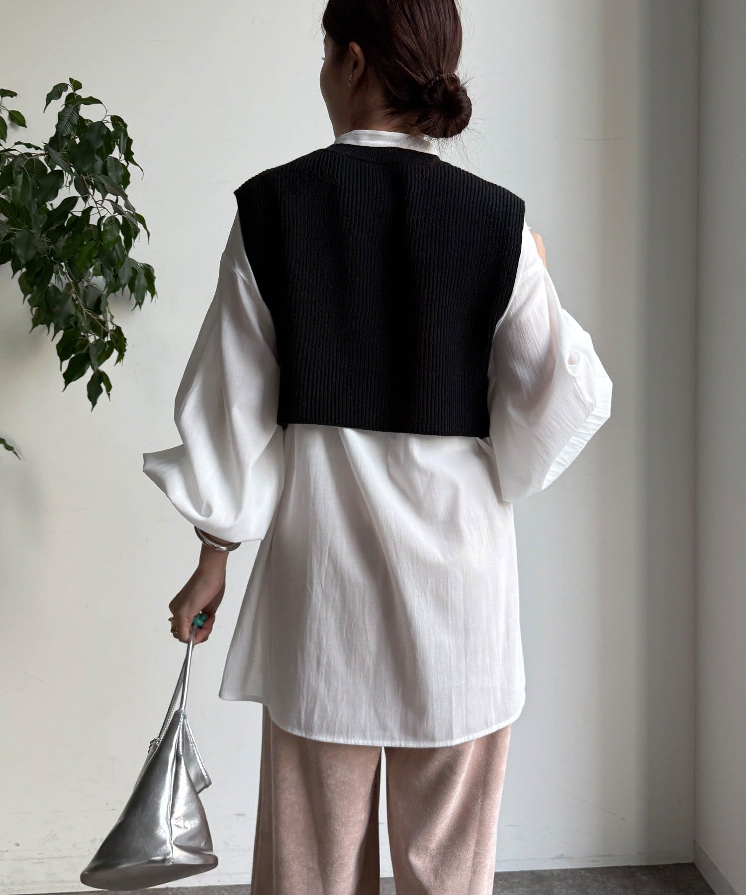 シャツの袖のボリューム感と程よい長さにニットベストを