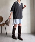 深めのVネックがつくる、抜け感のある大人カジュアルな雰囲気。