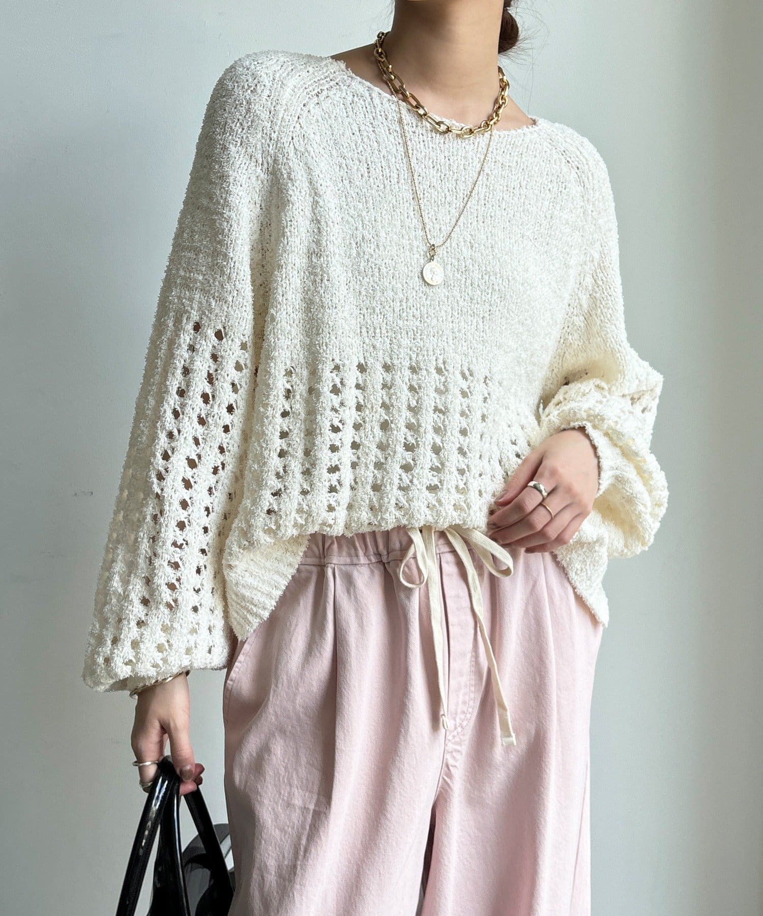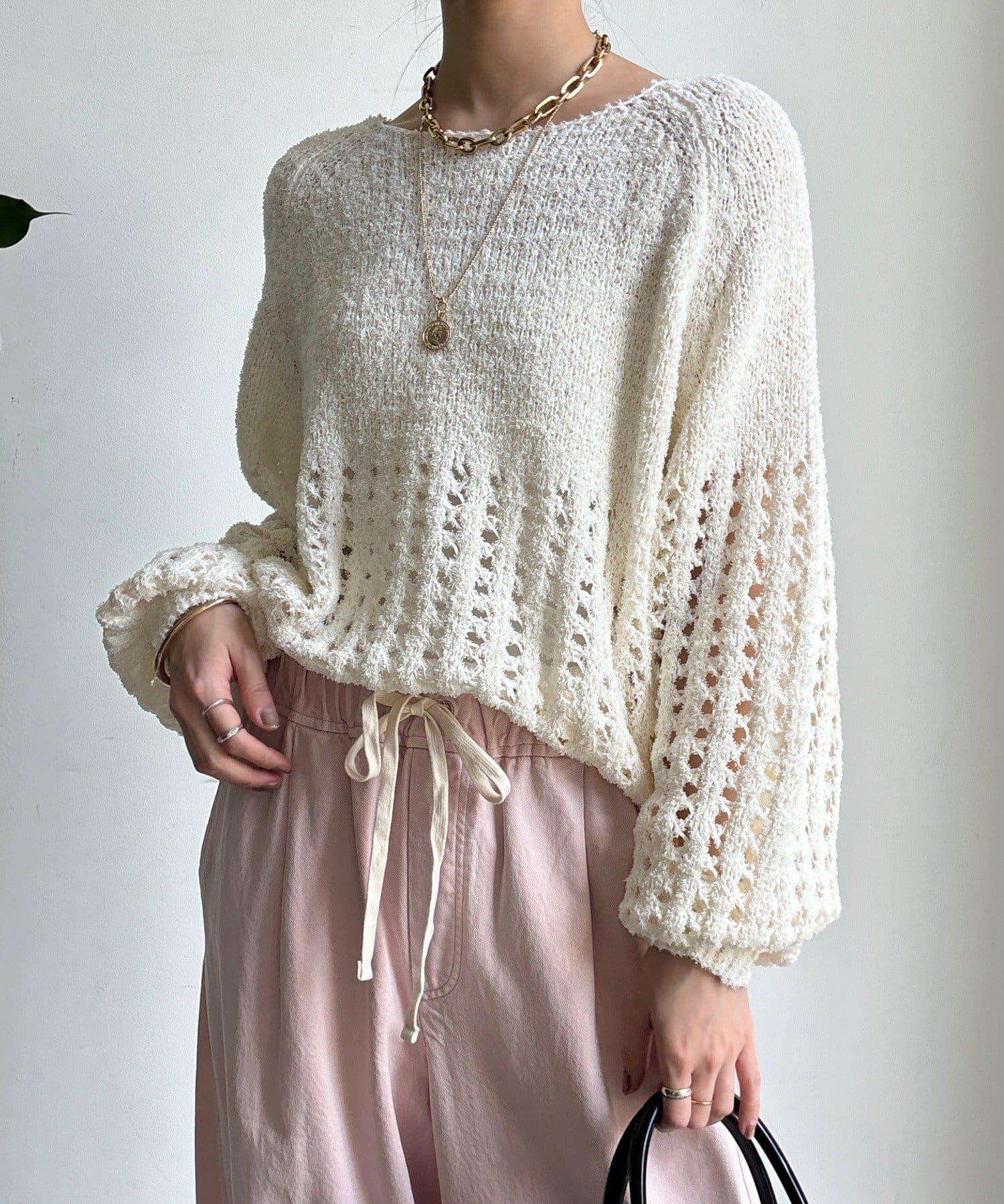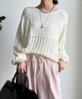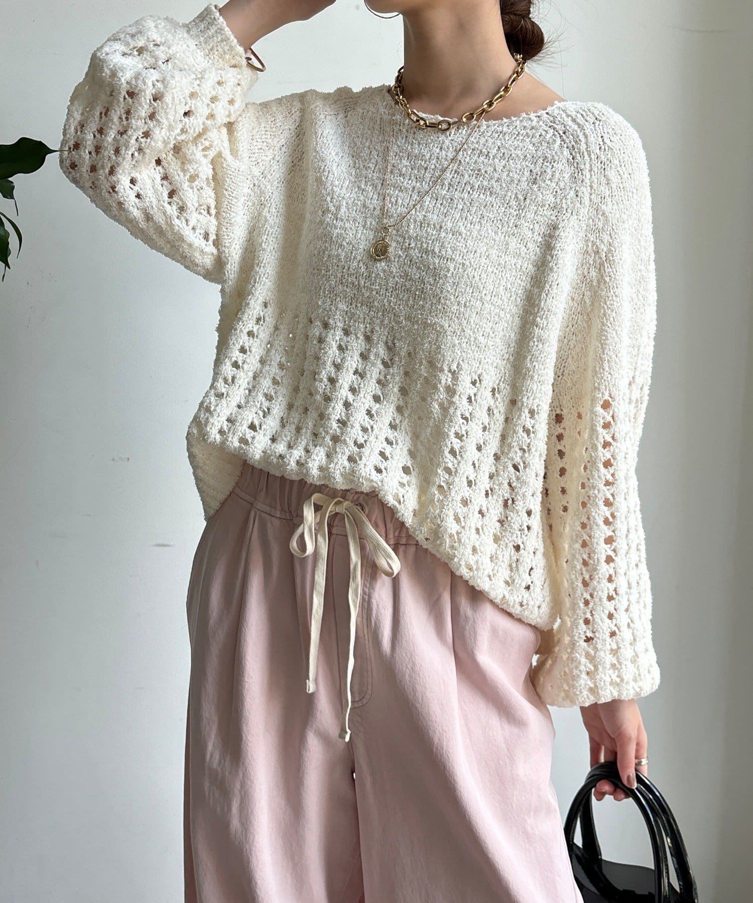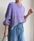 ゆったりしたシルエットとざっくりした甘編みがかわいいメッシュニットプルオーバー。