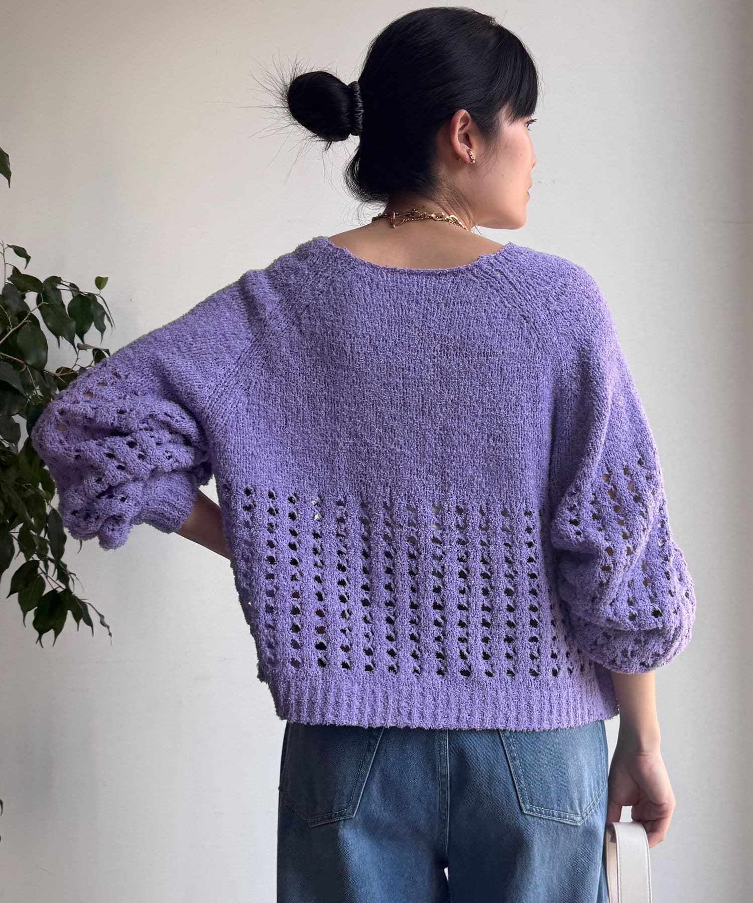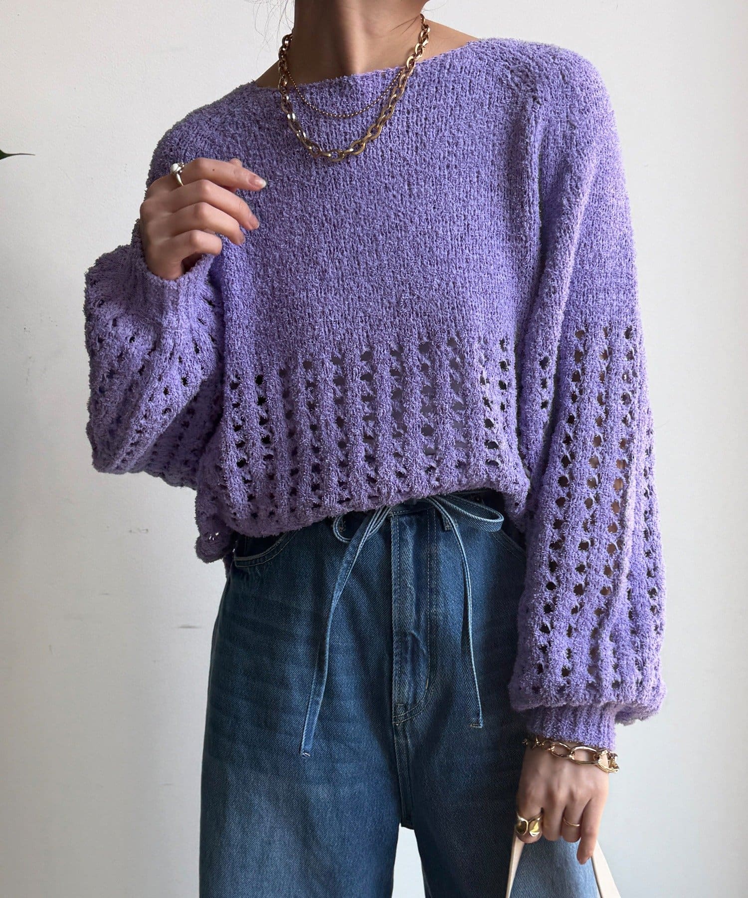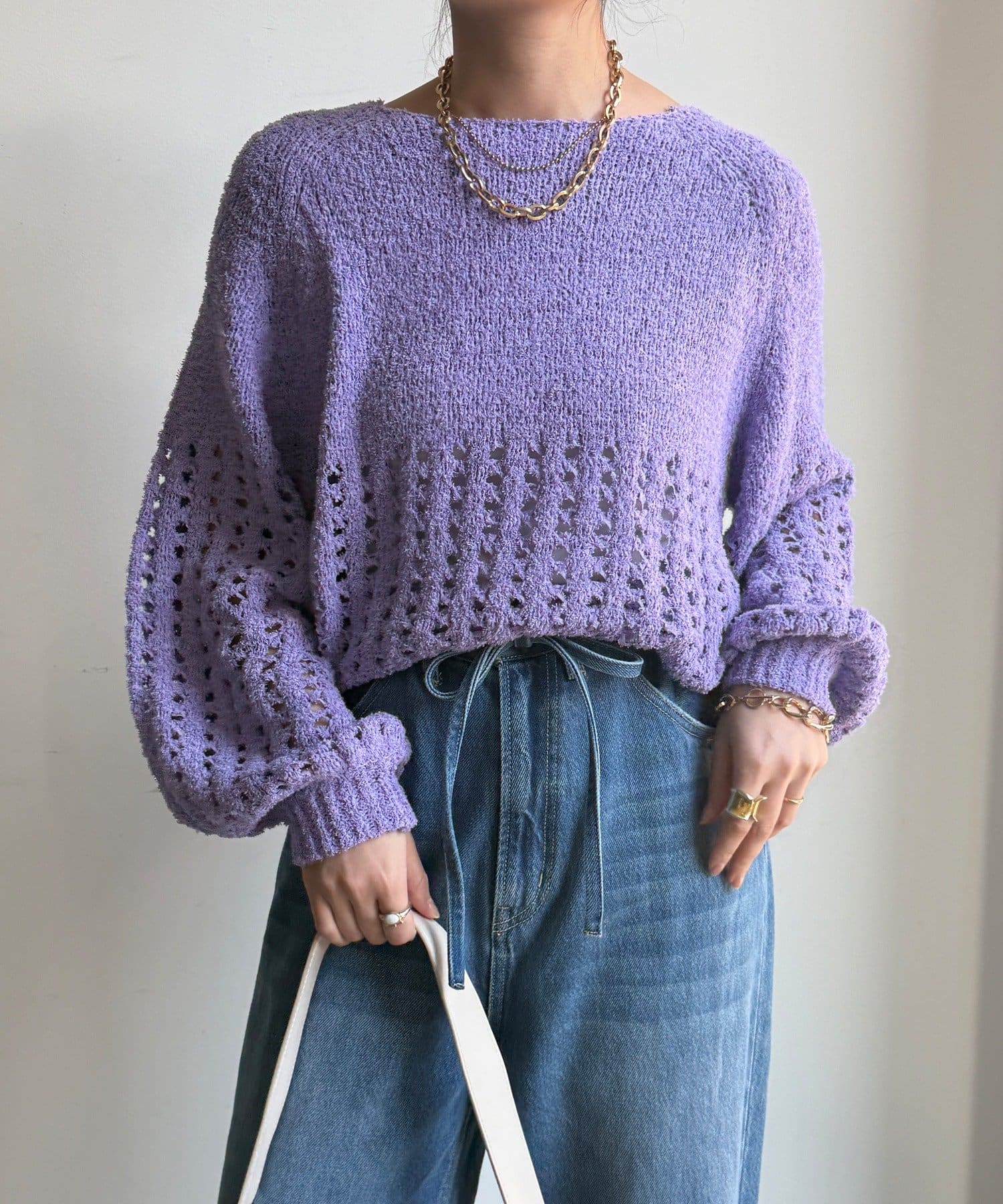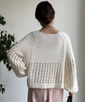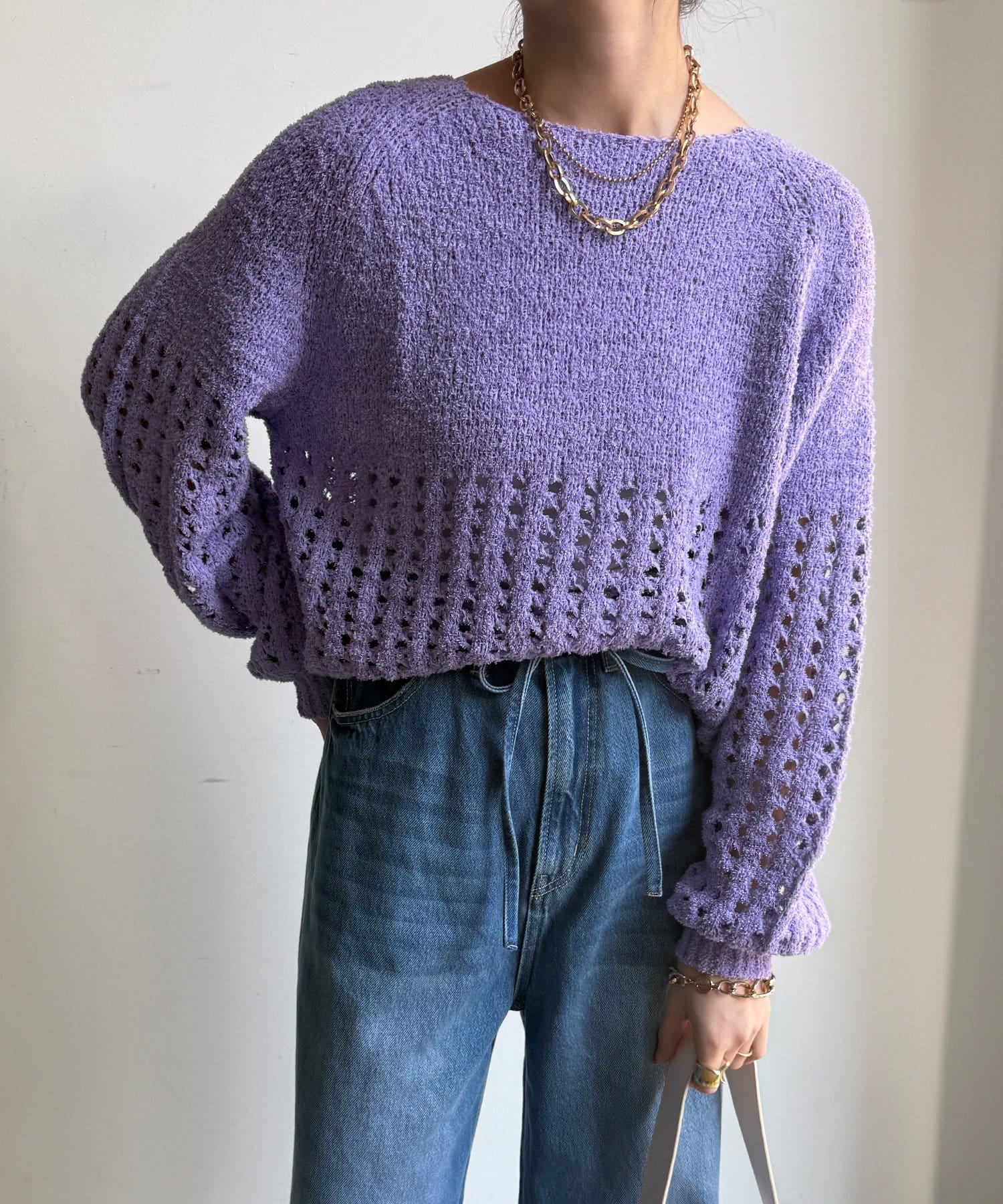 ゆったりしたシルエットとざっくりした甘編みがかわいいメッシュニットプルオーバー。
