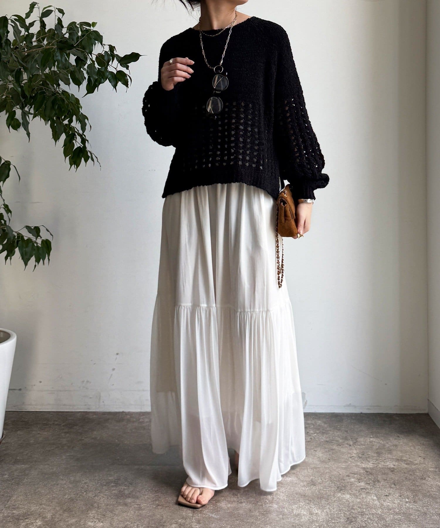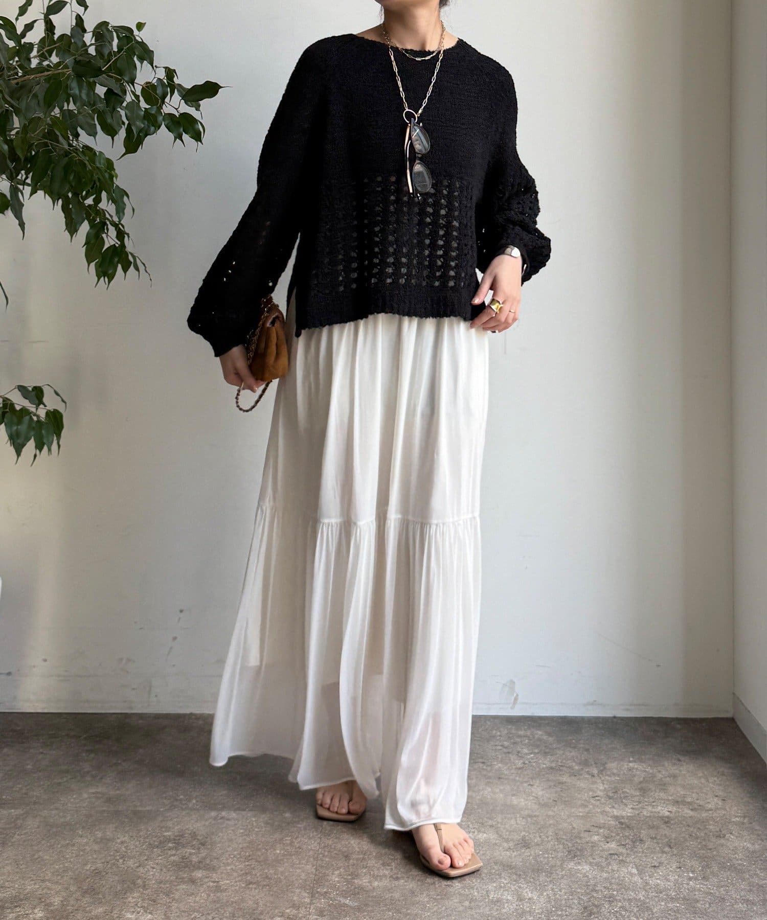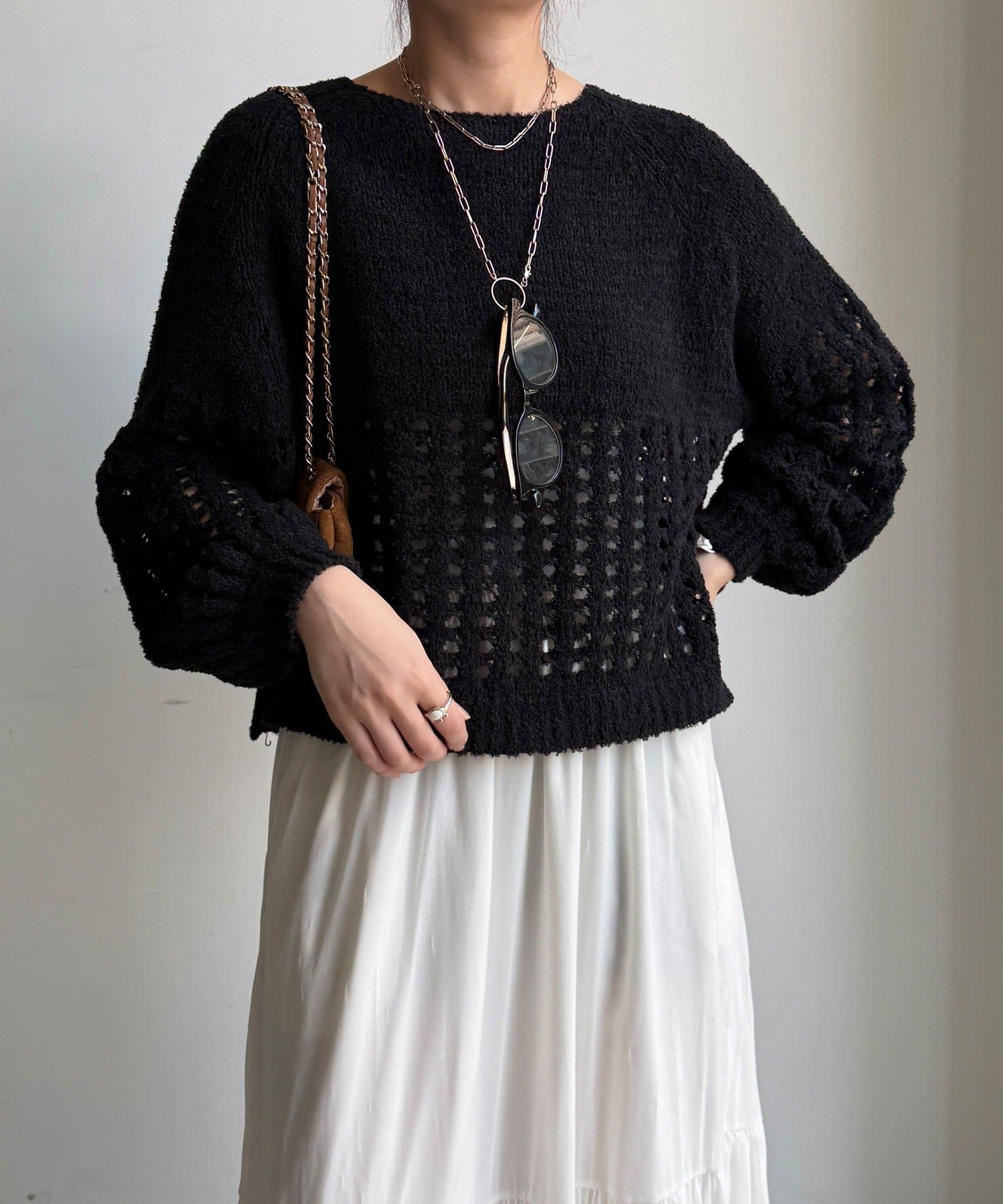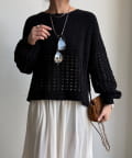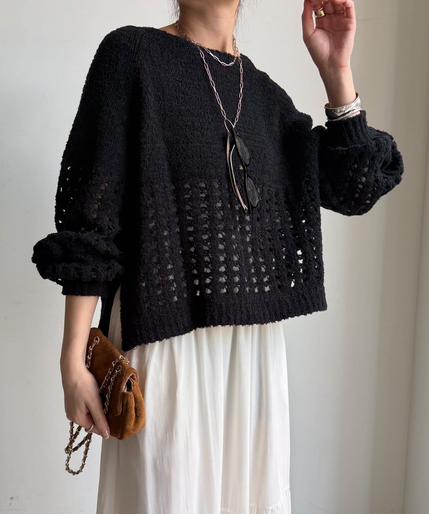 程よい透け感が大人の余裕を感じさせる、軽やかな雰囲気のニットです。