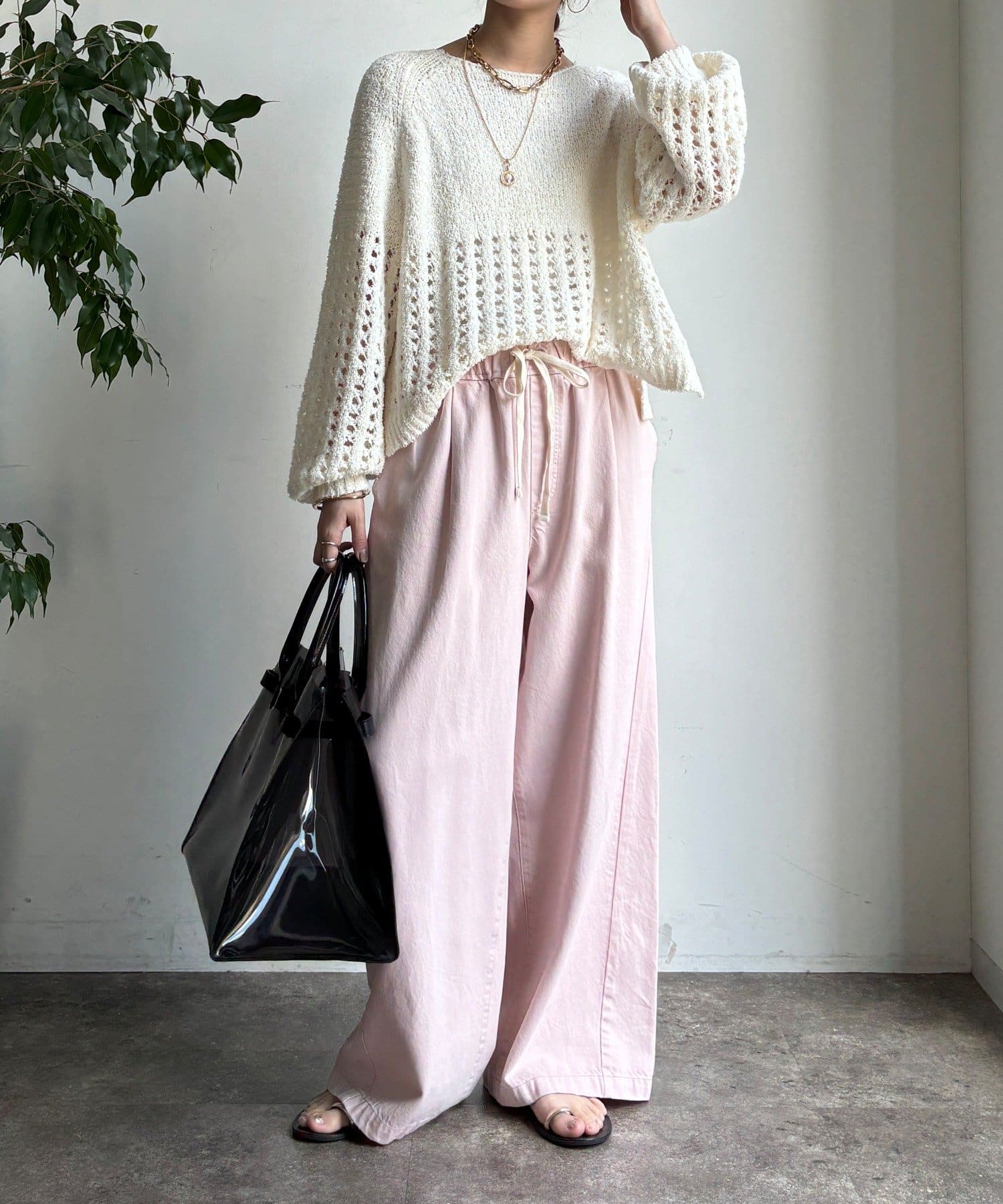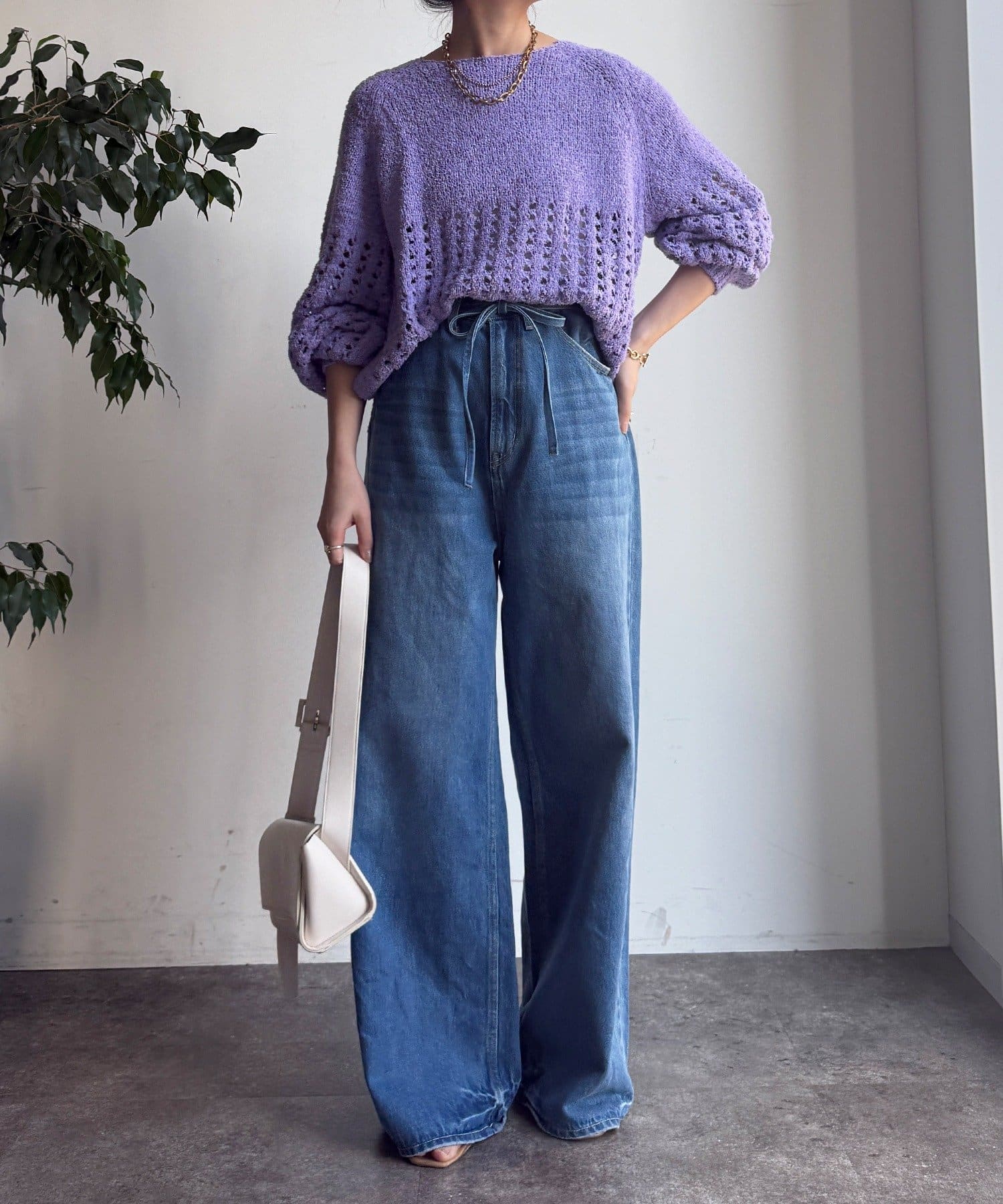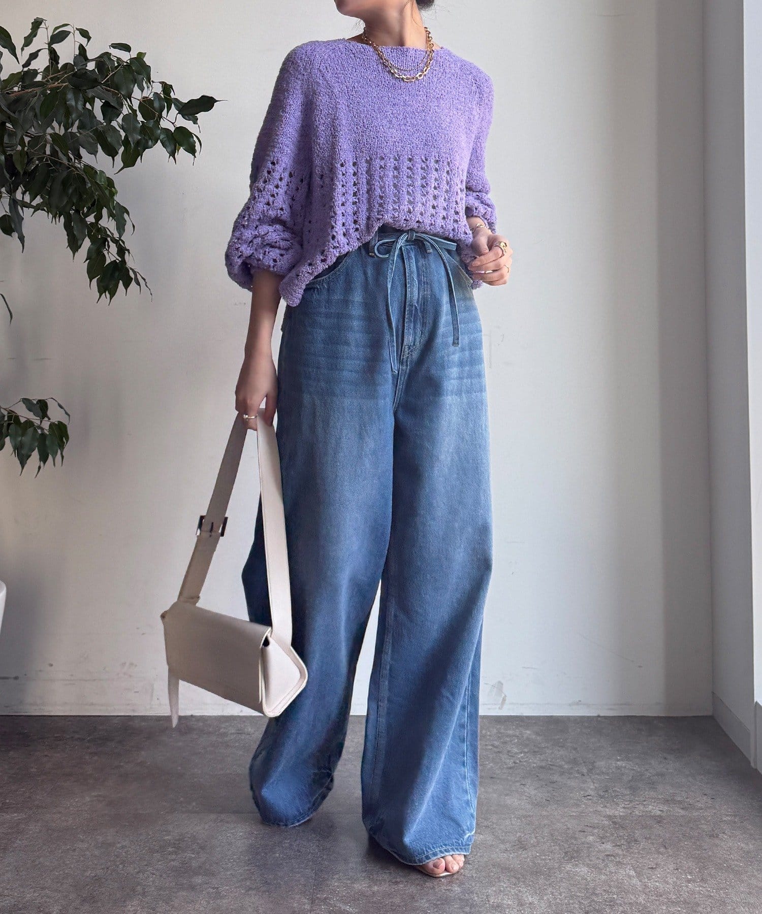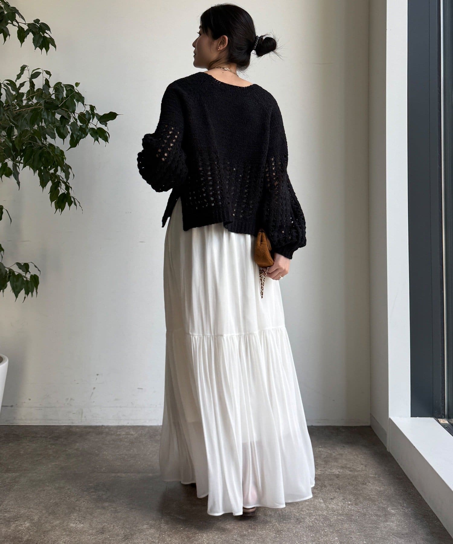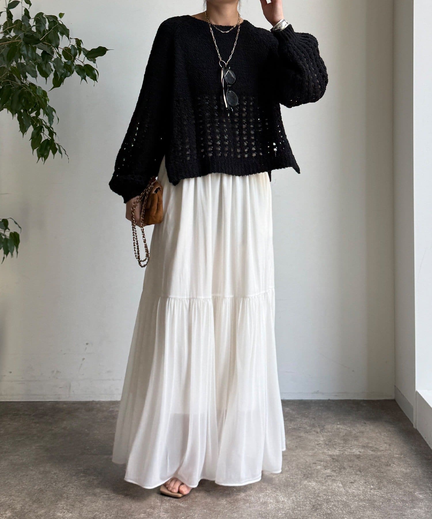 程よい透け感が大人の余裕を感じさせる、軽やかな雰囲気のニットです。