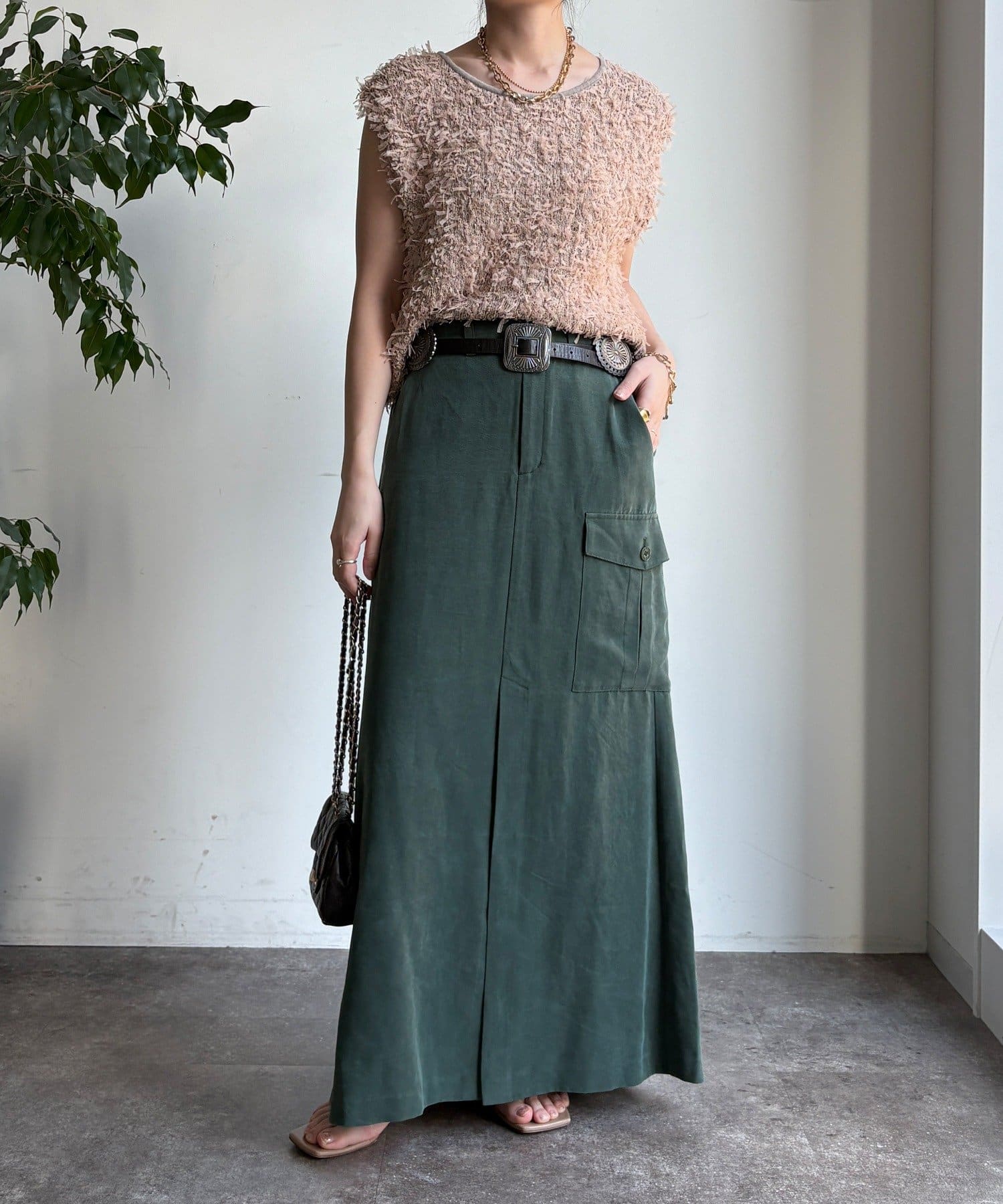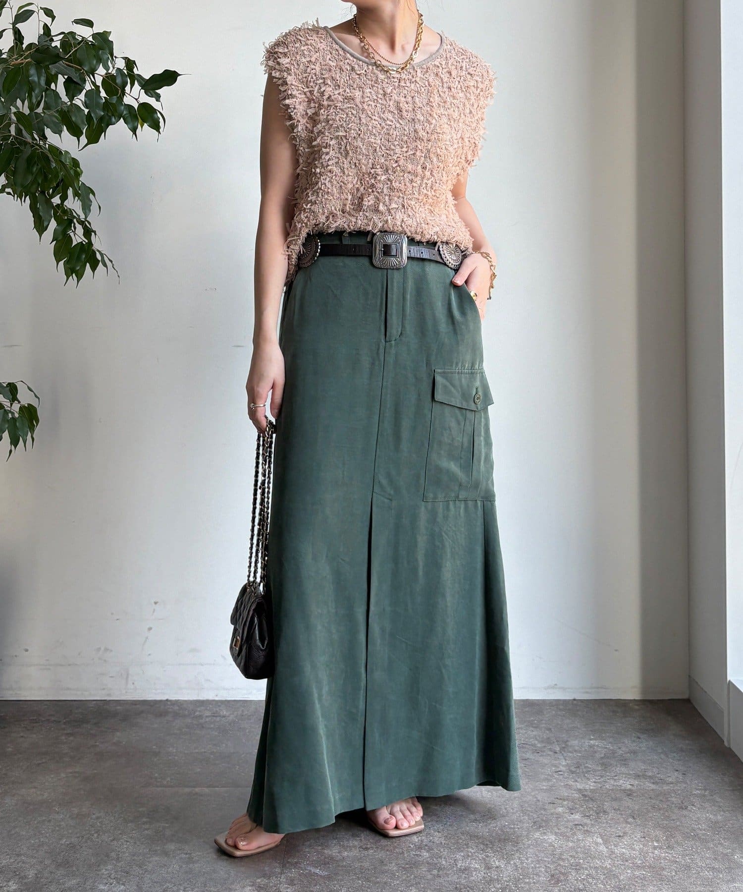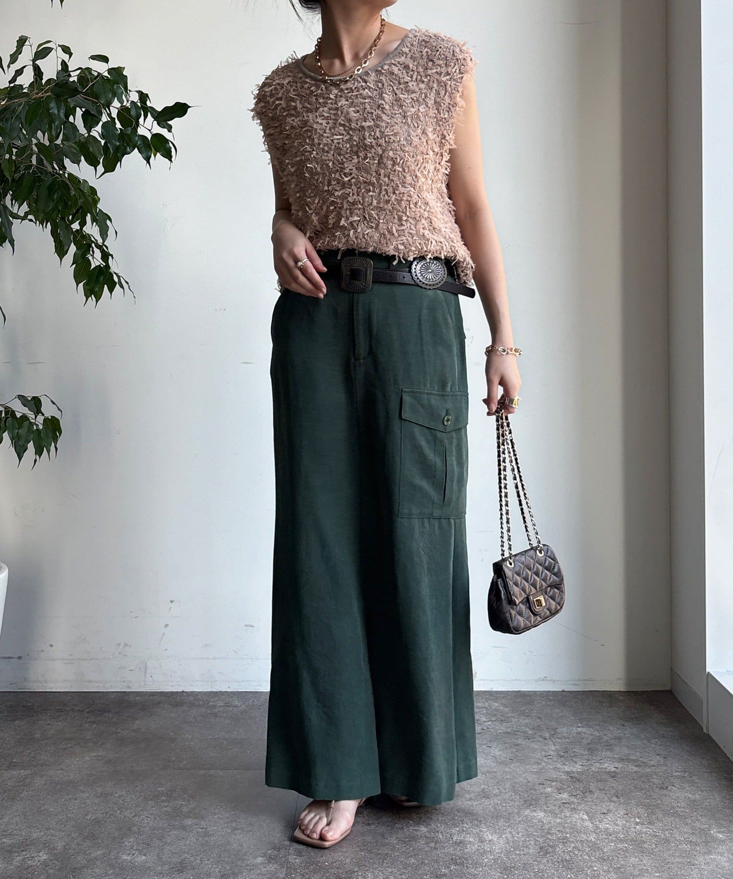 シンプルなトップスに重ねるだけで、旬なバランスが完成しますよ。