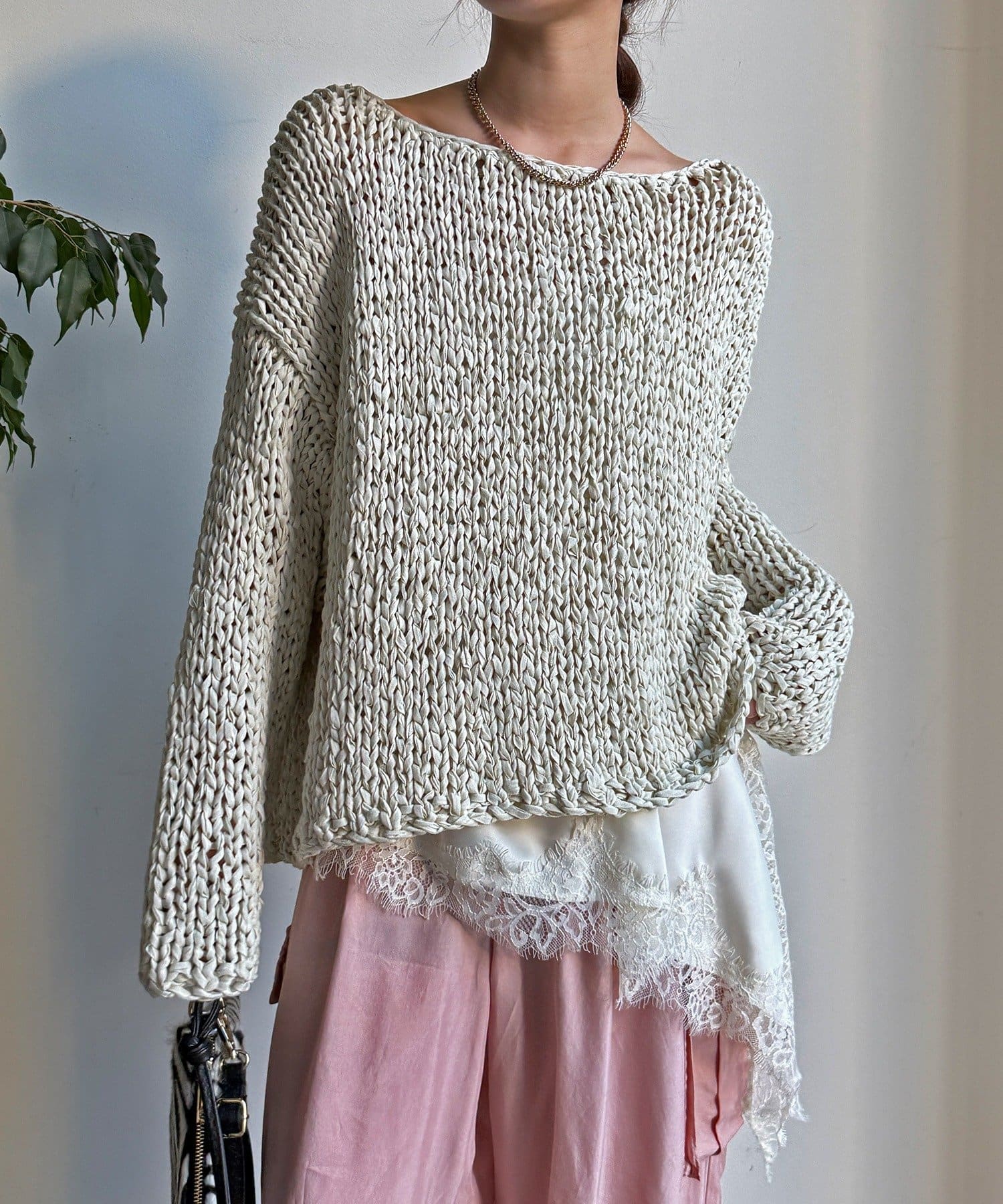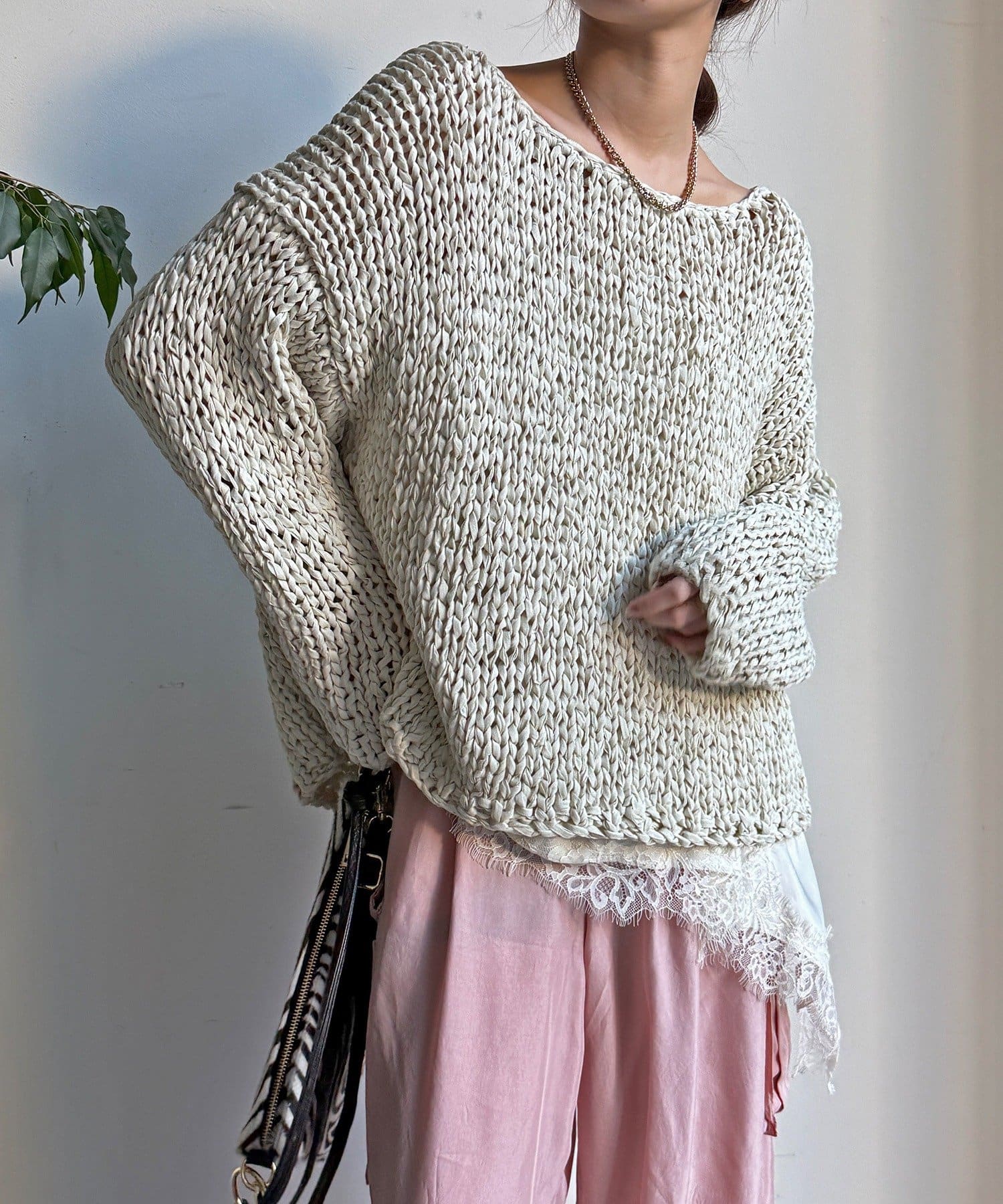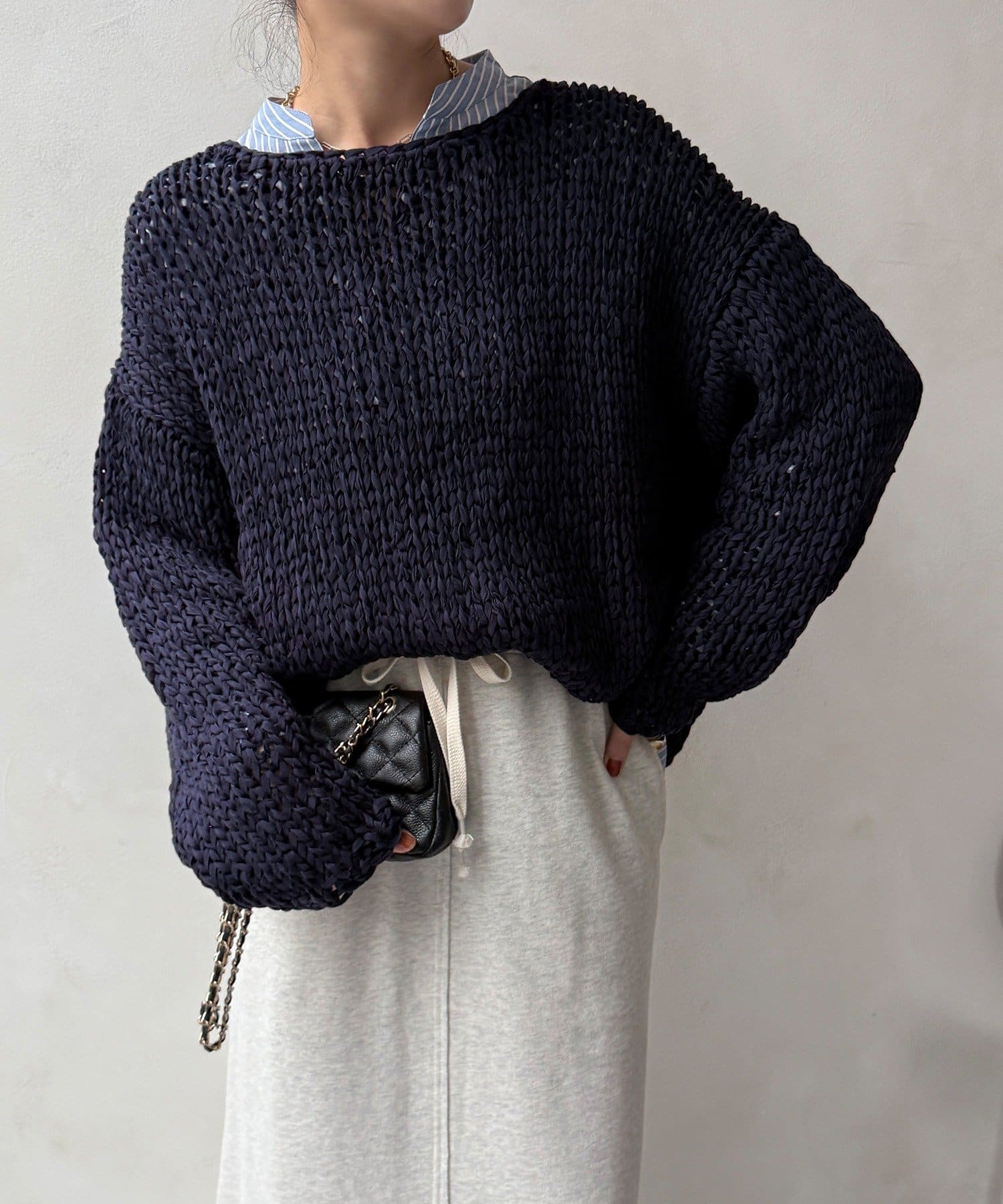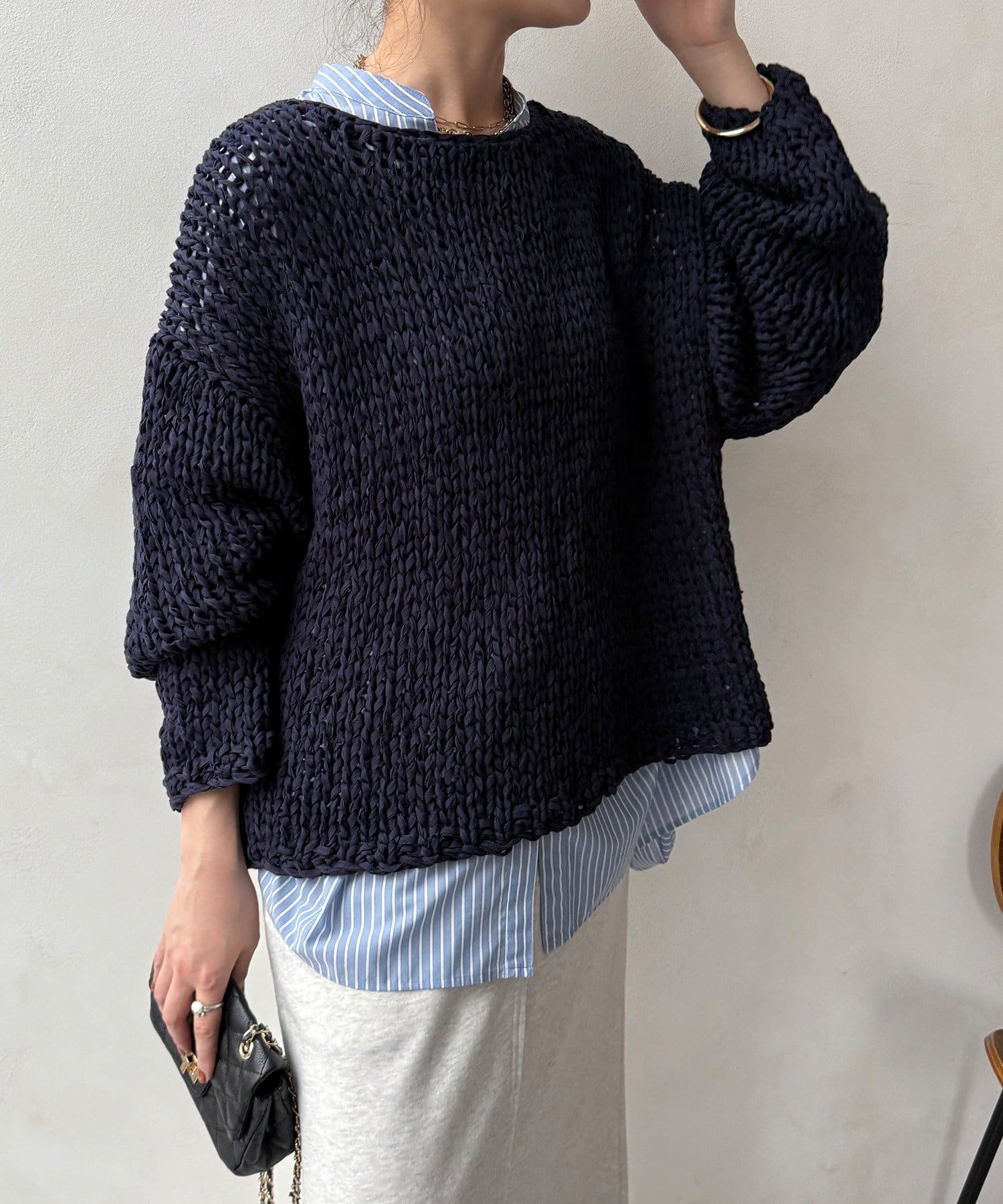 機械編みでは出せないざっくりとした編み地と立体感が魅力のハンドメイドニット。