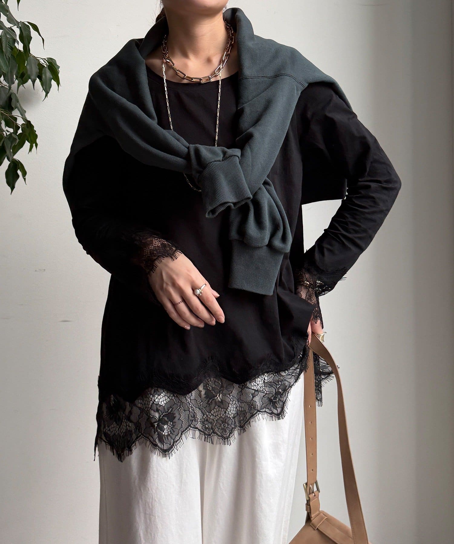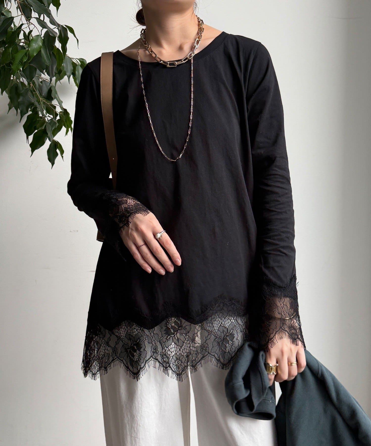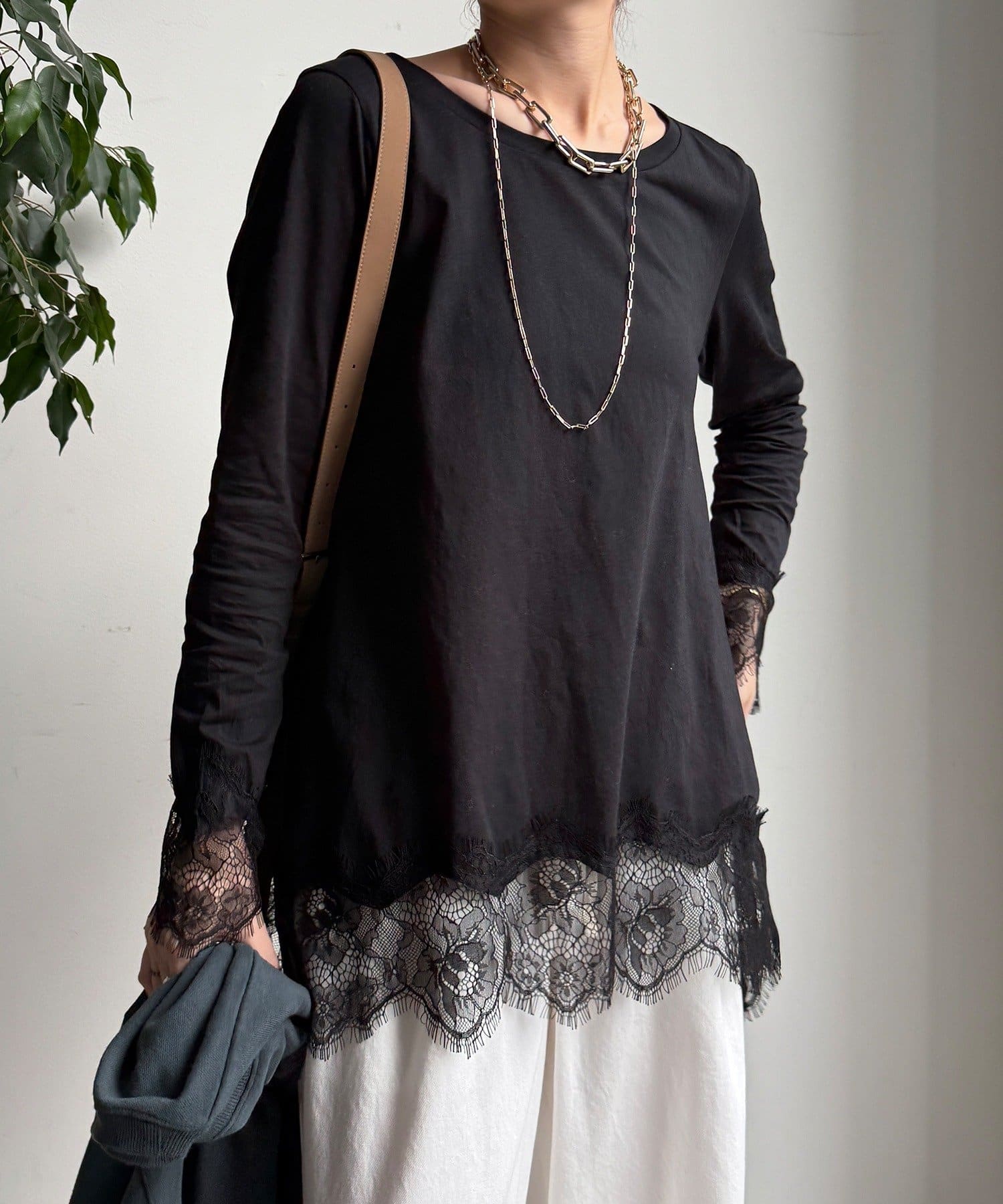 カジュアル見えするシカットソーにレースの上品さをミックスした大人の贅沢ロンT。