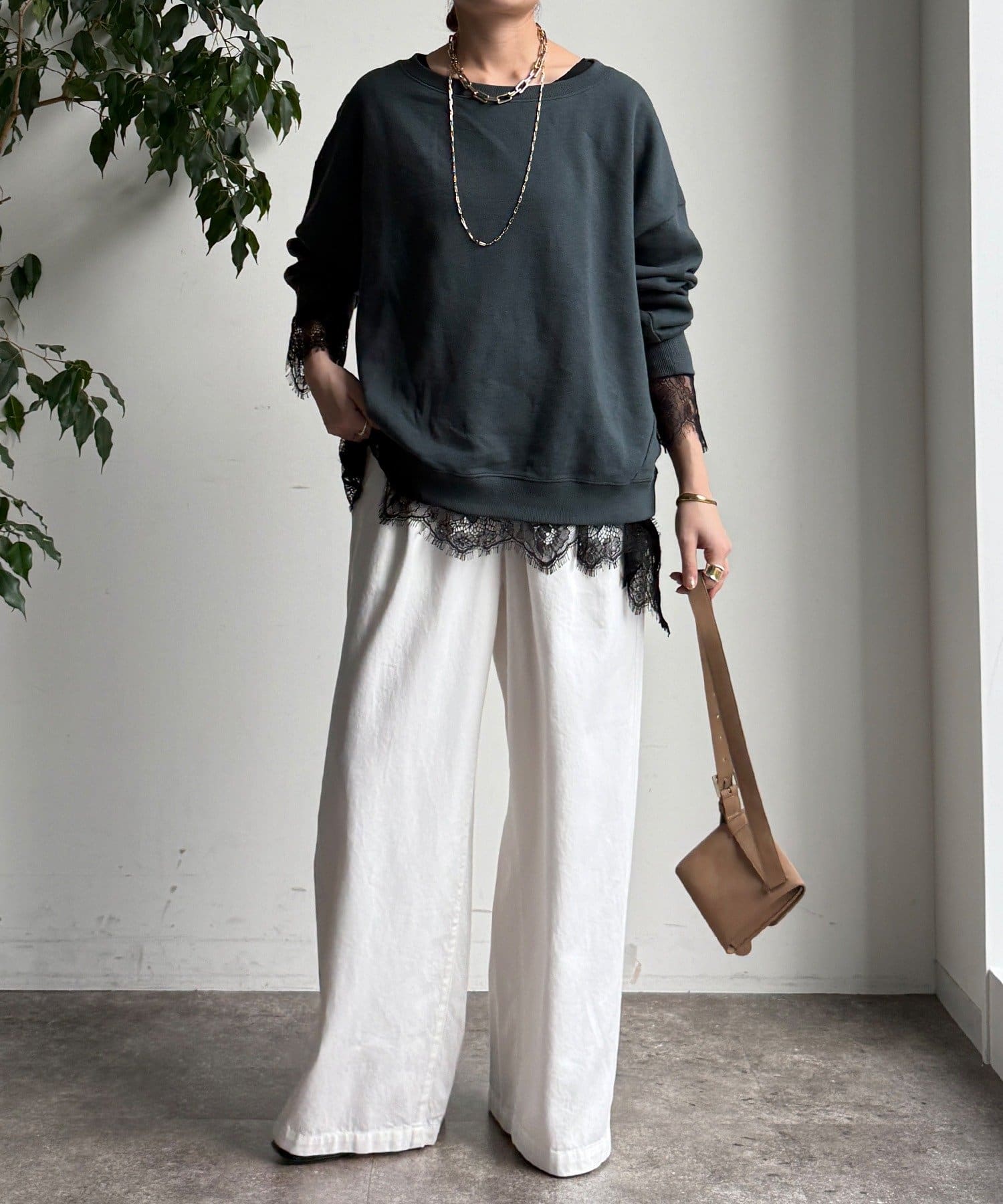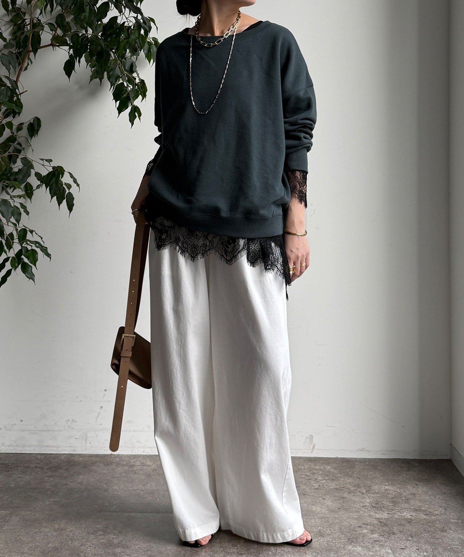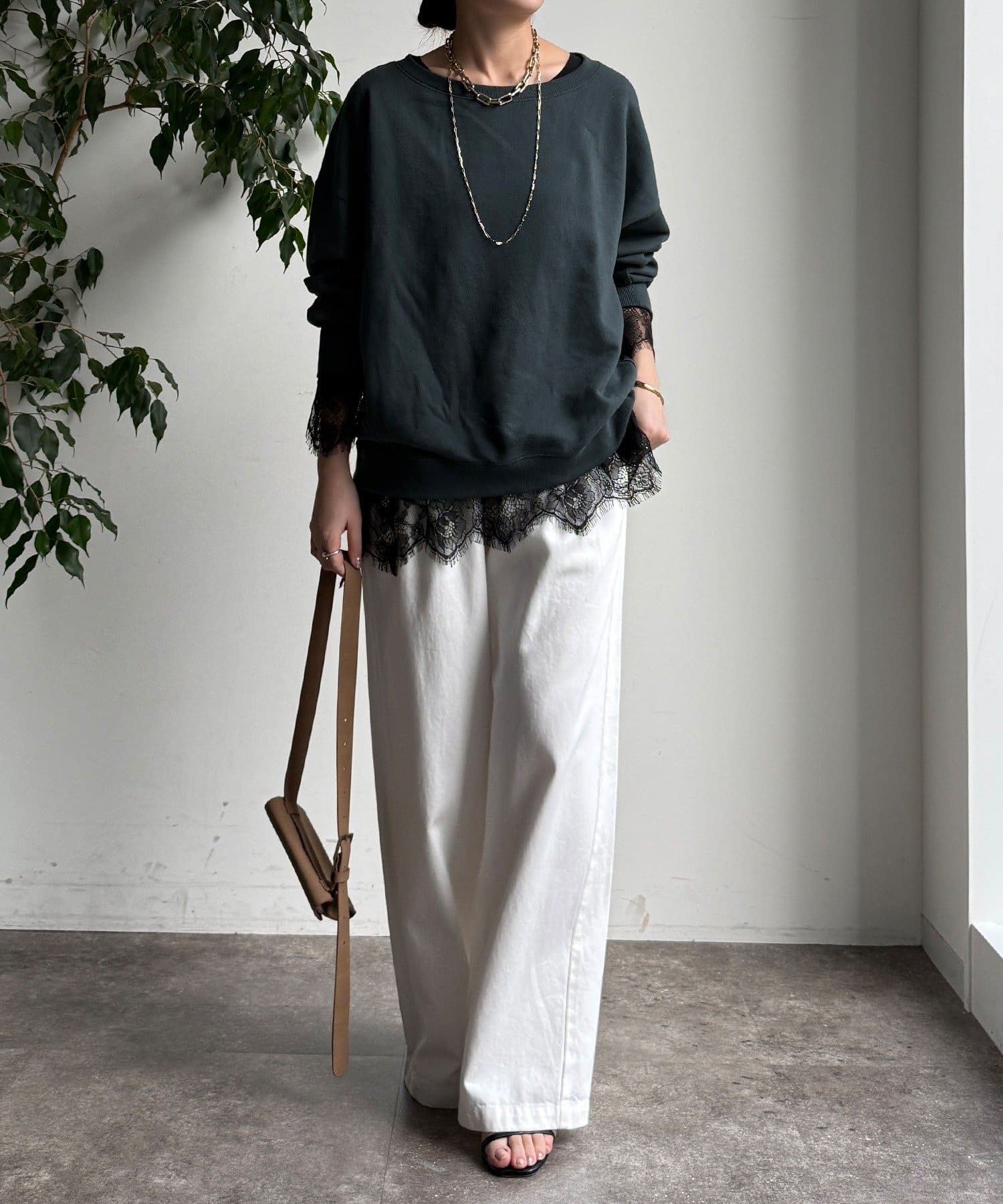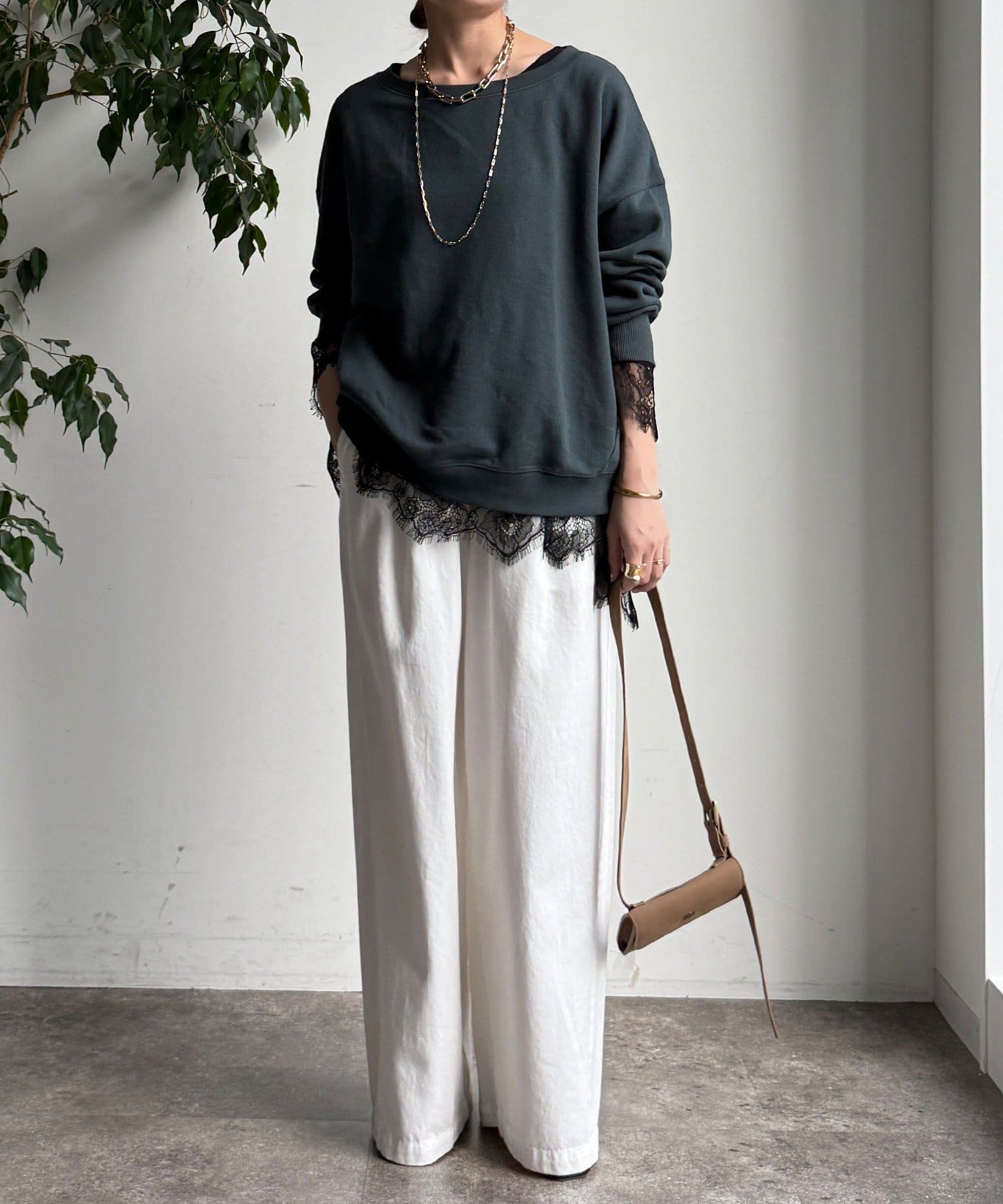 ざっくりとしたニットやシャツ、スウェットなど、お手持ちトップスのインナーに着るだけでレースがチラ見えし、スタイリングを一気に華やかにしてくれます。