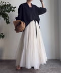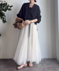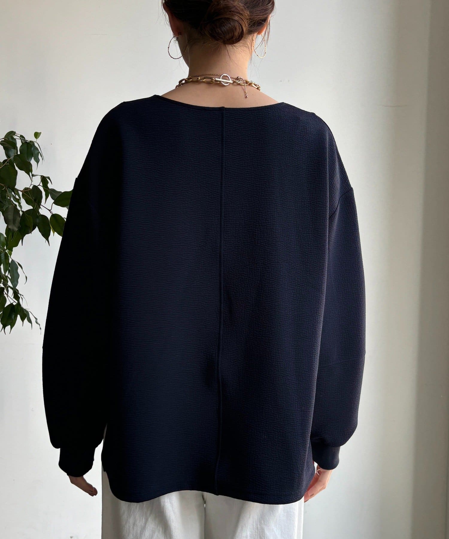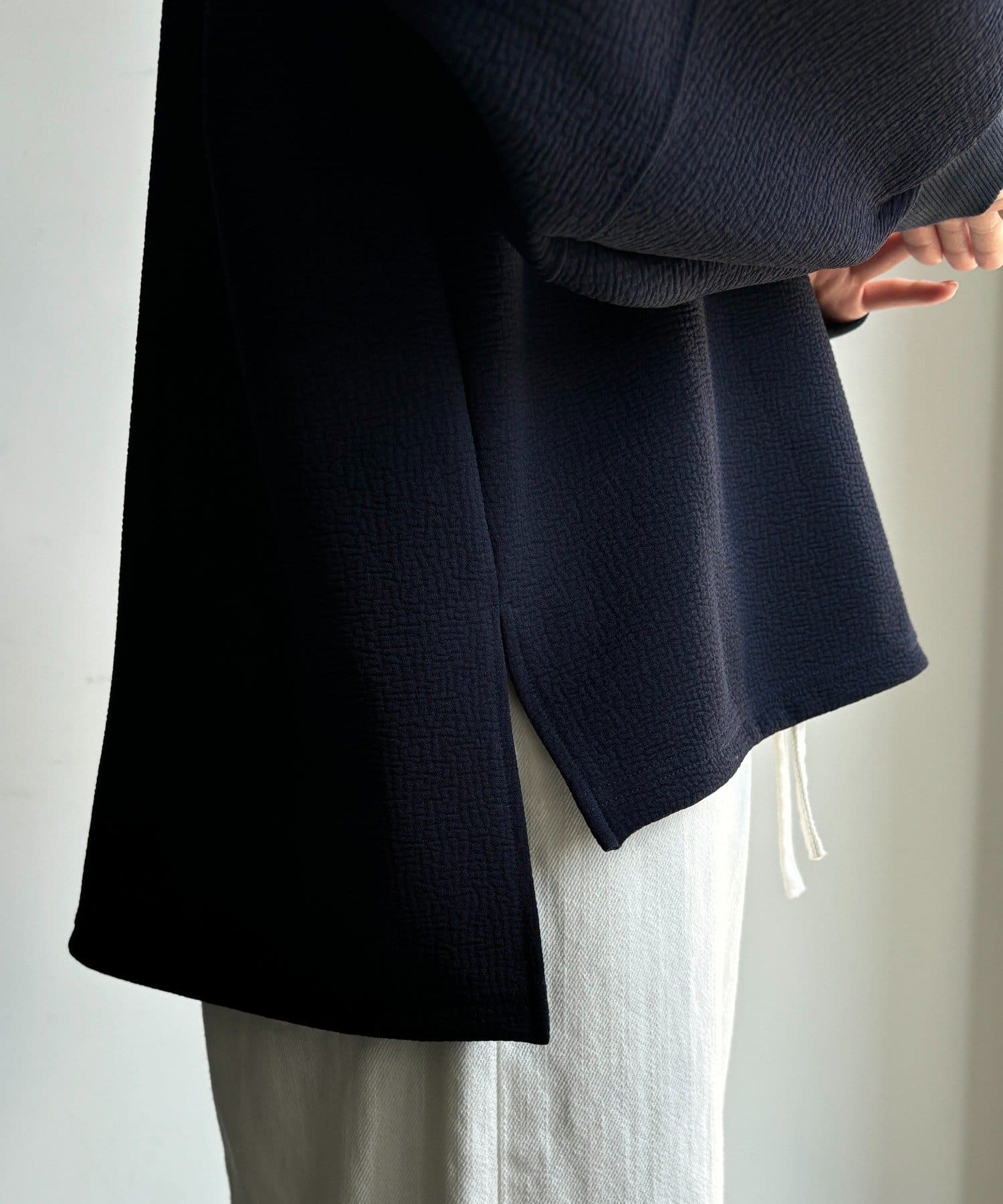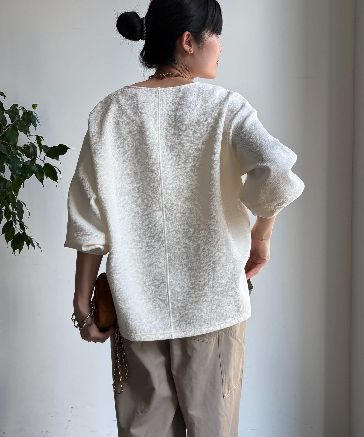 ハリ感があるので、身体のラインを拾いすぎず自然と立体的なシルエットに。