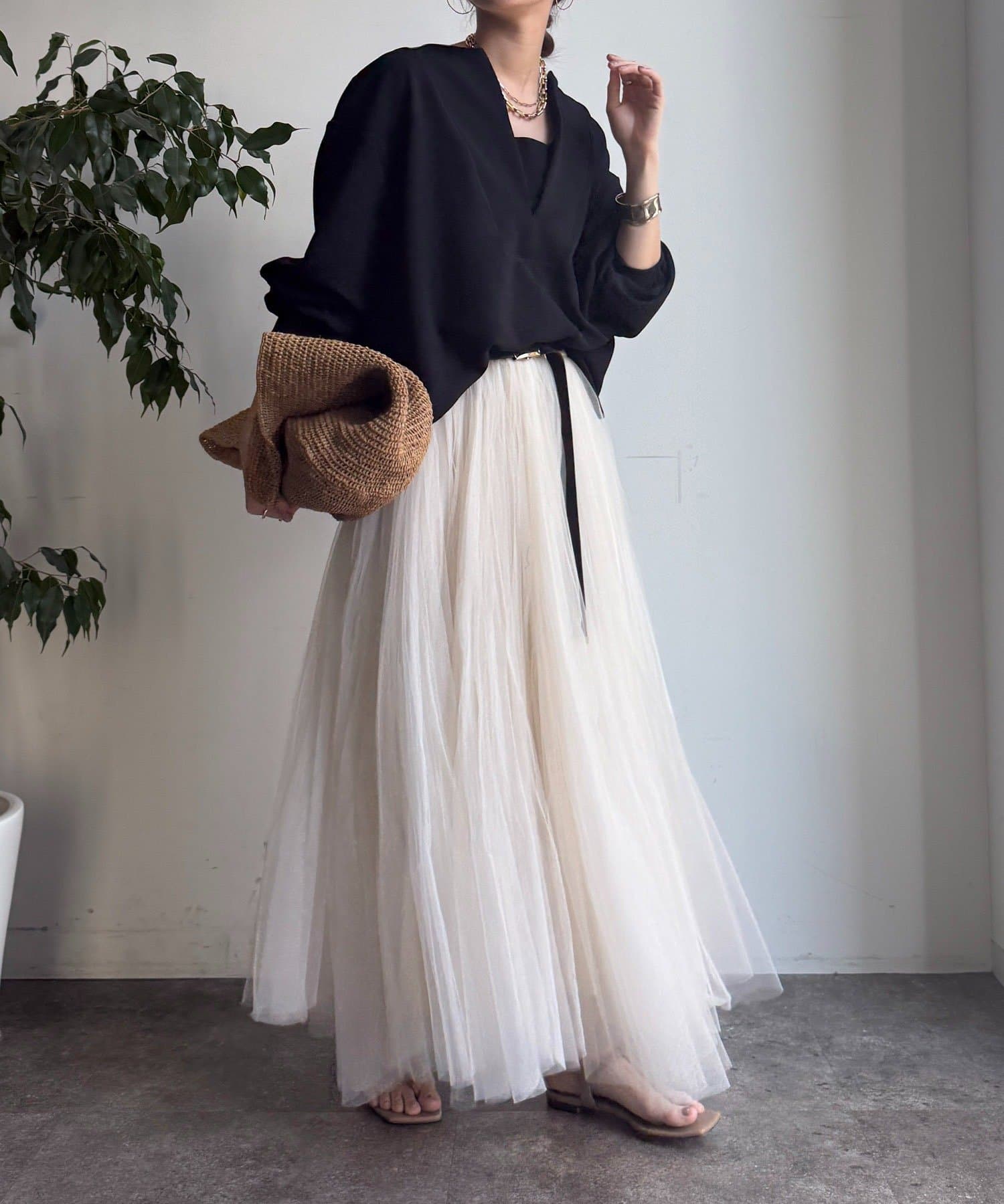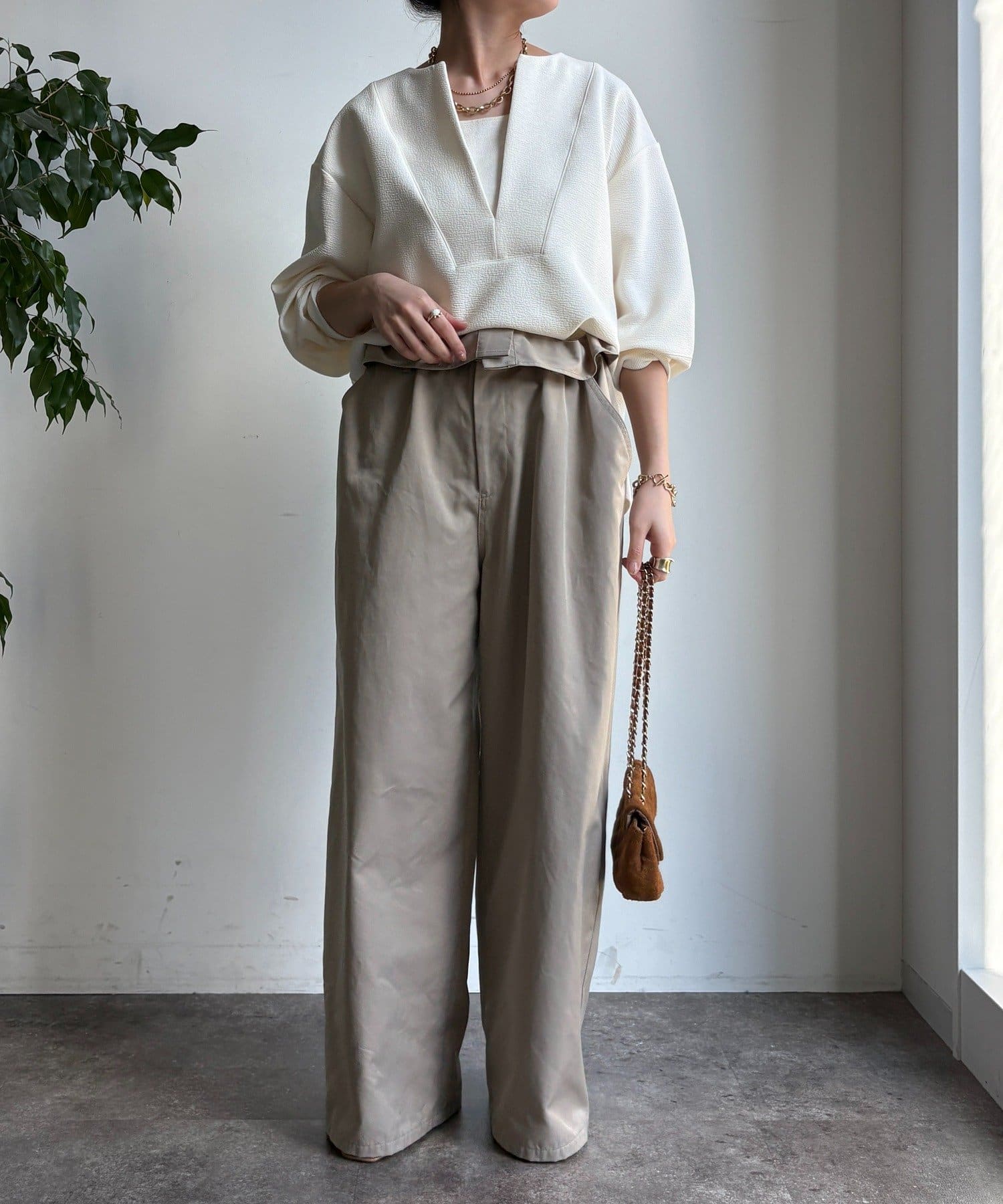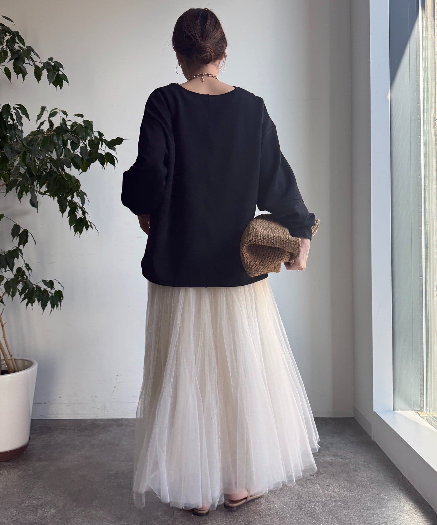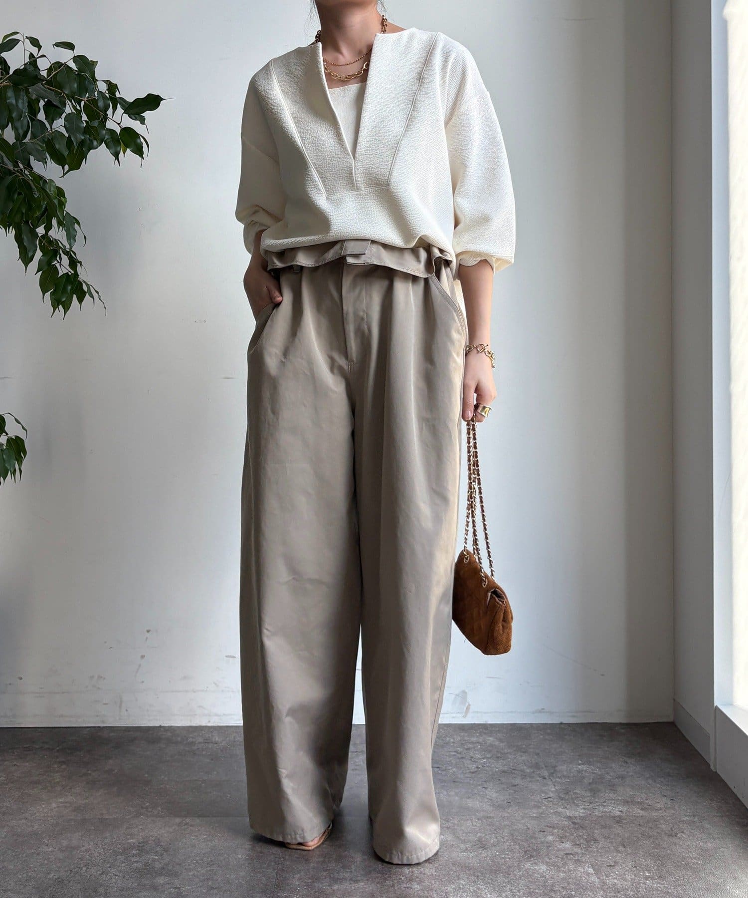 ハリ感があるので、身体のラインを拾いすぎず自然と立体的なシルエットに。