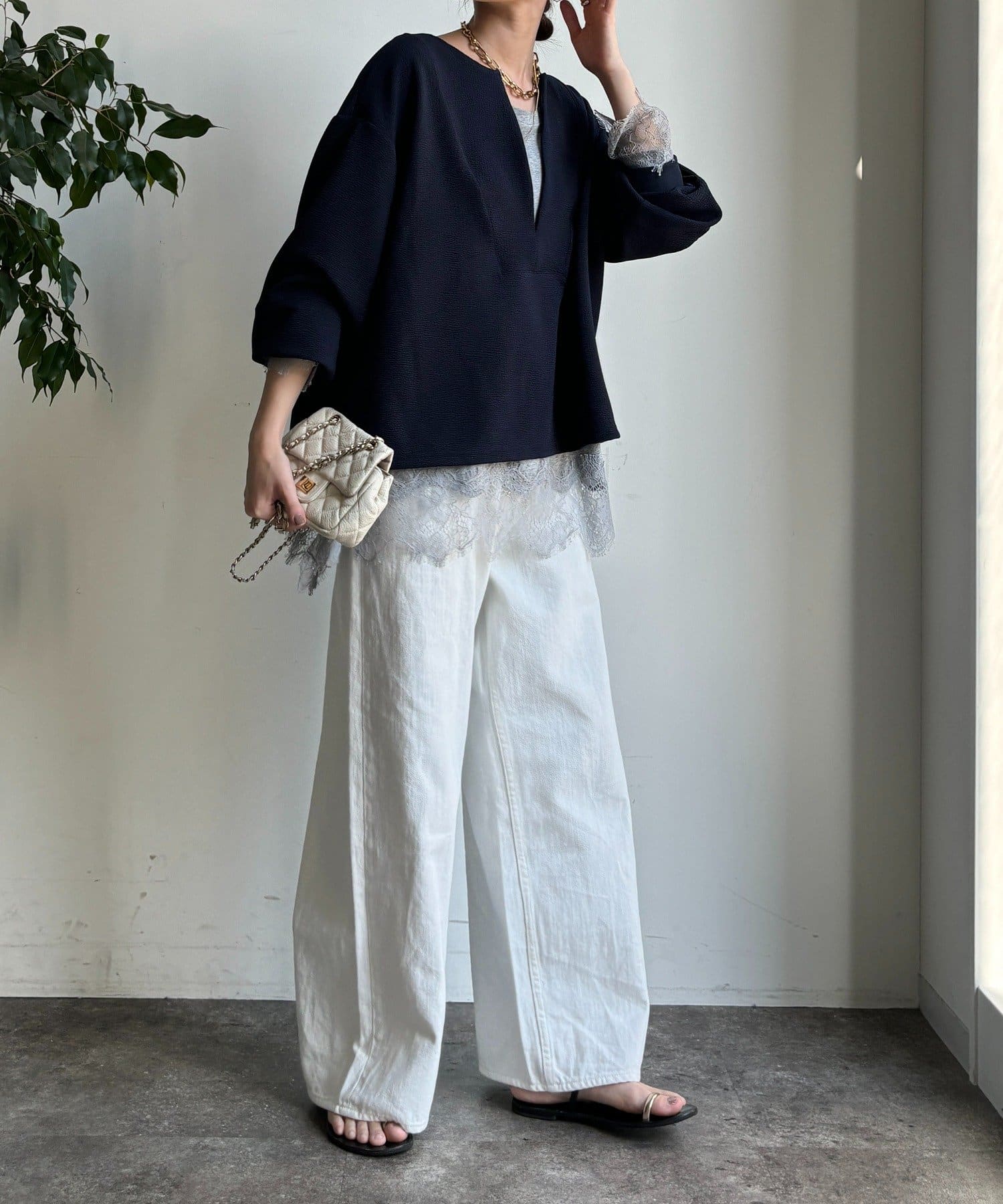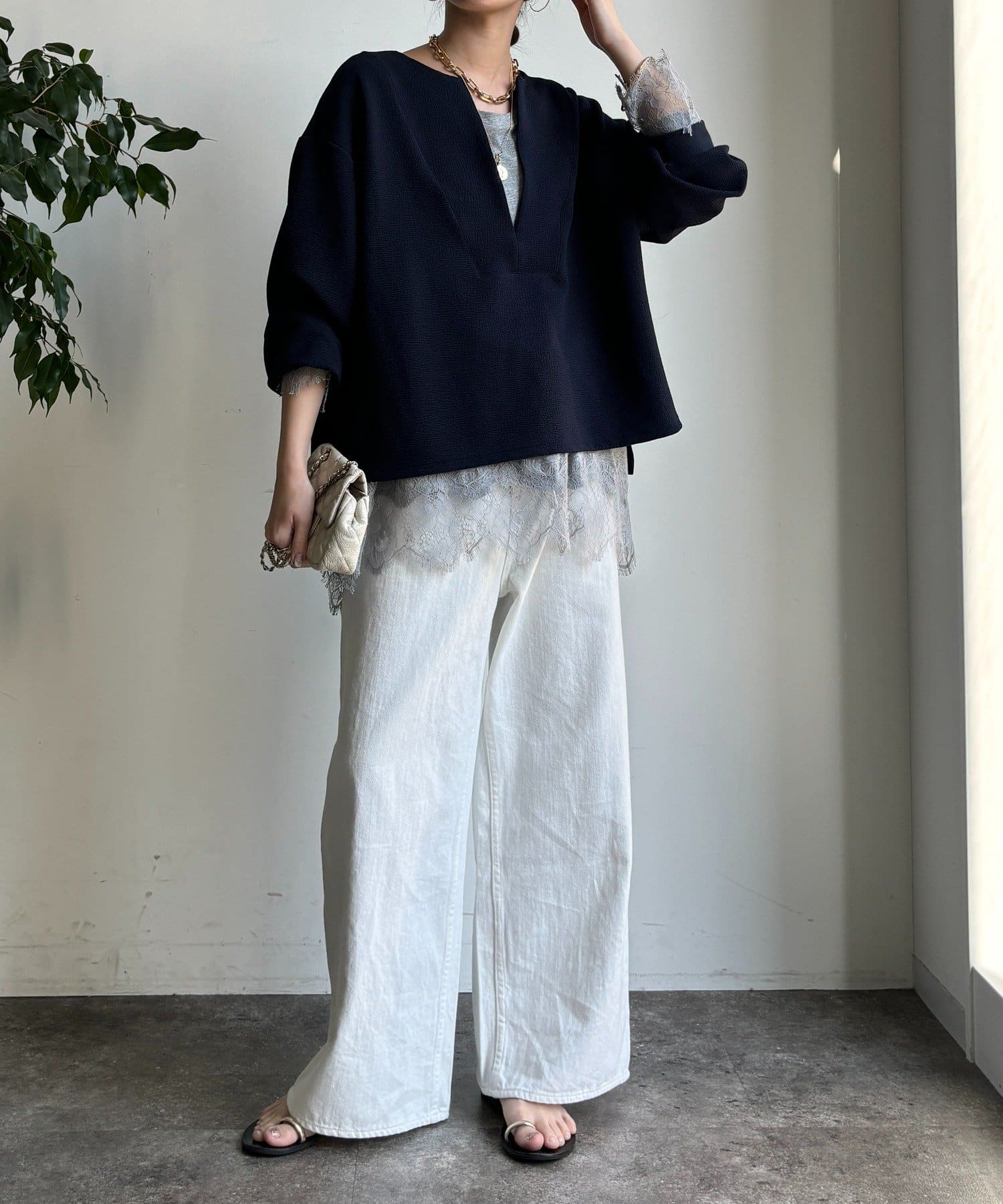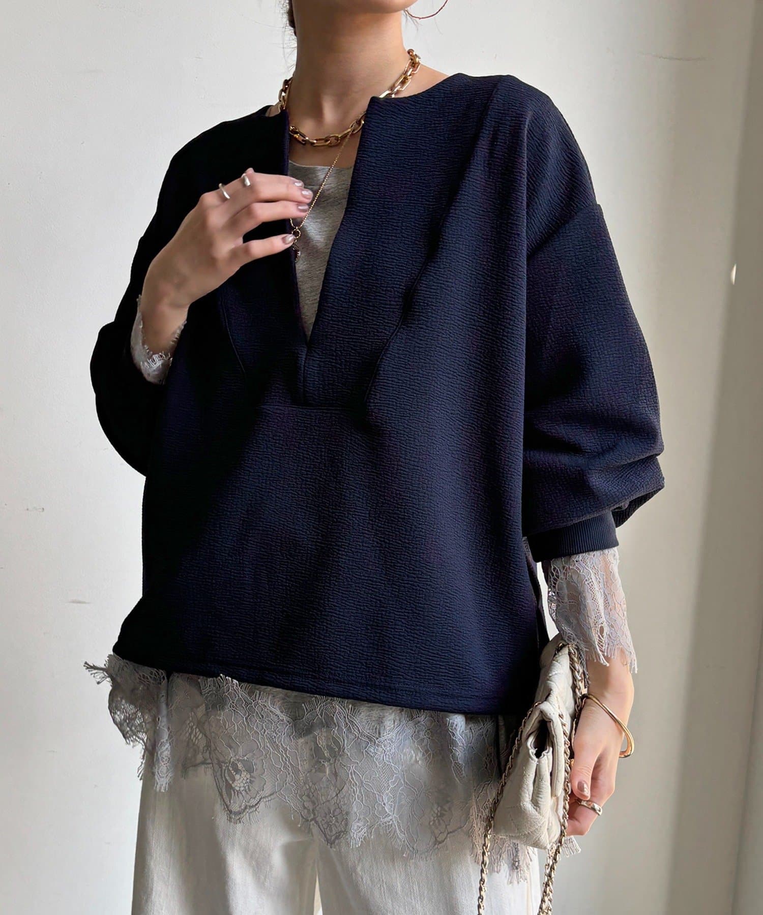 トレンドのレースのインナーを使ったレイヤードスタイルにもぴったり!