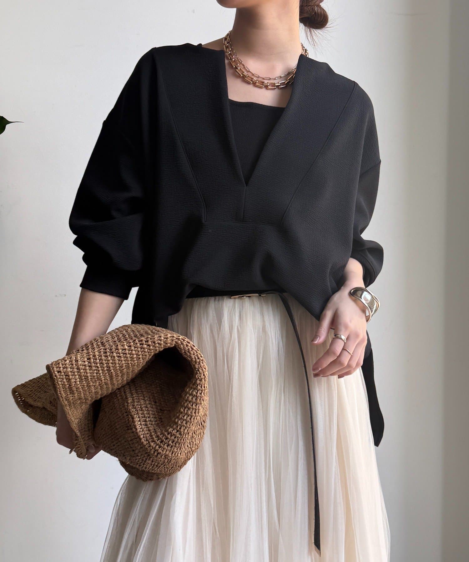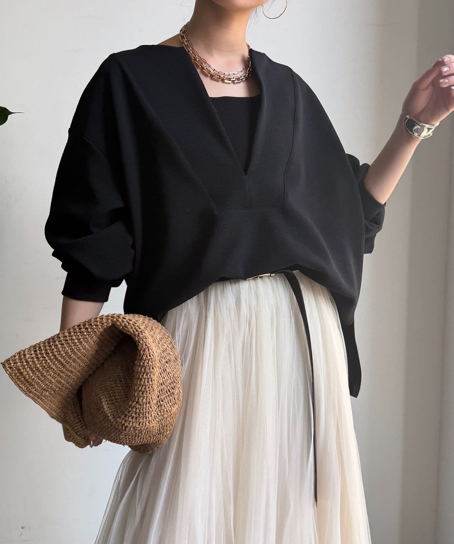 深すぎないVラインが、女性らしい柔らかさを演出してくれます。