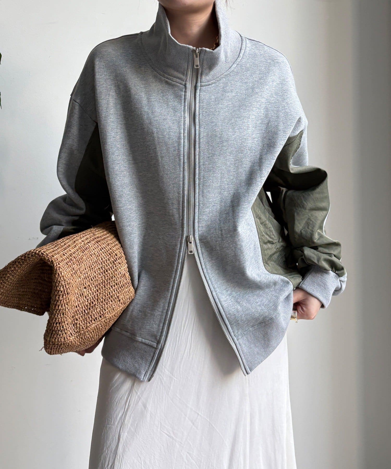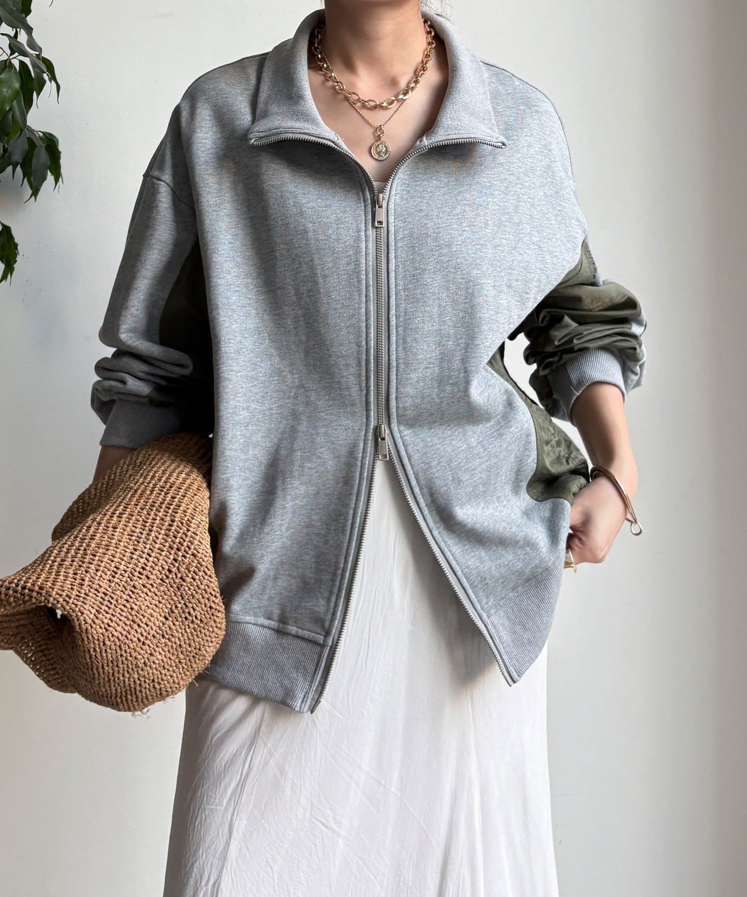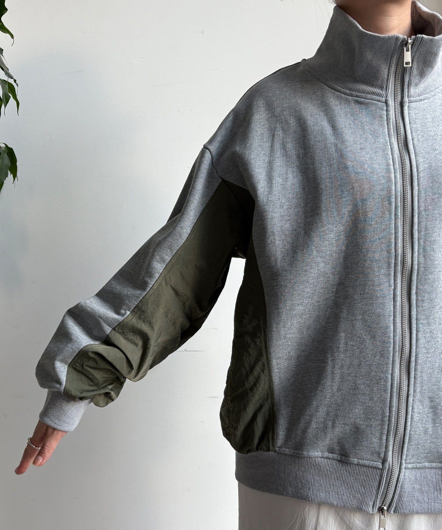 スウェット素材にナイロンを組み合わせた、デザイン性の高い大人のブルゾンです。
