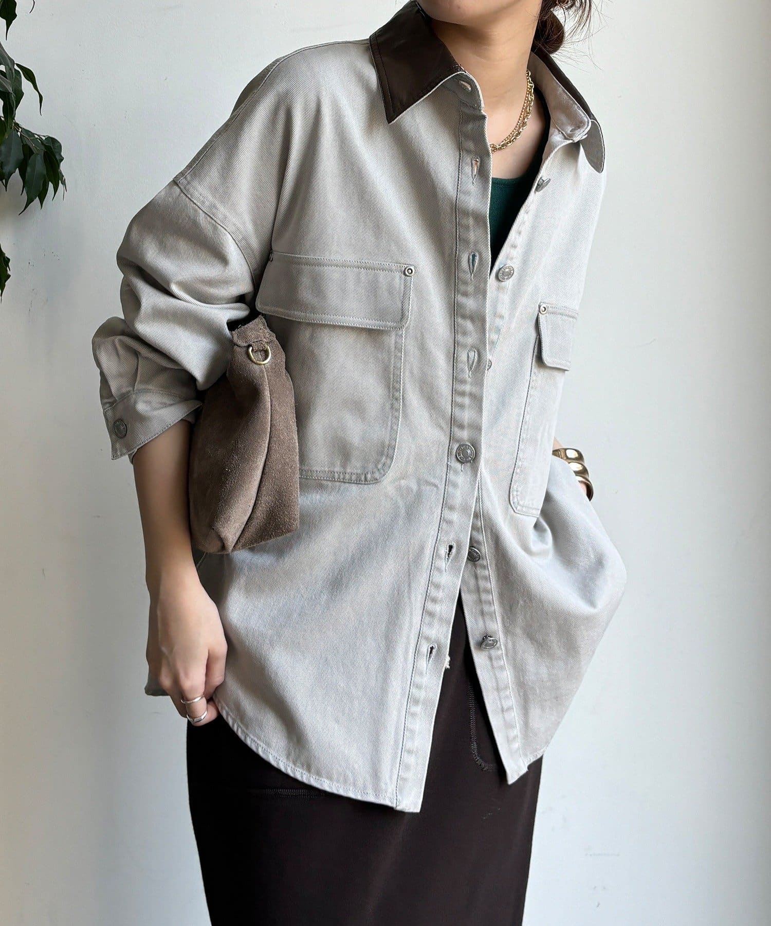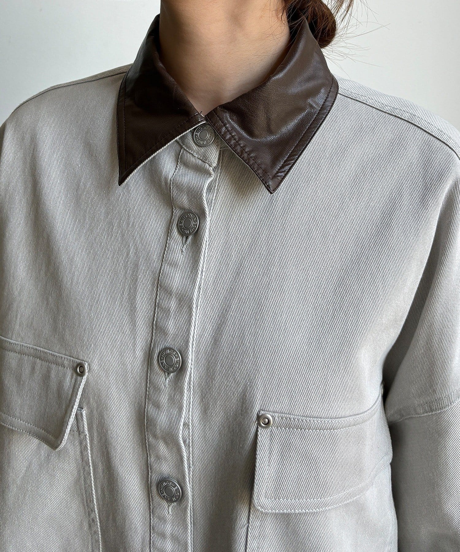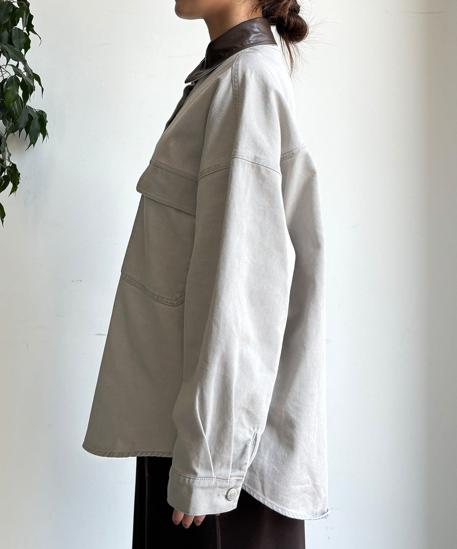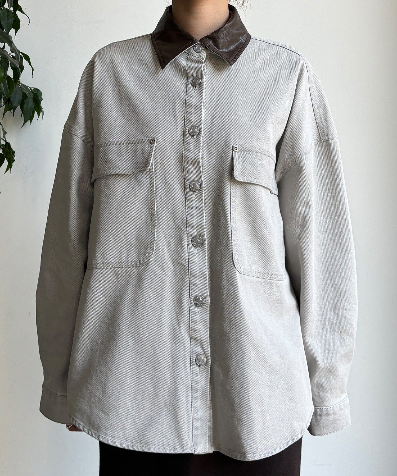 衿はフェイクレザーになっており、カジュアルなシャツを