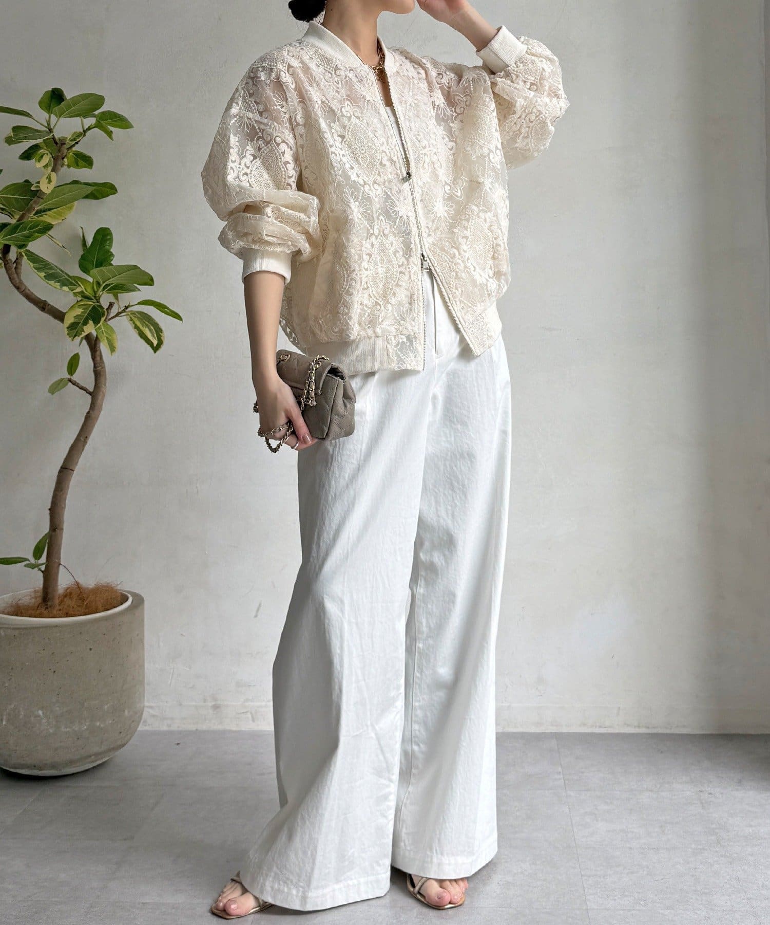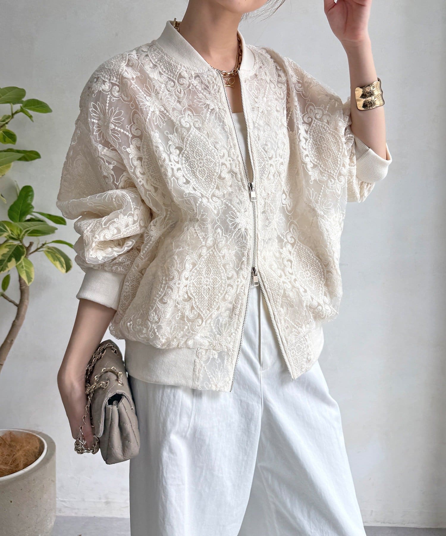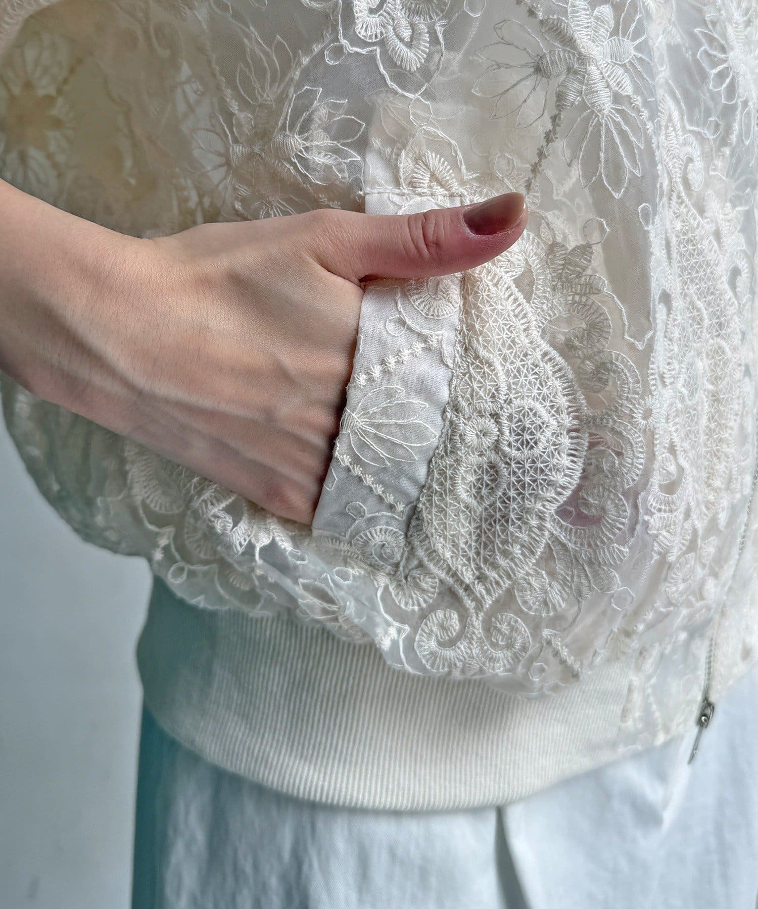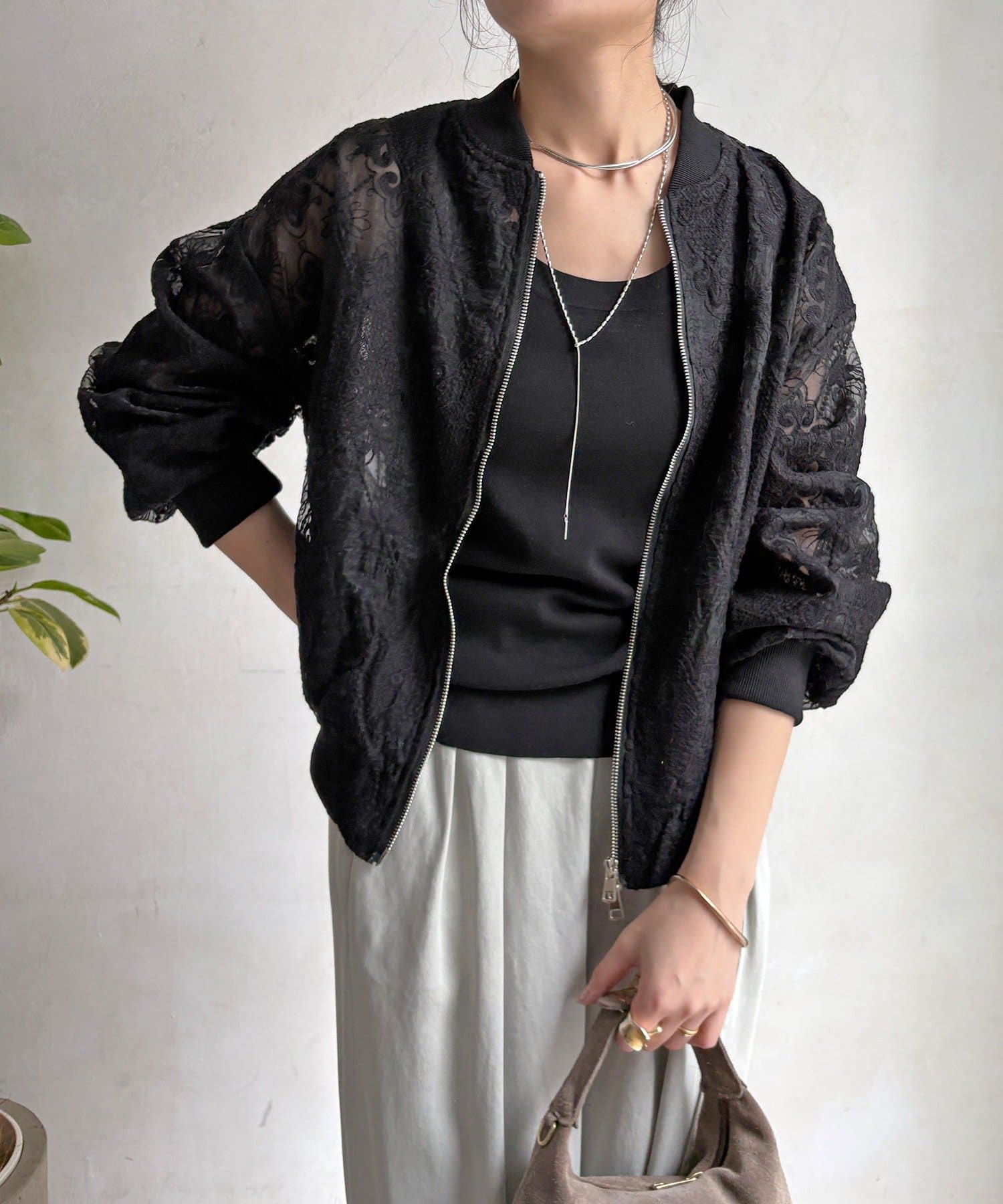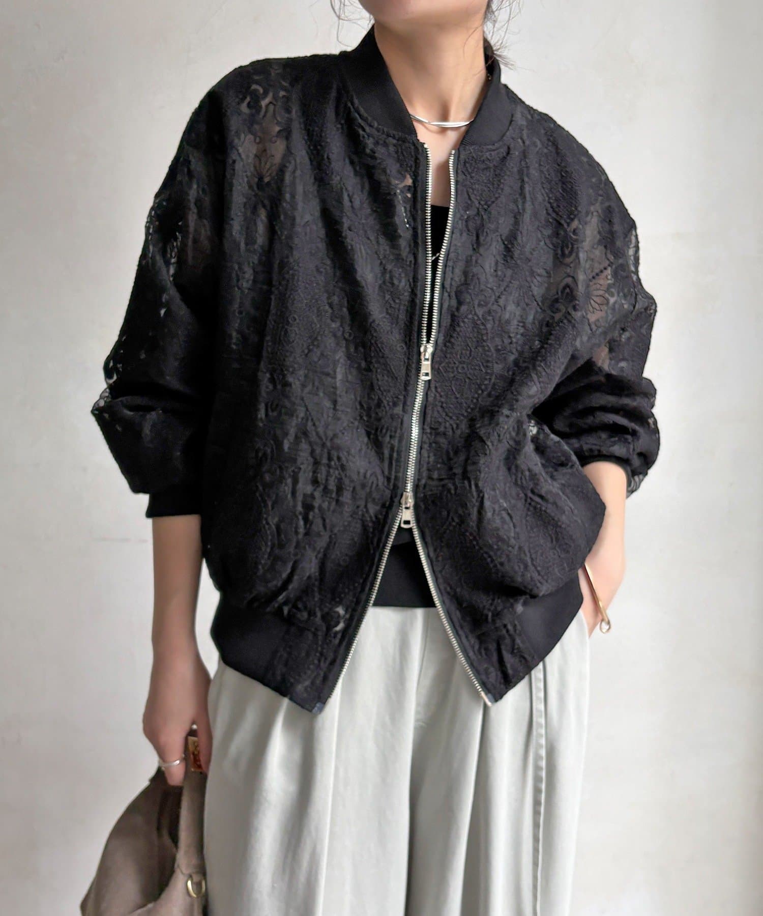 スポーティーなアウターの形にフェミニンなレースを掛け合分けることで