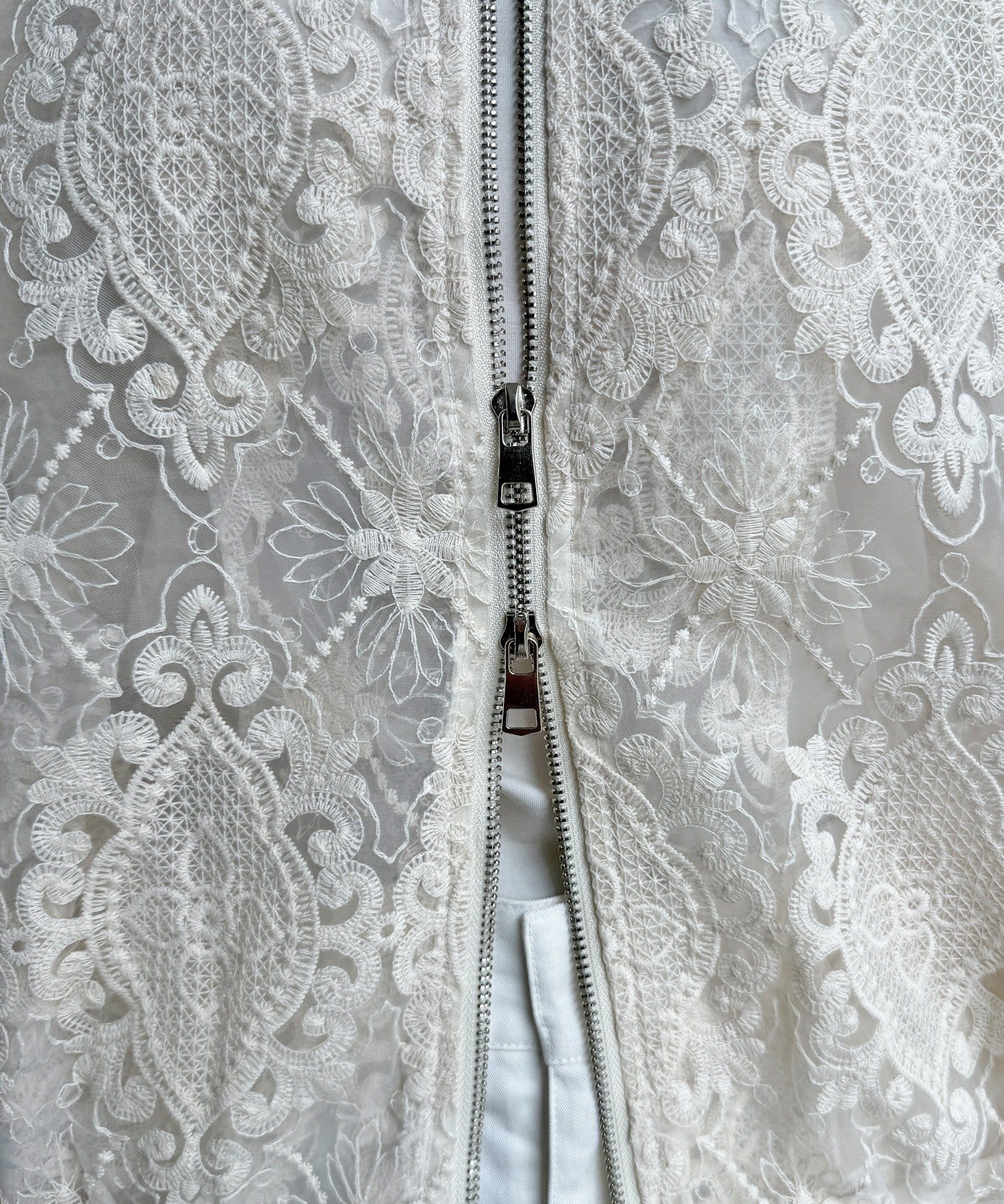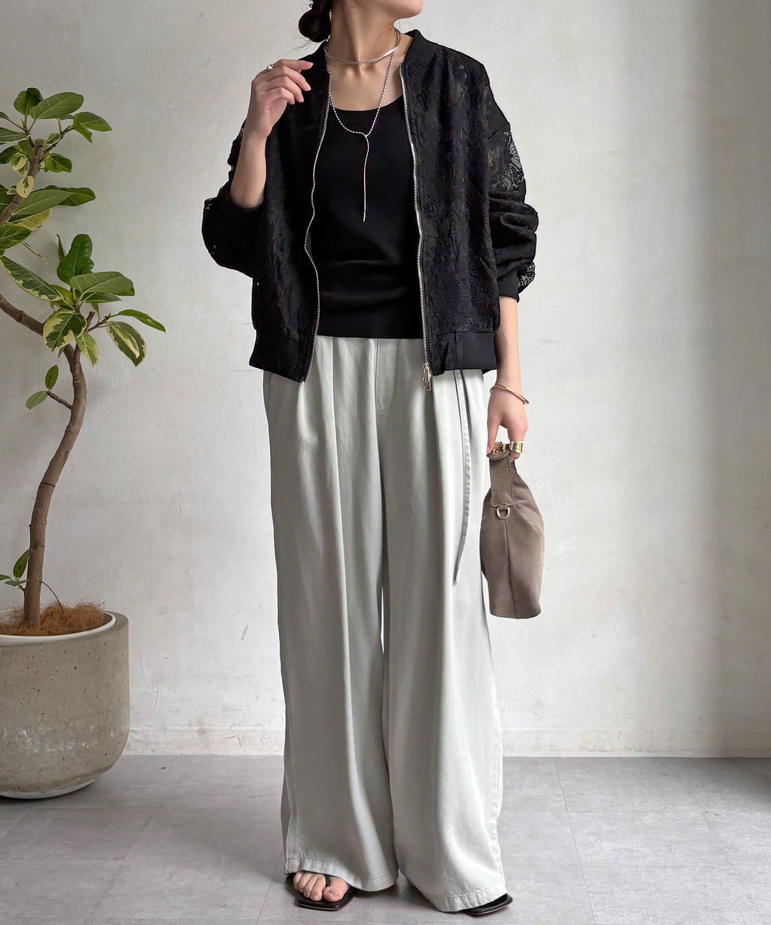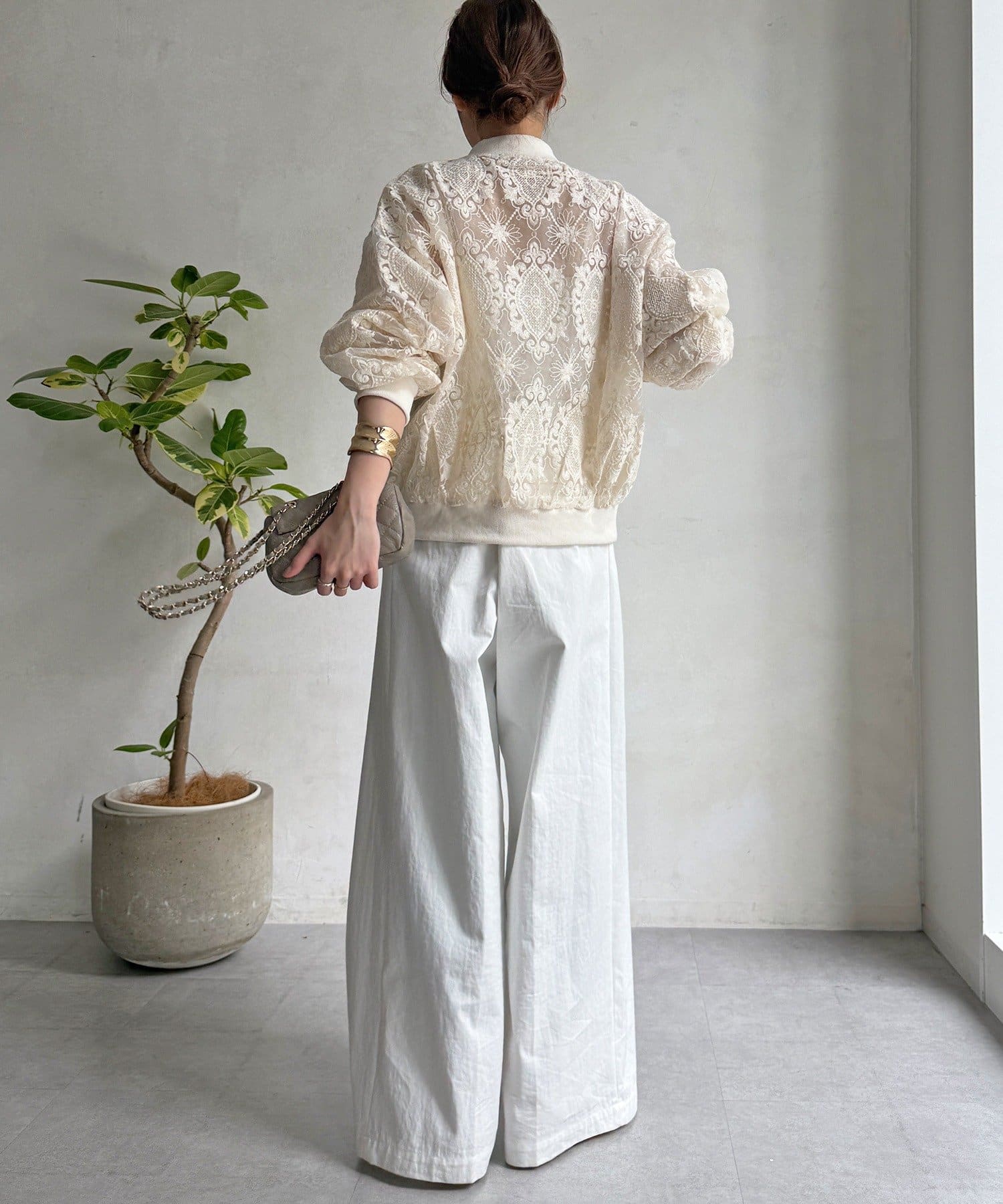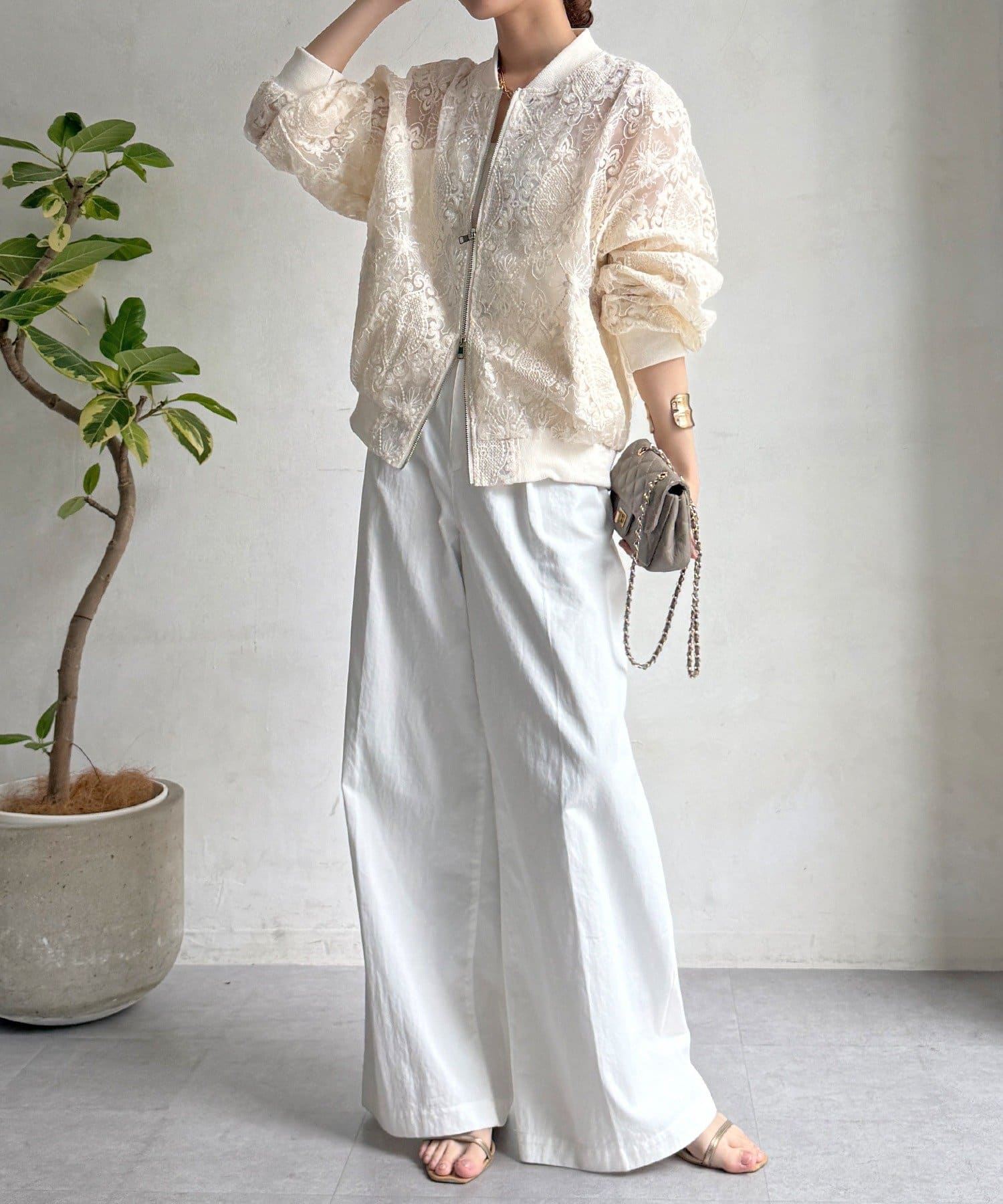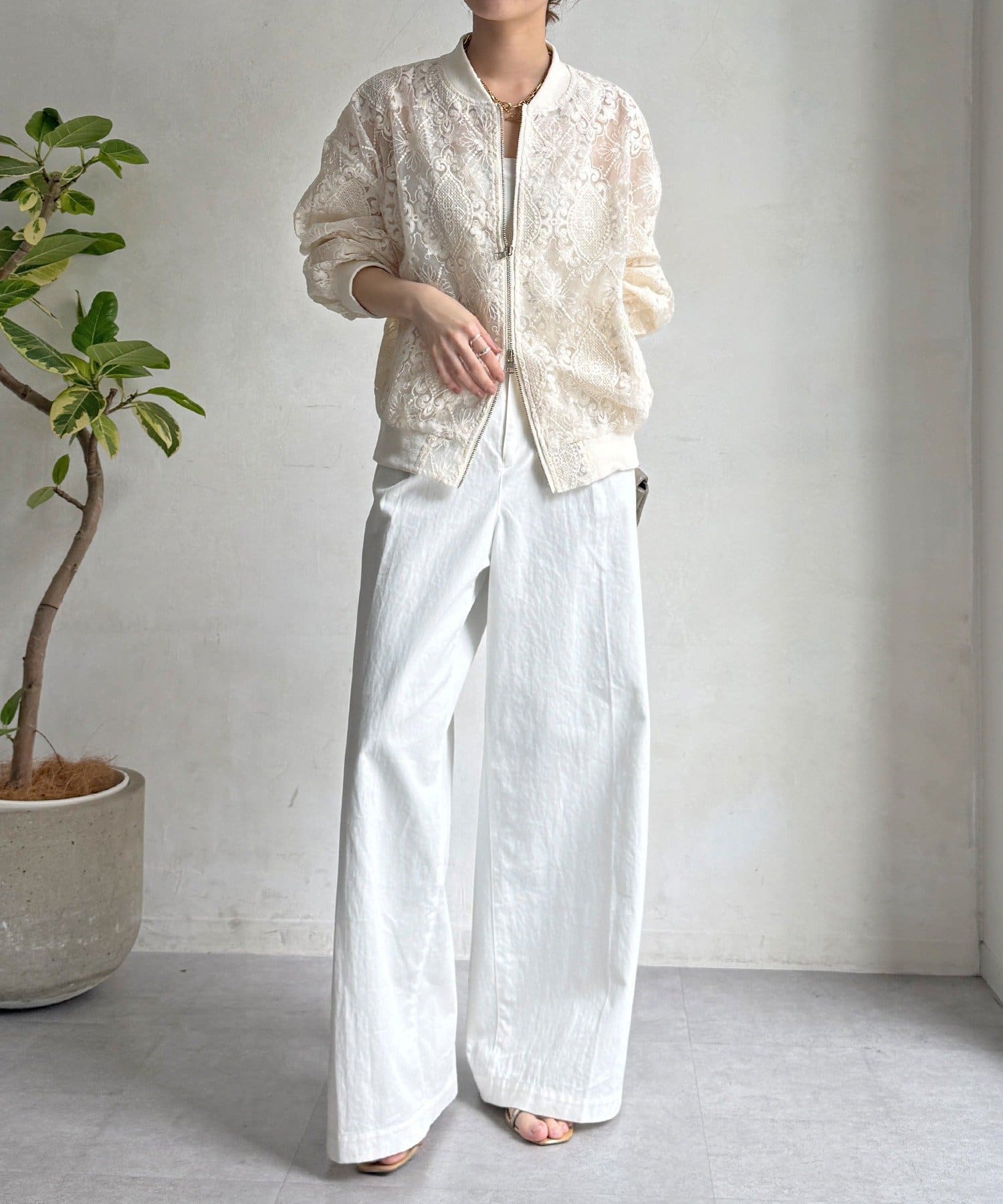 スポーティーなアウターの形にフェミニンなレースを掛け合分けることで