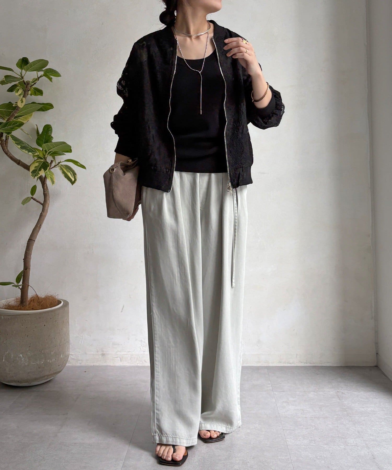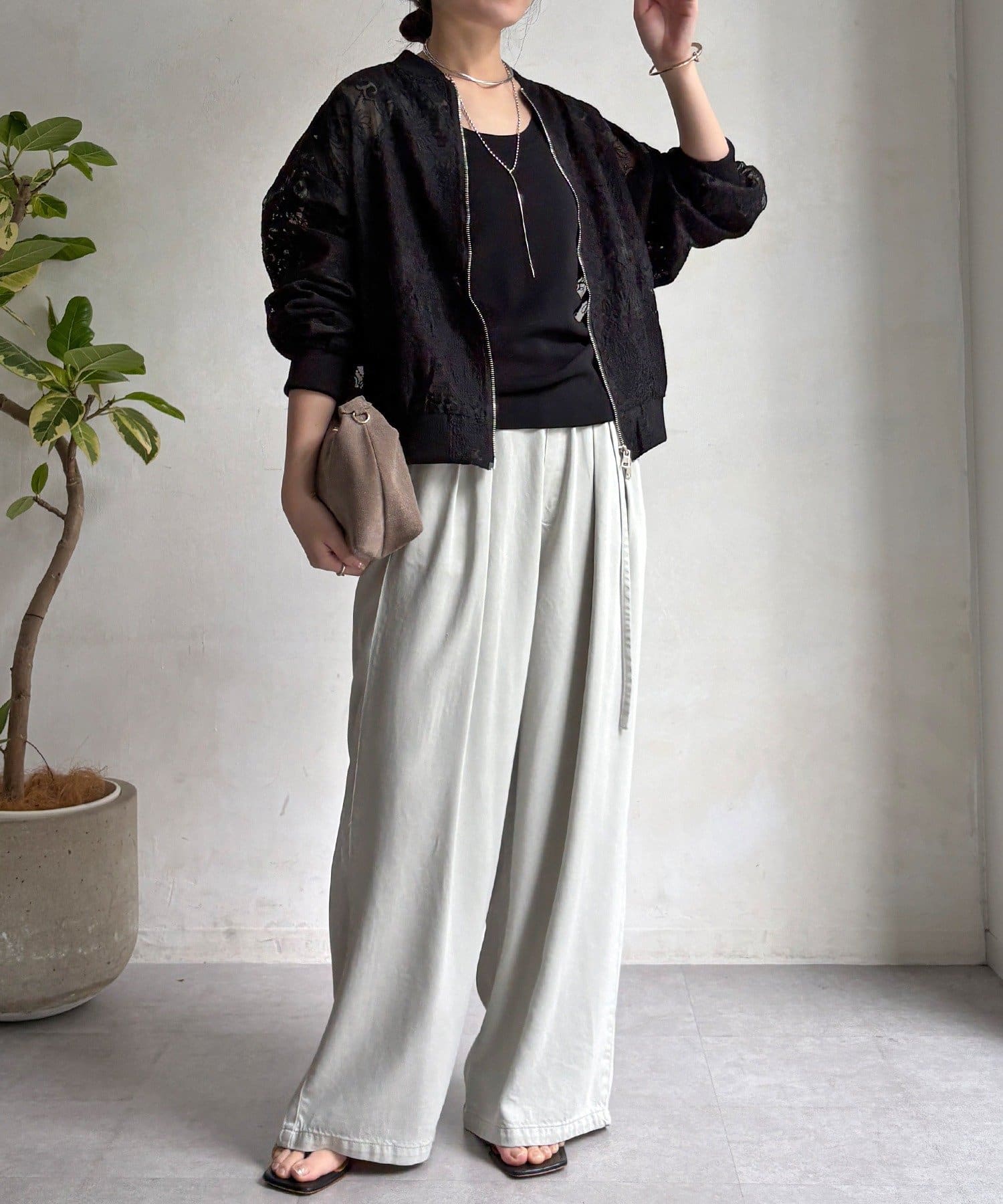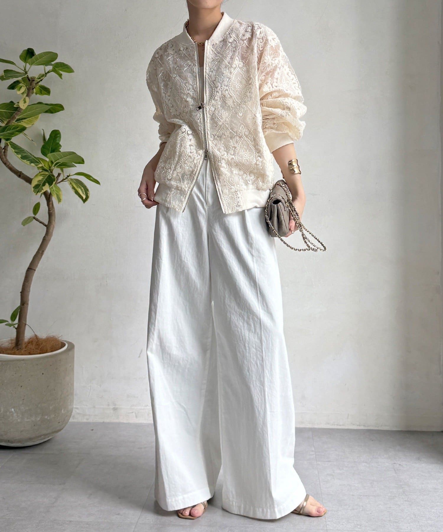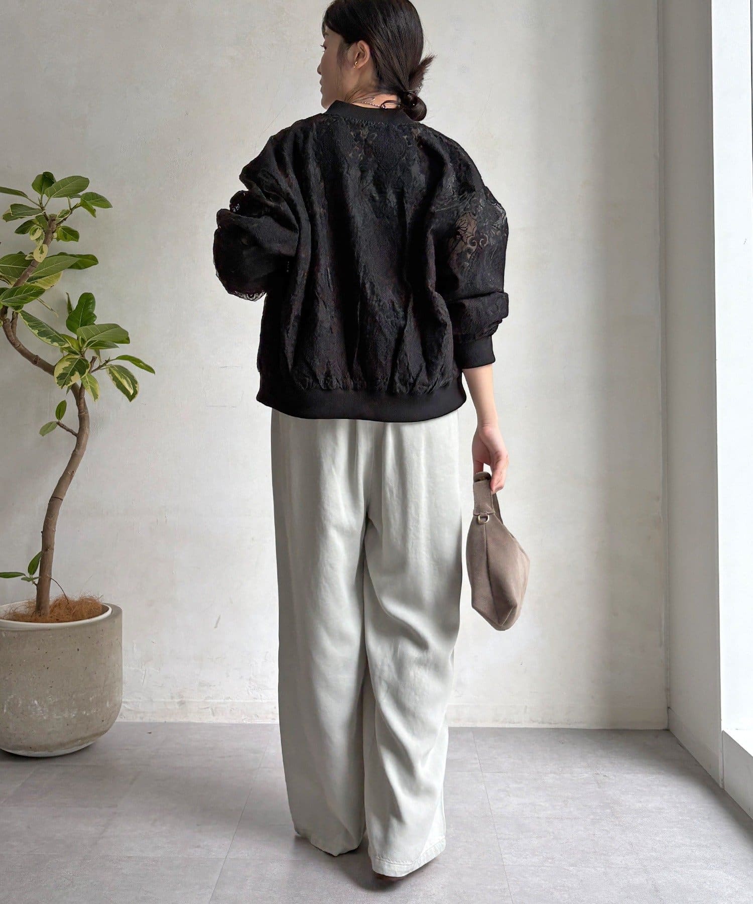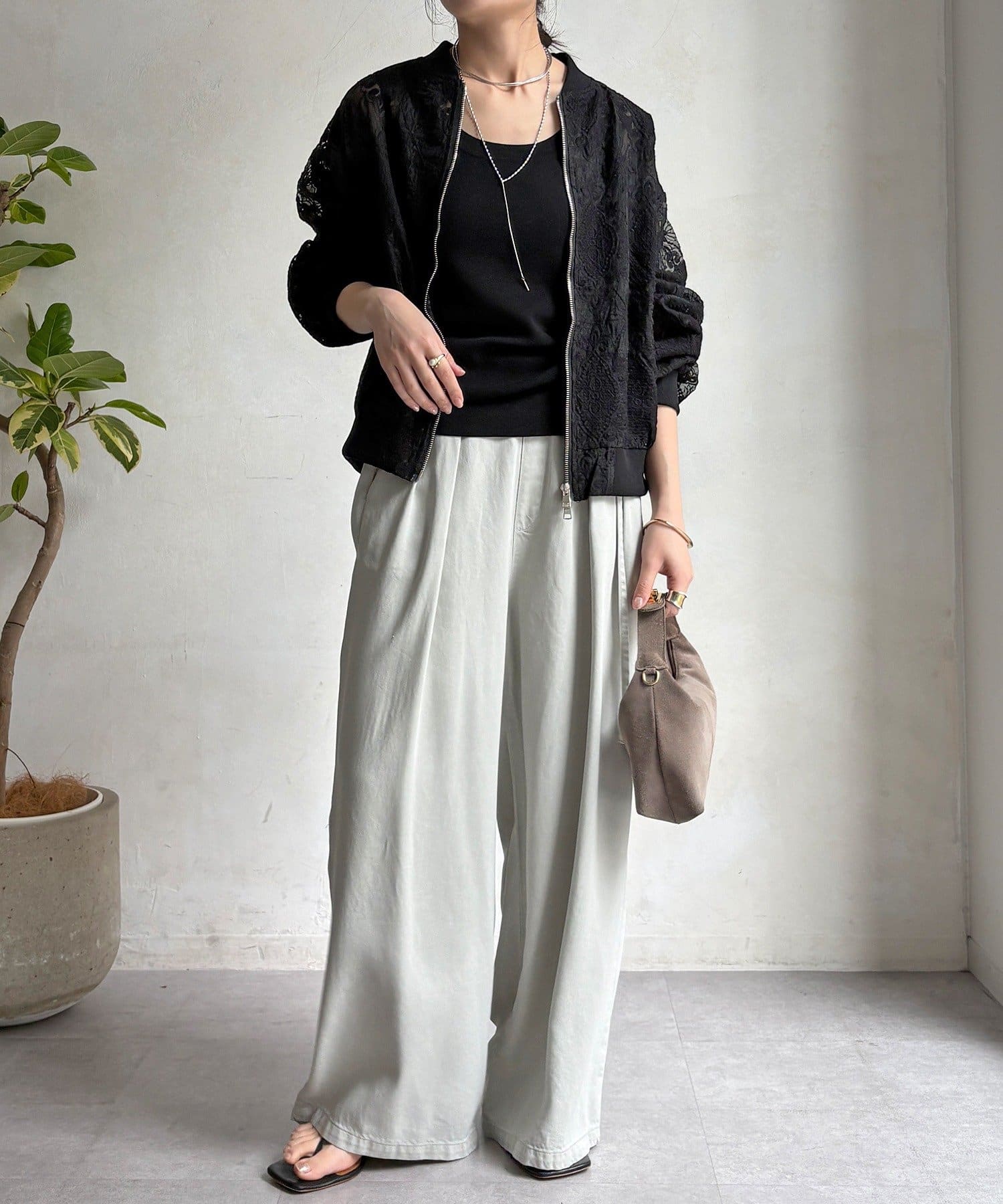 スポーティーなアウターの形にフェミニンなレースを掛け合分けることで