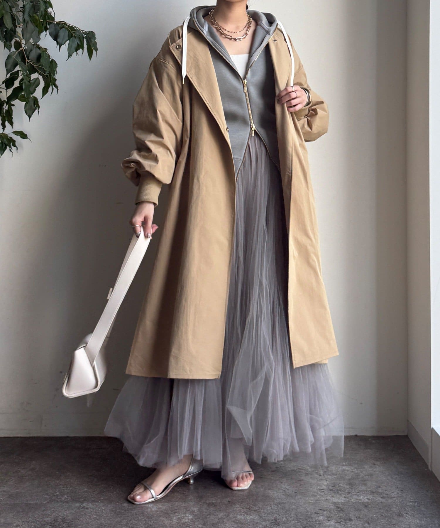春・秋はカットソーや薄手ニットの上に、肌寒い時期はインナーダウンやニットを重ねて着用することで、