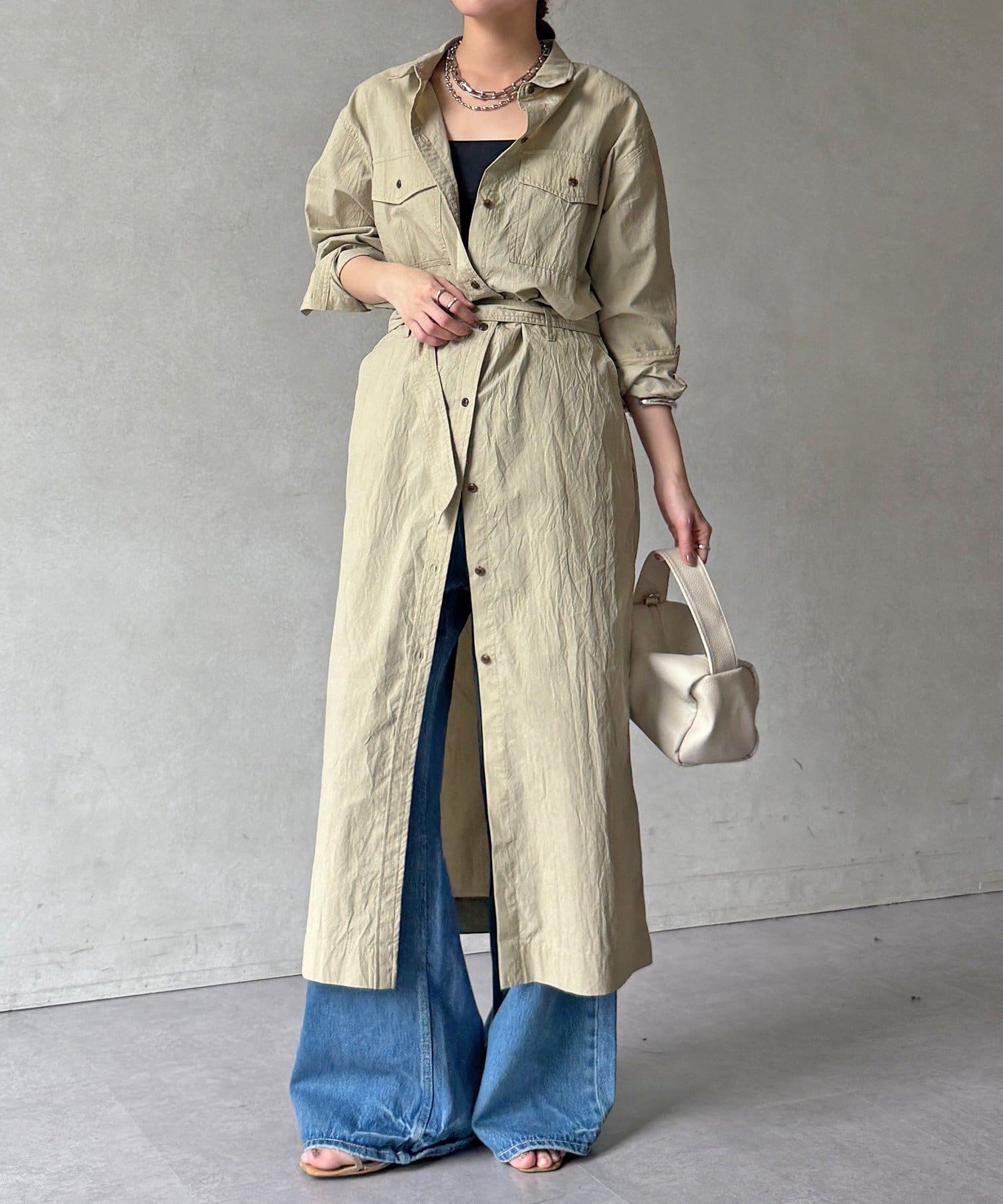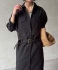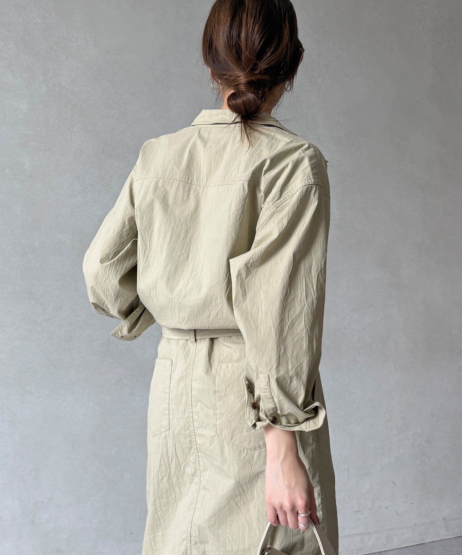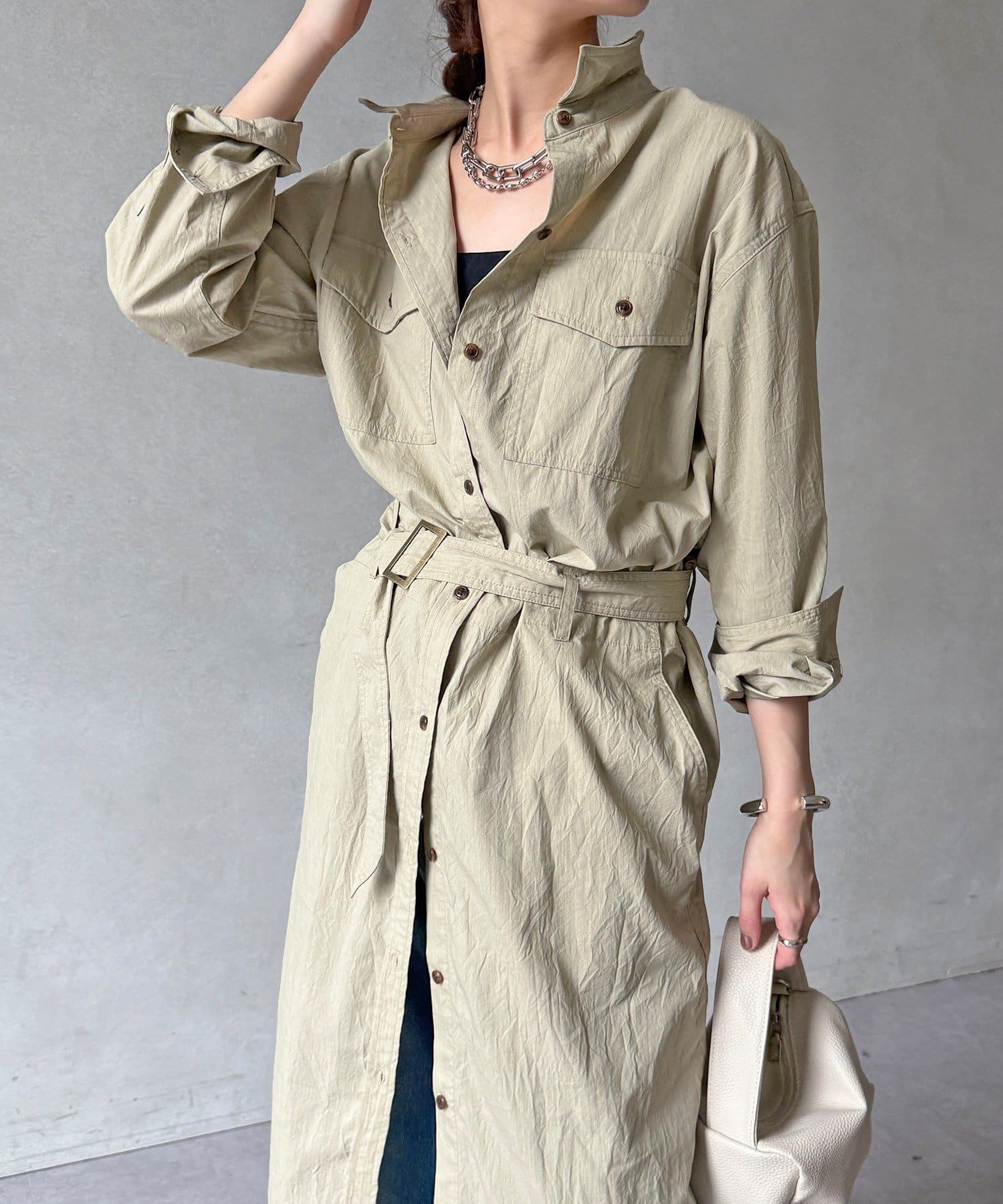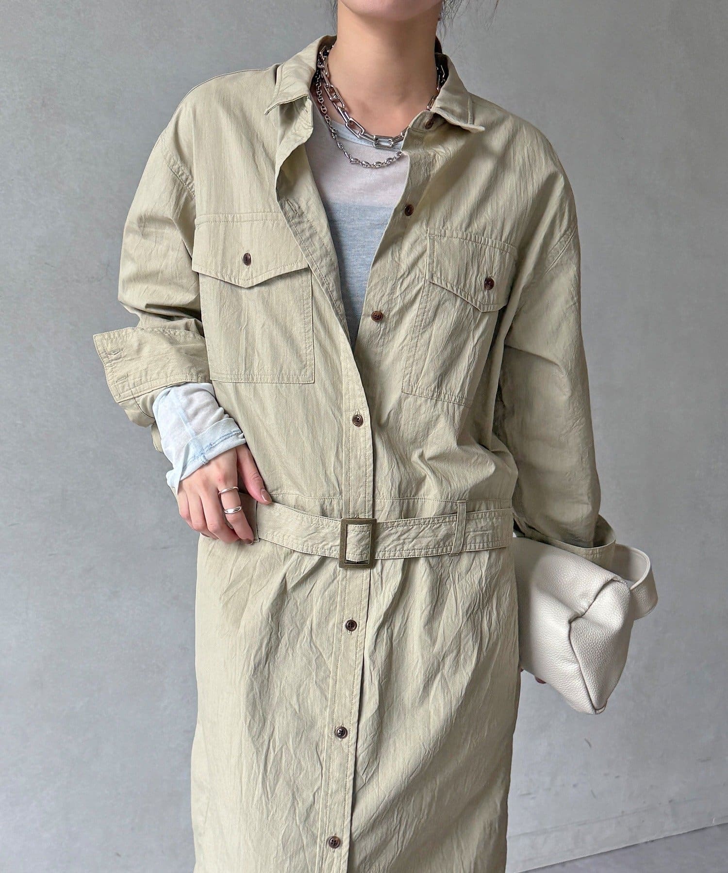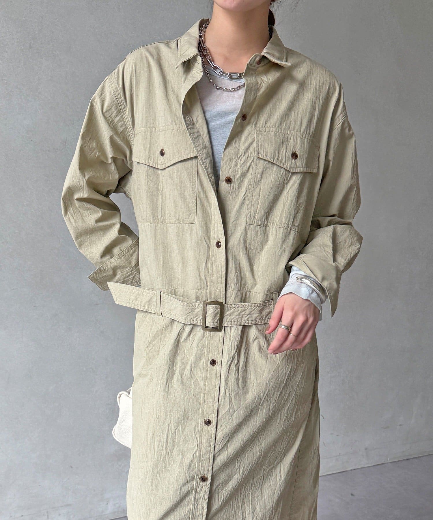 付属のベルトでウエストマークすれば、シルエットにメリハリをプラスでき