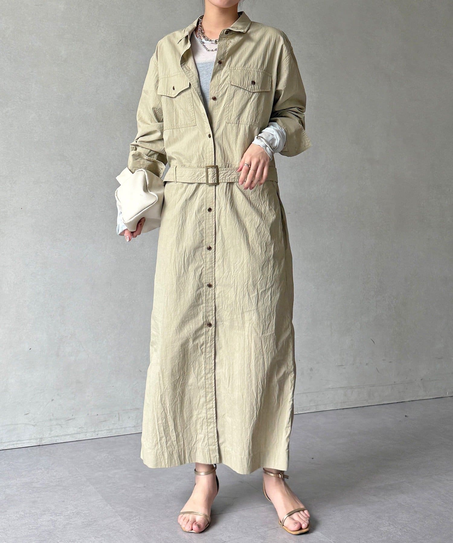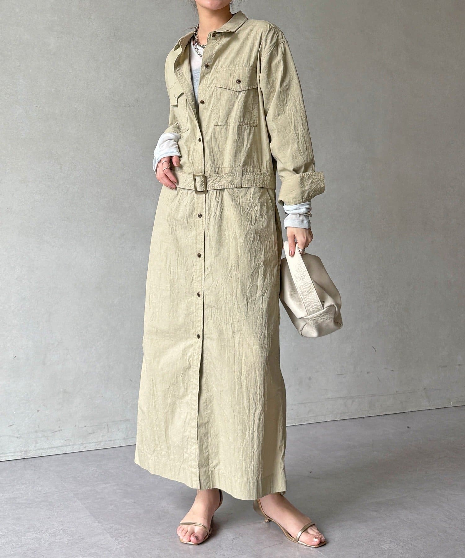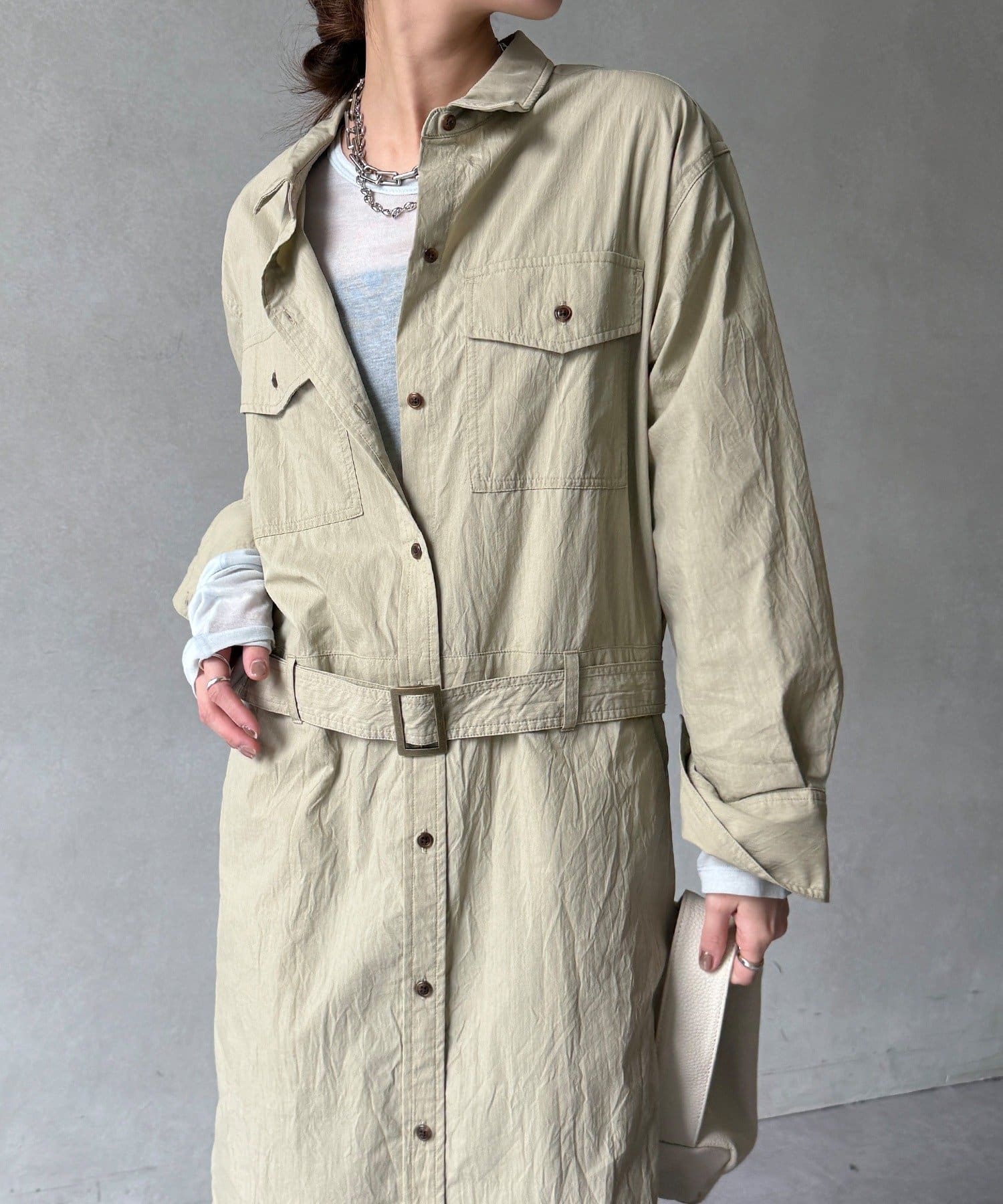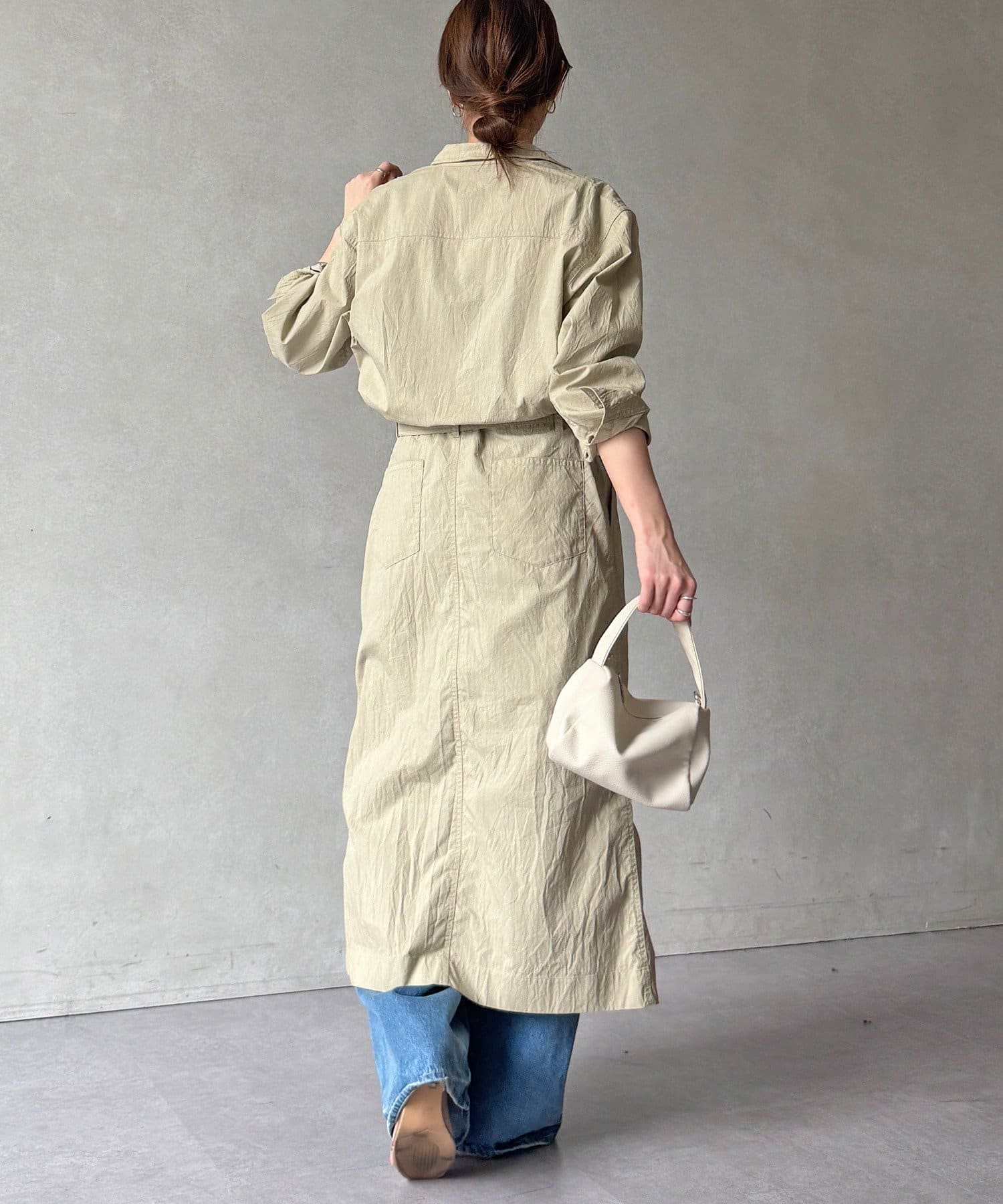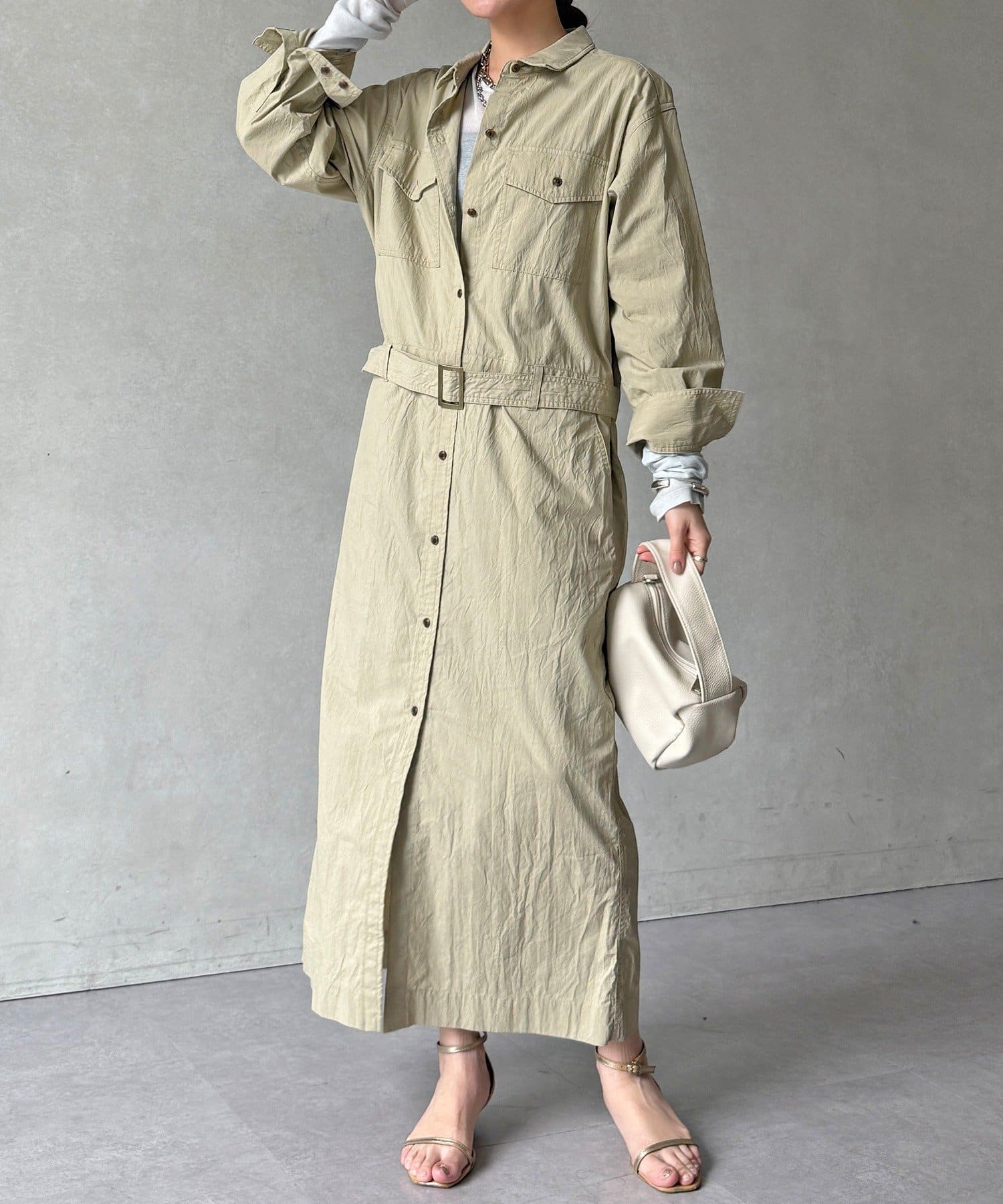 付属のベルトでウエストマークすれば、シルエットにメリハリをプラスでき