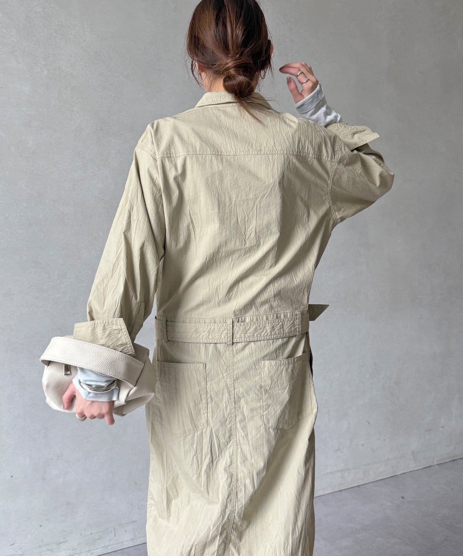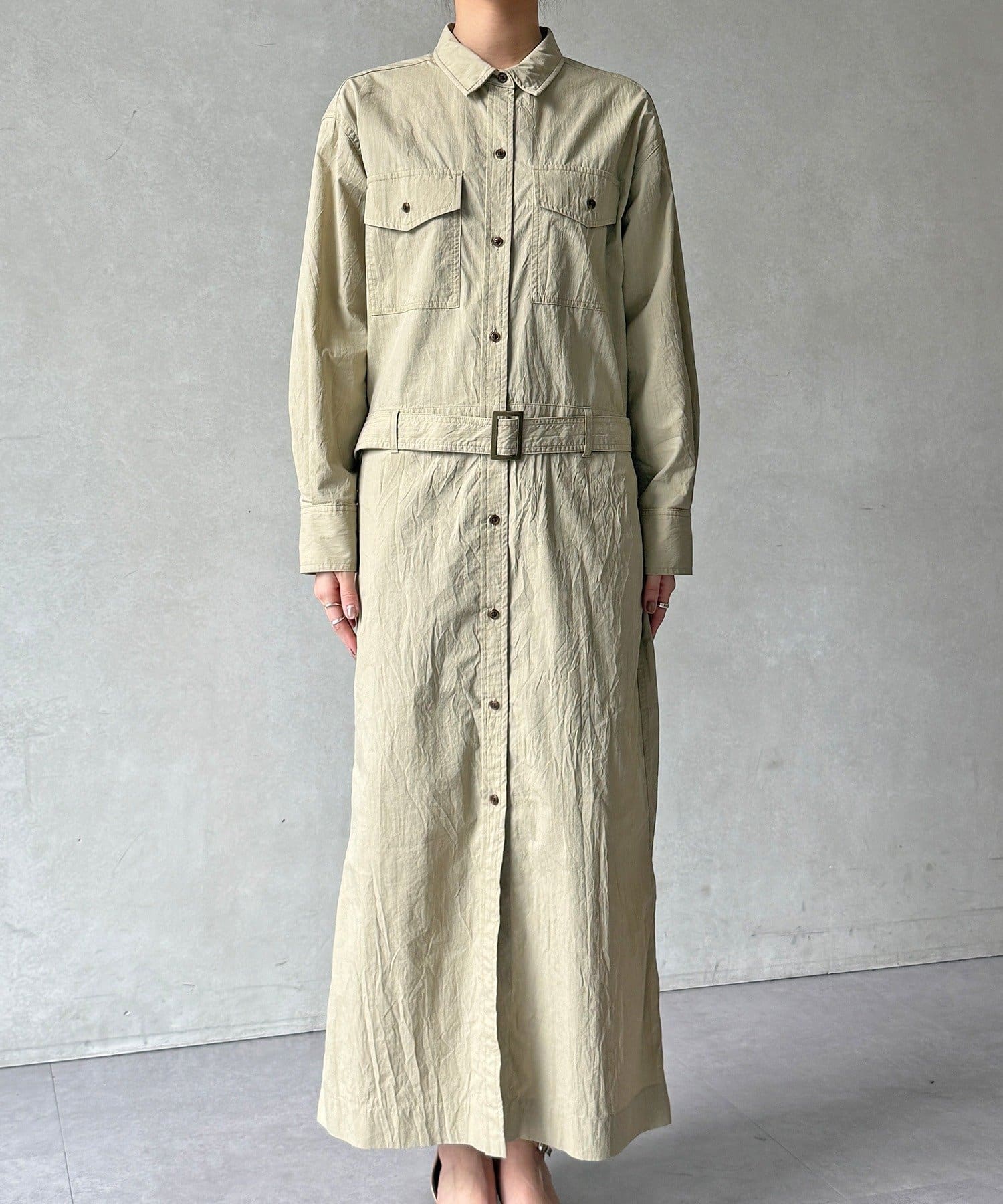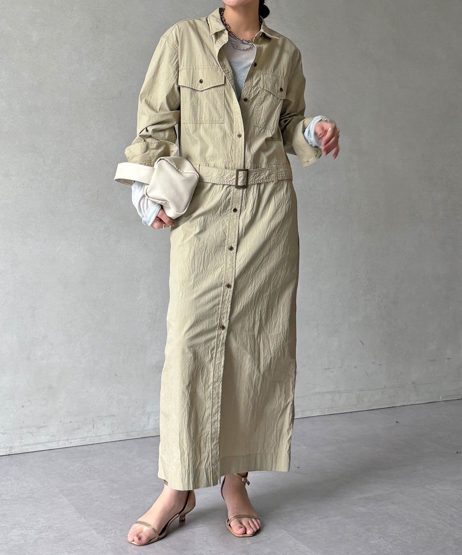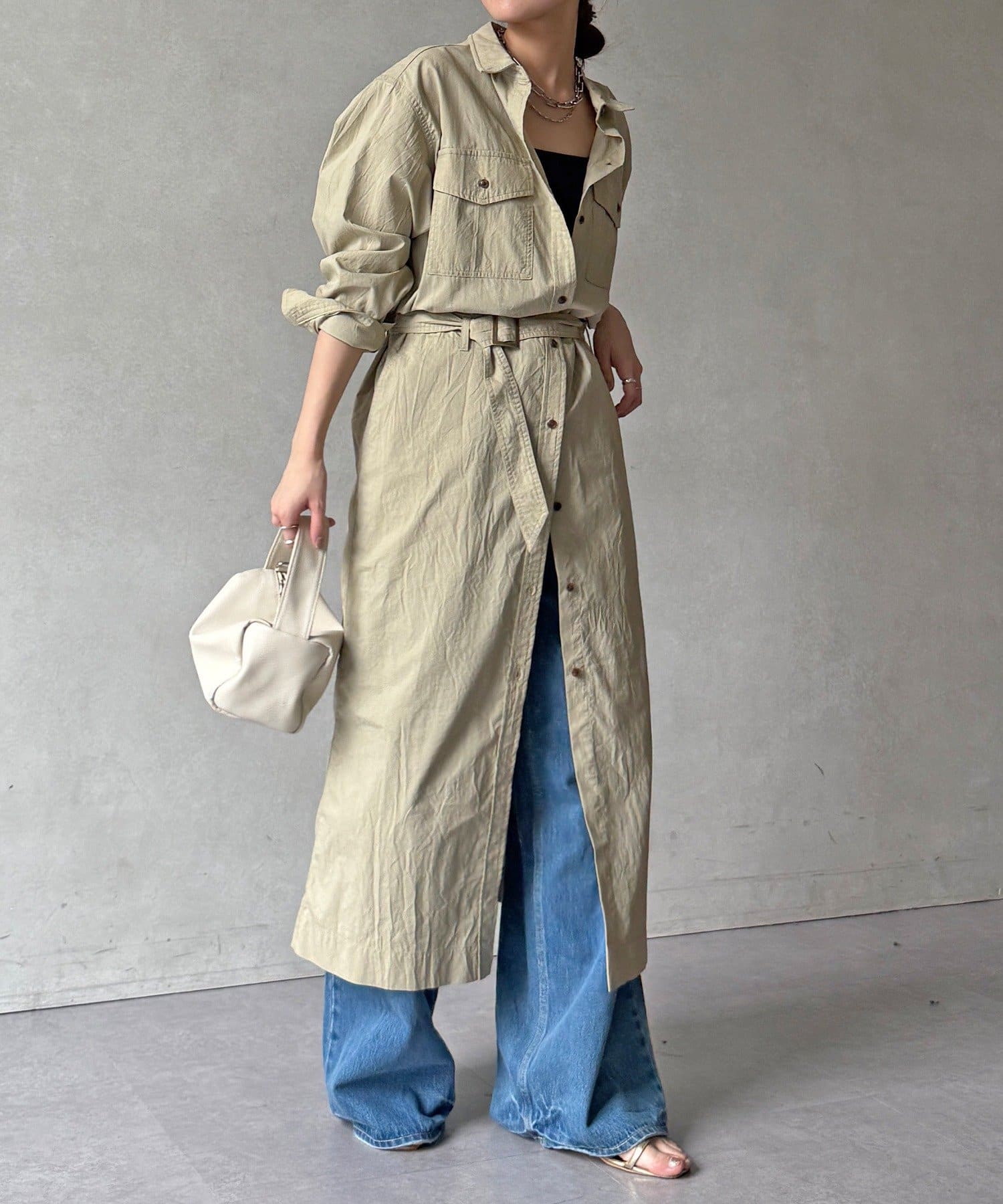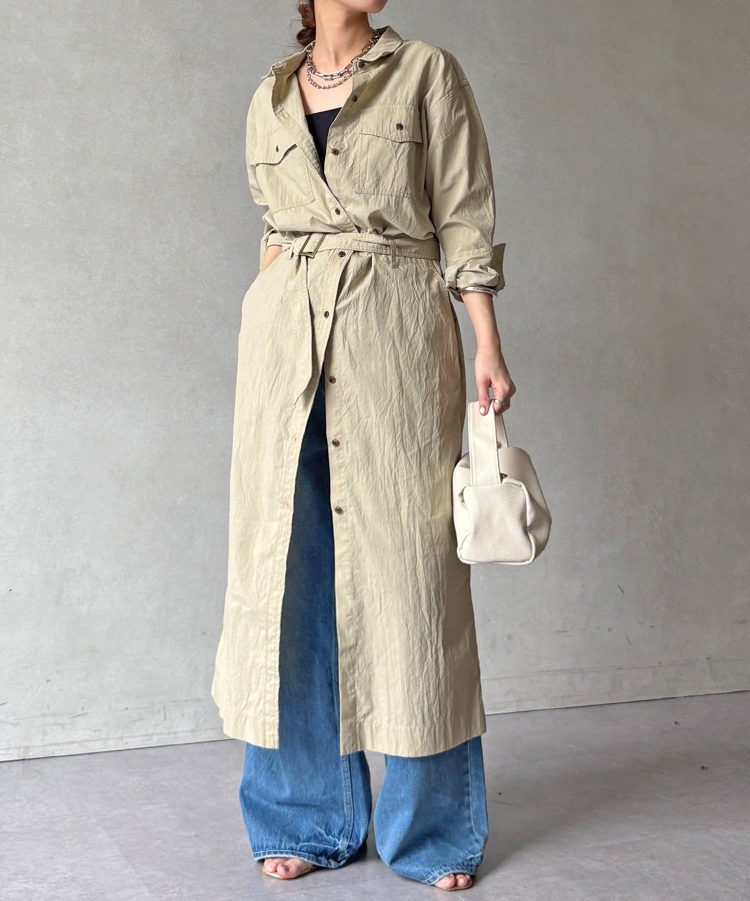 付属のベルトでウエストマークすれば、シルエットにメリハリをプラスでき