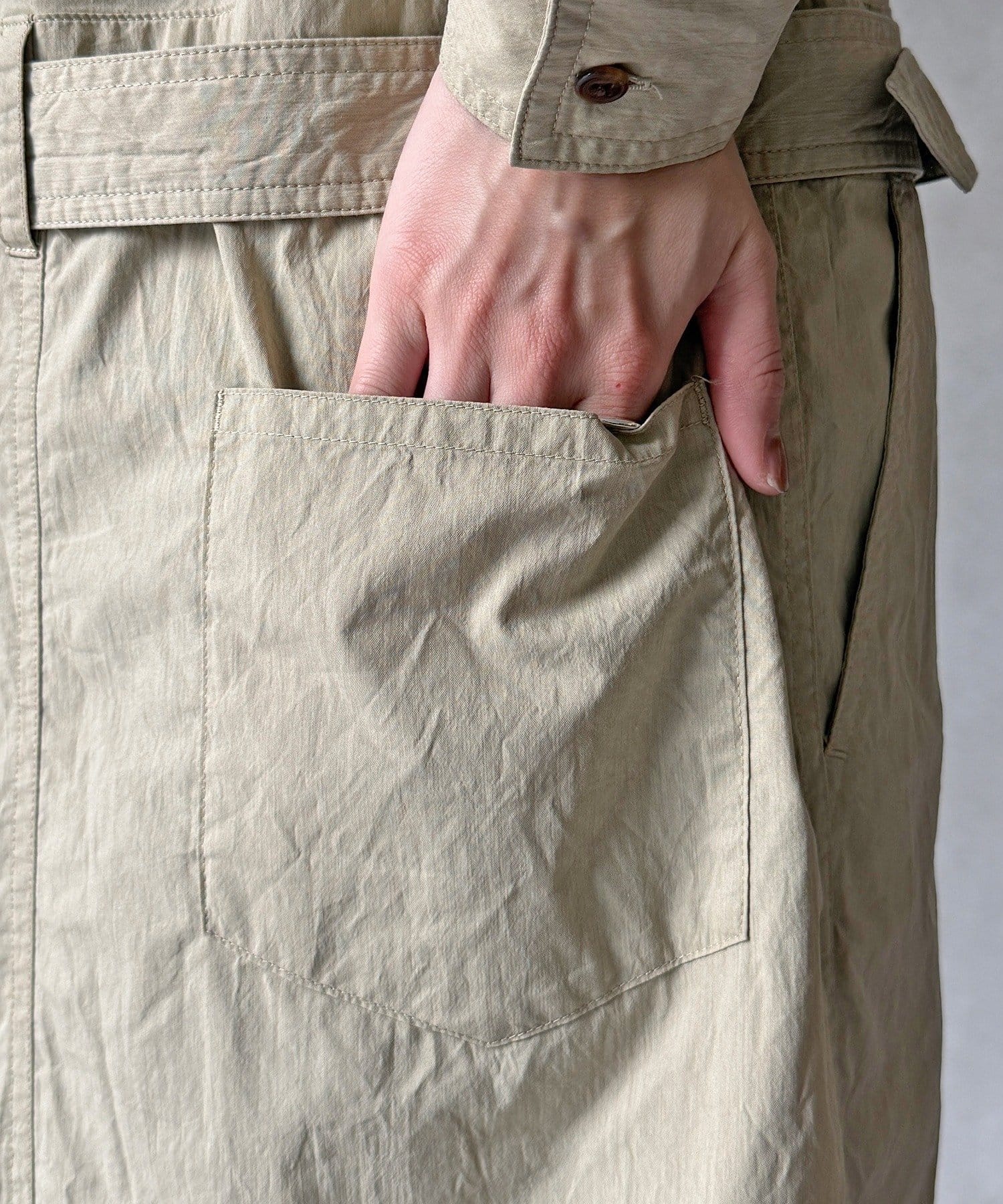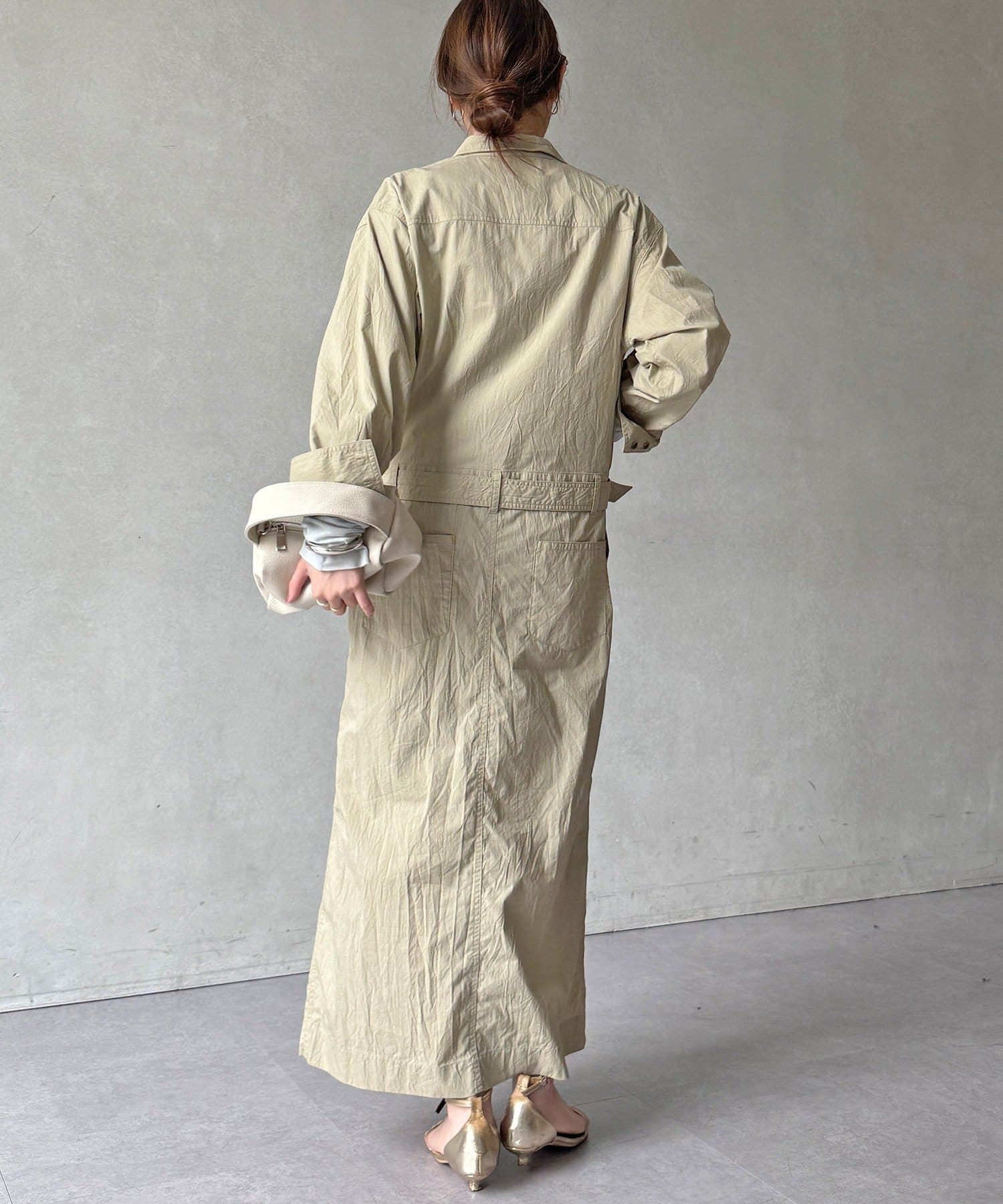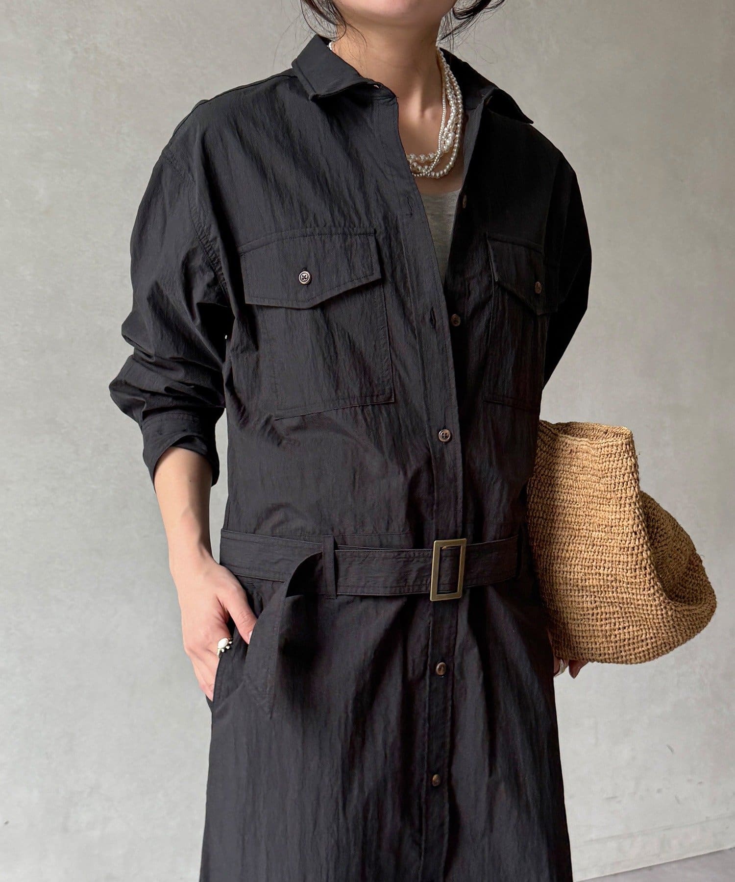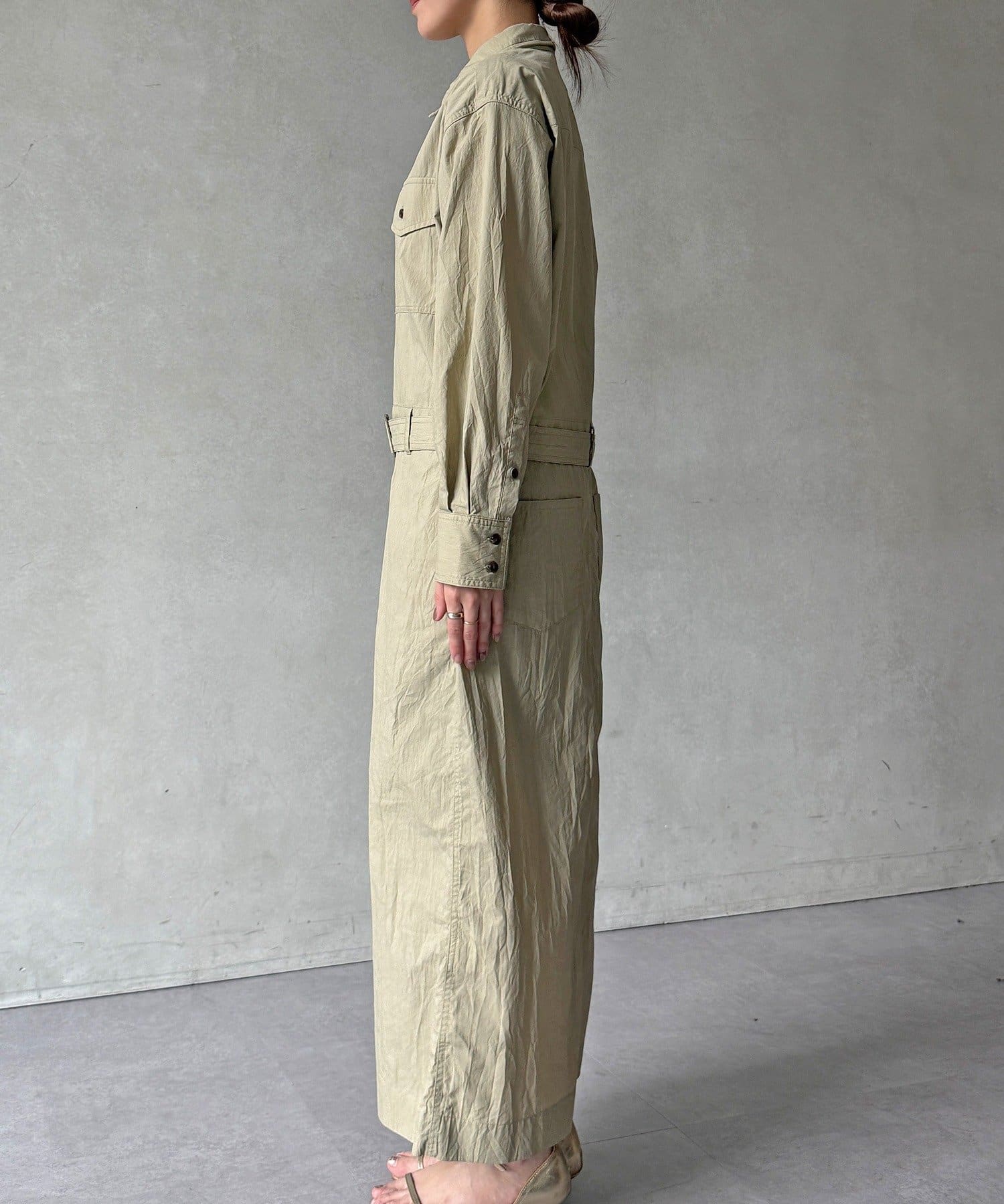 付属のベルトでウエストマークすれば、シルエットにメリハリをプラスでき