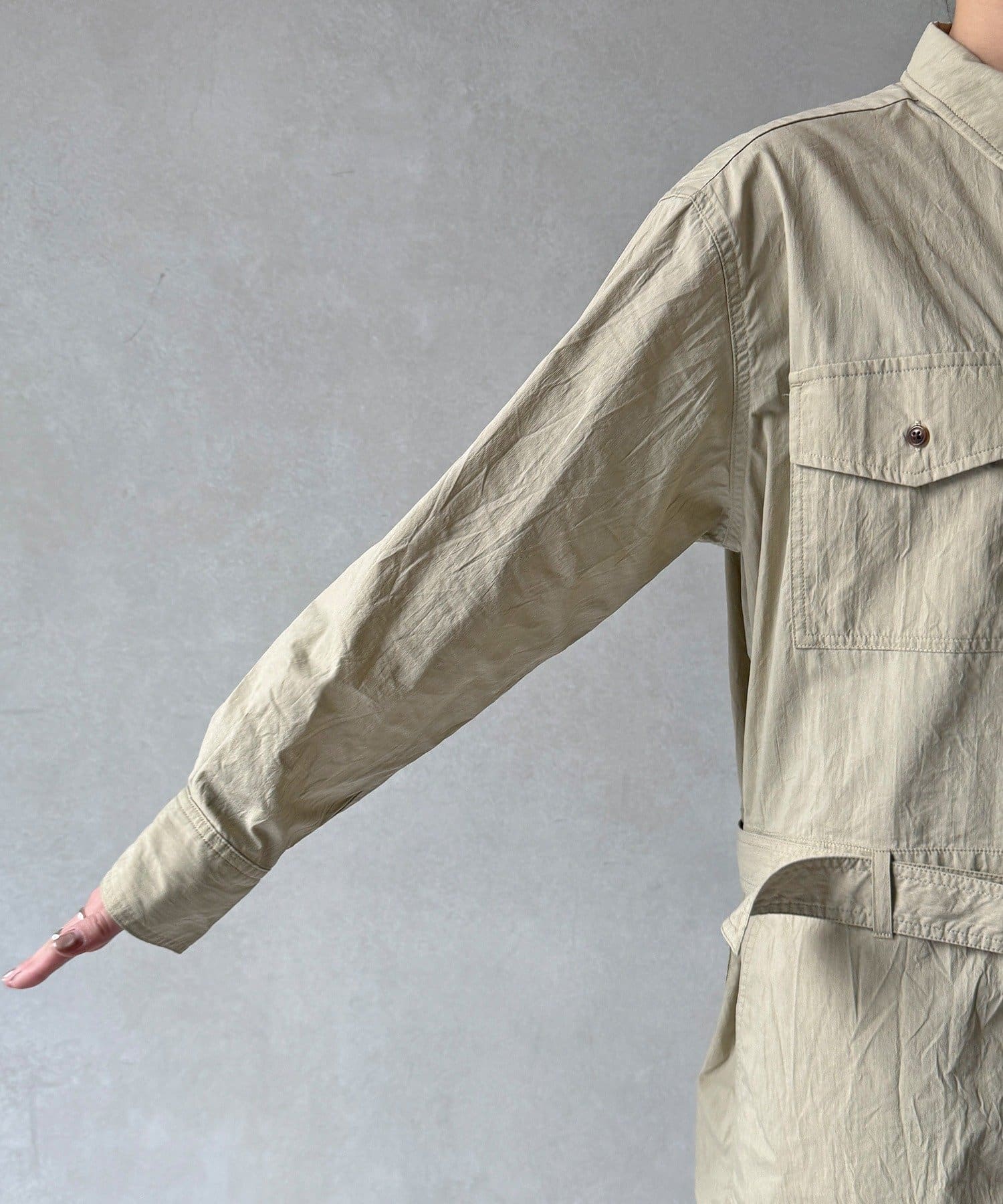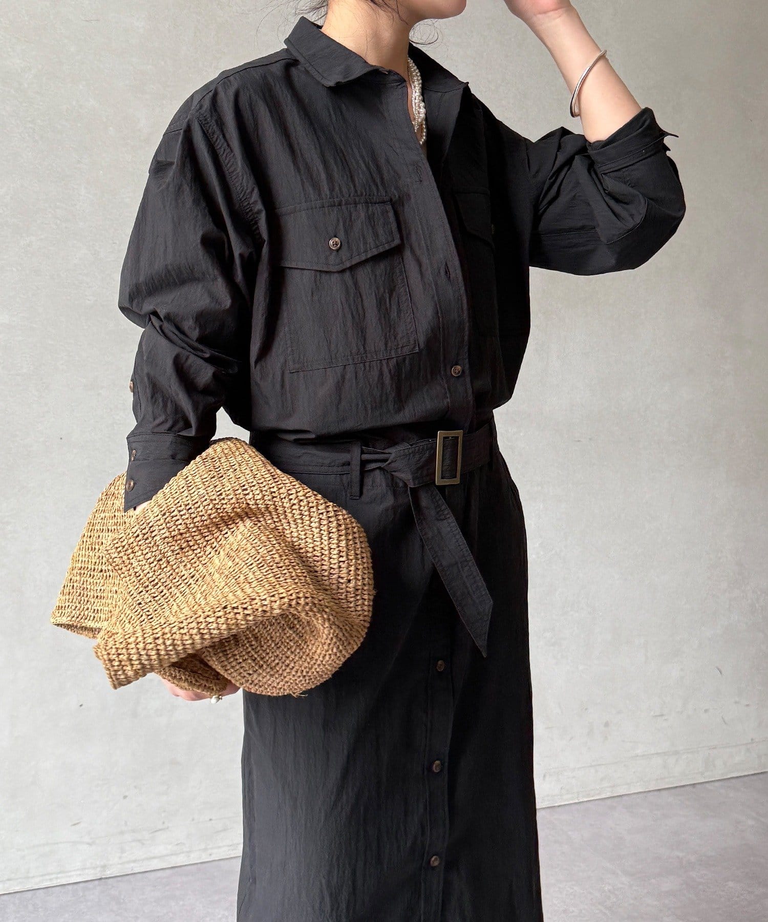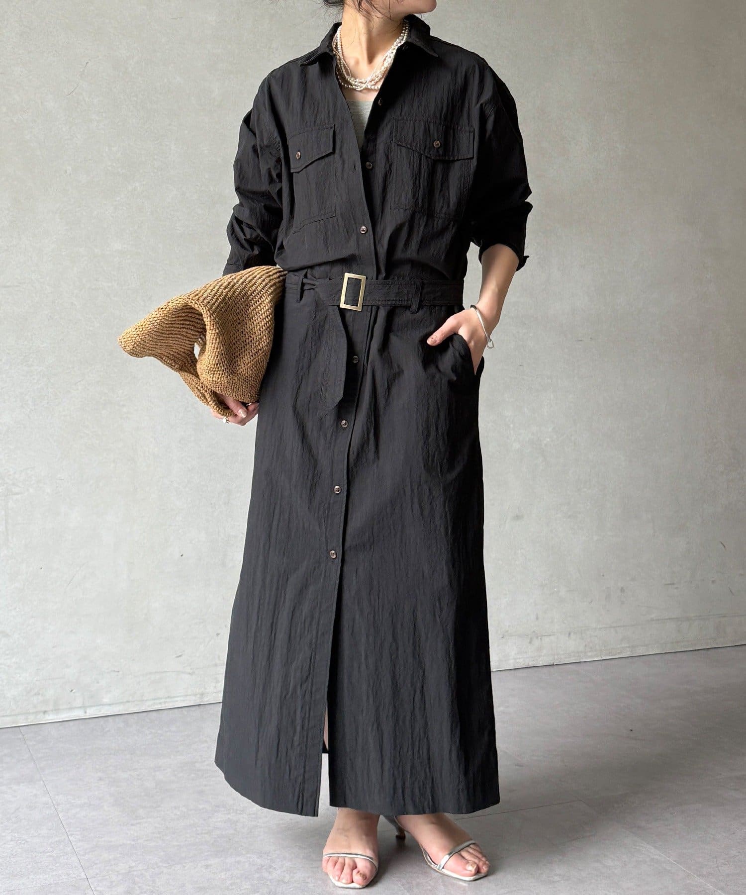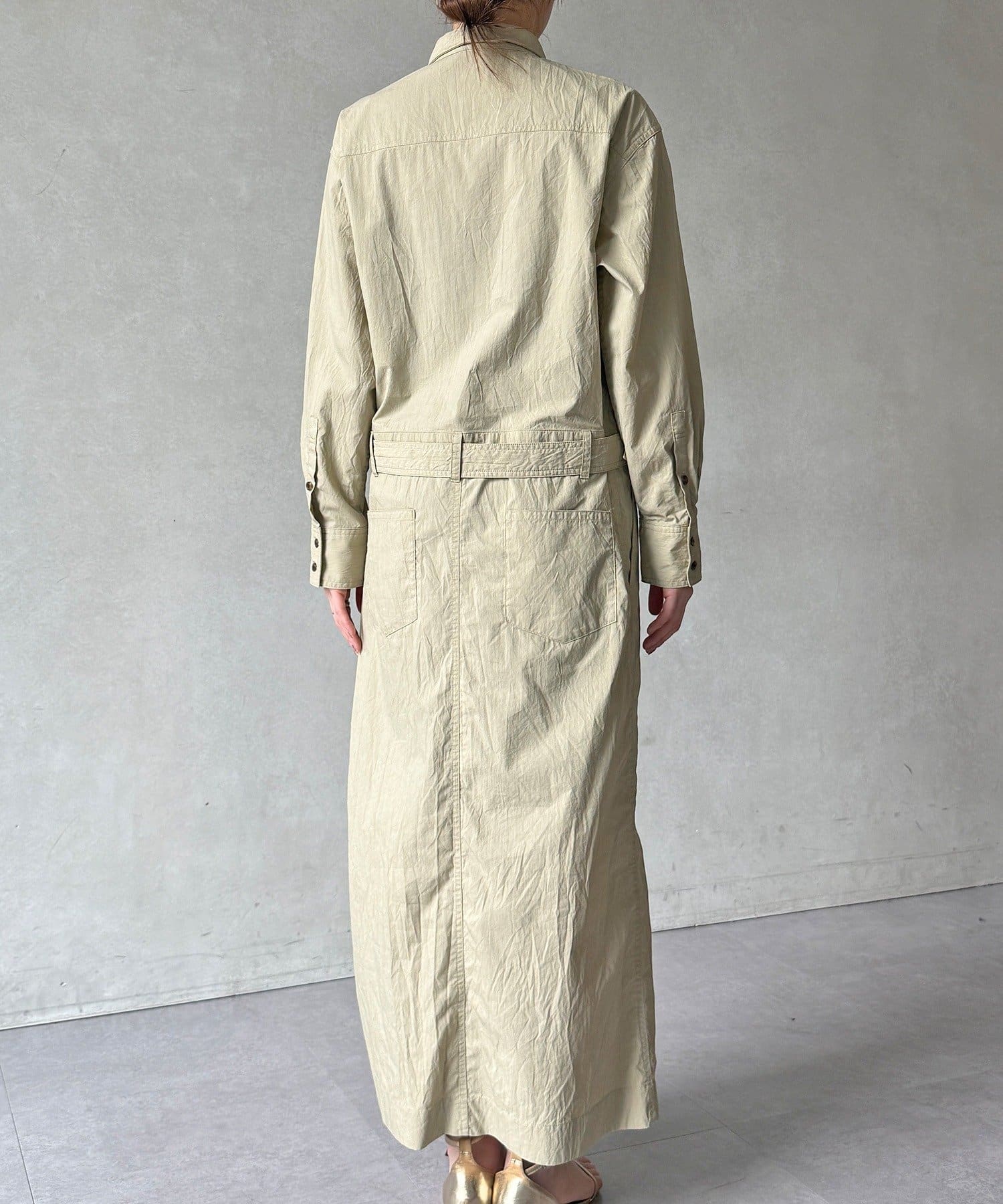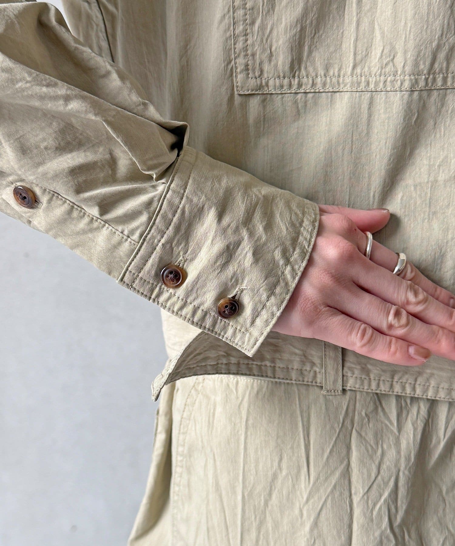 付属のベルトでウエストマークすれば、シルエットにメリハリをプラスでき