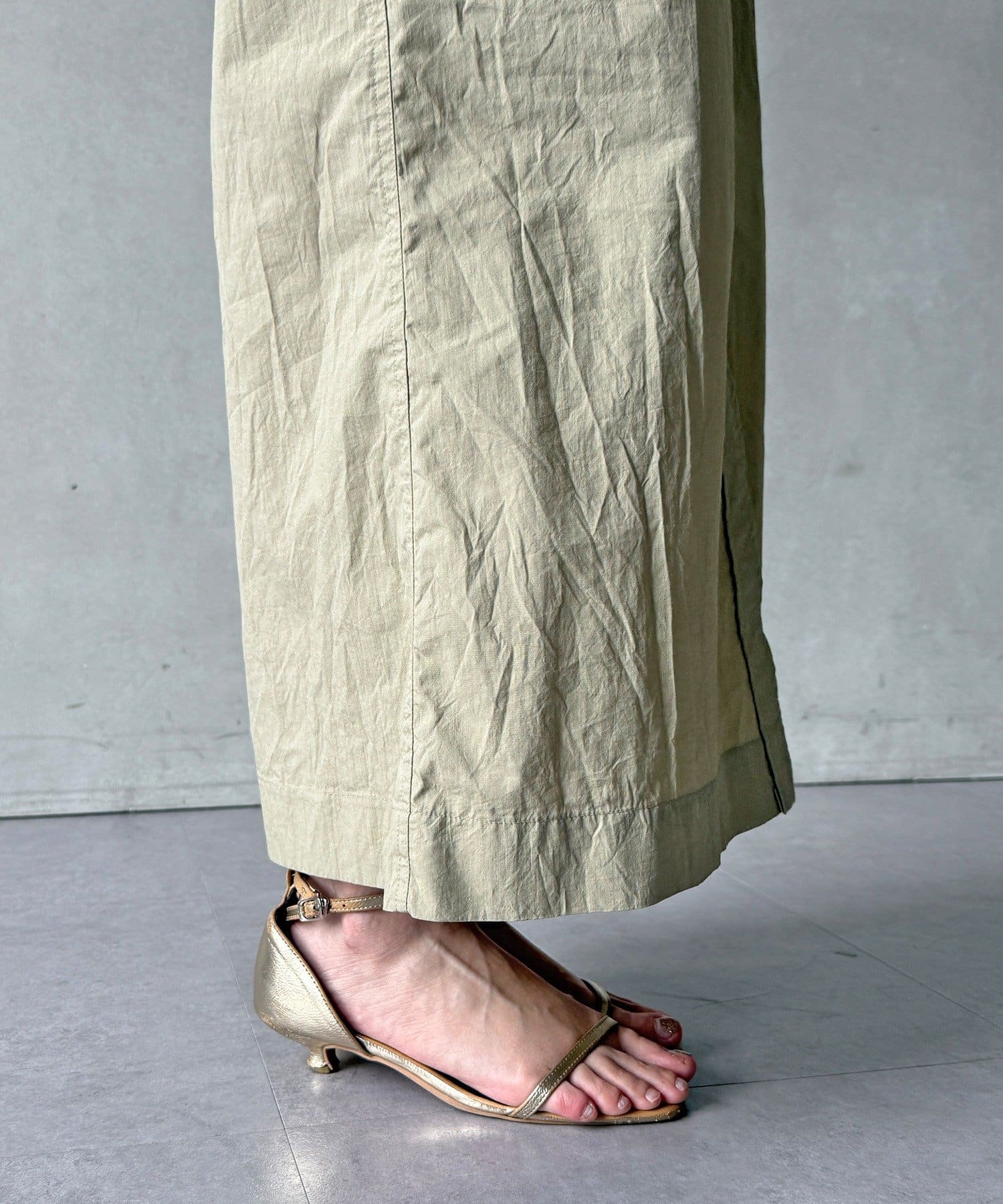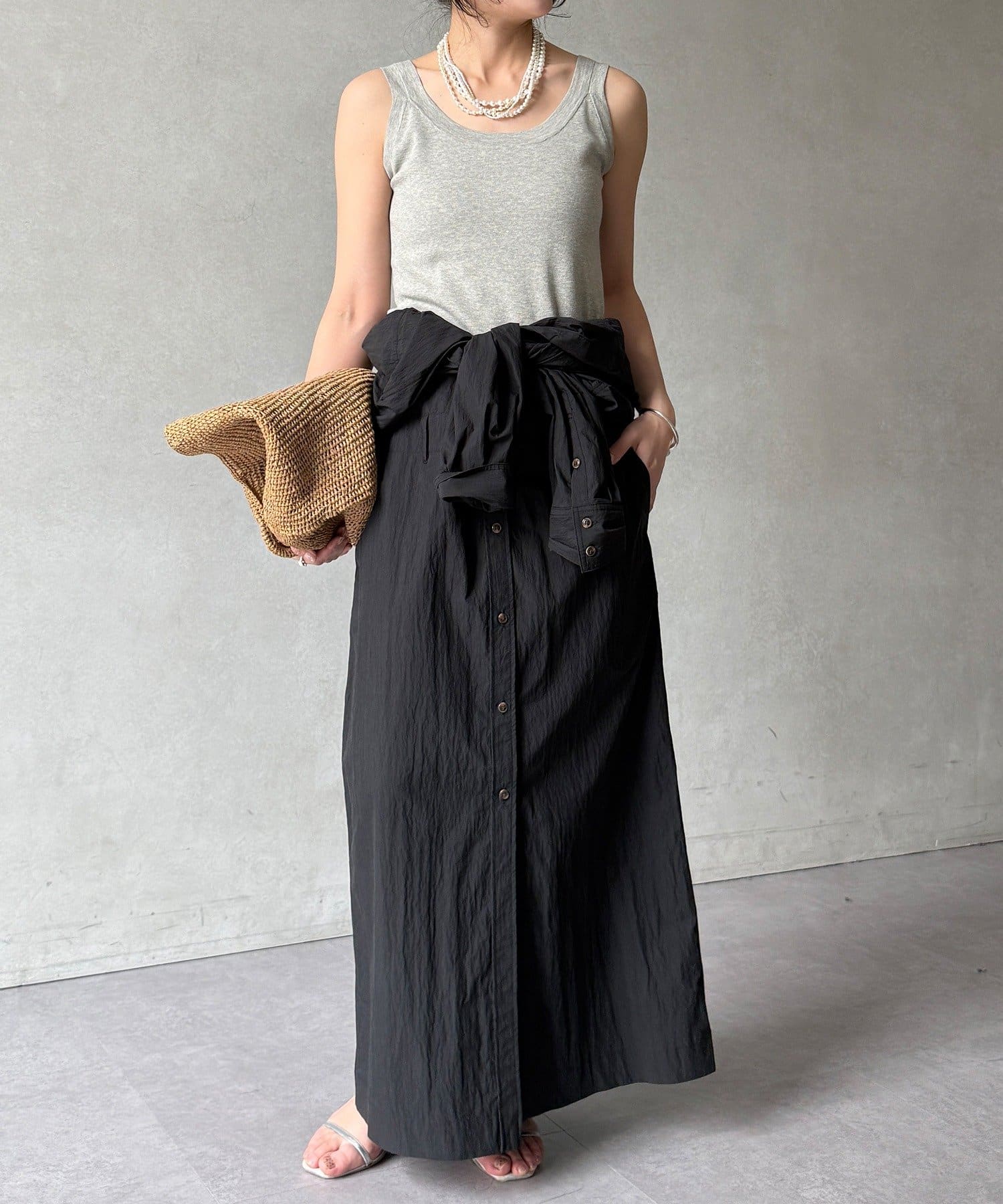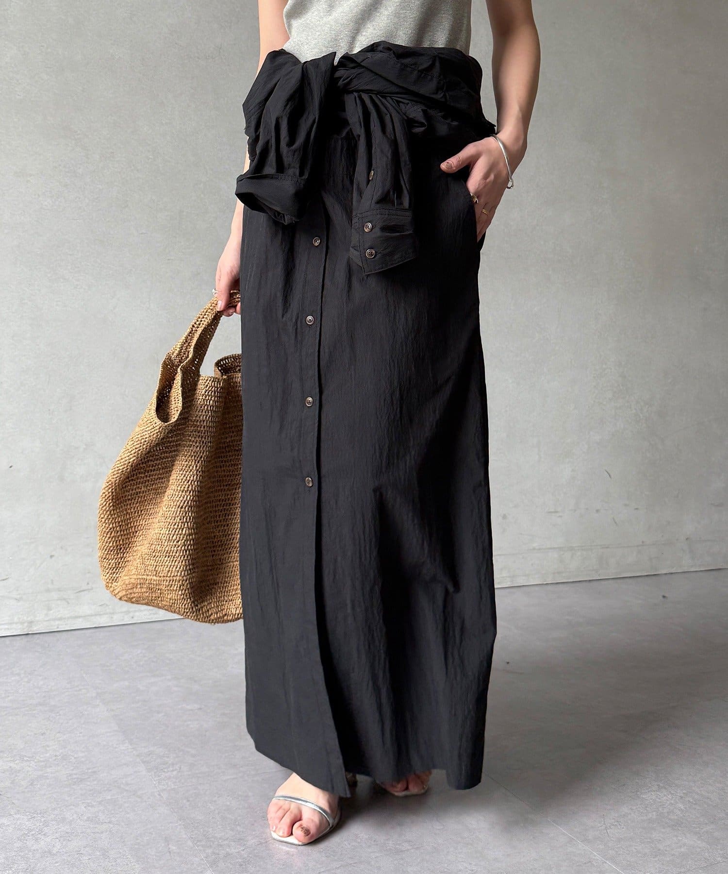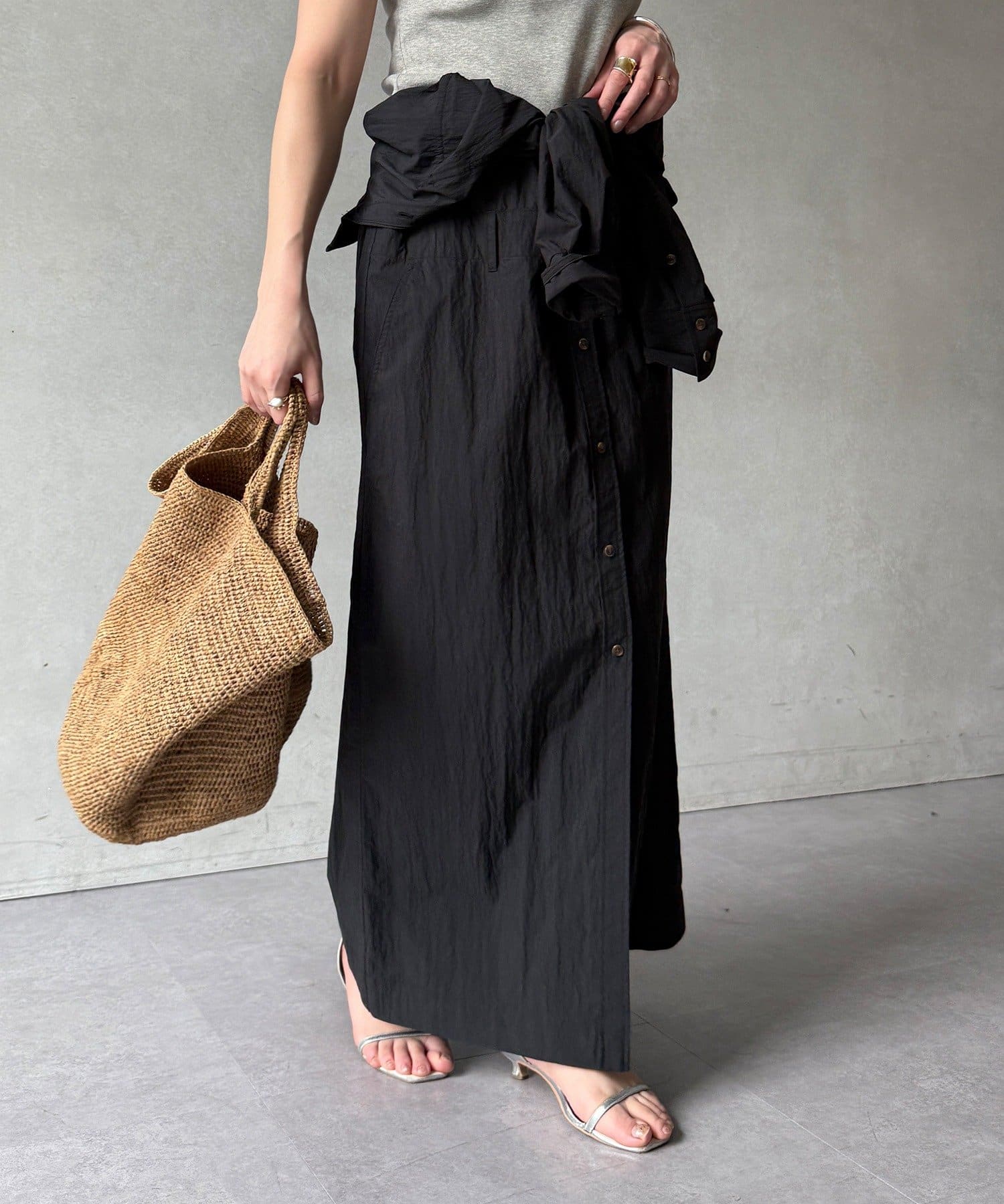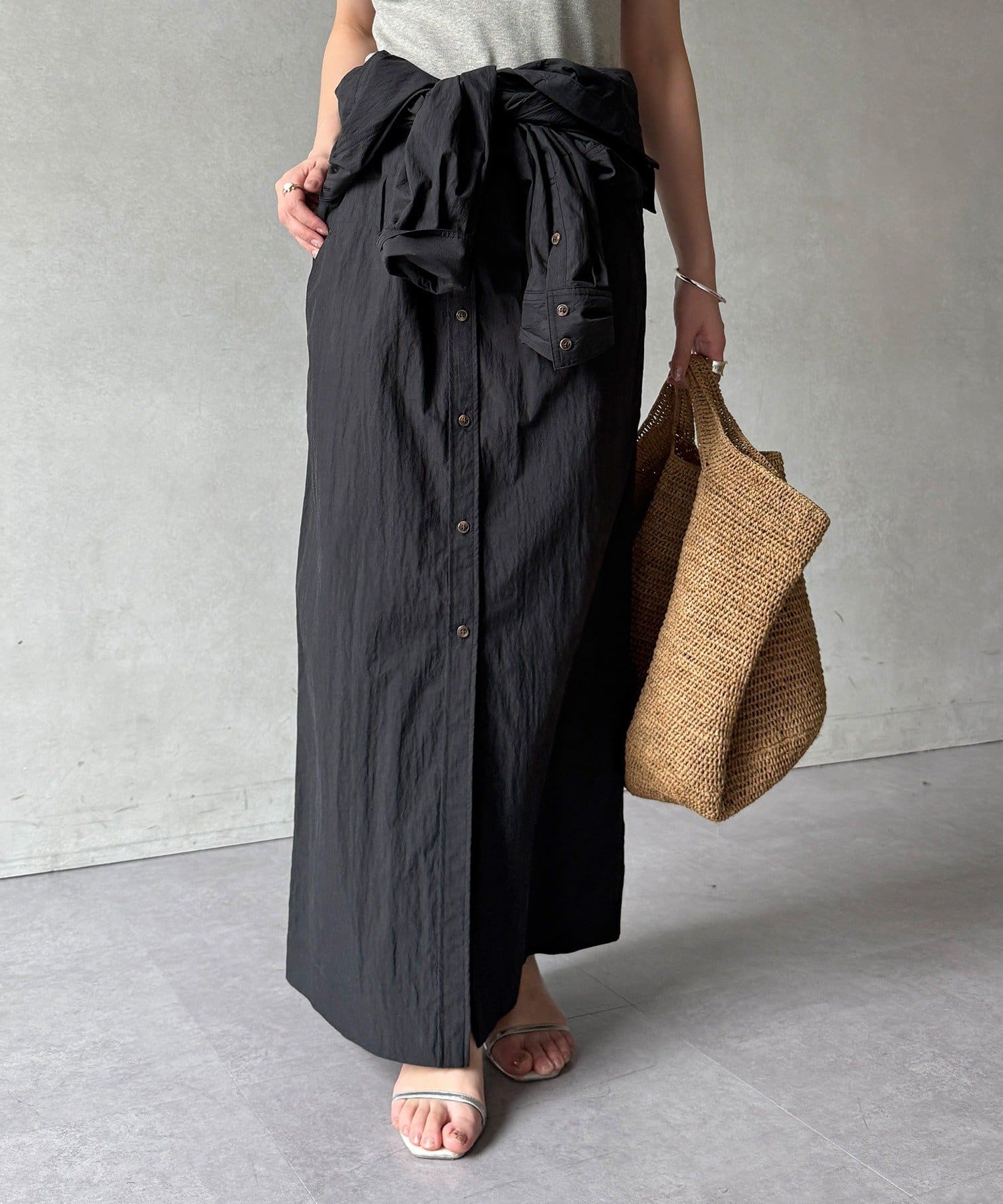 付属のベルトでウエストマークすれば、シルエットにメリハリをプラスでき
