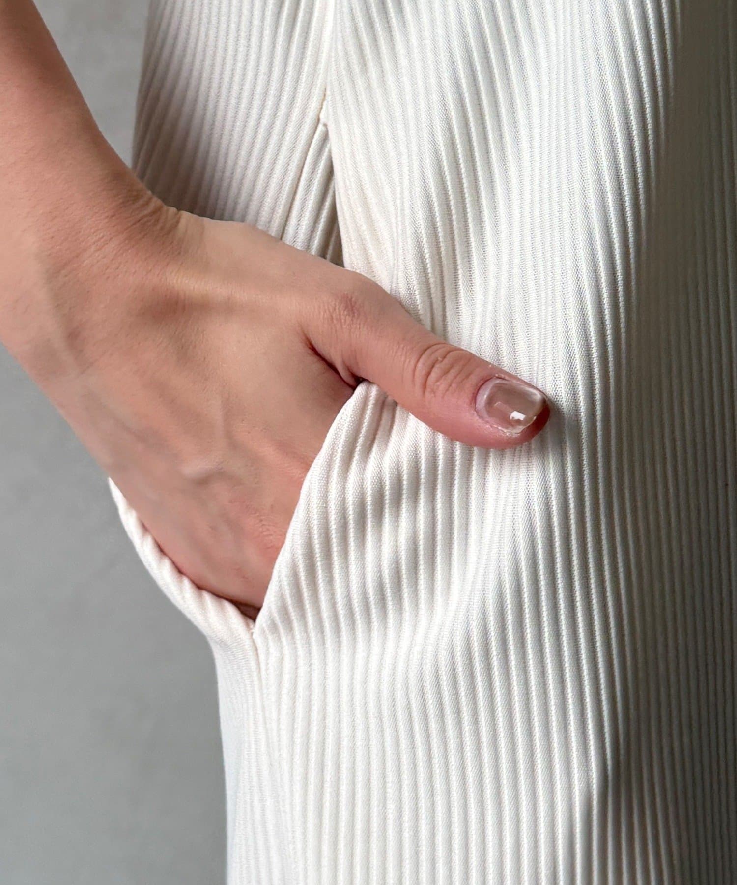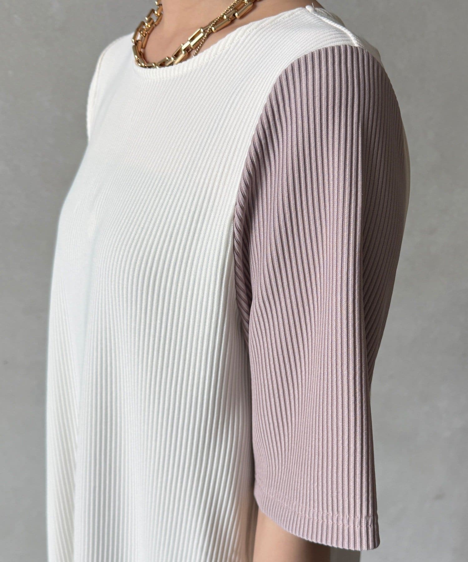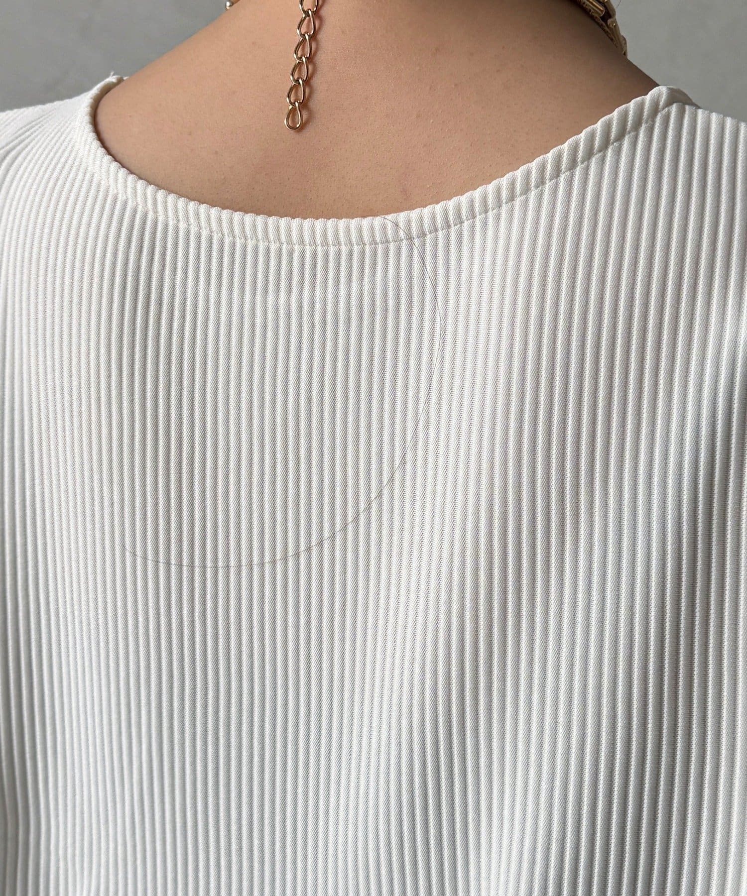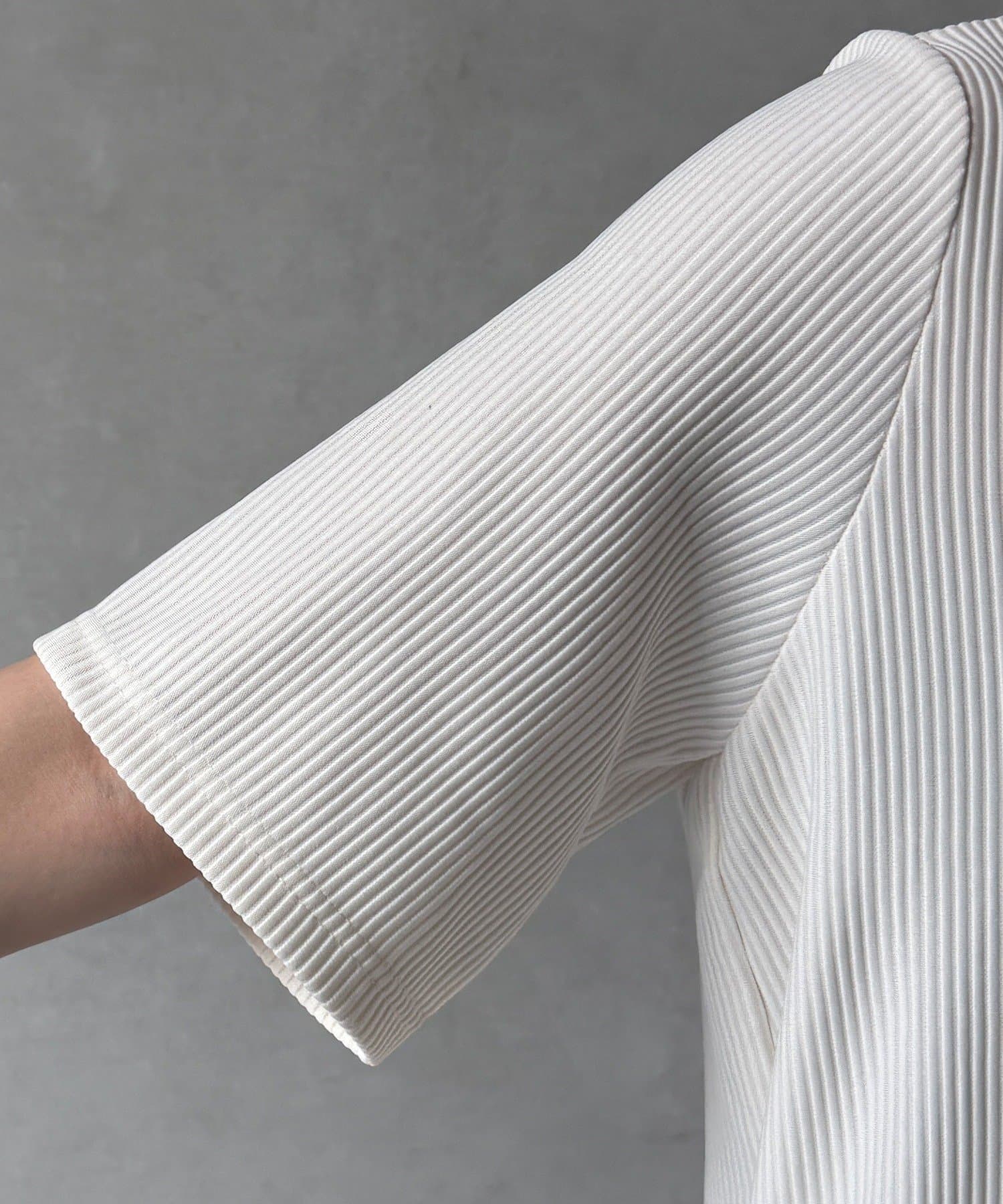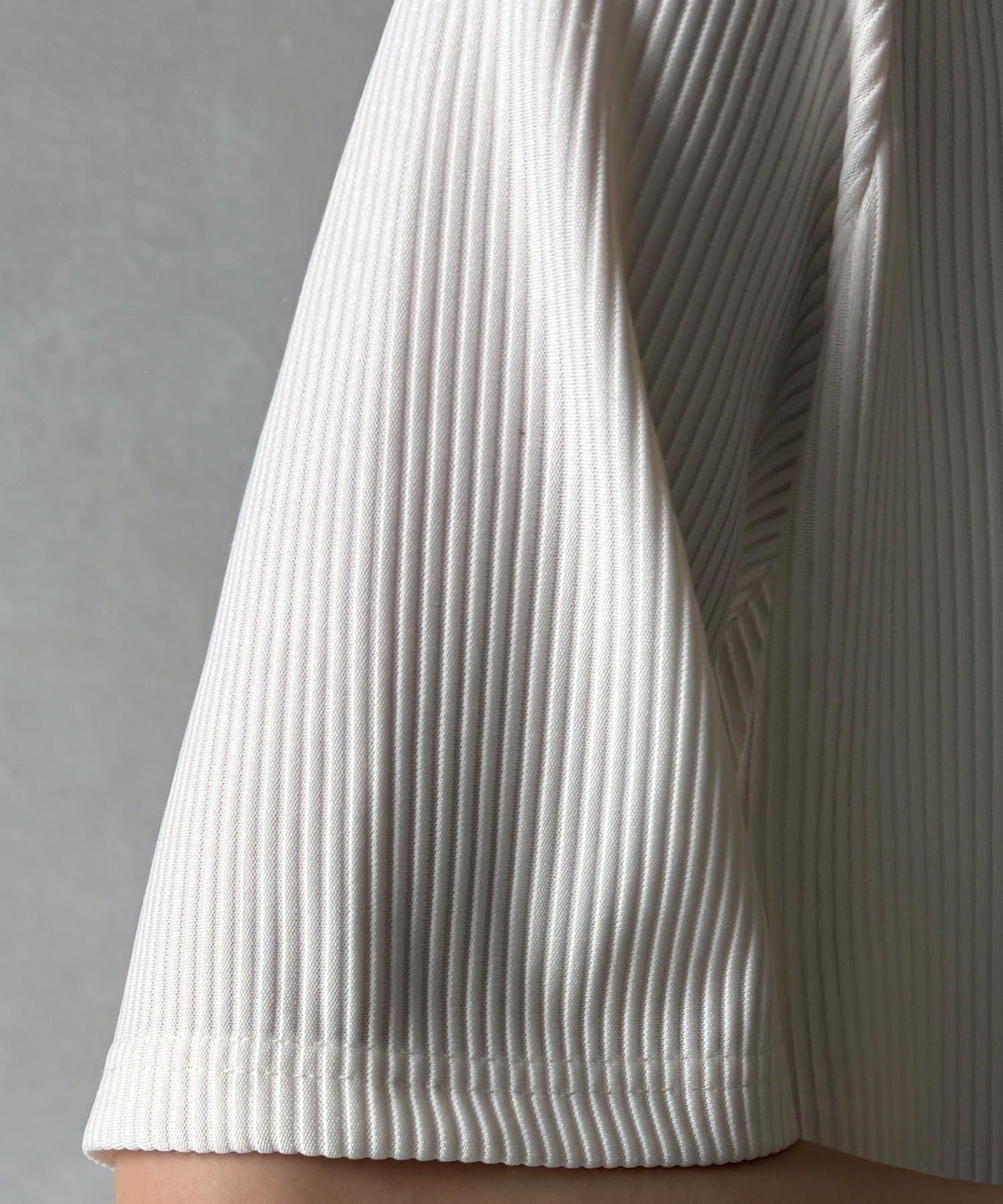 伸縮性のある柔らかいカットソー生地に、細かい縦方向のプリーツ加工を施した素材で、軽やかで動きのあるシルエットが特長。